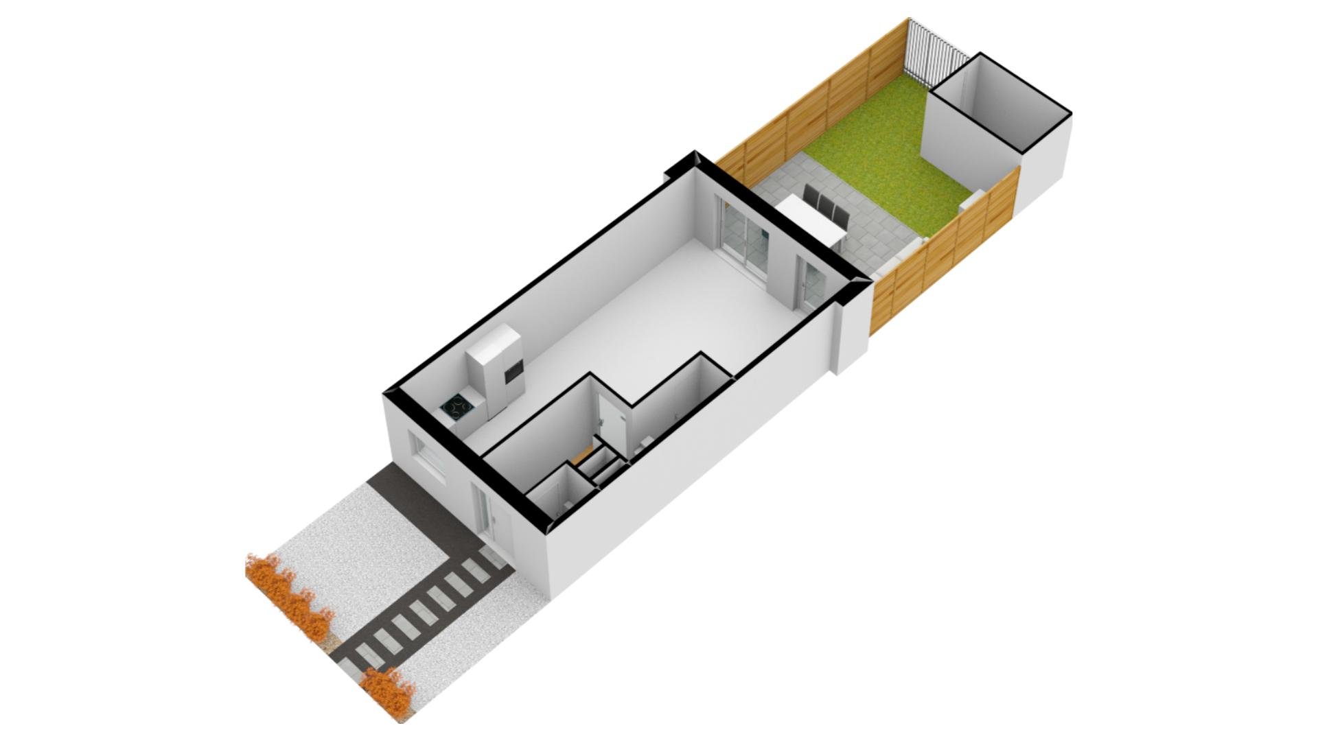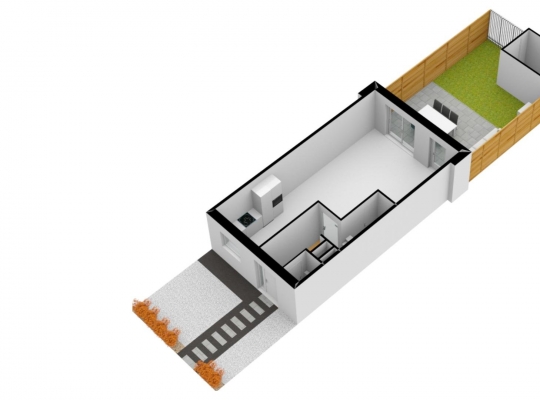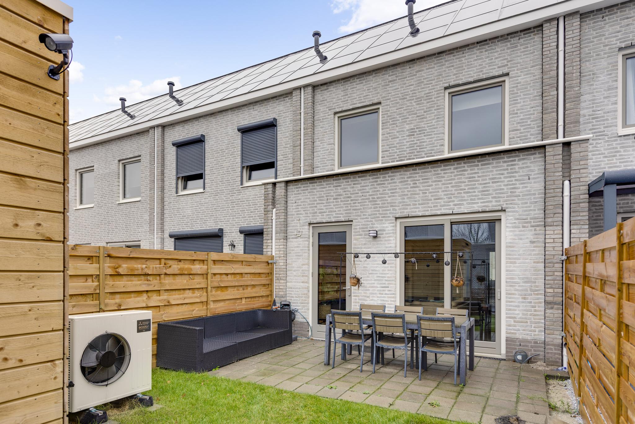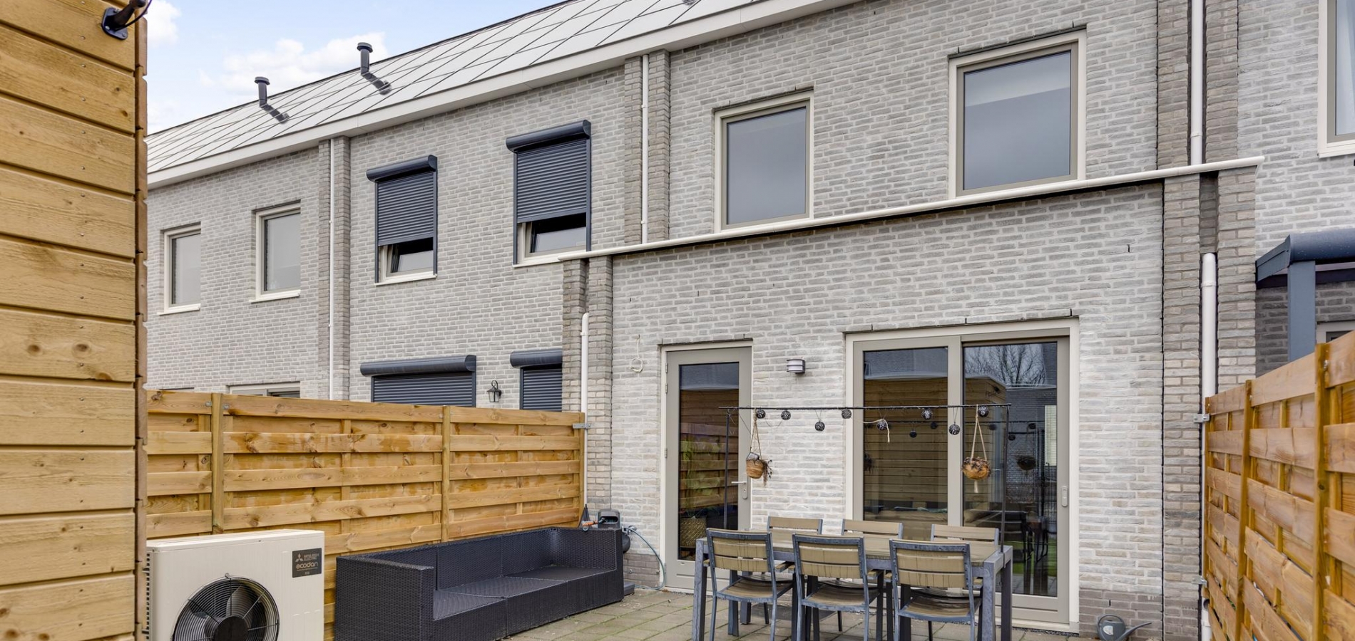 De achtertuin op het zuidoosten is een heerlijke plek om buiten te zitten. Het grote terras grenst aan het grasveld met stapstenen. Houten schuttingen zorgen voor privacy en in de berging is ruimte voor de fietsen. Via de poort is de achtergelegen straat te bereiken, waar u de beschikking heeft over een vaste parkeerplek. Ook voor de voortuin, ingedeeld met grind en bestrating, heeft u geen groene vingers nodig.