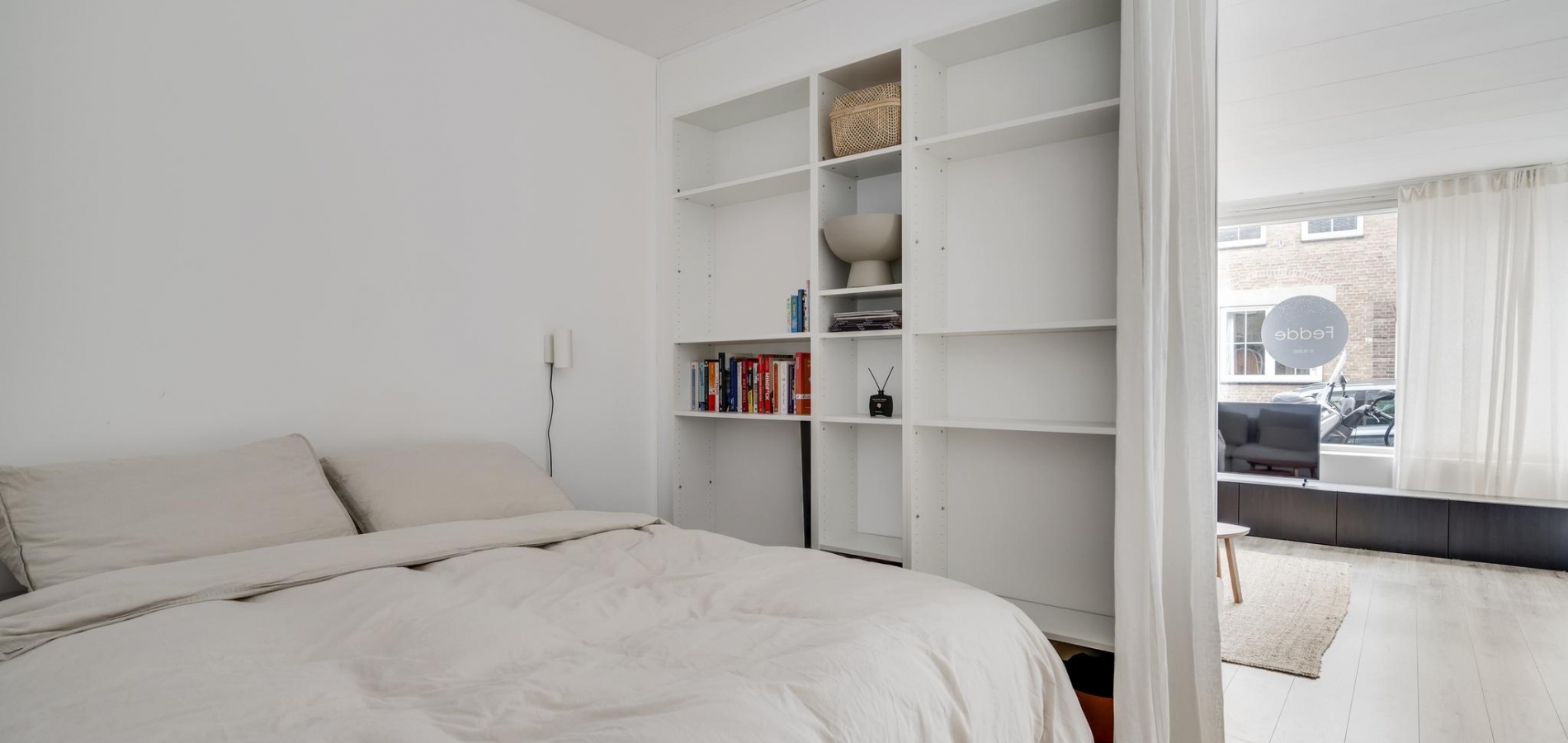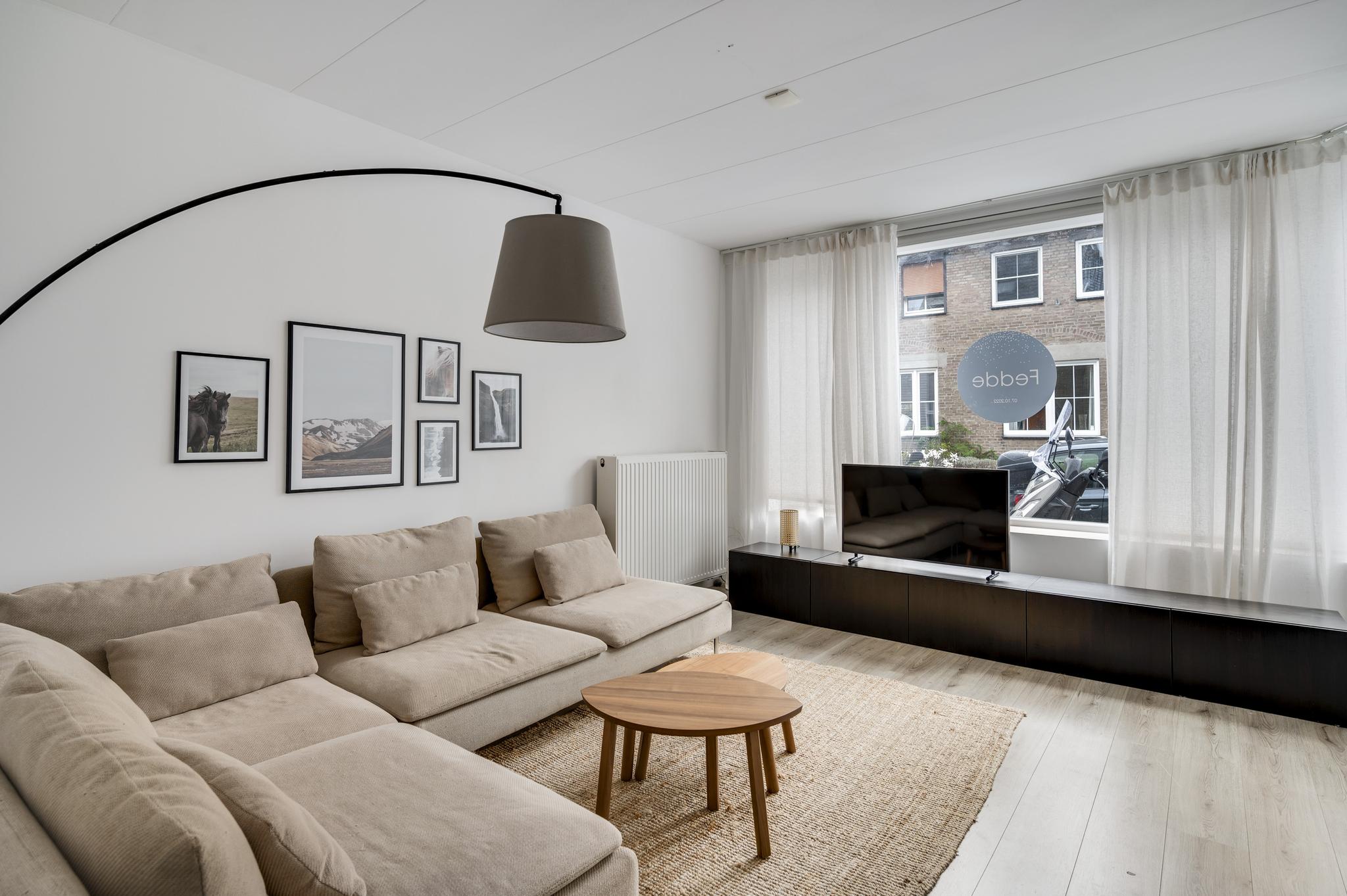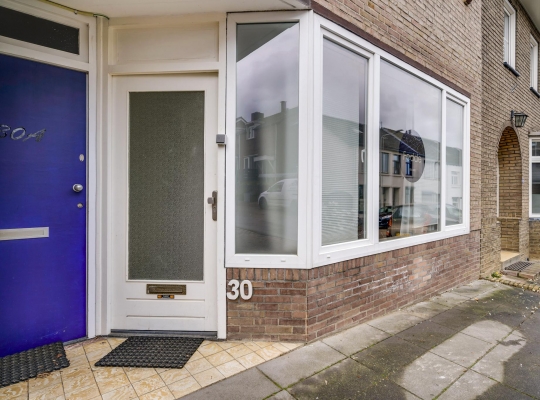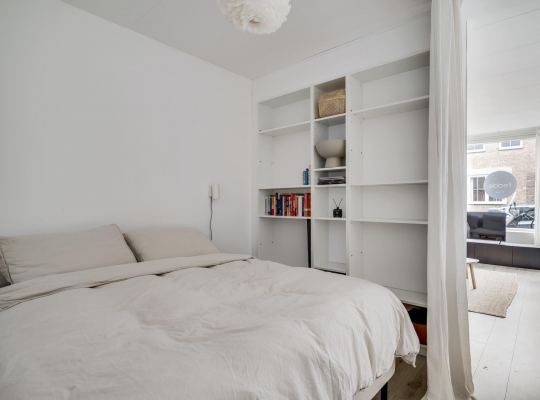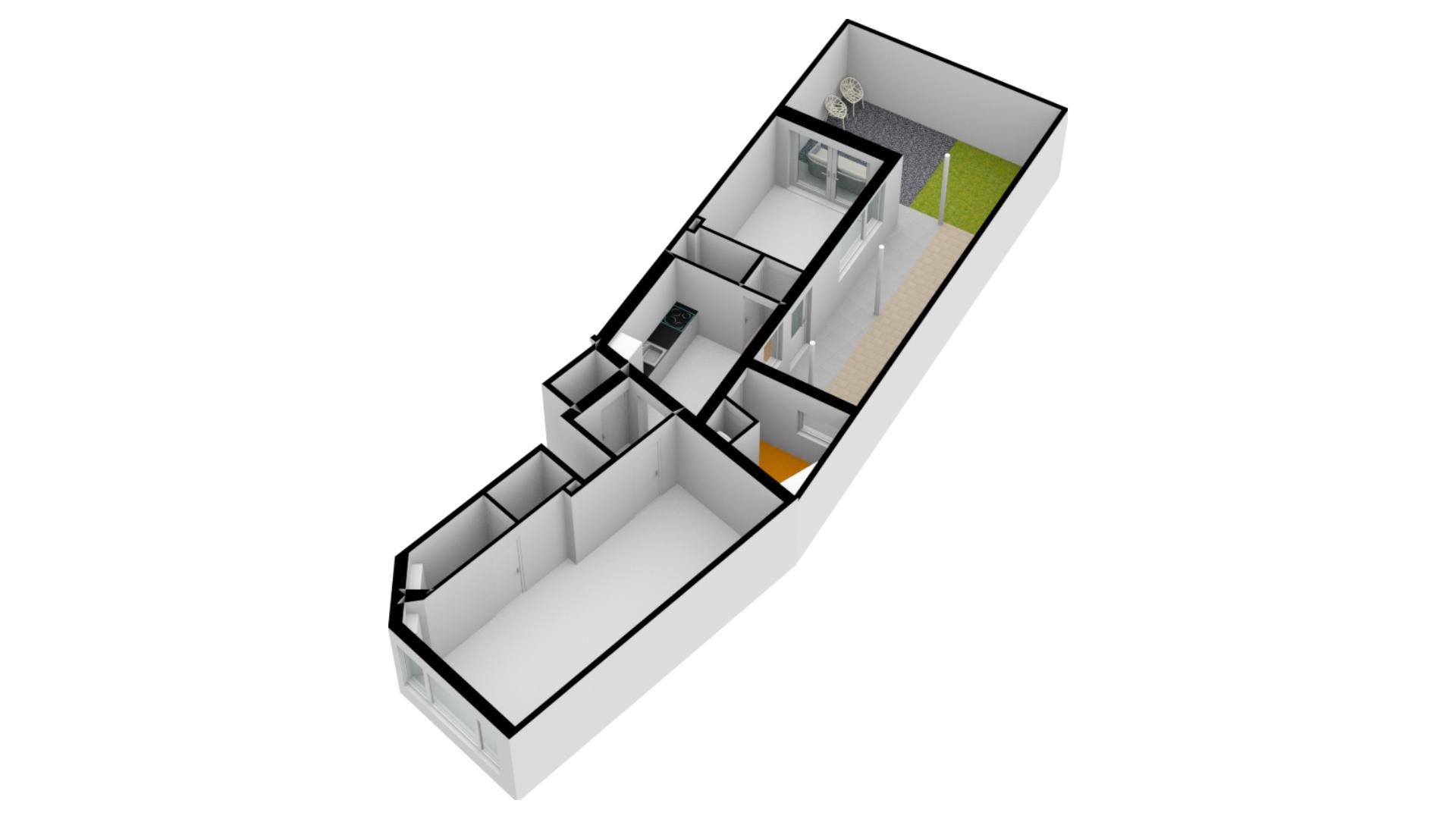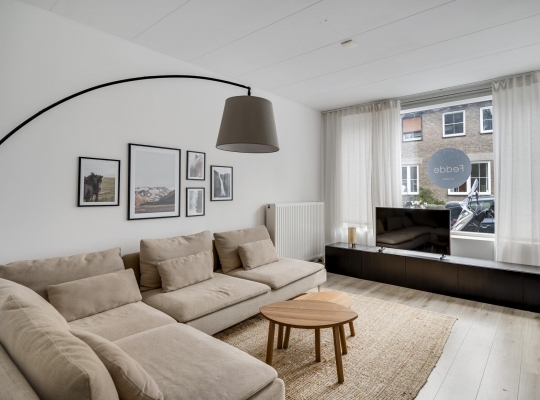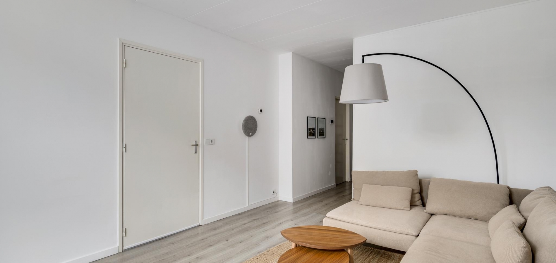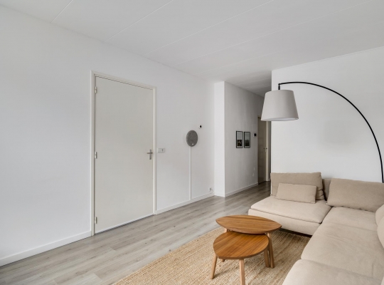 De benedenwoning heeft een eigen entree van waaruit een bergkast en de woonkamer te bereiken zijn. De mooie laminaatvloer ligt in bijna de hele benedenwoning en de wanden zijn glad gestuct. In de woonkamer (7.83 x 3.50) is de ruimte verdeeld in een ruim zitgedeelte en achter de losse kastenwand is een slaapruimte gerealiseerd. Met het verwijderen van deze kast is de woonkamer te vergroten.