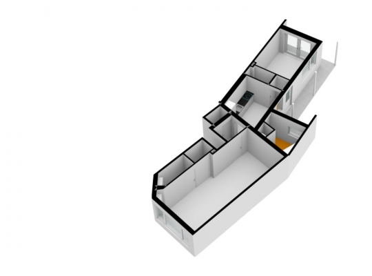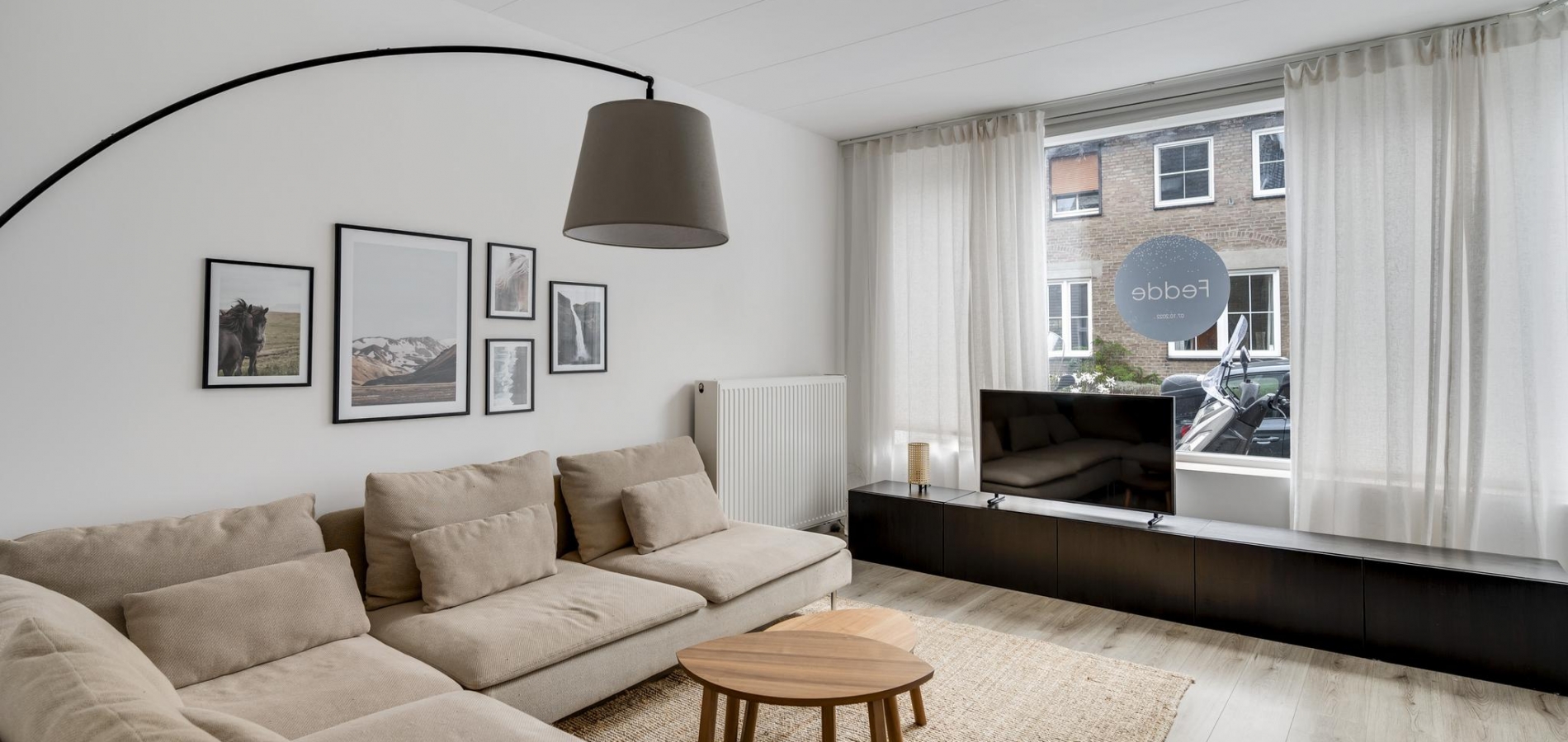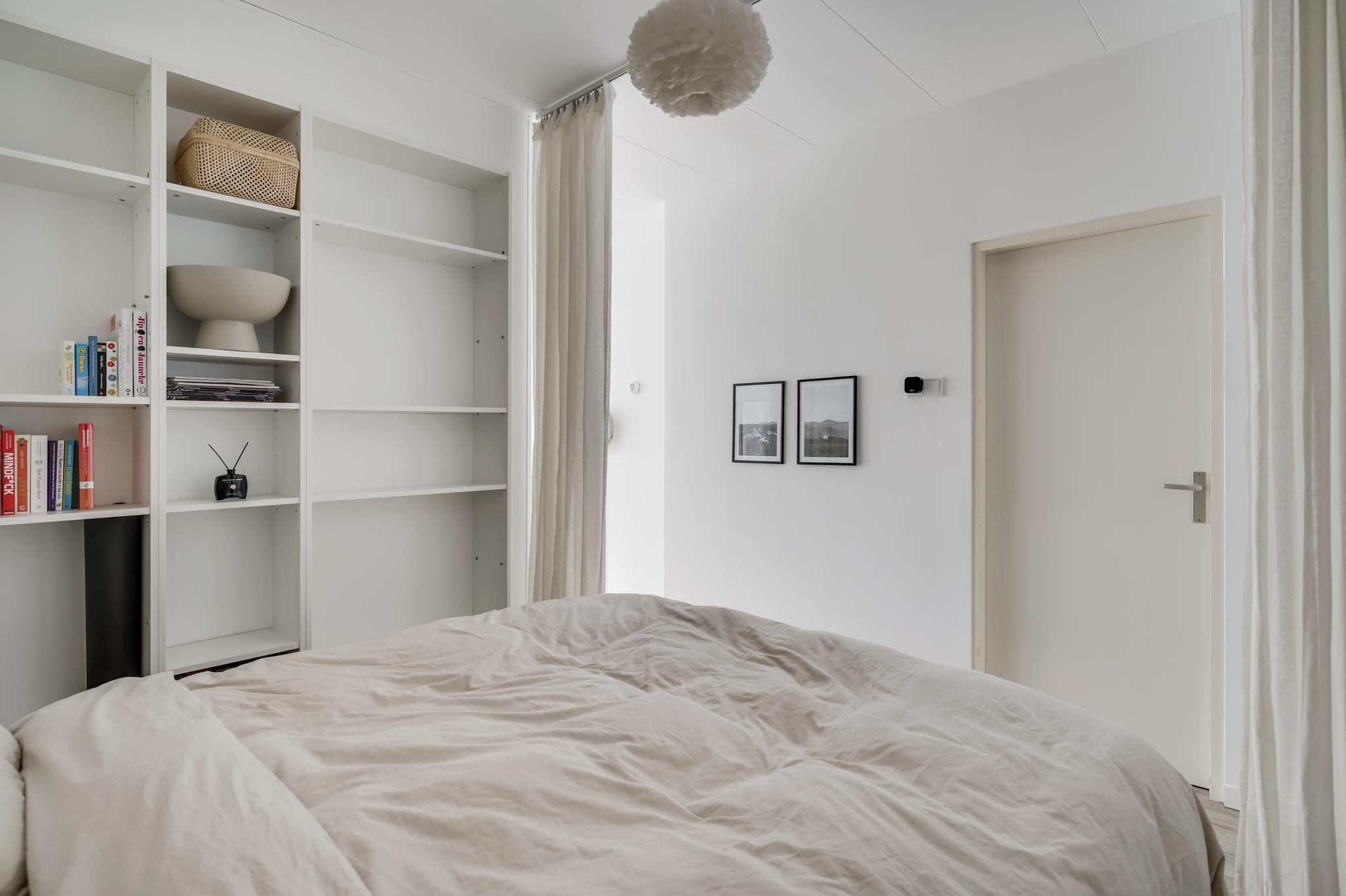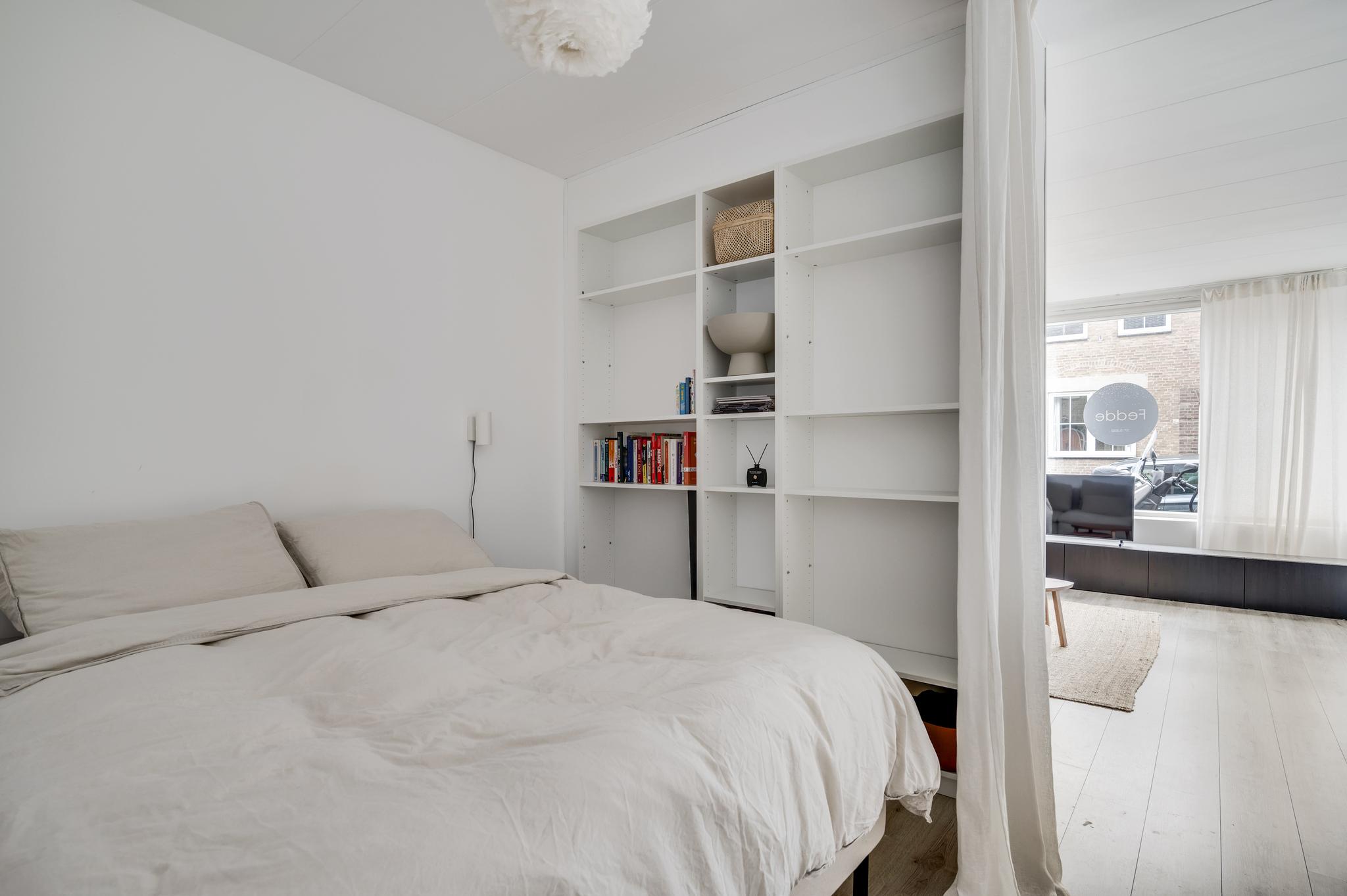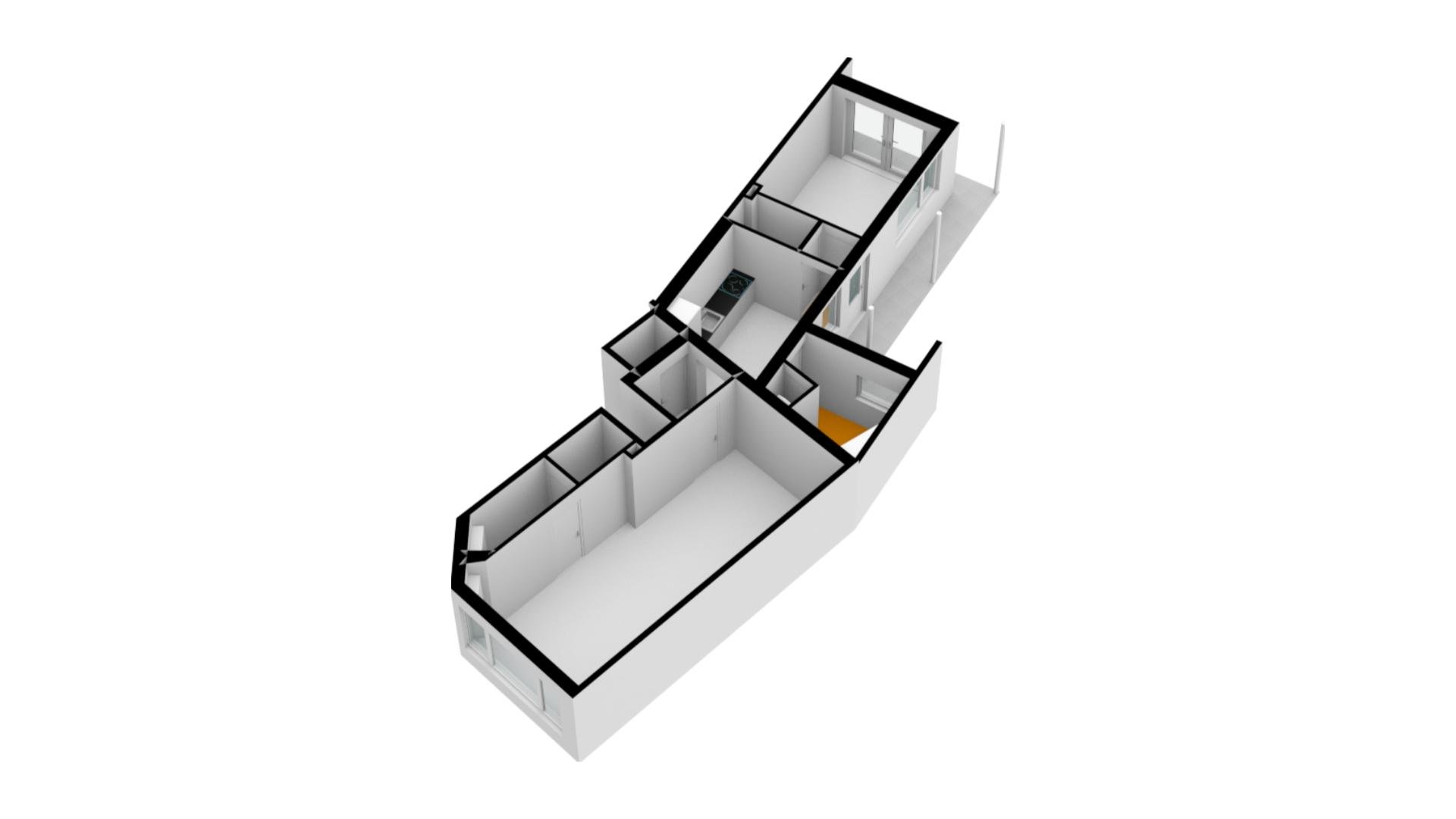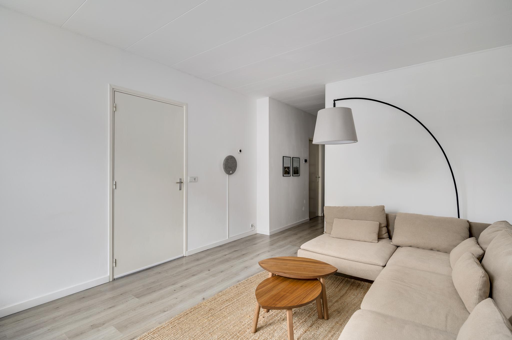 De benedenwoning heeft een eigen entree van waaruit een bergkast en de woonkamer te bereiken zijn. De mooie laminaatvloer ligt in bijna de hele benedenwoning en de wanden zijn glad gestuct. In de woonkamer (7.83 x 3.50) is de ruimte verdeeld in een ruim zitgedeelte en achter de losse kastenwand is een slaapruimte gerealiseerd. Met het verwijderen van deze kast is de woonkamer te vergroten.