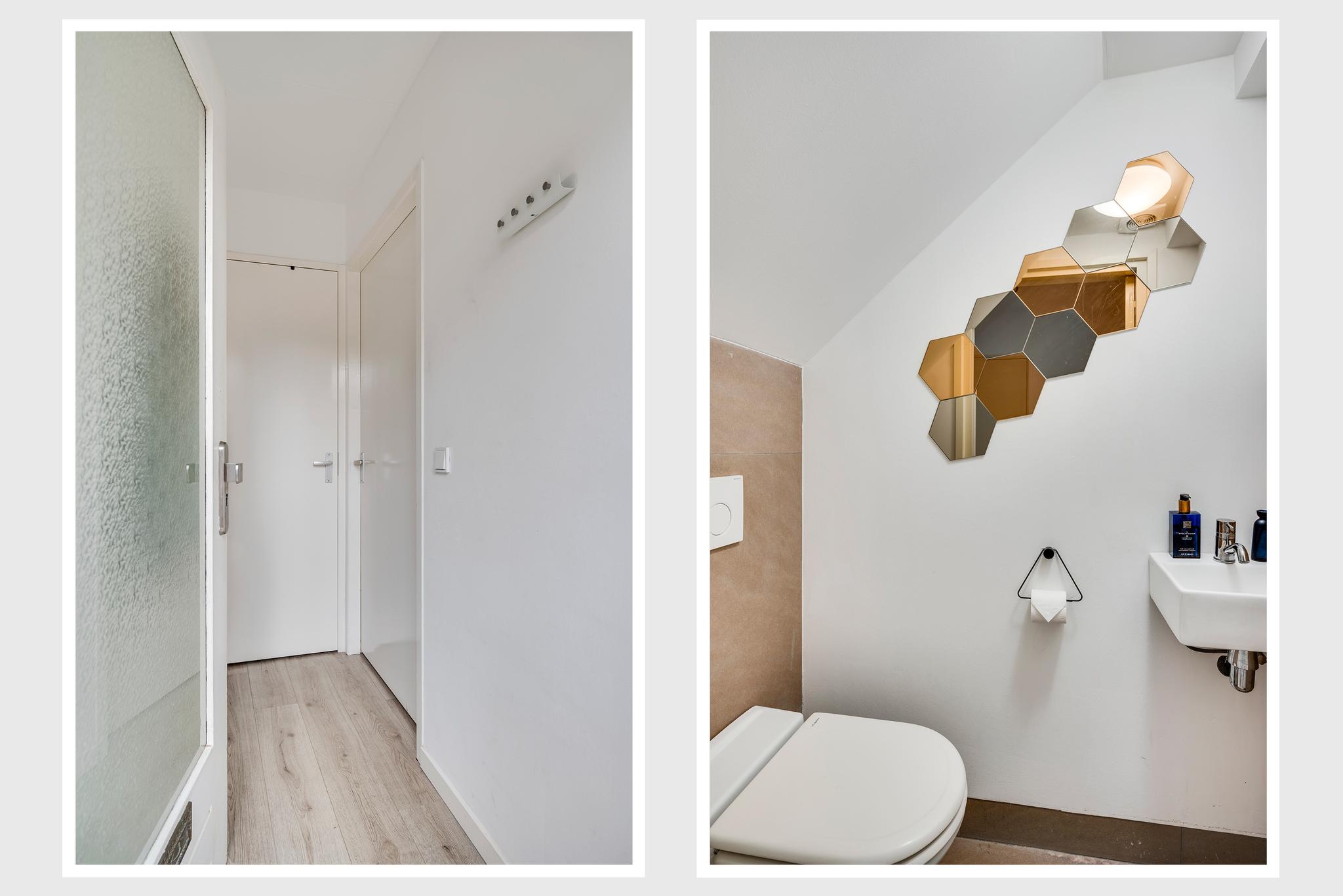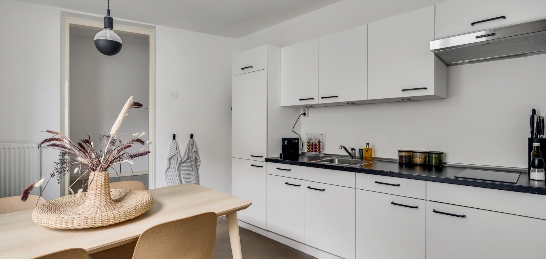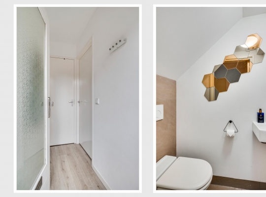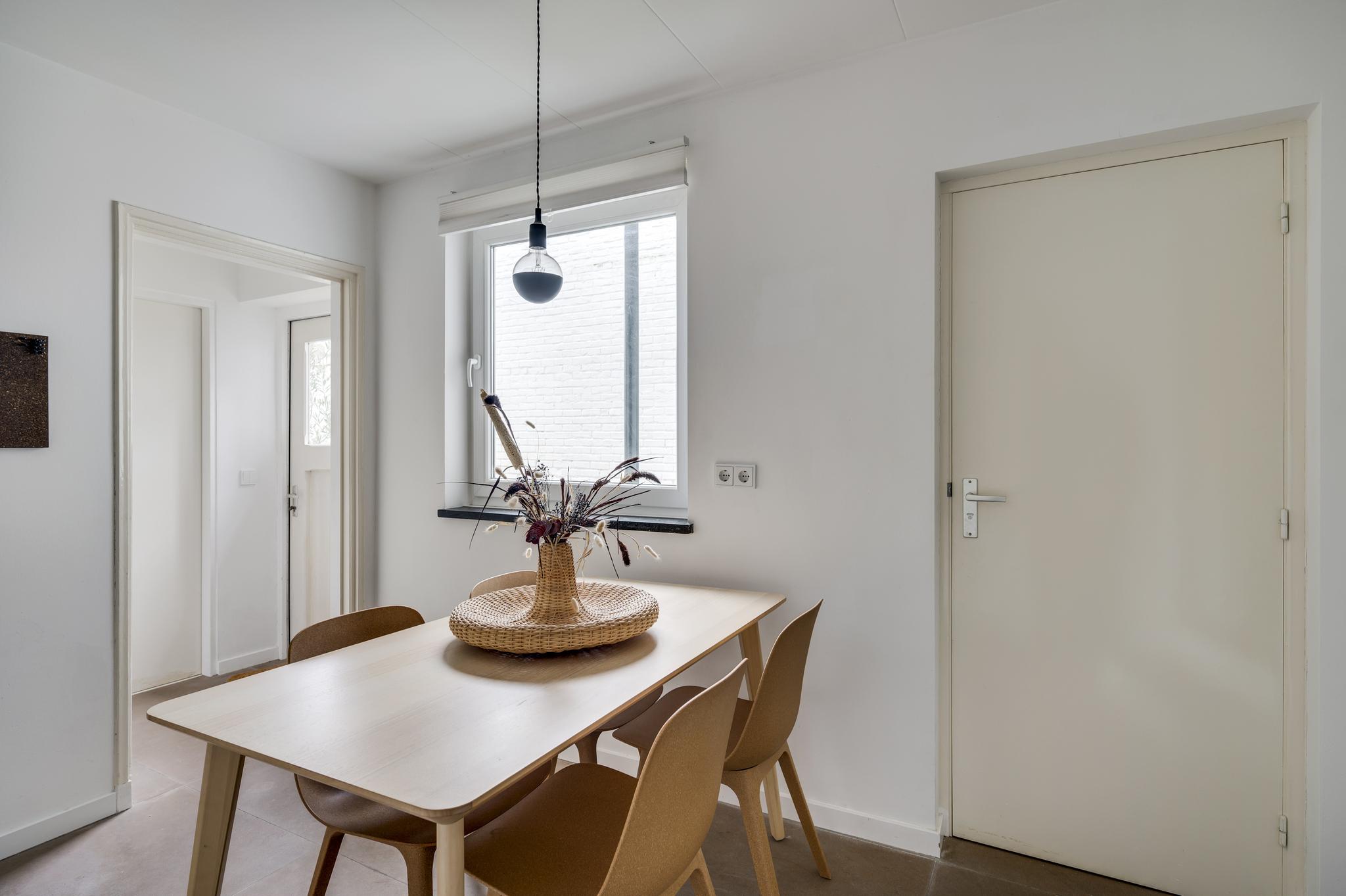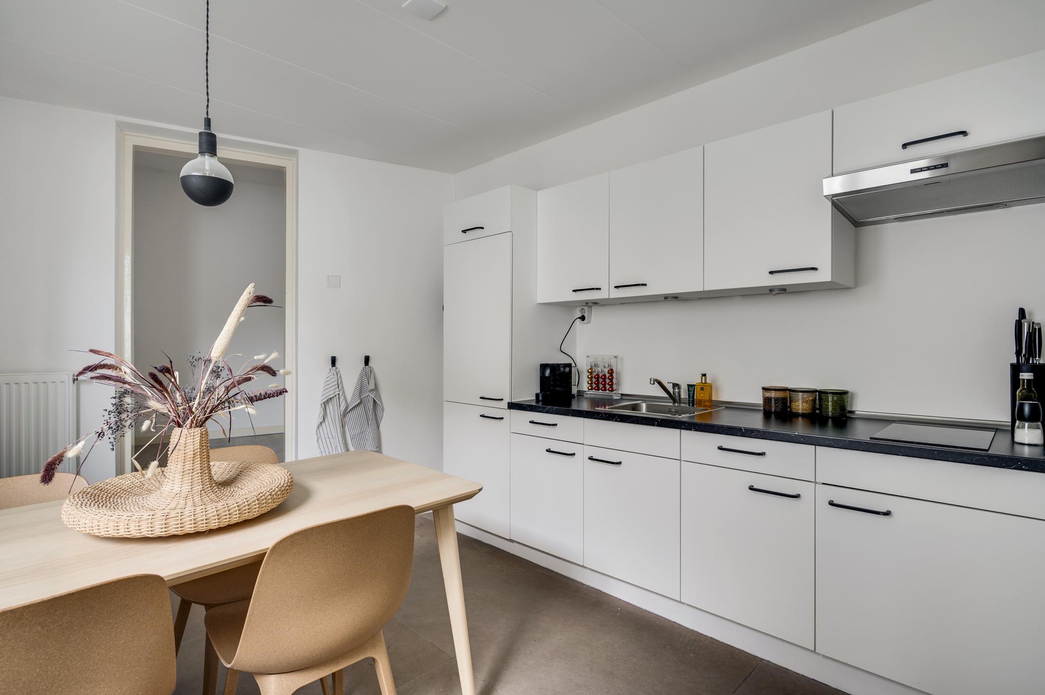 Via een portaal met moderne toiletruimte is de eetkeuken (ca. 3.07 x 2.98) te bereiken. Er is ruimte voor een grote eettafel en door het grote raam valt veel licht naar binnen. De wandopstelling (2020) is voorzien van een inductie kookplaat, afzuigkap en een koelkast met vriesvak.