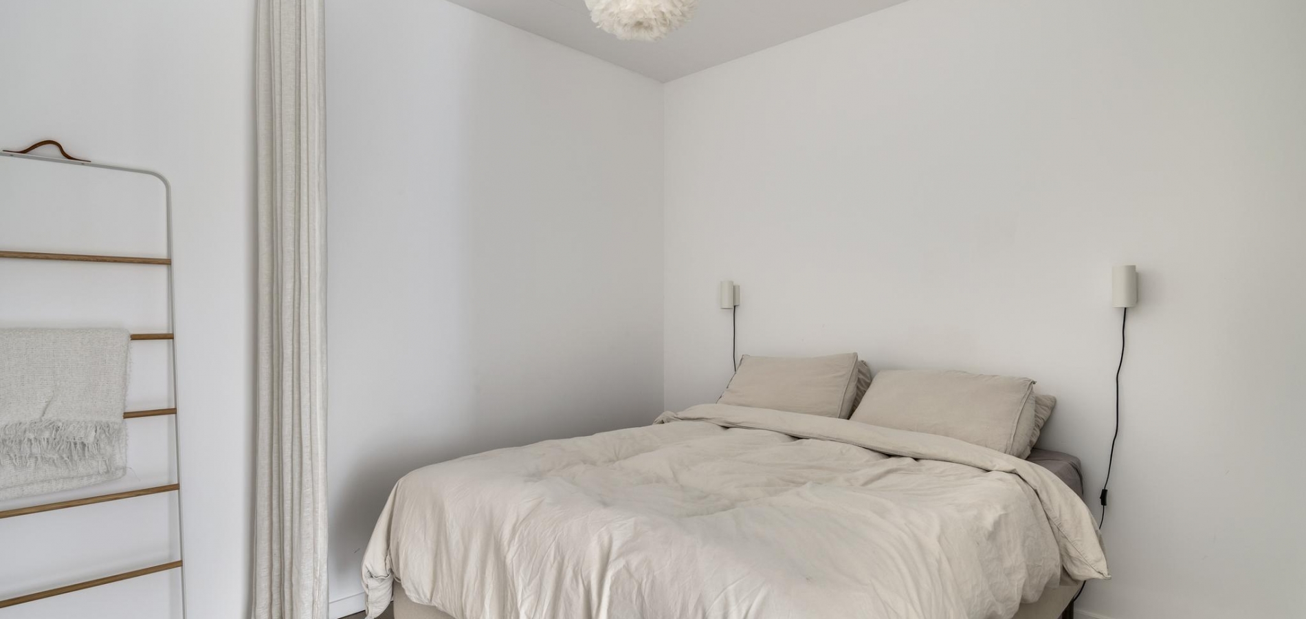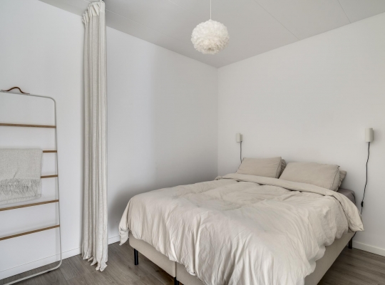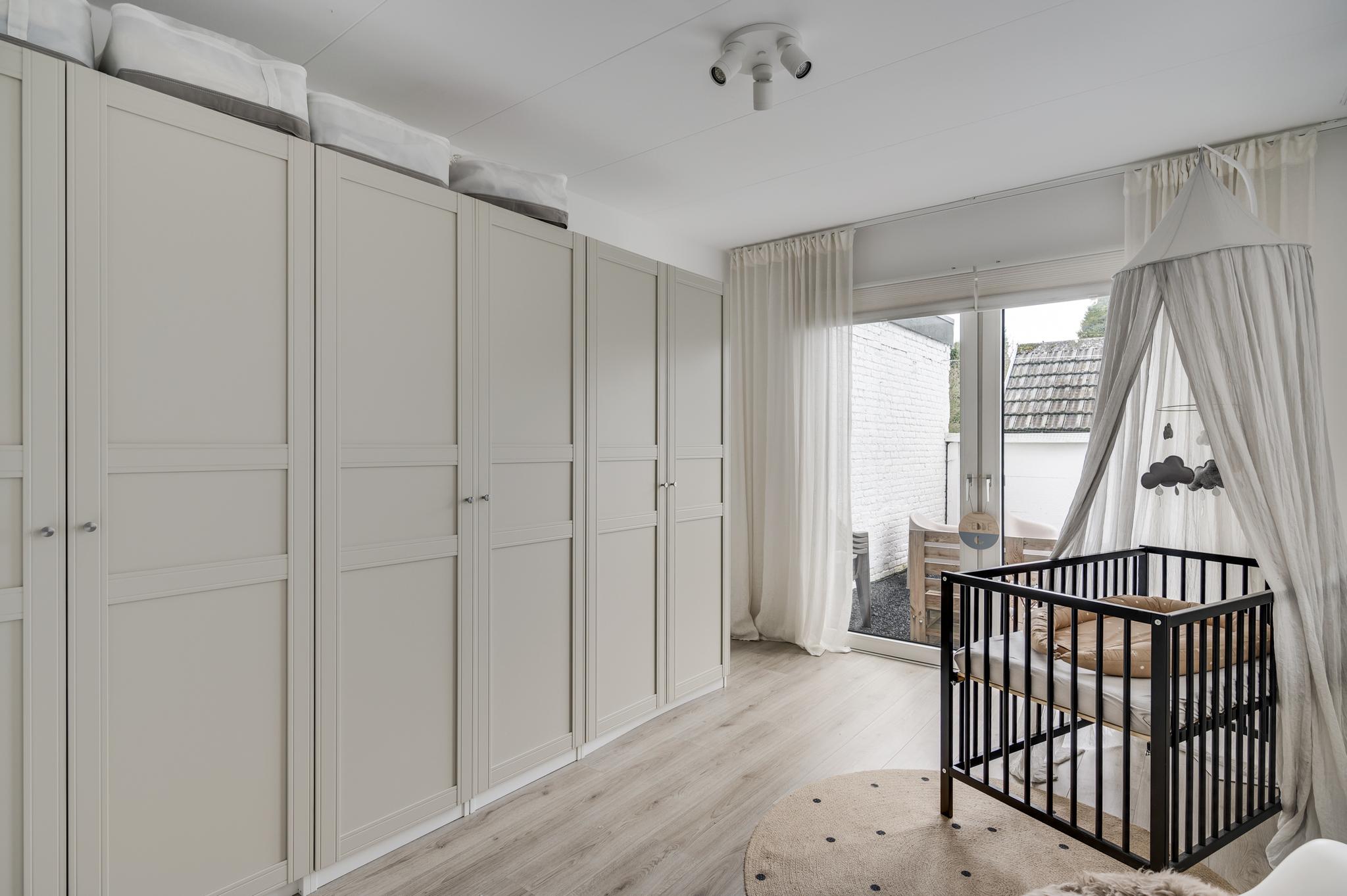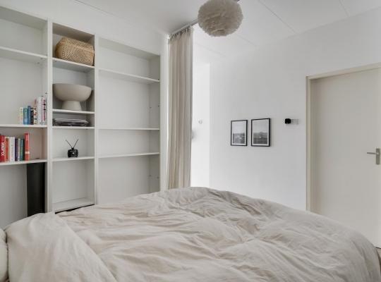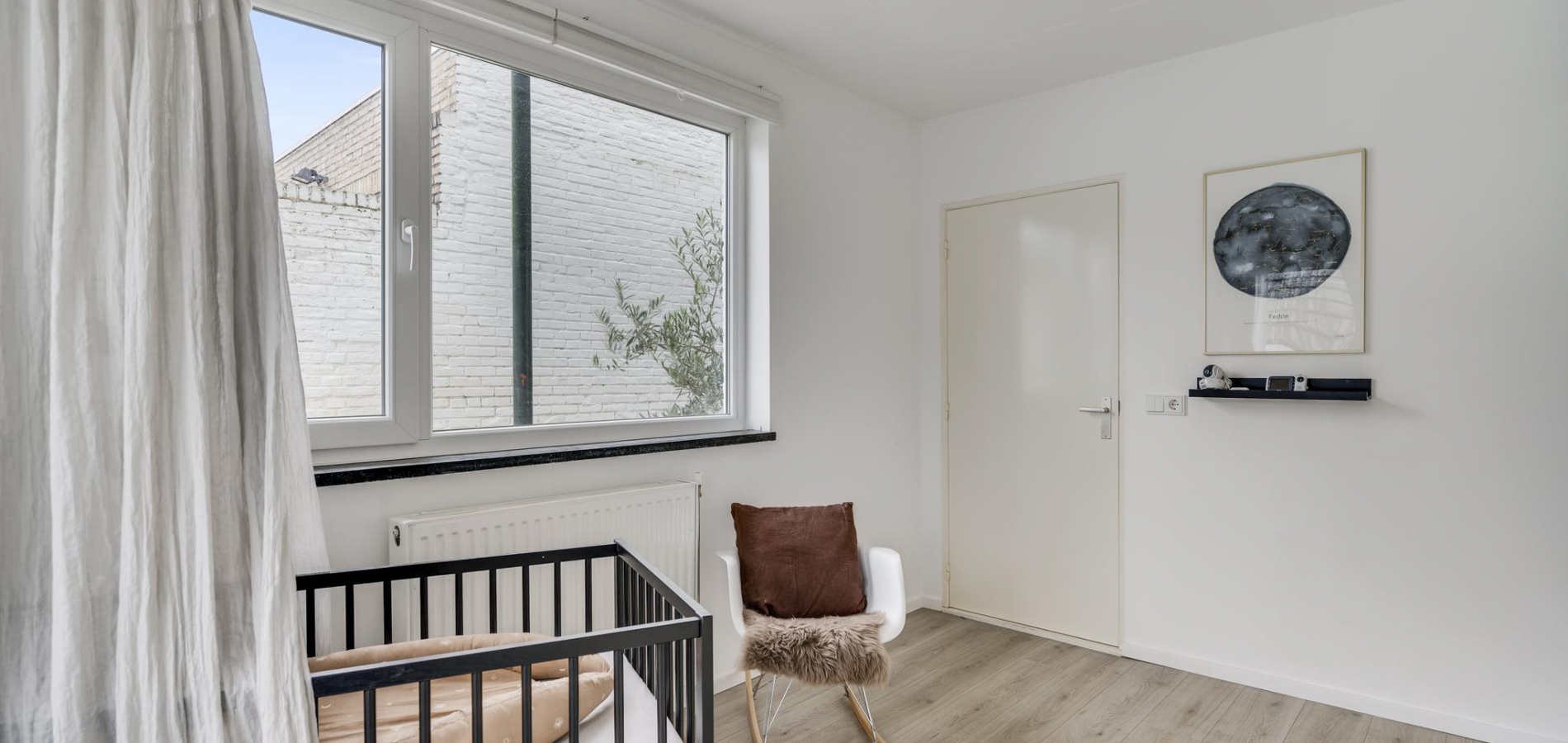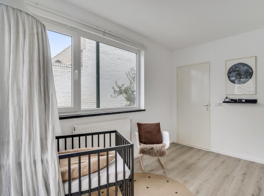 In het verlengde van de keuken is een portaal waaraan de wasruimte en slaapkamer grenzen. De slaapkamer (3.96 x 2.98) heeft openslaande deuren naar de tuin en is goed in te delen als tweepersoonskamer. Als laatste ziet u de moderne badkamer (ca. 2.65 x 2.60) met een aparte cv-ruimte. De badkamer is fraai ingedeeld met een ligbad/douchecombinatie, een wastafel en trendy accessoires.