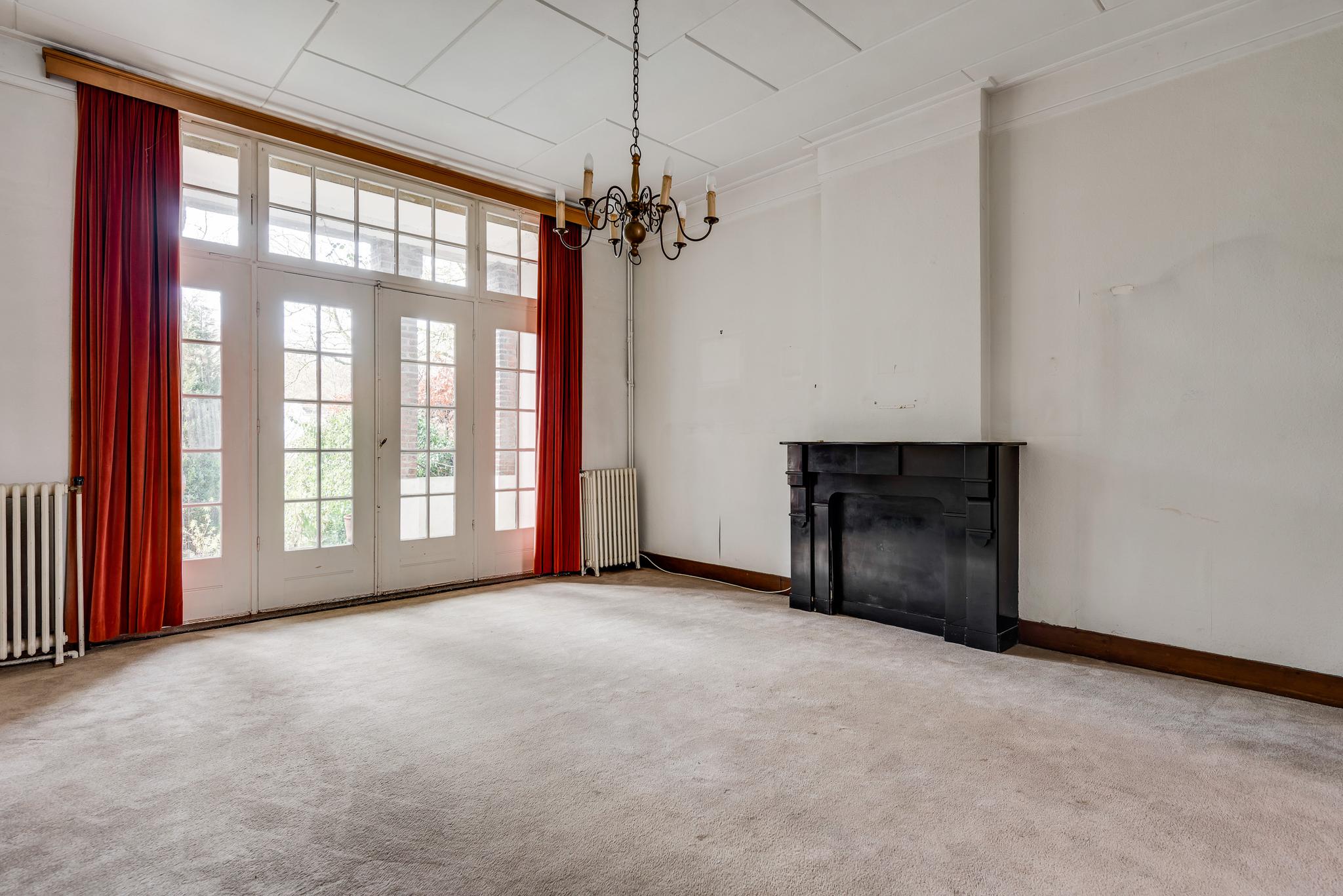 Rechts van de hal is de woonkamer (10.19 x 4.60) met een erker, openslaande deuren en twee sierlijke schouwen. Verrassend is de tweede woonkamer (9.37 x 4.50) aan de overzijde van de hal. Deze ruimte heeft openslaande deuren naar de zijtuin en een marmeren schouw. Niet alleen als woonkamer, maar ook als kantoor-/praktijkruimte aan huis of woonkeuken is dit een zeer geschikte ruimte. Aan de achterzijde zijn de keuken en bijkeuken gesitueerd. De keuken (4.05 x 4.05) heeft lichtinval aan twee zijden en vanuit de bijkeuken (4.00 x 2.49) is de achtertuin te bereiken.