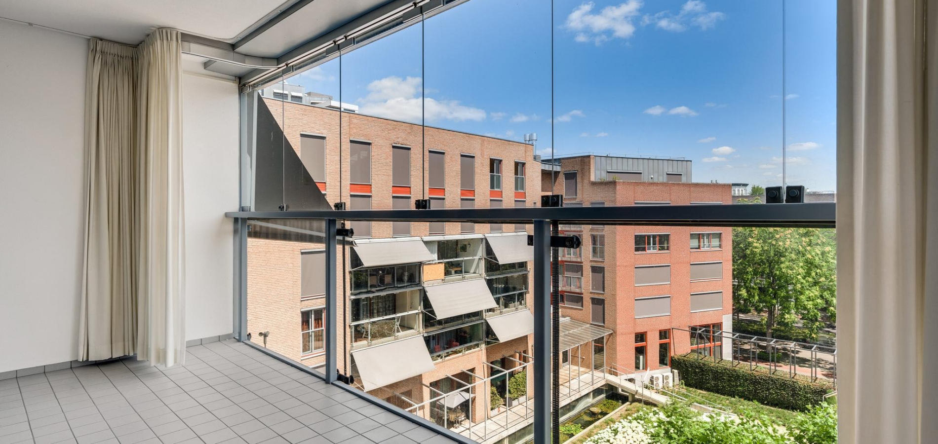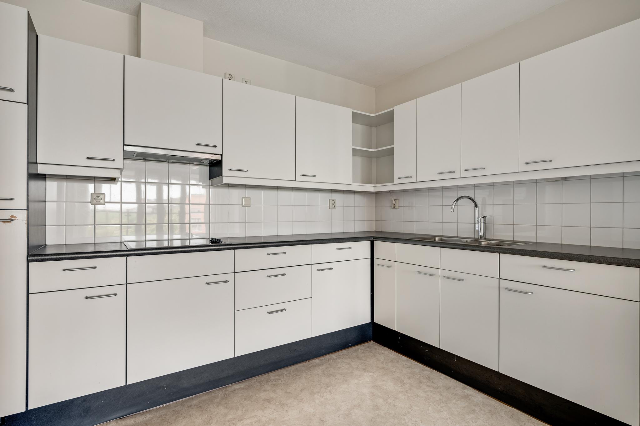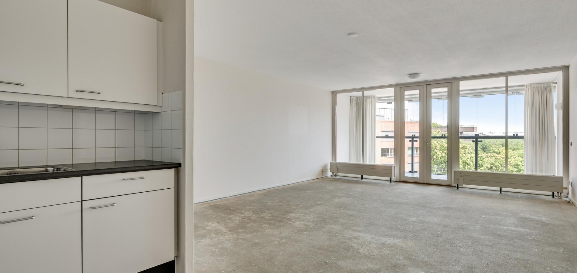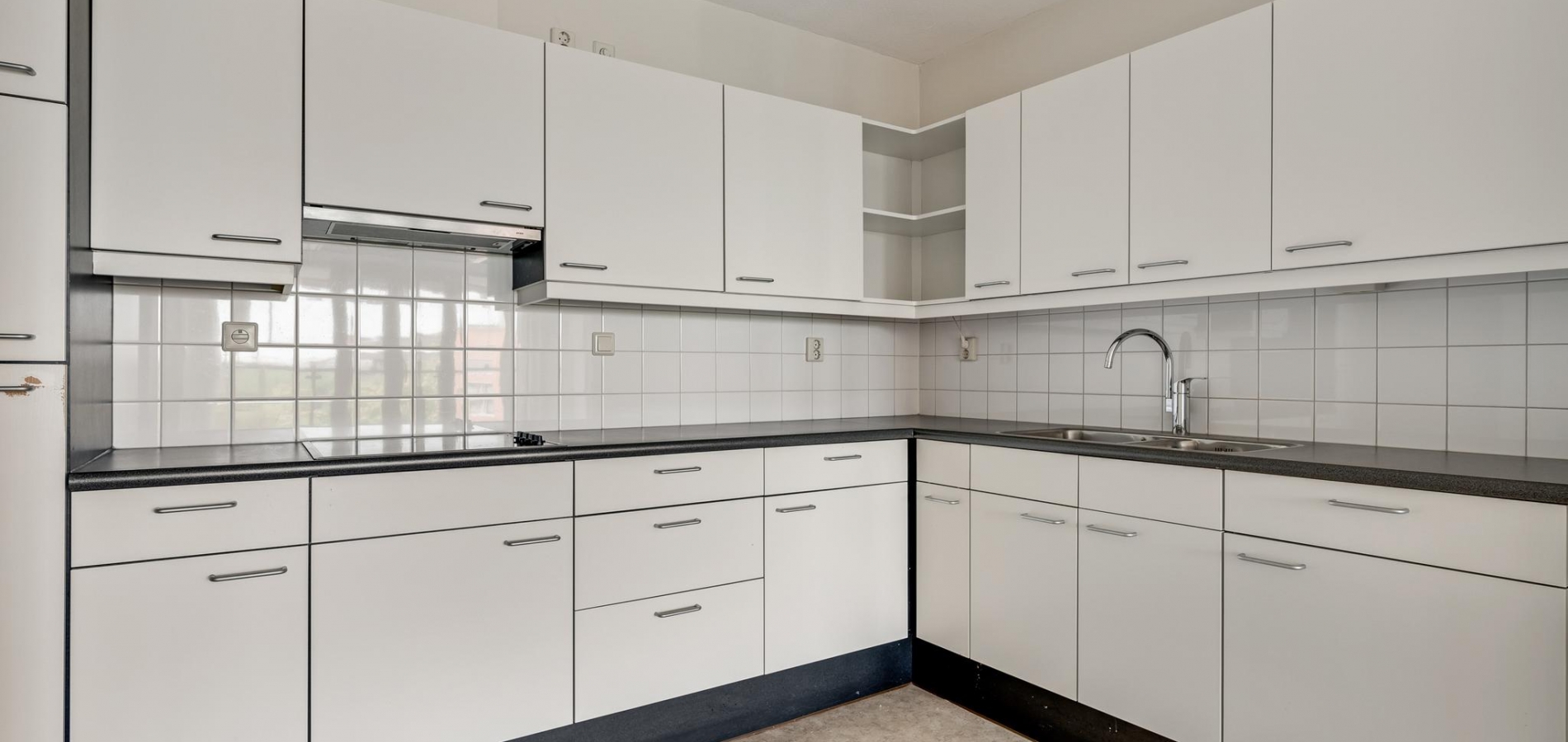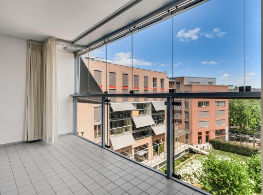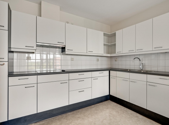 De woonkamer (circa 6,38 x 5,00) is een leefruimte van goed formaat, met openslaande deuren naar de loggia (circa 5,00 x 2,20). Vanuit de woonkamer kijkt u, via de loggia, naar de boomtoppen in de sfeervolle binnentuin. In de halfopen keuken staat een lichte, ruime hoekopstelling met een keramische kookplaat, afzuigkap en een koelkast.
