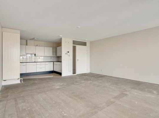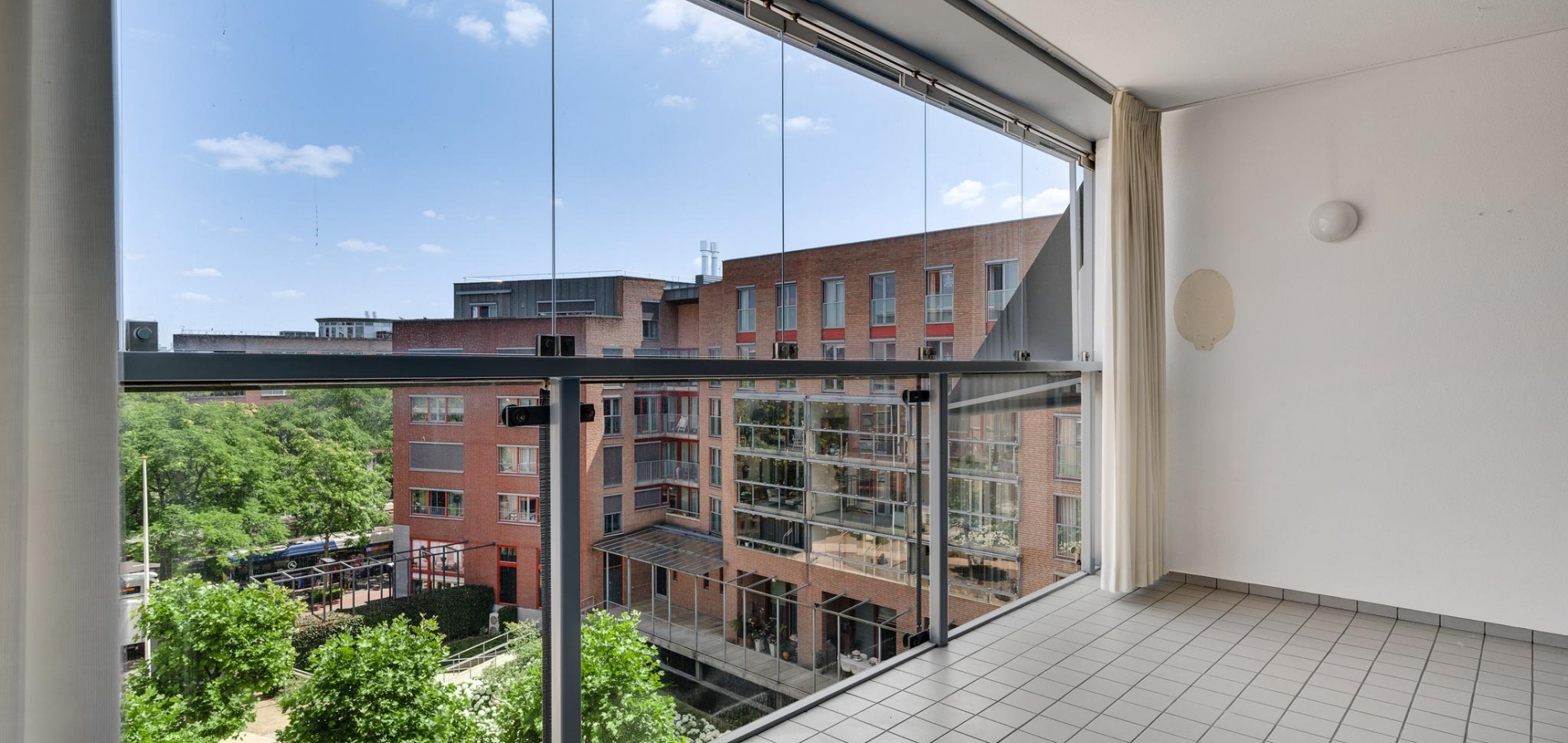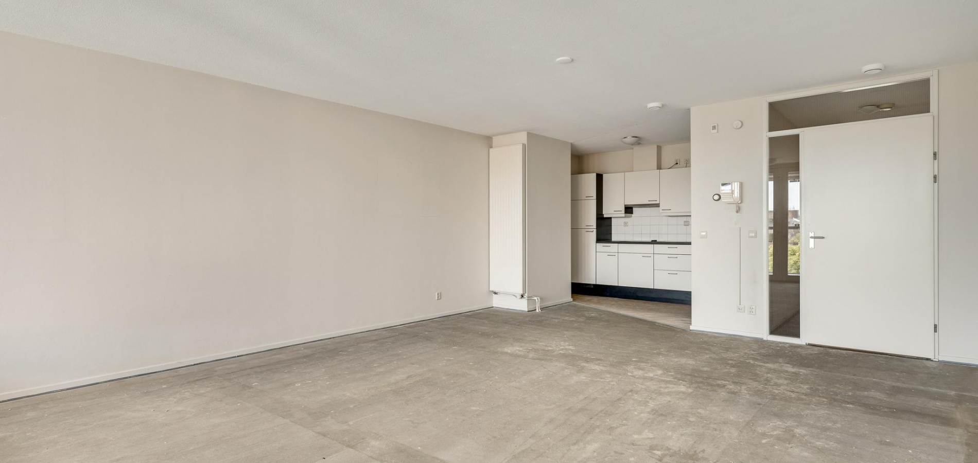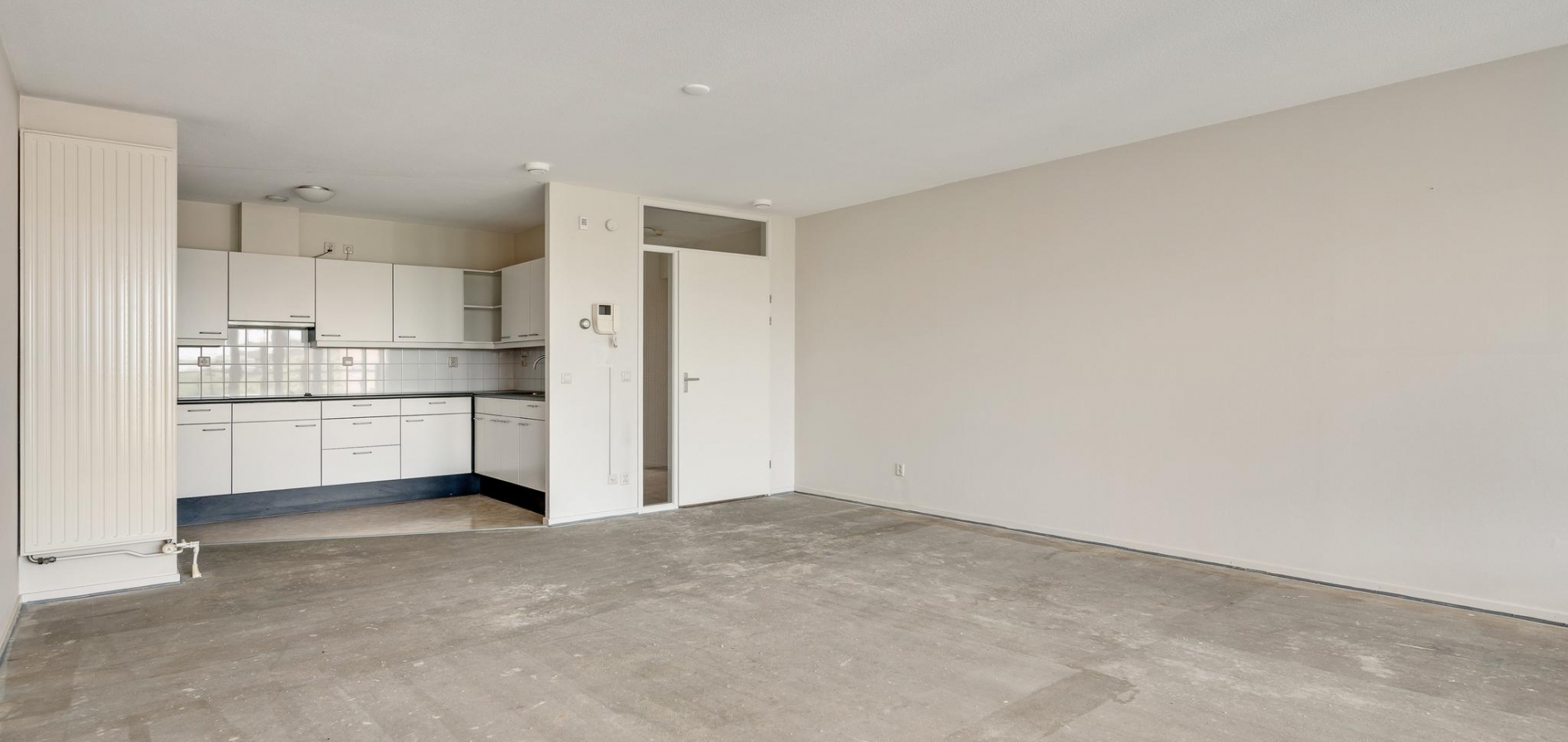 De woonkamer (circa 6,38 x 5,00) is een leefruimte van goed formaat, met openslaande deuren naar de loggia (circa 5,00 x 2,20). Vanuit de woonkamer kijkt u, via de loggia, naar de boomtoppen in de sfeervolle binnentuin. In de halfopen keuken staat een lichte, ruime hoekopstelling met een keramische kookplaat, afzuigkap en een koelkast.