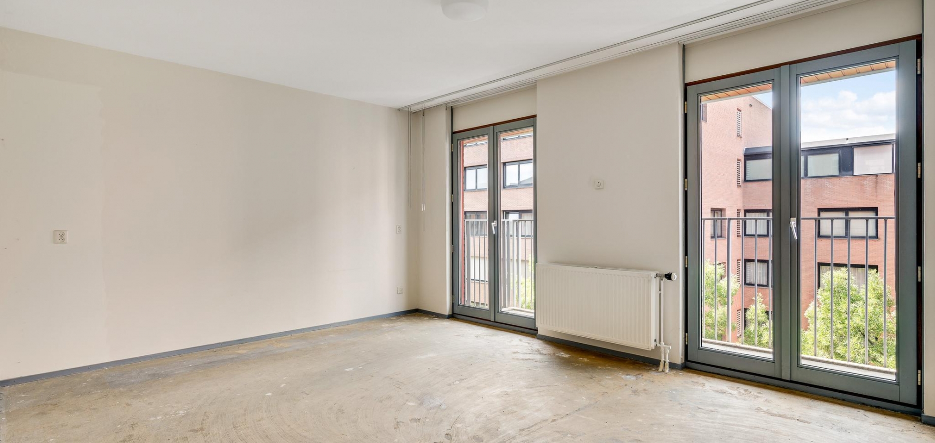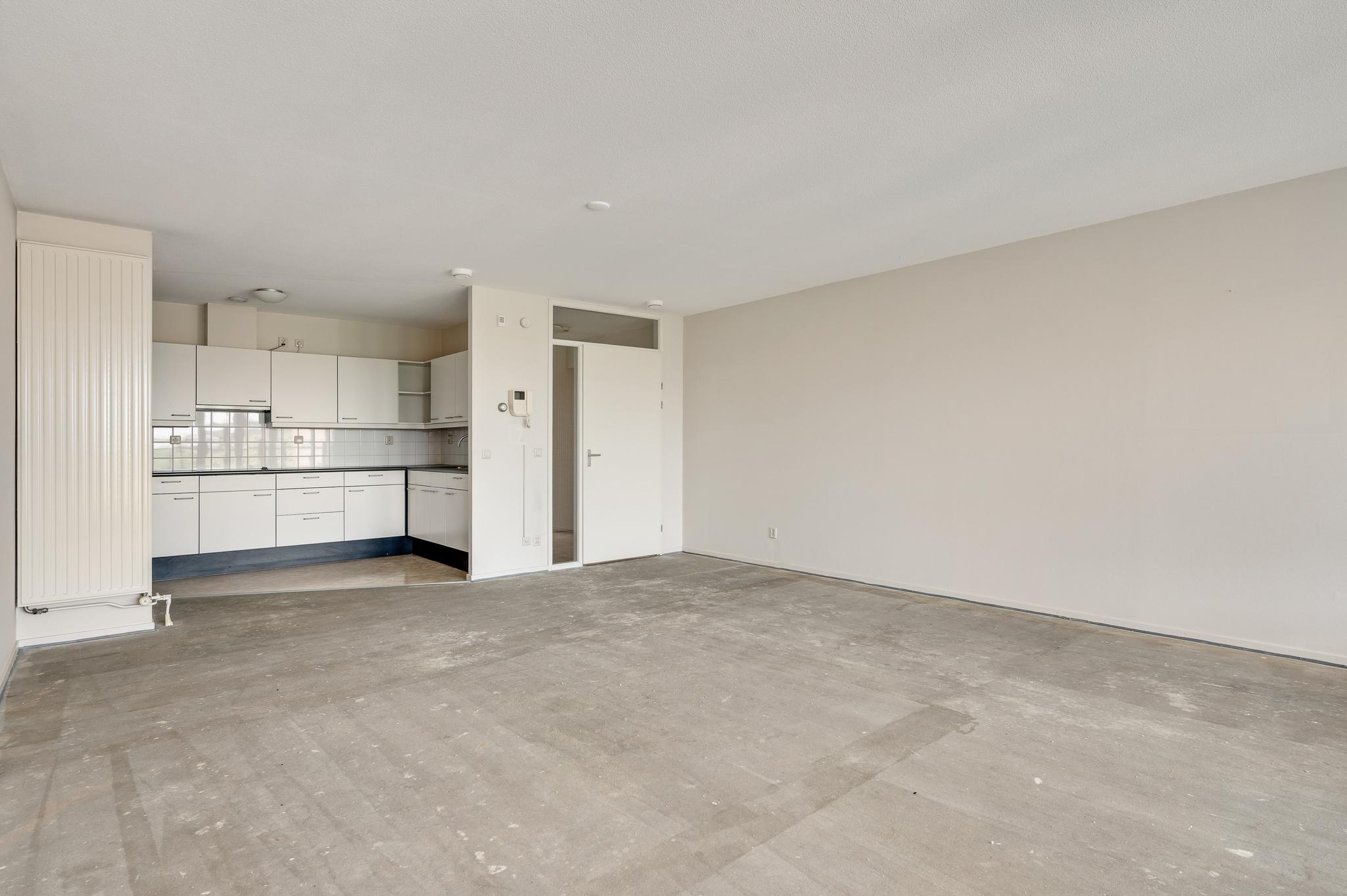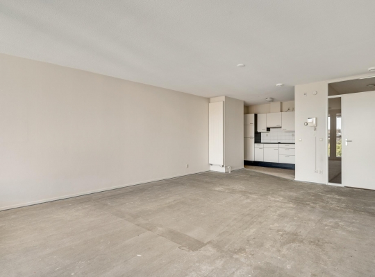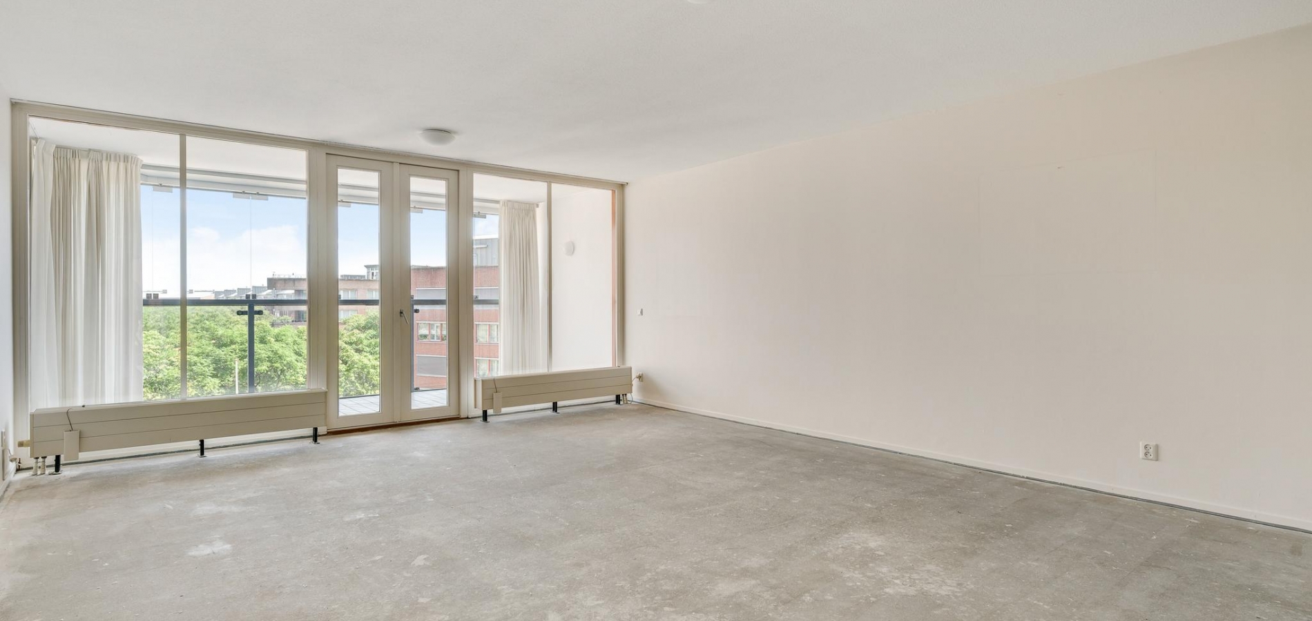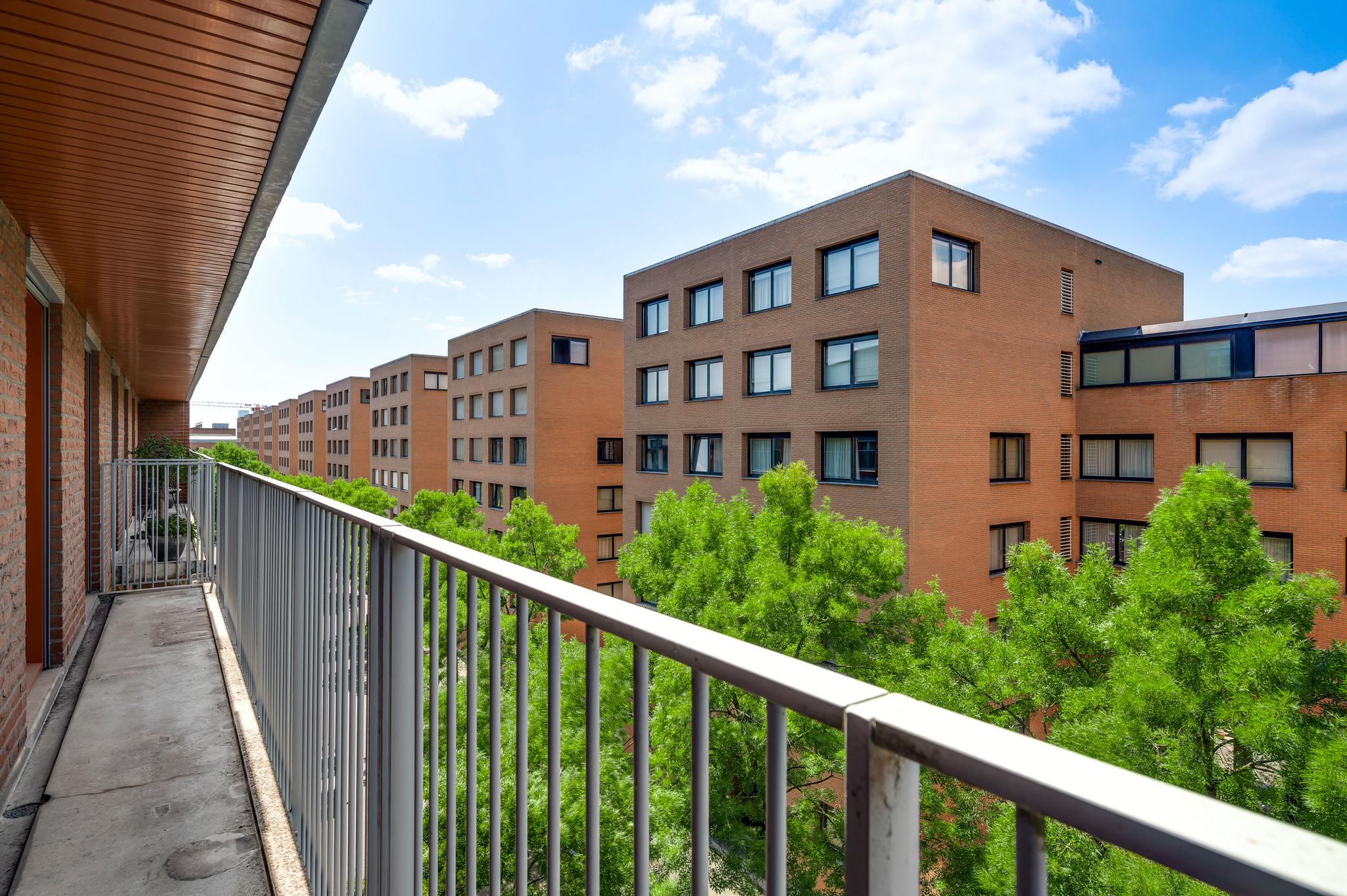 De woonkamer (circa 6,38 x 5,00) is een leefruimte van goed formaat, met openslaande deuren naar de loggia (circa 5,00 x 2,20). Vanuit de woonkamer kijkt u, via de loggia, naar de boomtoppen in de sfeervolle binnentuin. In de halfopen keuken staat een lichte, ruime hoekopstelling met een keramische kookplaat, afzuigkap en een koelkast.
