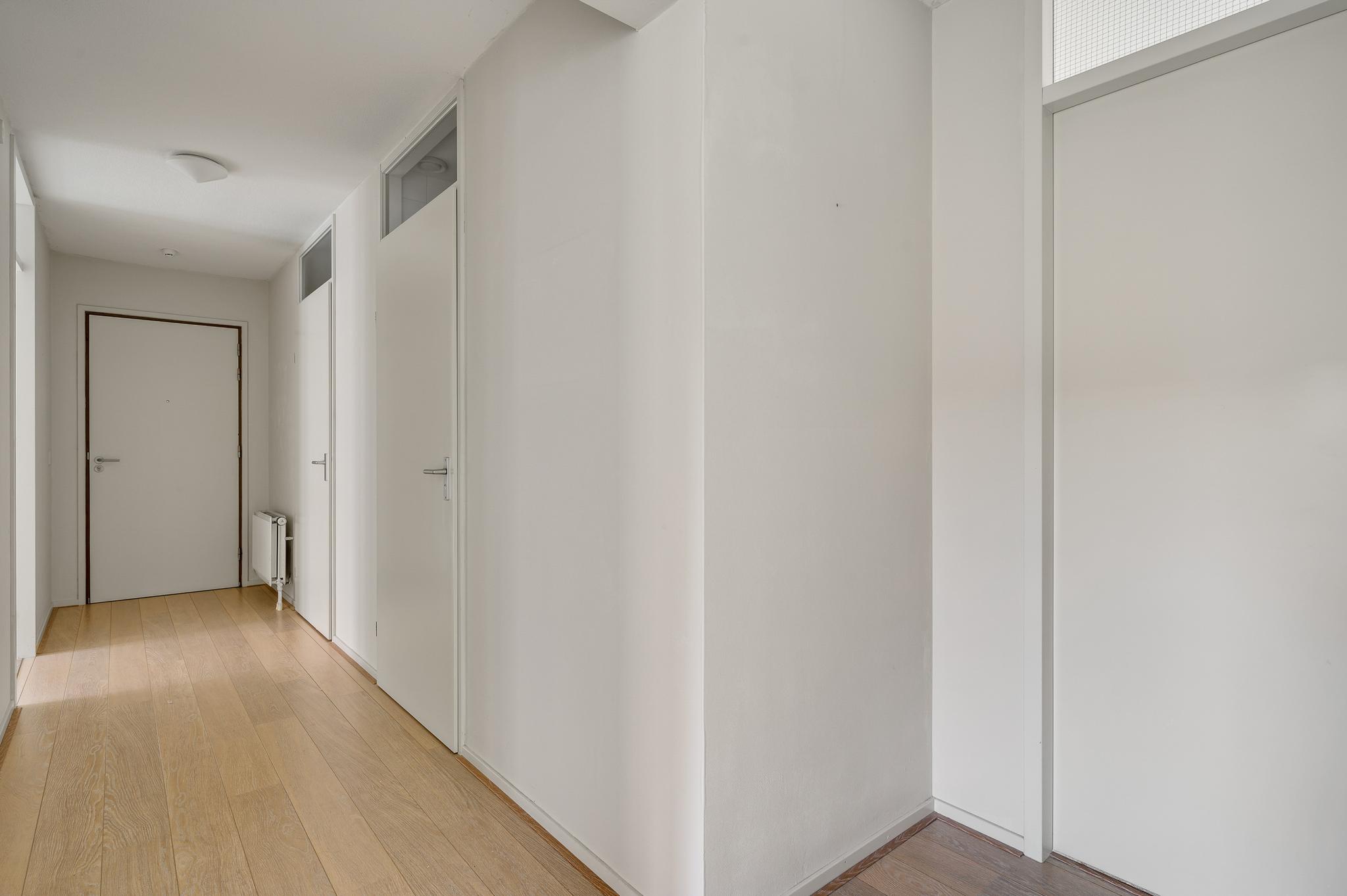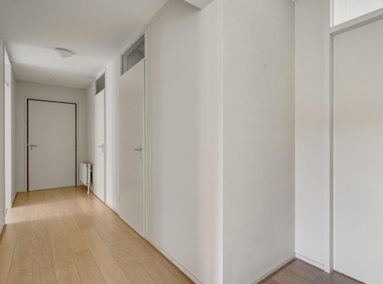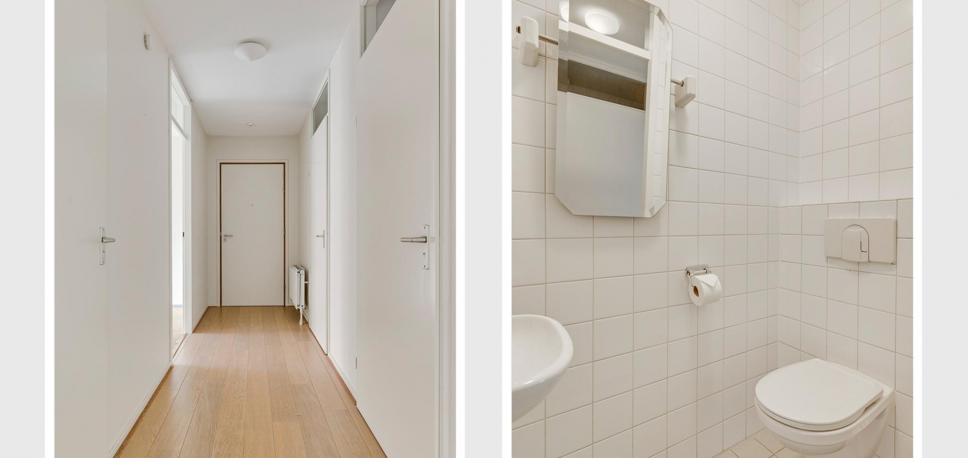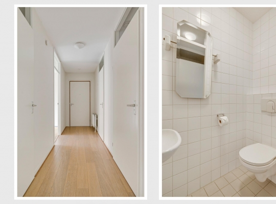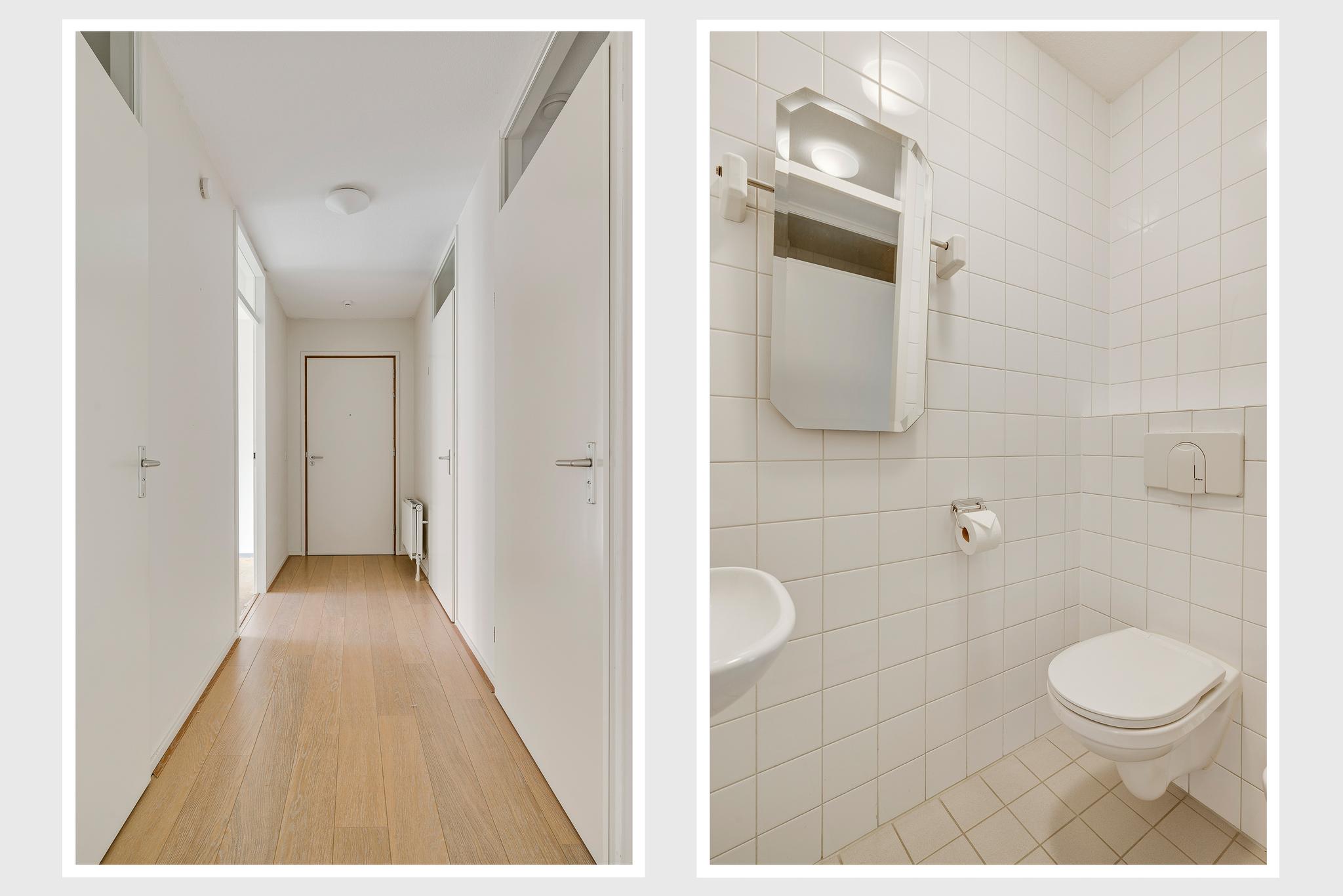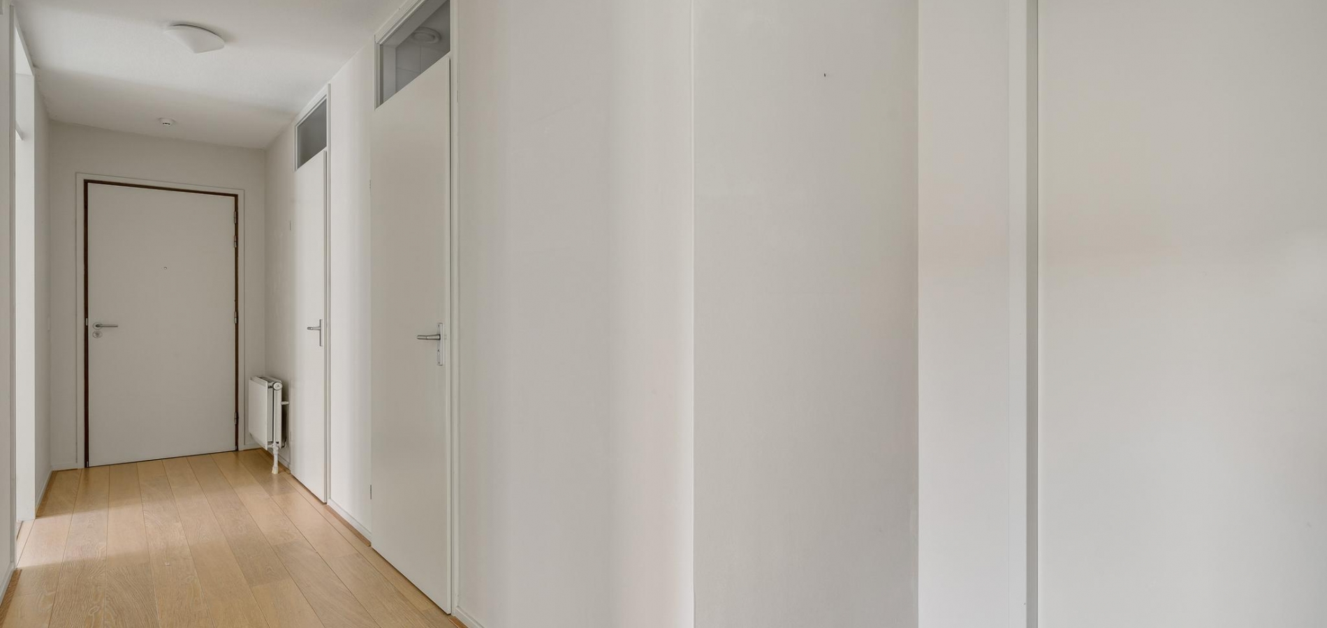 Met de lift of trap gaat u naar de vierde verdieping, waar dit gelijkvloerse appartement gesitueerd is. Achter de voordeur is een ruime ontvangsthal, met laminaat op de vloer. Aan de linkerzijde zijn de toiletruimte met fonteintje en een berging, die (deels) als garderobe gebruikt kan worden.