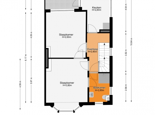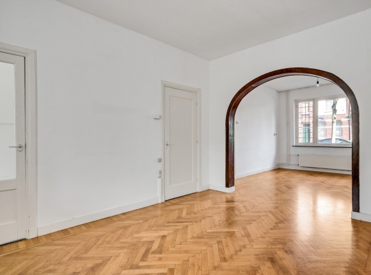 De woon-/eetkamer (circa 8,15 x 3,74) is een fraaie leefruimte met een visgraat parketvloer, dubbele schouw, hoge plafonds en paneeldeuren. Aan de achterzijde is een serre (circa 2,49 x 3,02) gebouwd, perfect als werkkamer of speelkamer van de kinderen. Een deel van de woonkamer kan worden gebruikt als slaapkamer I.