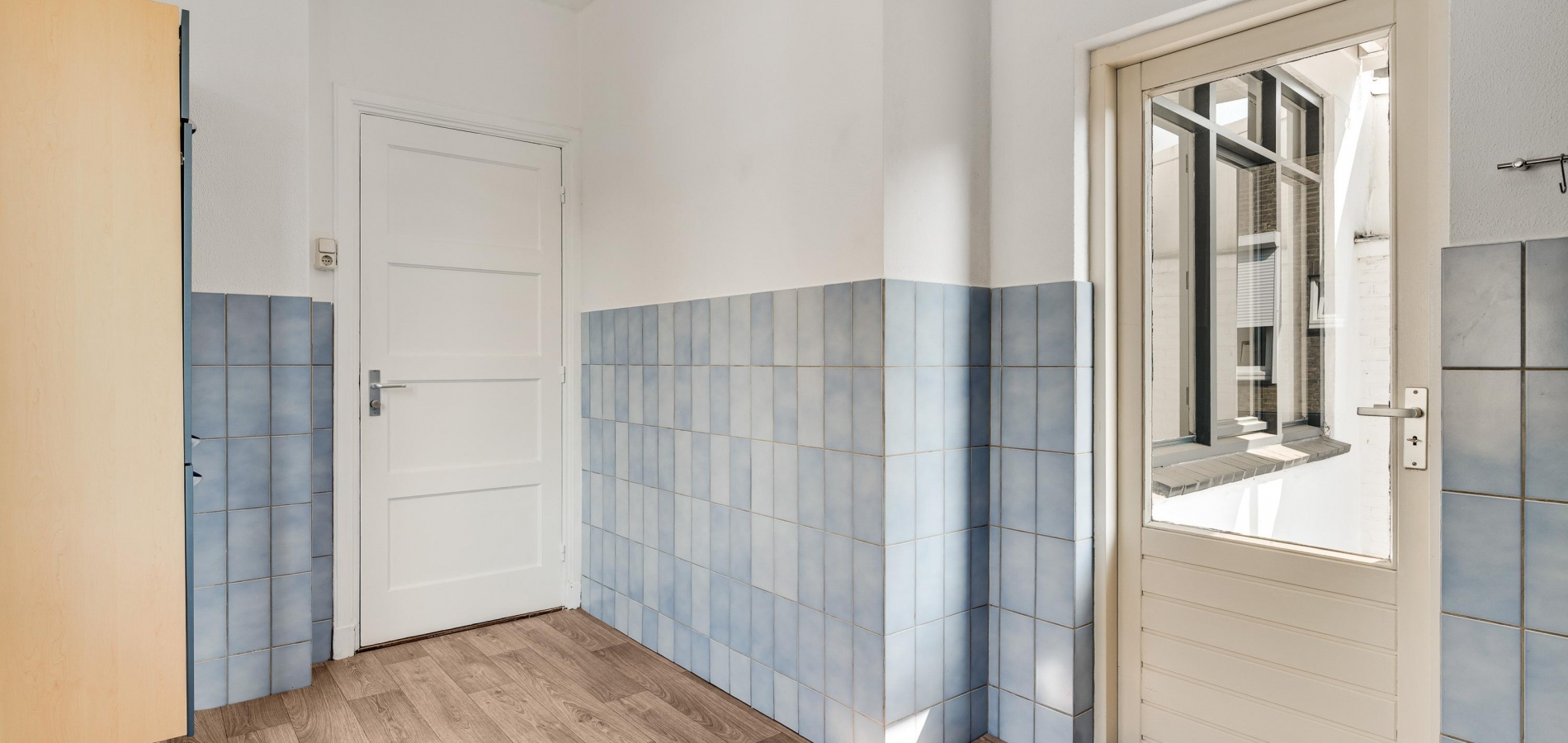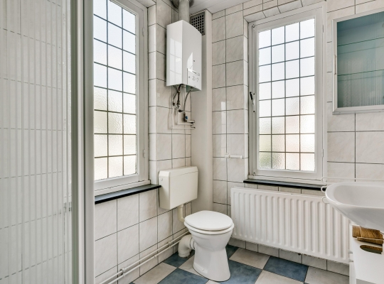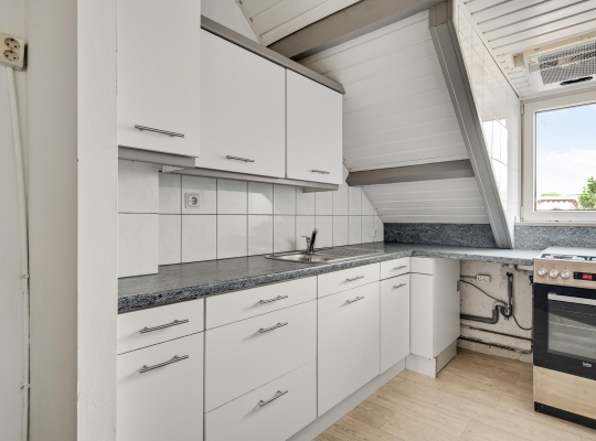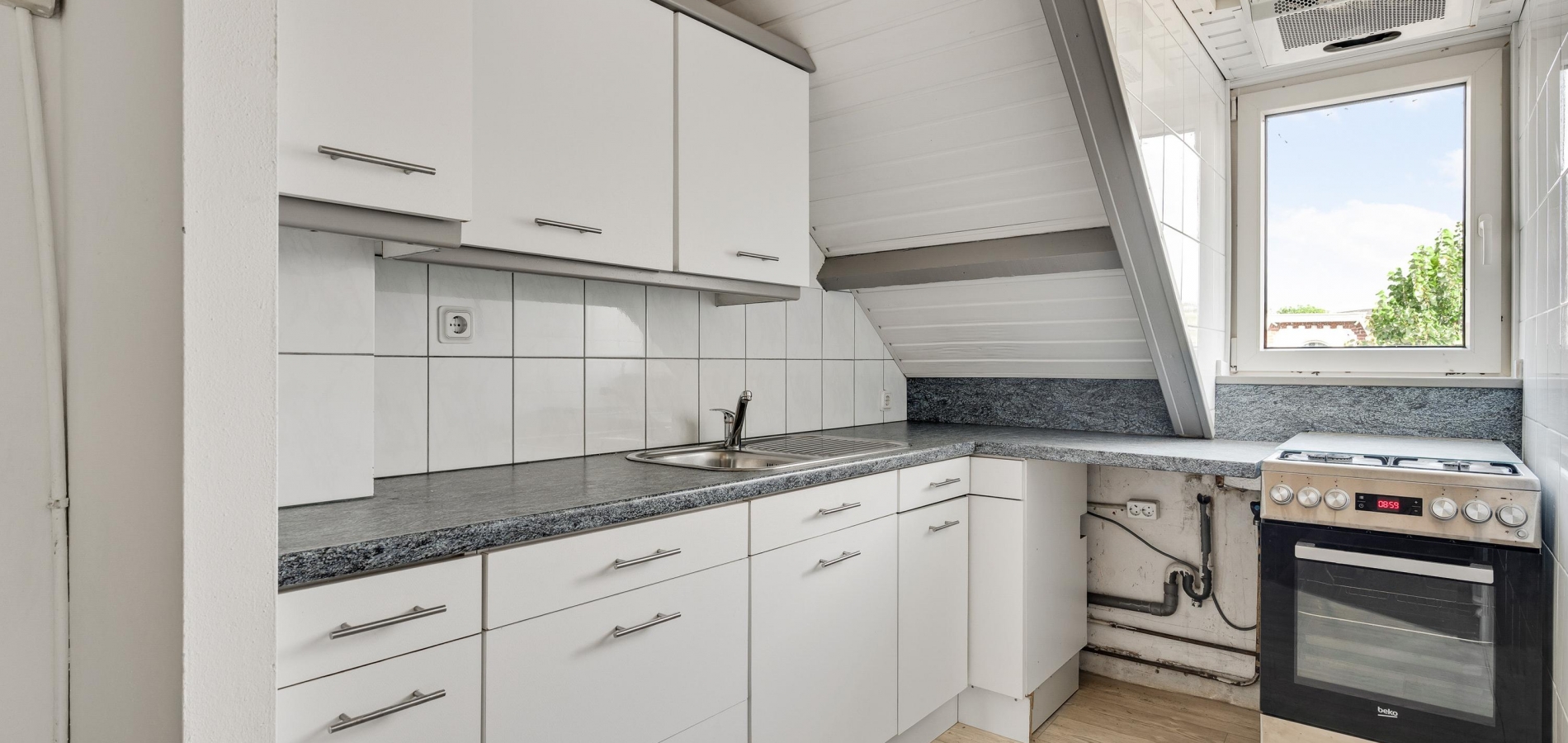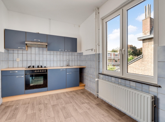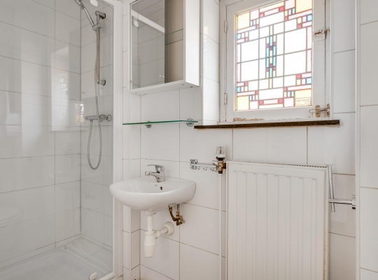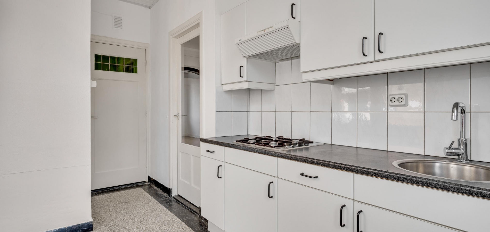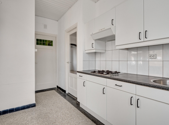 Vanuit de hal en woon-/eetkamer heeft u toegang tot de keuken (circa 4,49/3,23 x 2,47/2,03). Hier ligt de originele vloer en het hoge plafond maakt, samen met de grote ramen, de keuken heel ruimtelijk. De lichte wandopstelling heeft een ingebouwde gaskookplaat en afzuigkap. Naast de keuken is de badkamer (circa 2,30 x 0,92) met een toilet, wastafel en een douche.