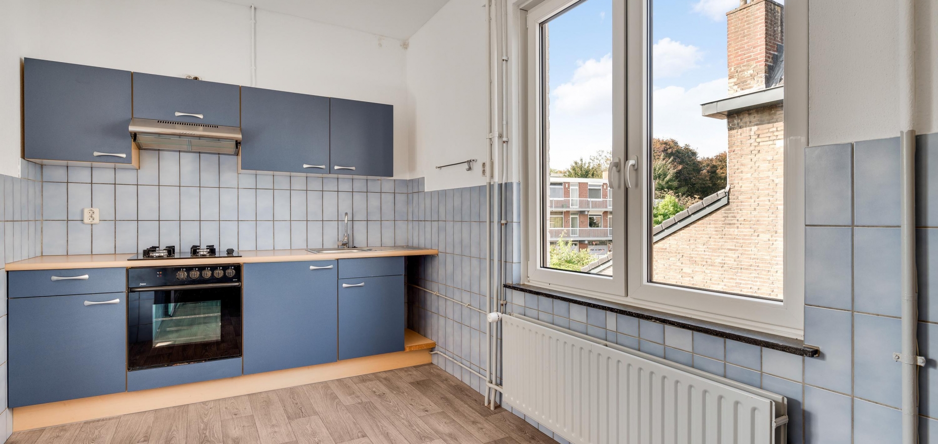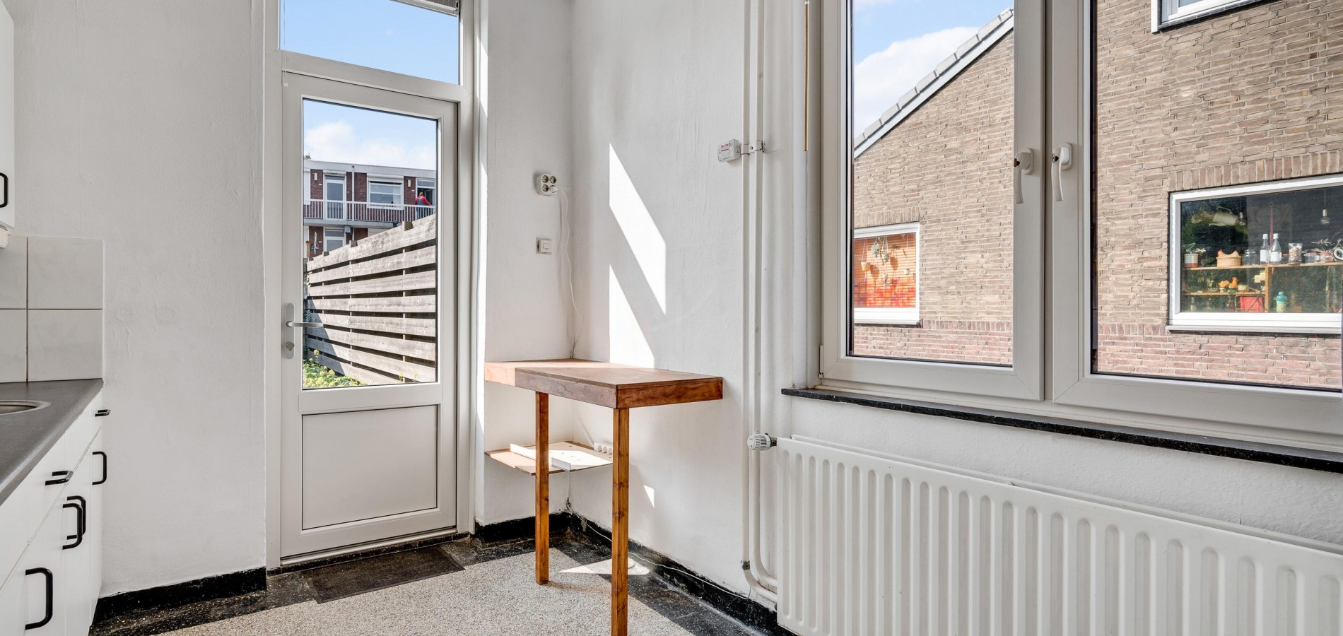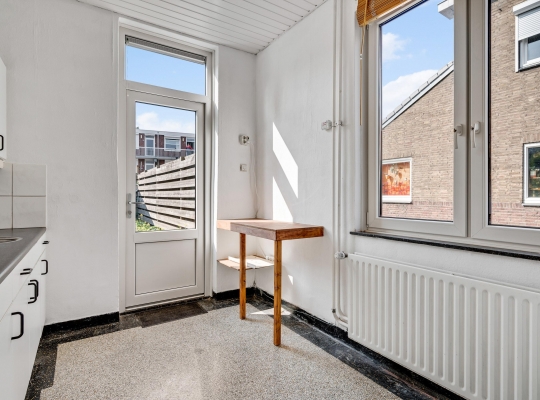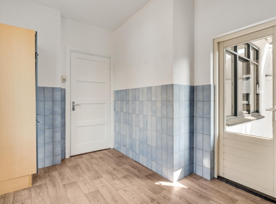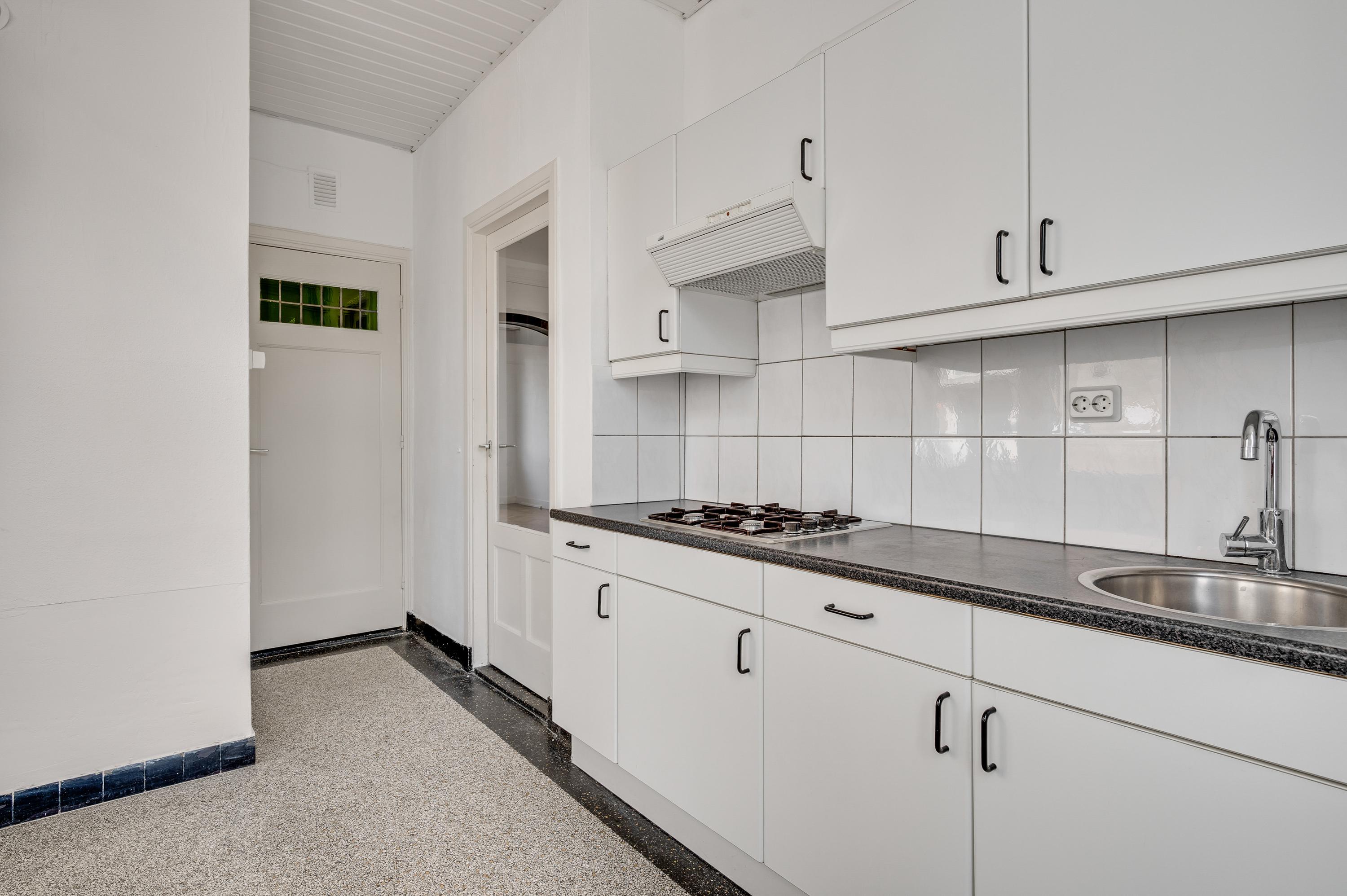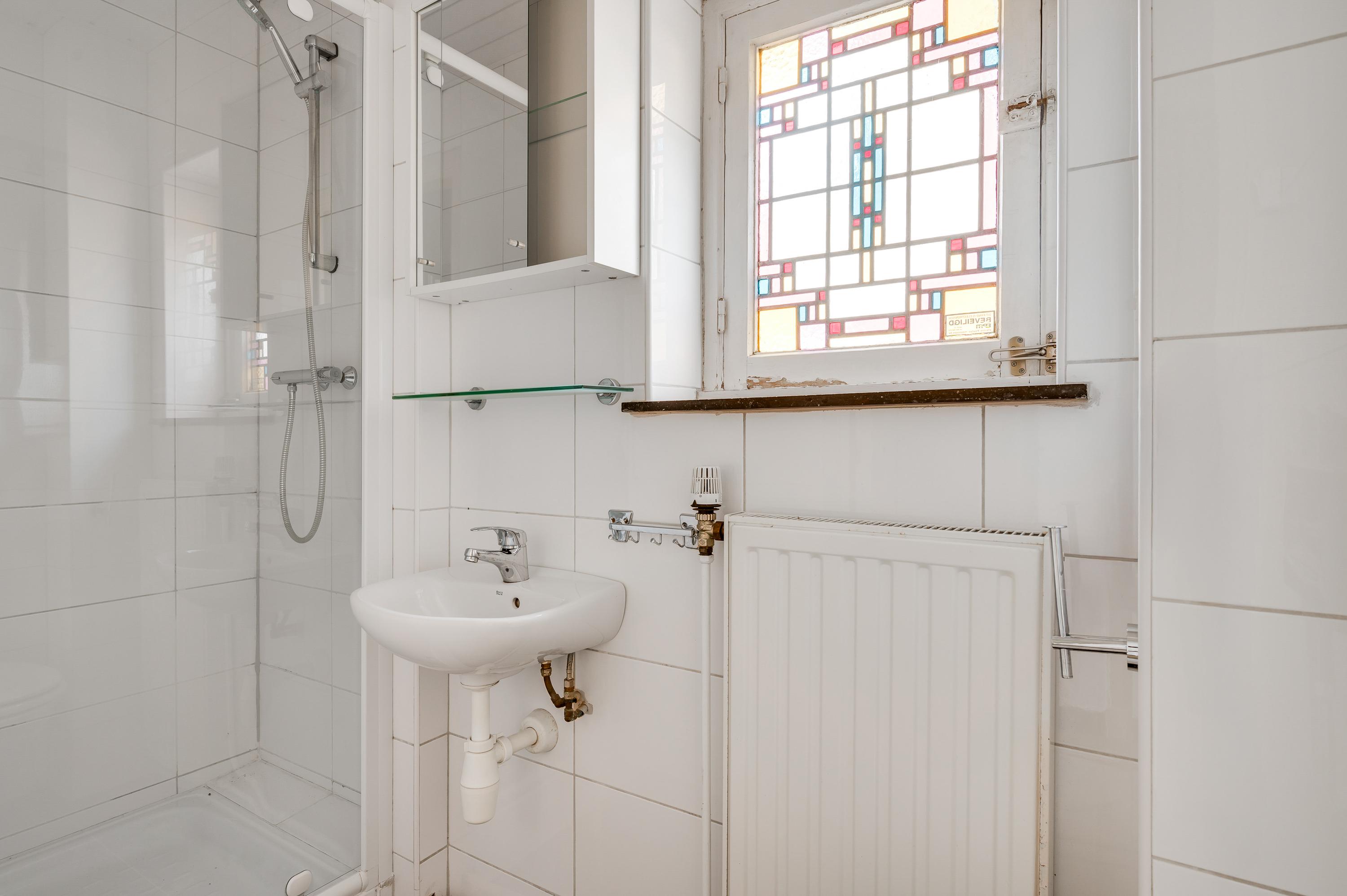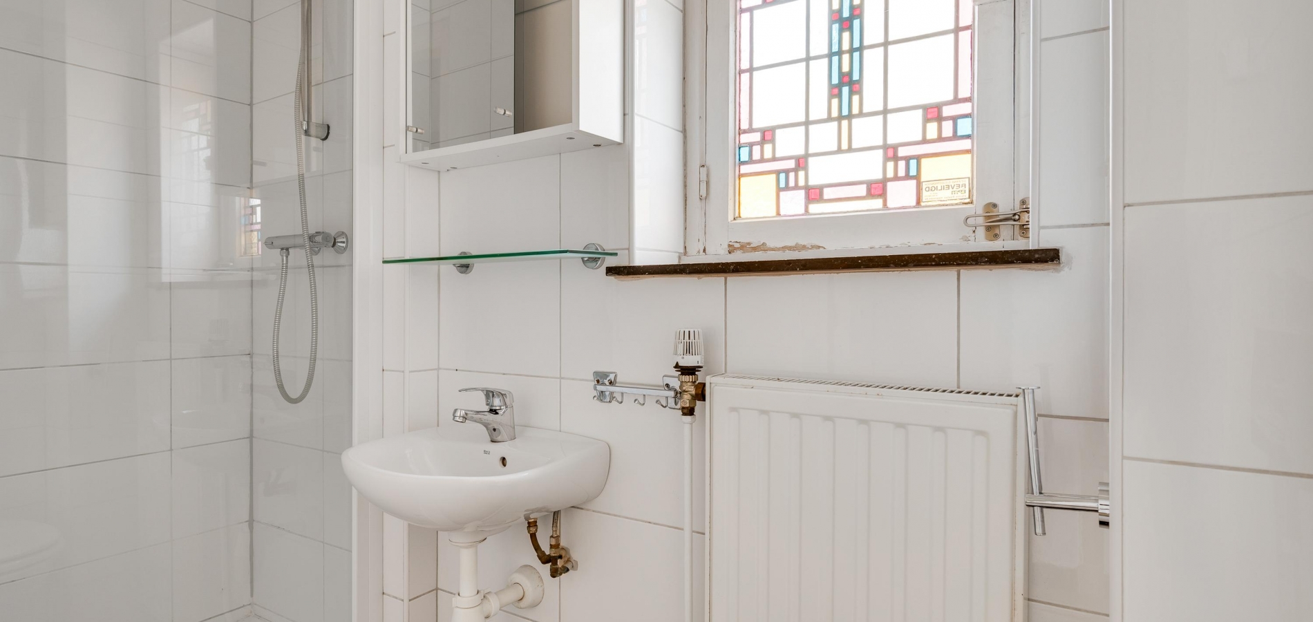 Vanuit de hal en woon-/eetkamer heeft u toegang tot de keuken (circa 4,49/3,23 x 2,47/2,03). Hier ligt de originele vloer en het hoge plafond maakt, samen met de grote ramen, de keuken heel ruimtelijk. De lichte wandopstelling heeft een ingebouwde gaskookplaat en afzuigkap. Naast de keuken is de badkamer (circa 2,30 x 0,92) met een toilet, wastafel en een douche.