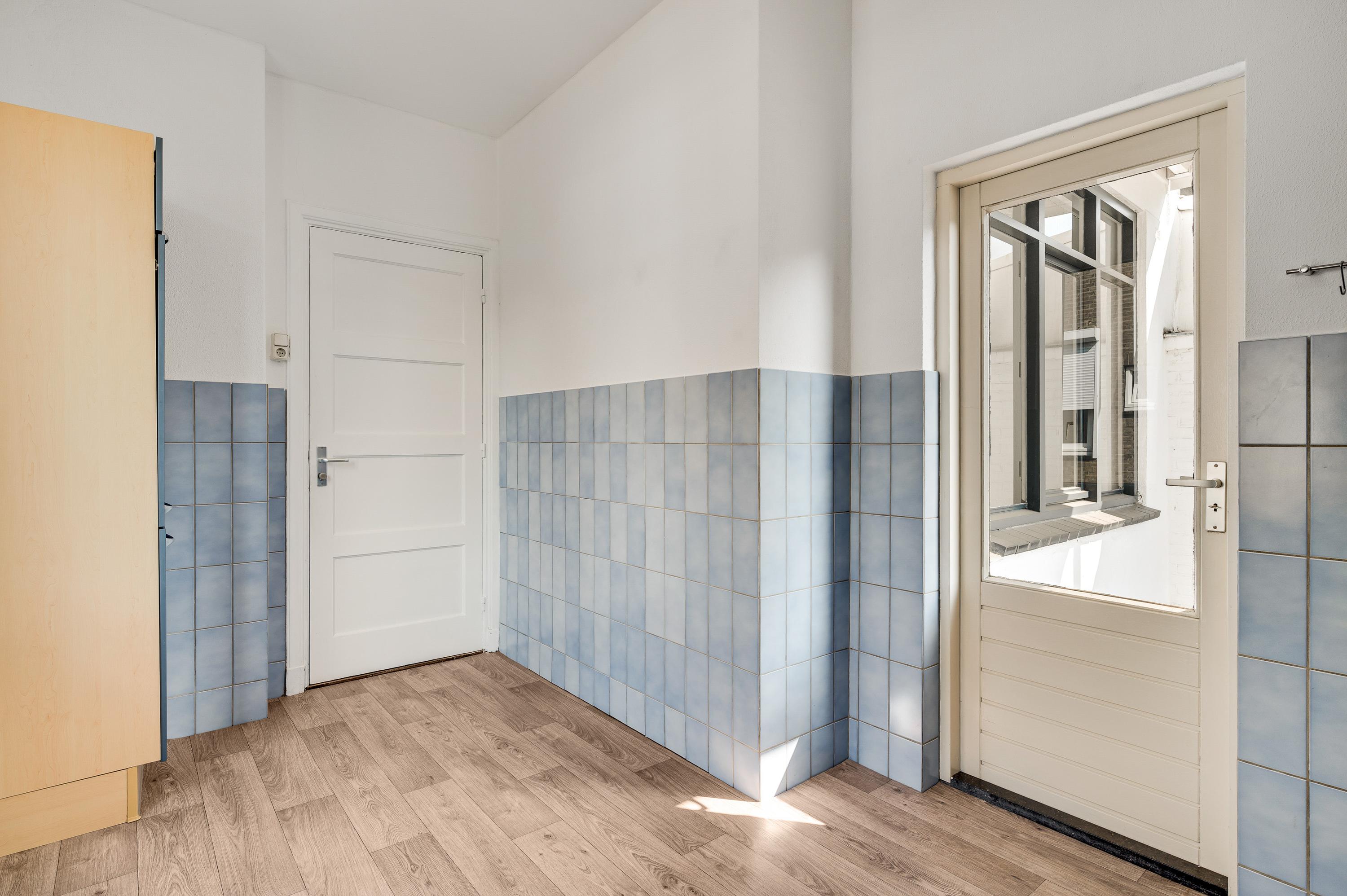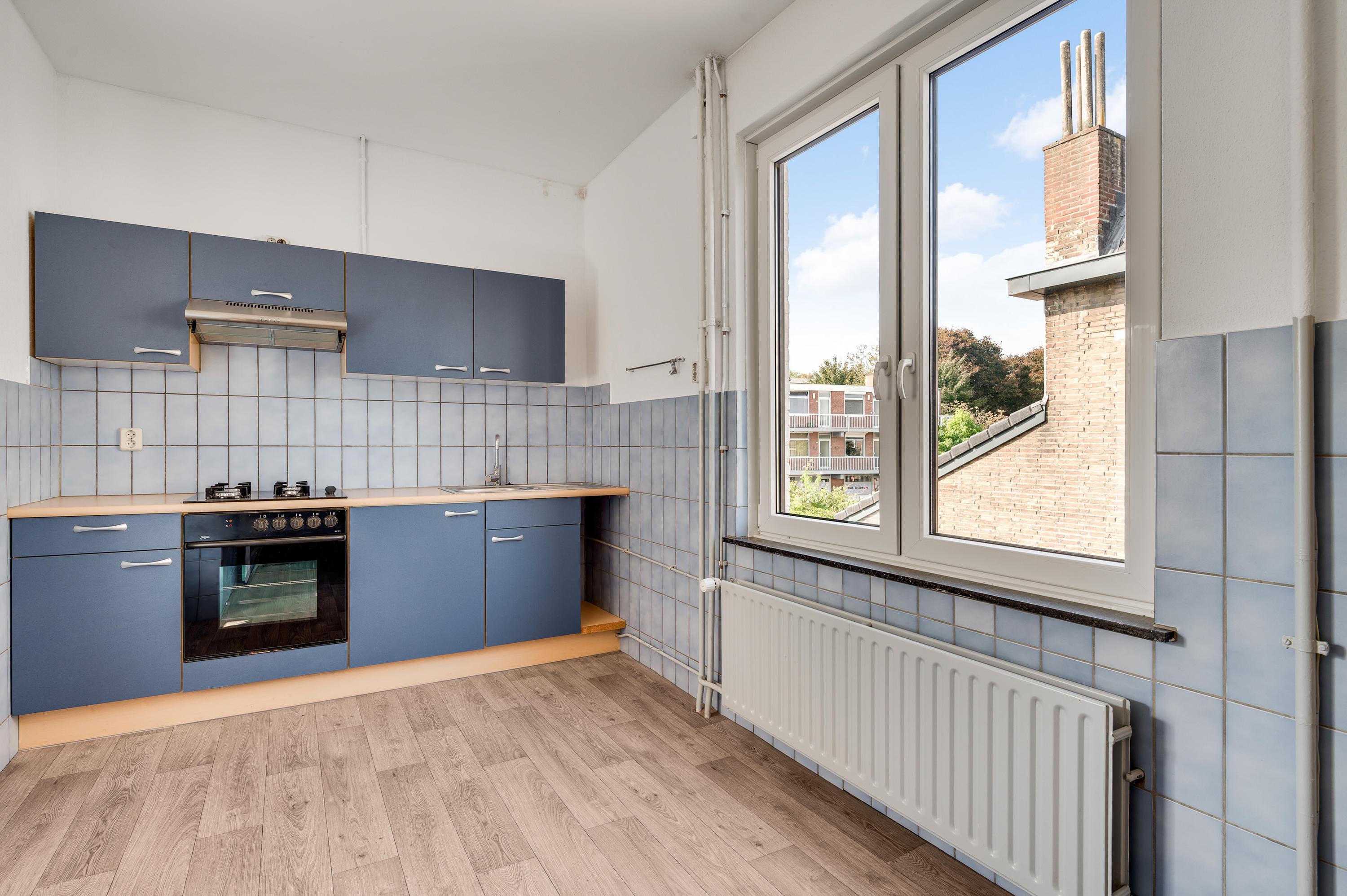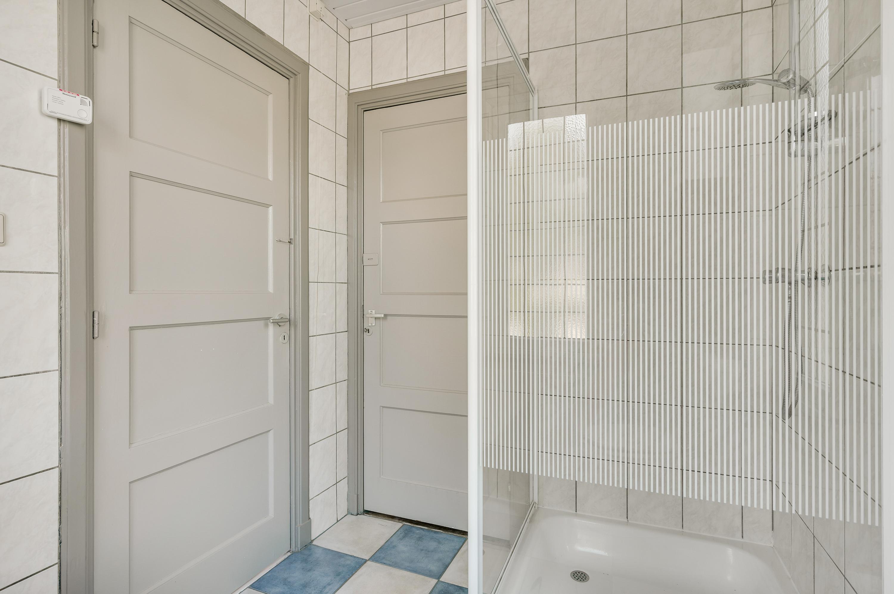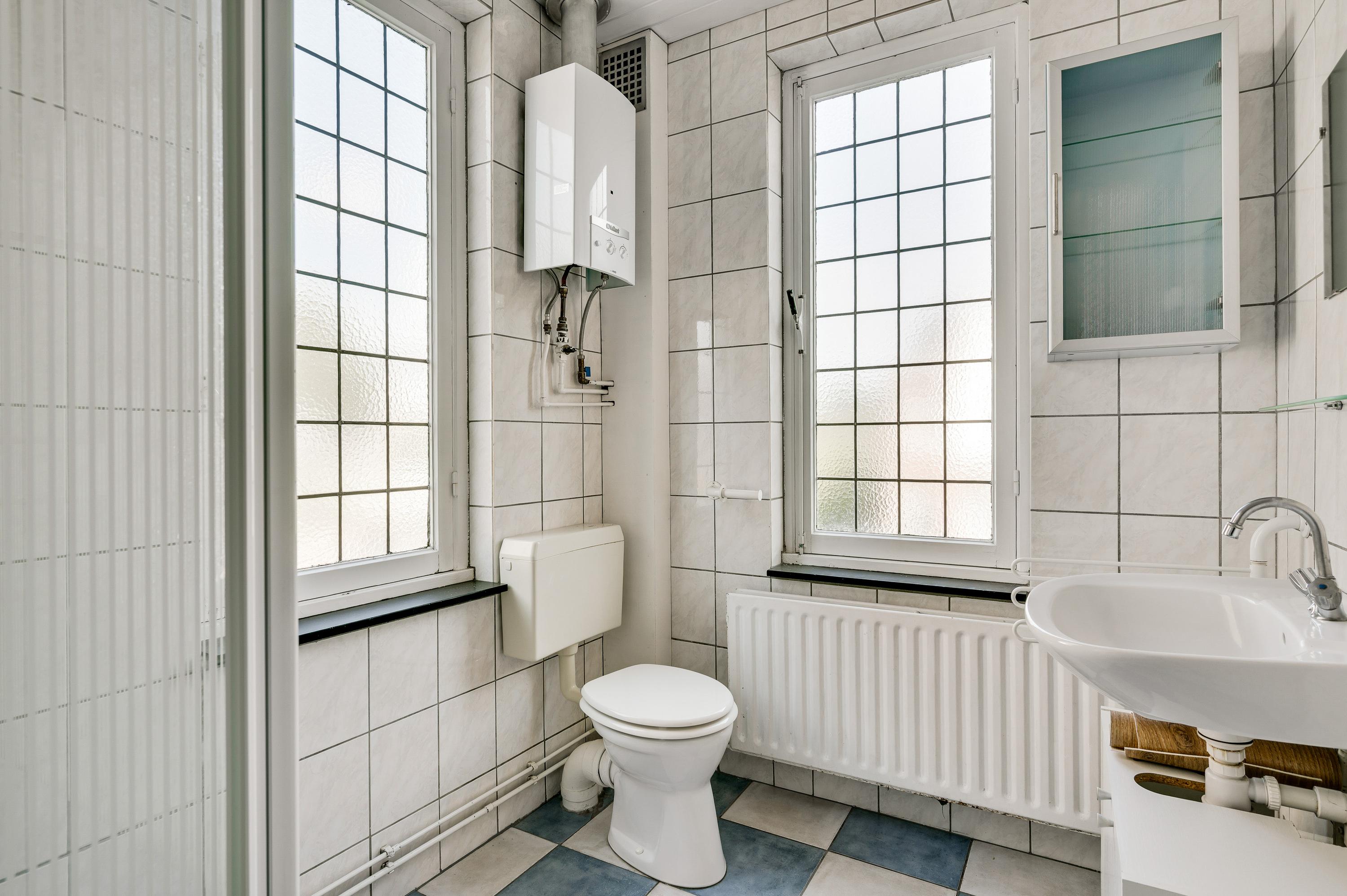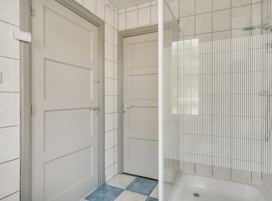 Vanuit de hal en woon-/eetkamer heeft u toegang tot de keuken (circa 4,49/3,23 x 2,47/2,03). Hier ligt de originele vloer en het hoge plafond maakt, samen met de grote ramen, de keuken heel ruimtelijk. De lichte wandopstelling heeft een ingebouwde gaskookplaat en afzuigkap. Naast de keuken is de badkamer (circa 2,30 x 0,92) met een toilet, wastafel en een douche.