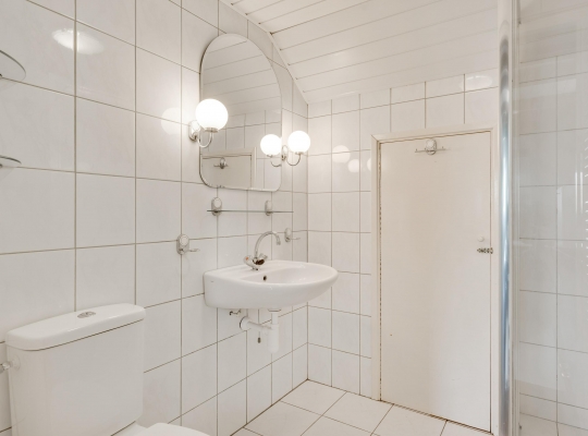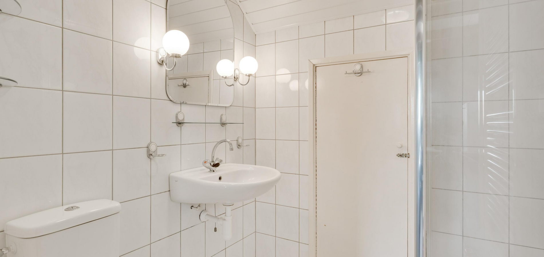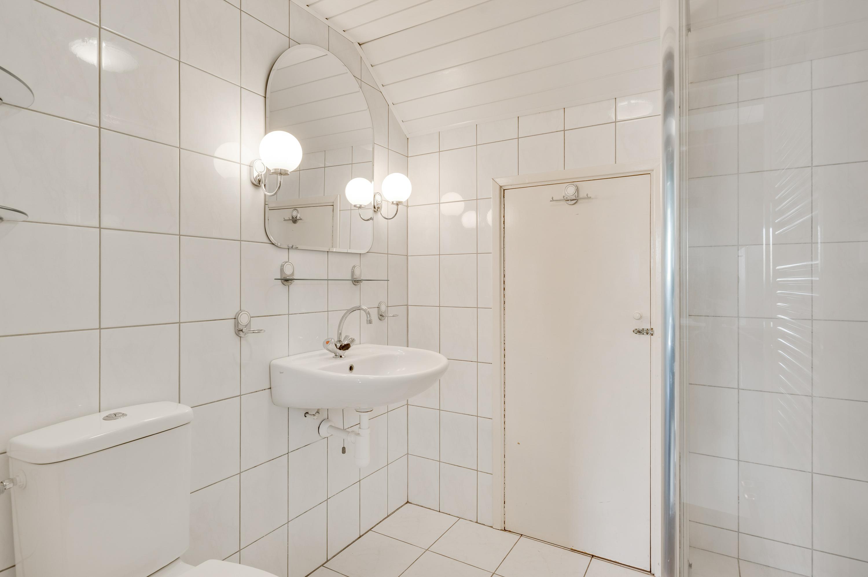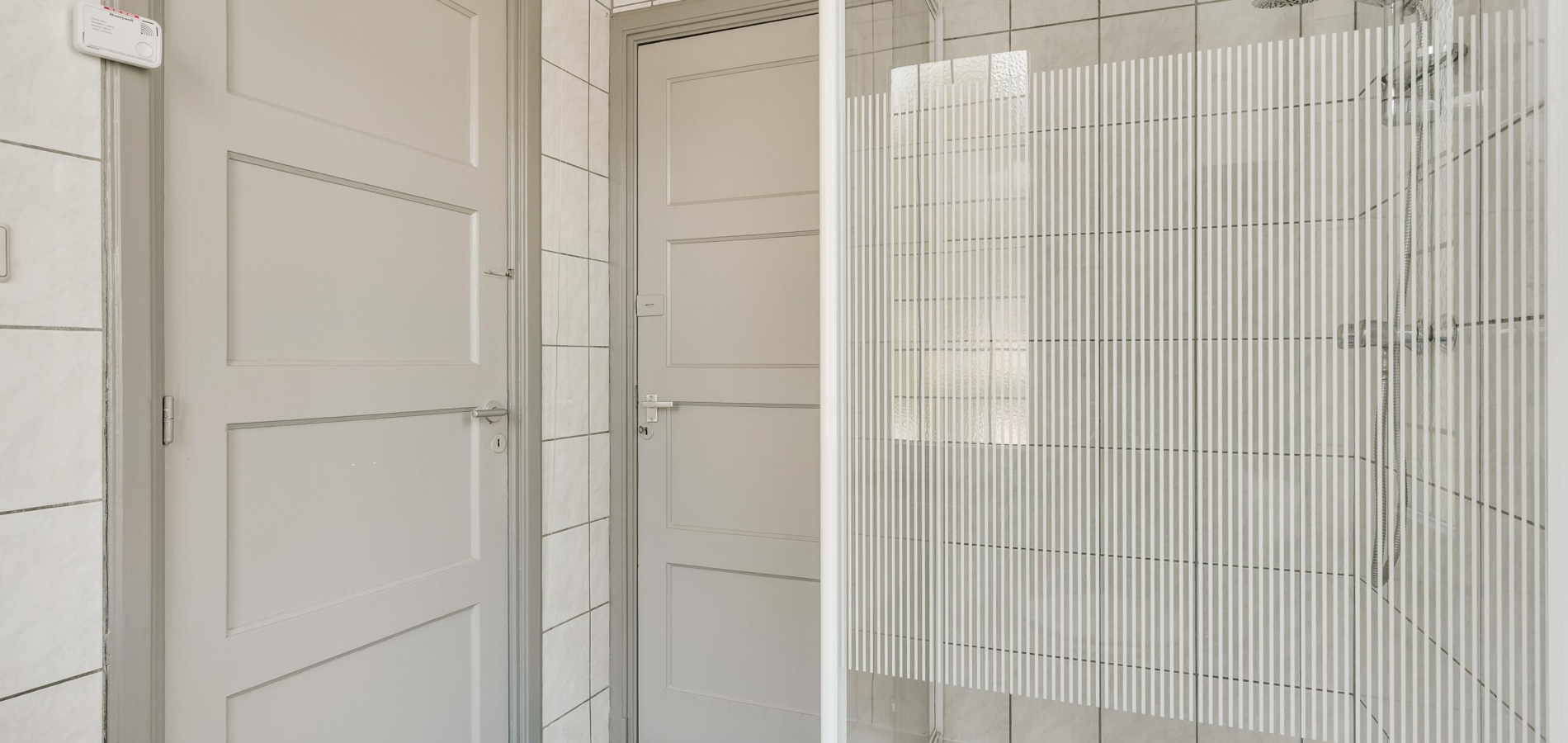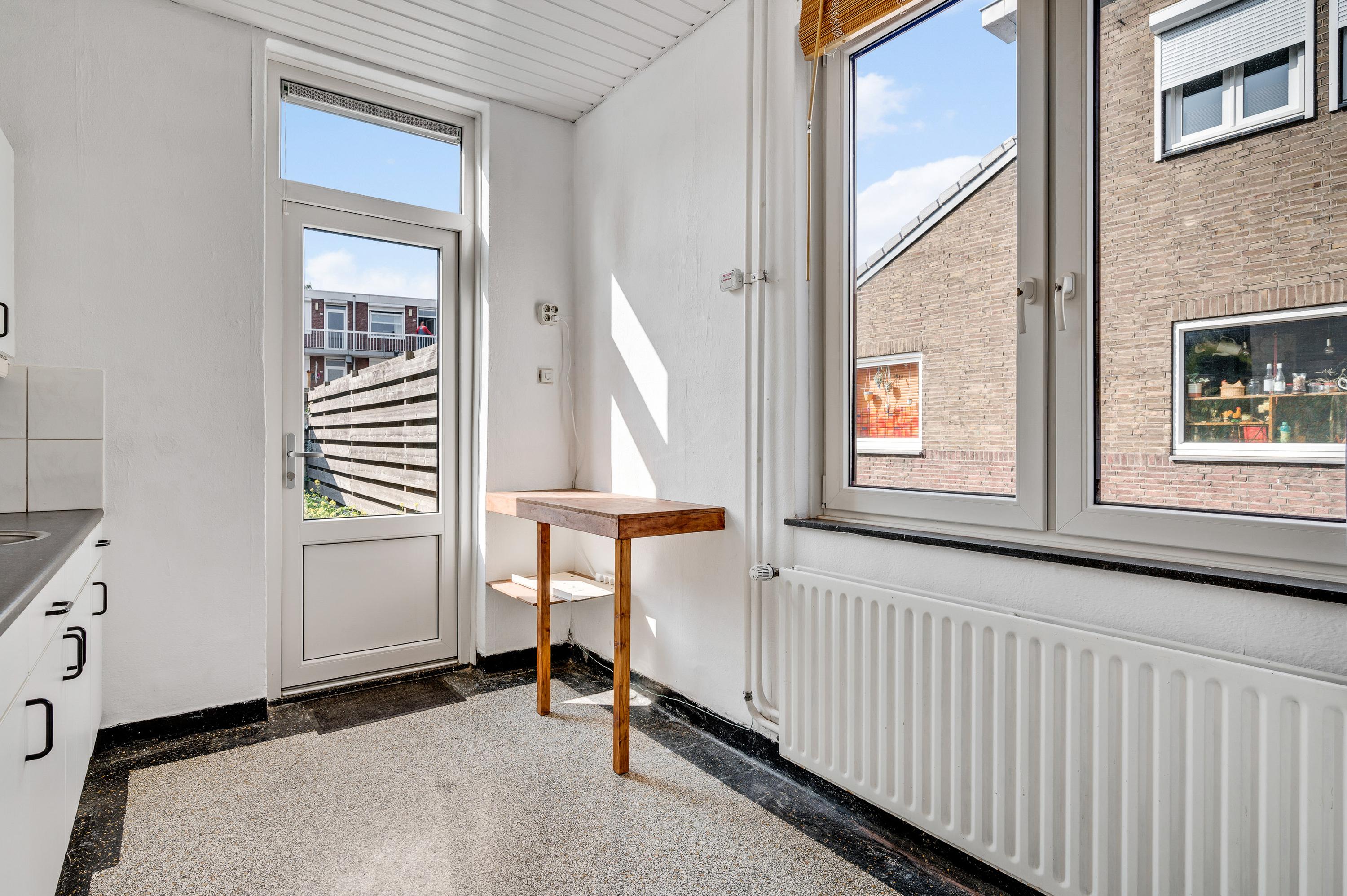 Vanuit de hal en woon-/eetkamer heeft u toegang tot de keuken (circa 4,49/3,23 x 2,47/2,03). Hier ligt de originele vloer en het hoge plafond maakt, samen met de grote ramen, de keuken heel ruimtelijk. De lichte wandopstelling heeft een ingebouwde gaskookplaat en afzuigkap. Naast de keuken is de badkamer (circa 2,30 x 0,92) met een toilet, wastafel en een douche.