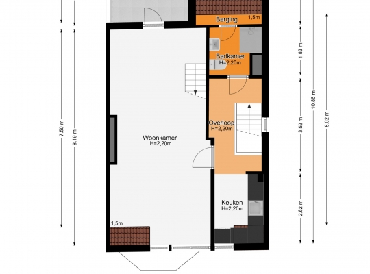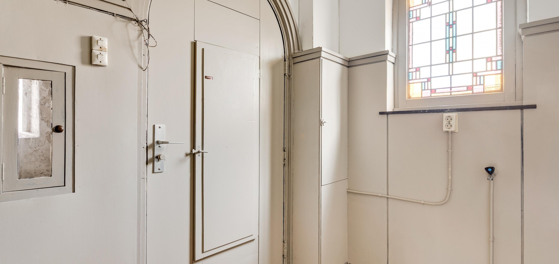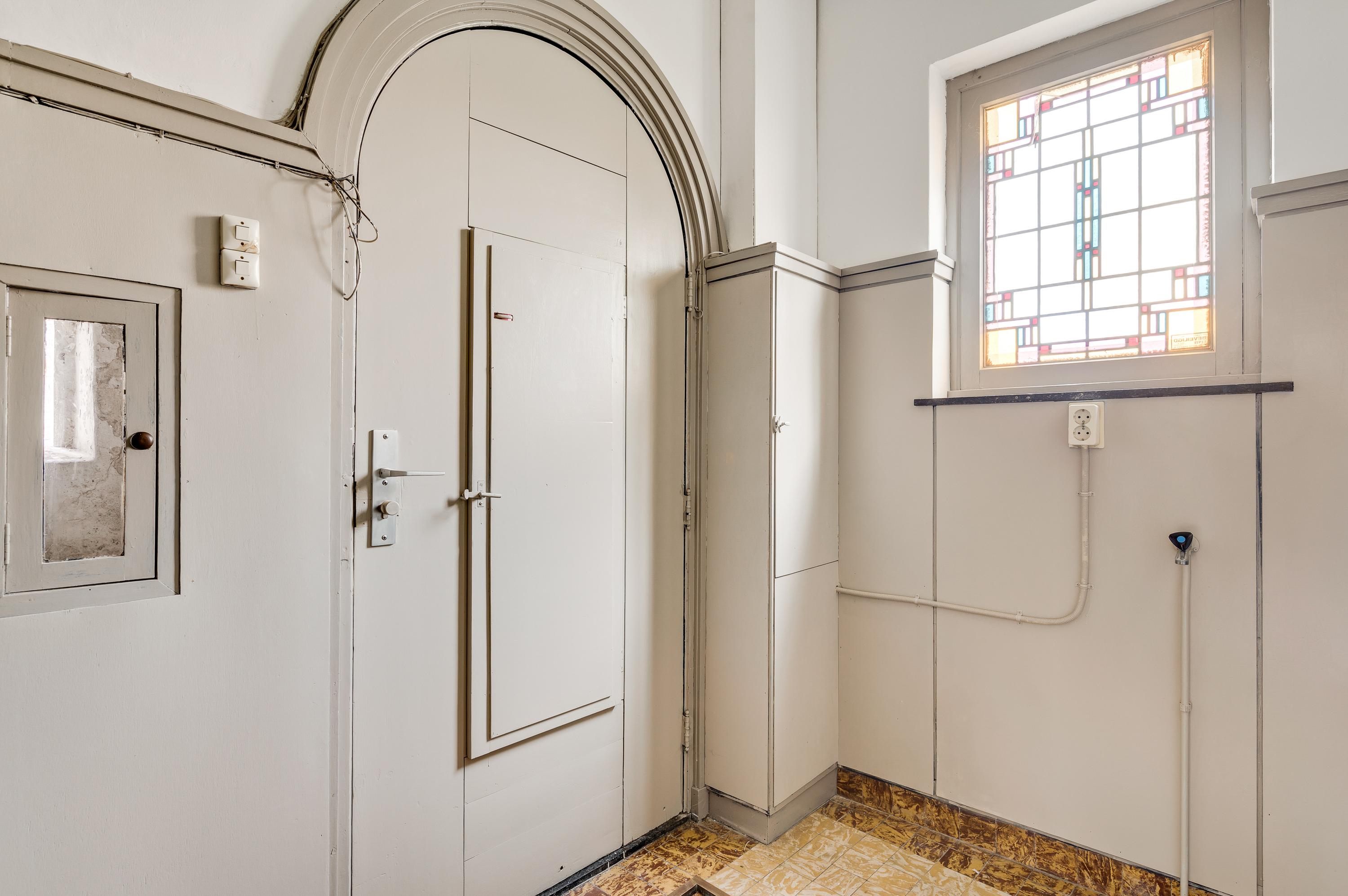 De hardhouten trap brengt u naar de eerste verdieping. Deze etage heeft, net als de begane grond en tweede verdieping, de indeling van een tweekamerappartement met een eigen keuken en badkamer. Ook op deze verdieping zijn diverse stijlelementen behouden, van paneeldeuren tot glas-in loodramen.