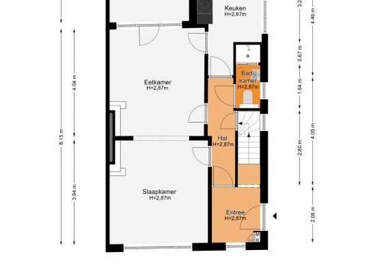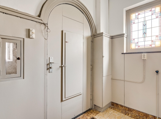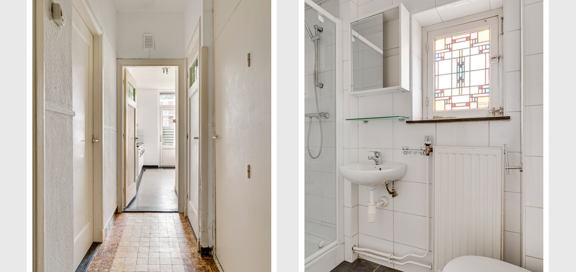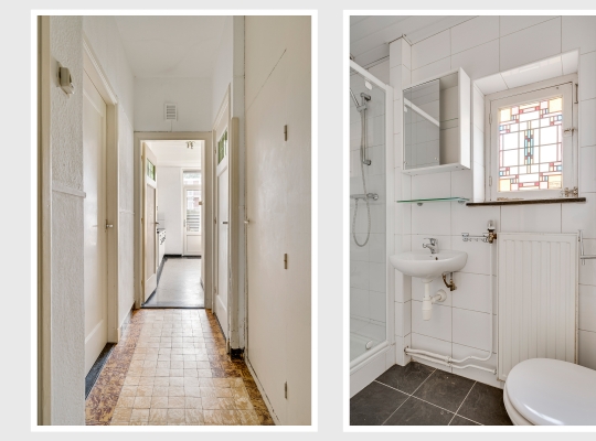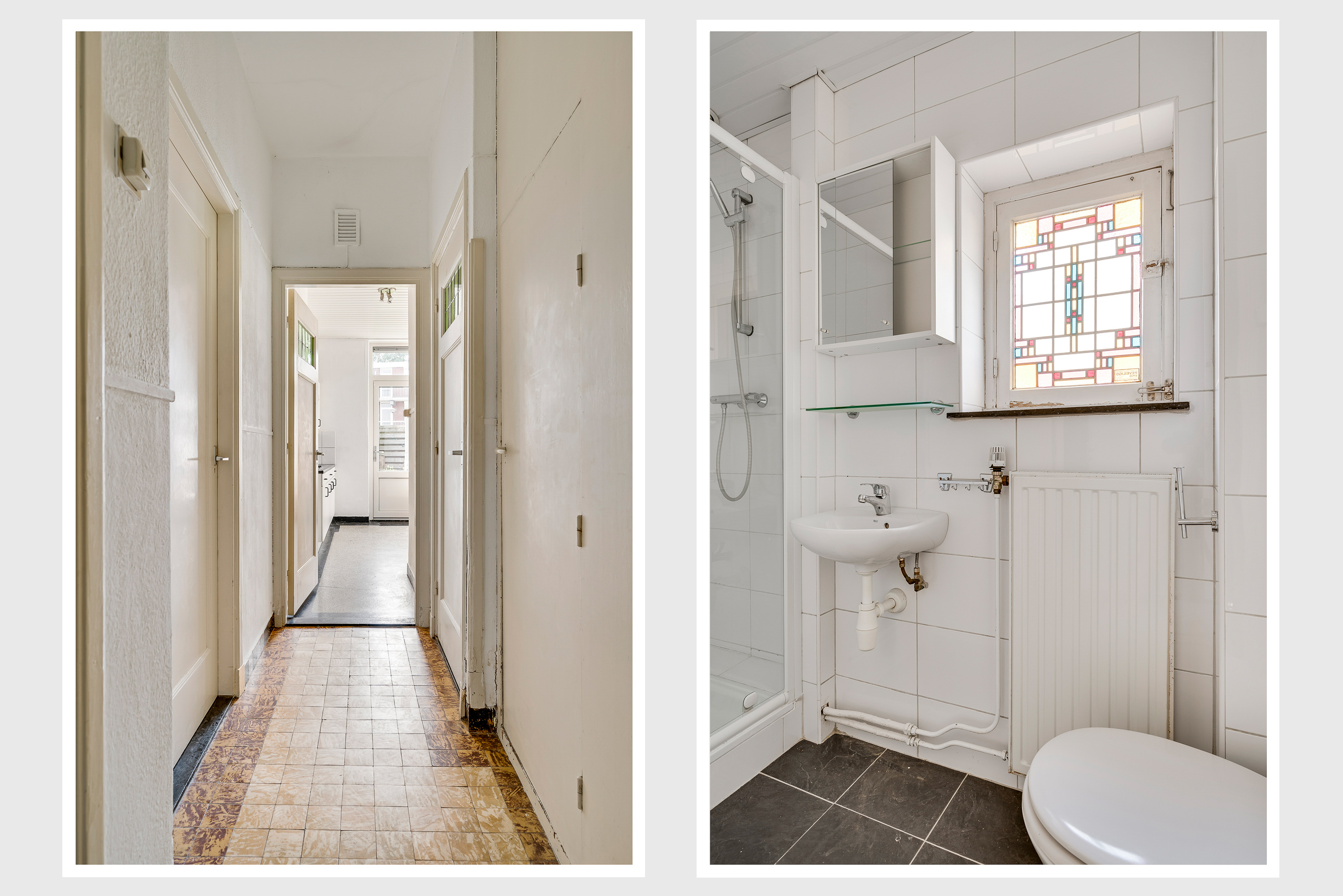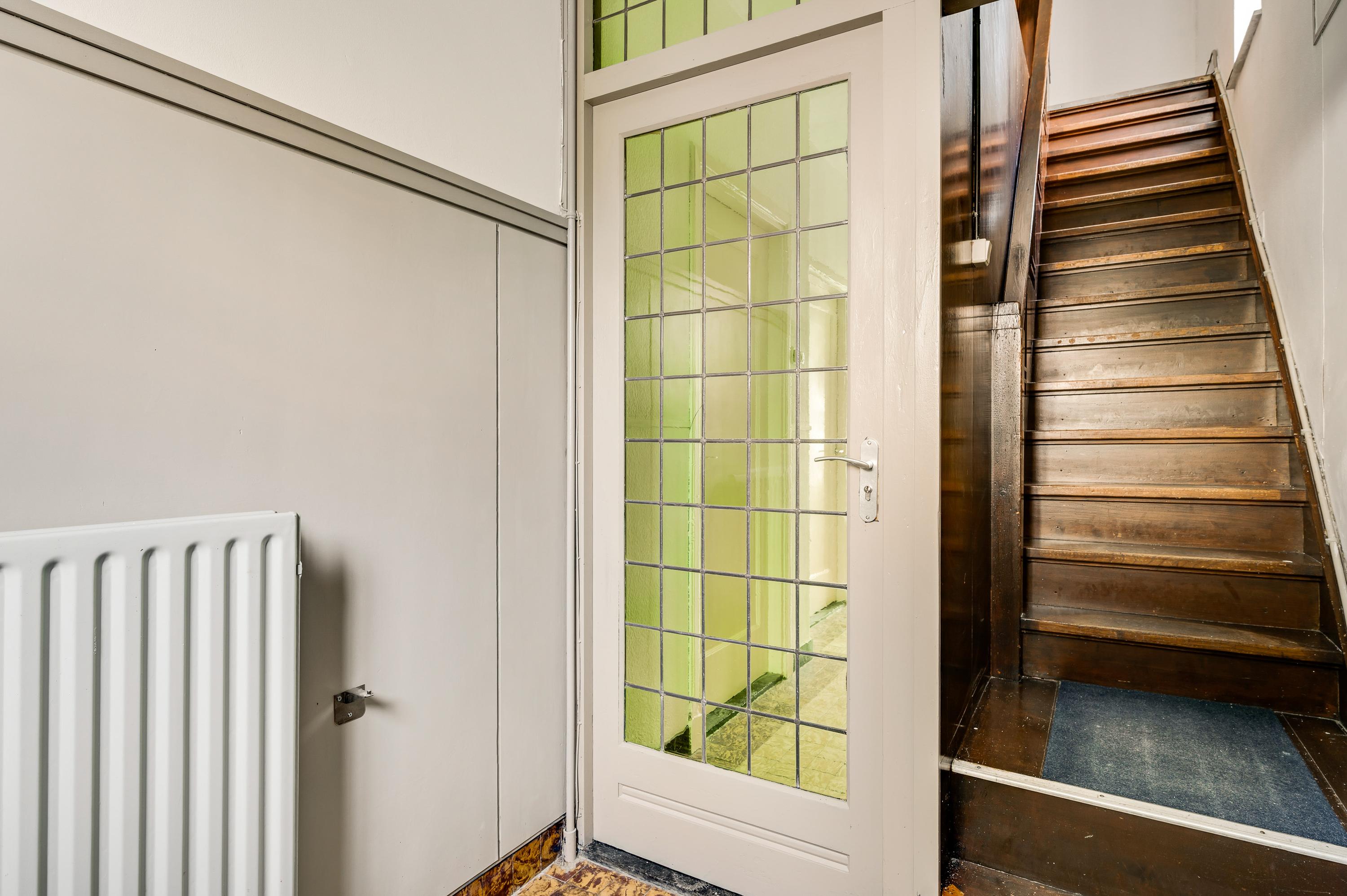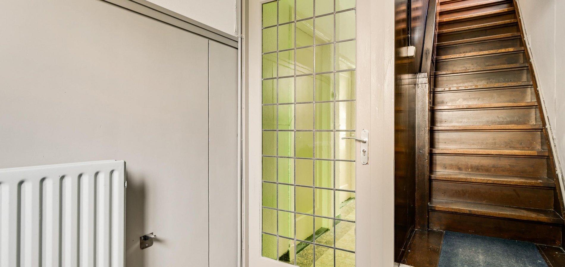 Aan de rechterzijde is de fraaie entree (circa 2,08 x 1,84) met diverse stijlelementen. Het glas-in loodraam, de voordeur, hoge lambrisering en de hardhouten trap vormen een fraai geheel. Naast de trap is een deur met een glas-in loodraam in én boven de deur. Achter deze deur is een hal (circa 4,05 x 0,89) die toegang biedt tot de woonkamer, eetkamer, keuken, badkamer en het souterrain.