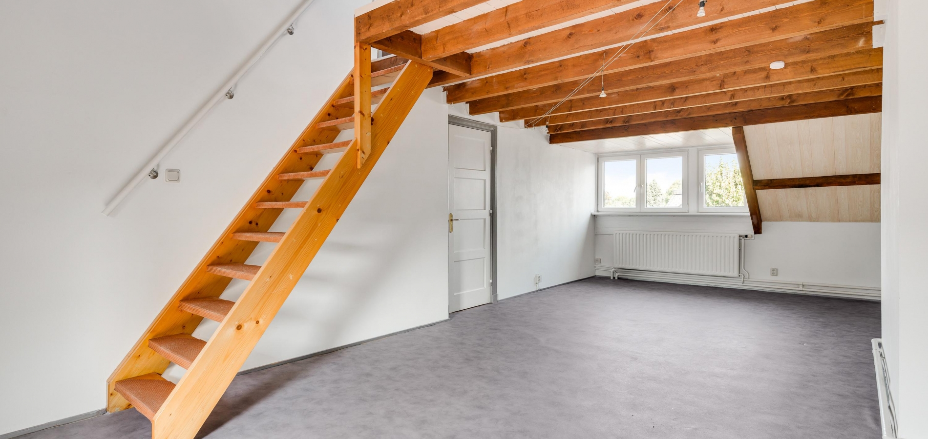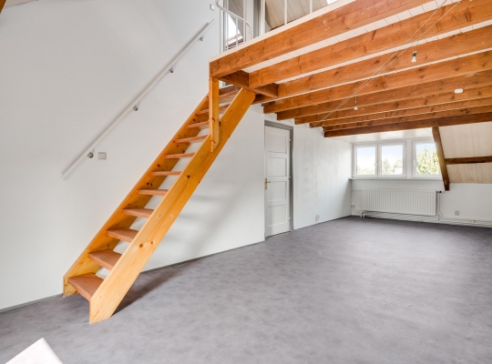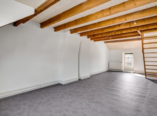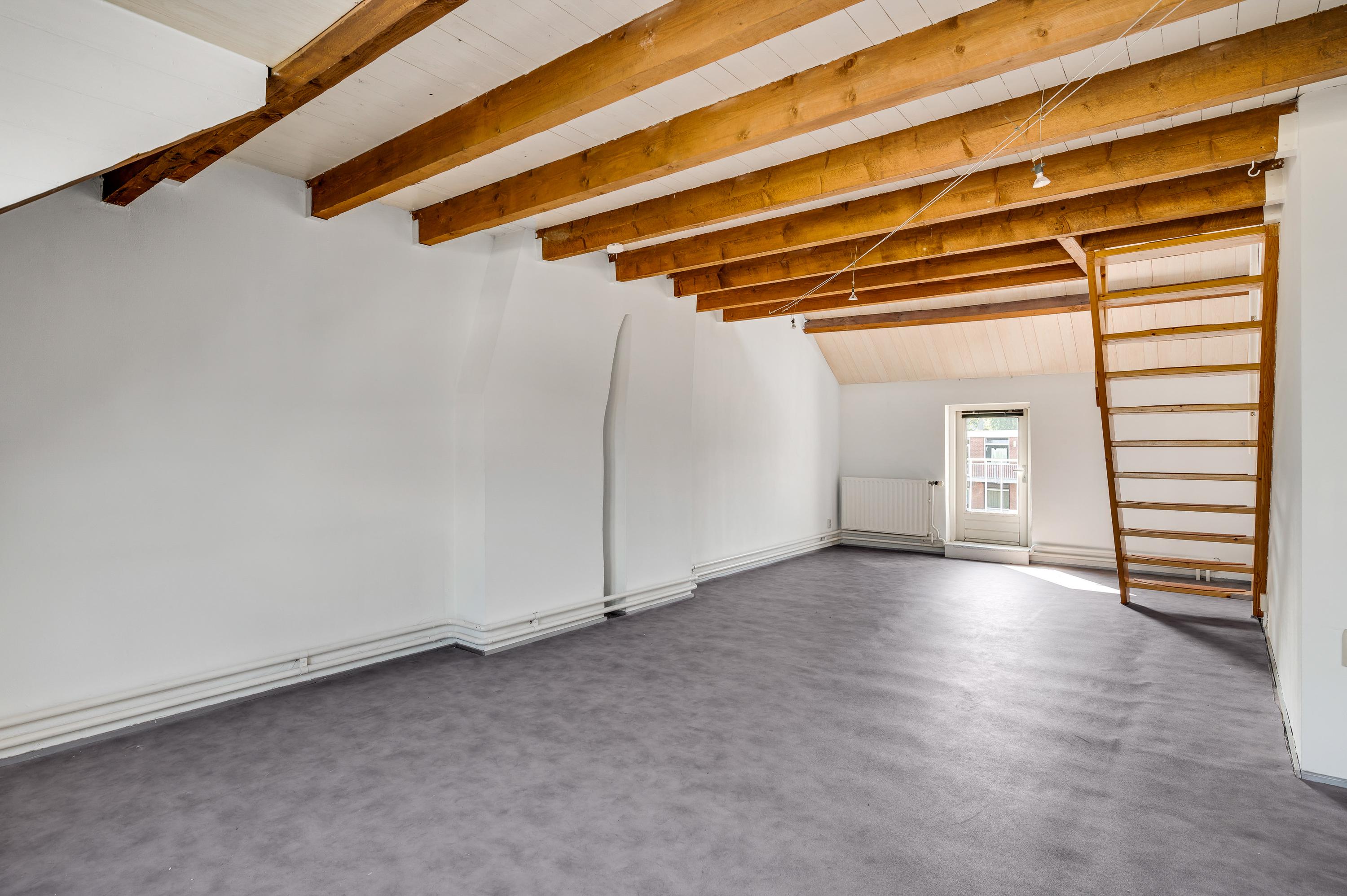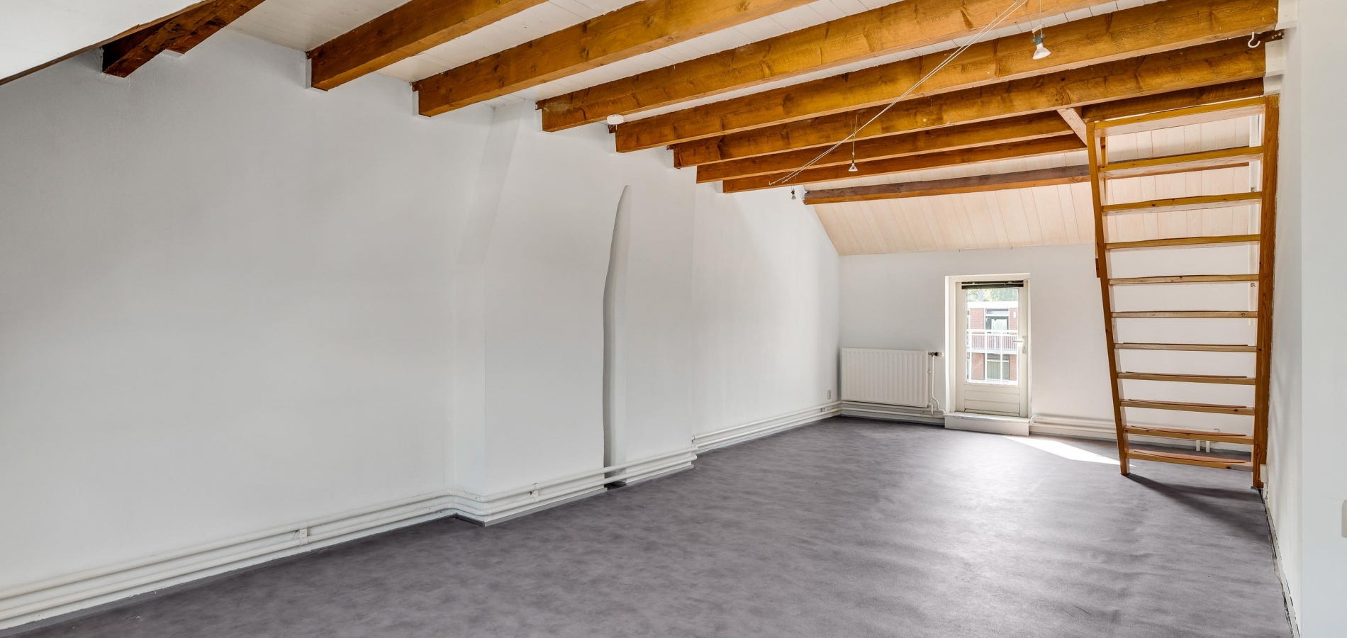 Het balkon is te bereiken vanuit de woon-/slaapkamer van circa 8,19 x 3,82/3,65 meter, met een balkenplafond en een dakkapel aan de voorzijde. In het achterste deel is een vide, met een trap naar de bovengelegen zolder.