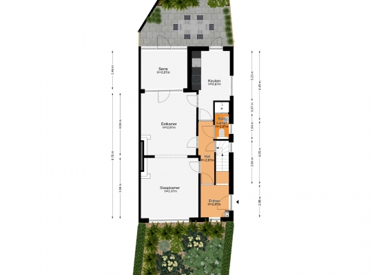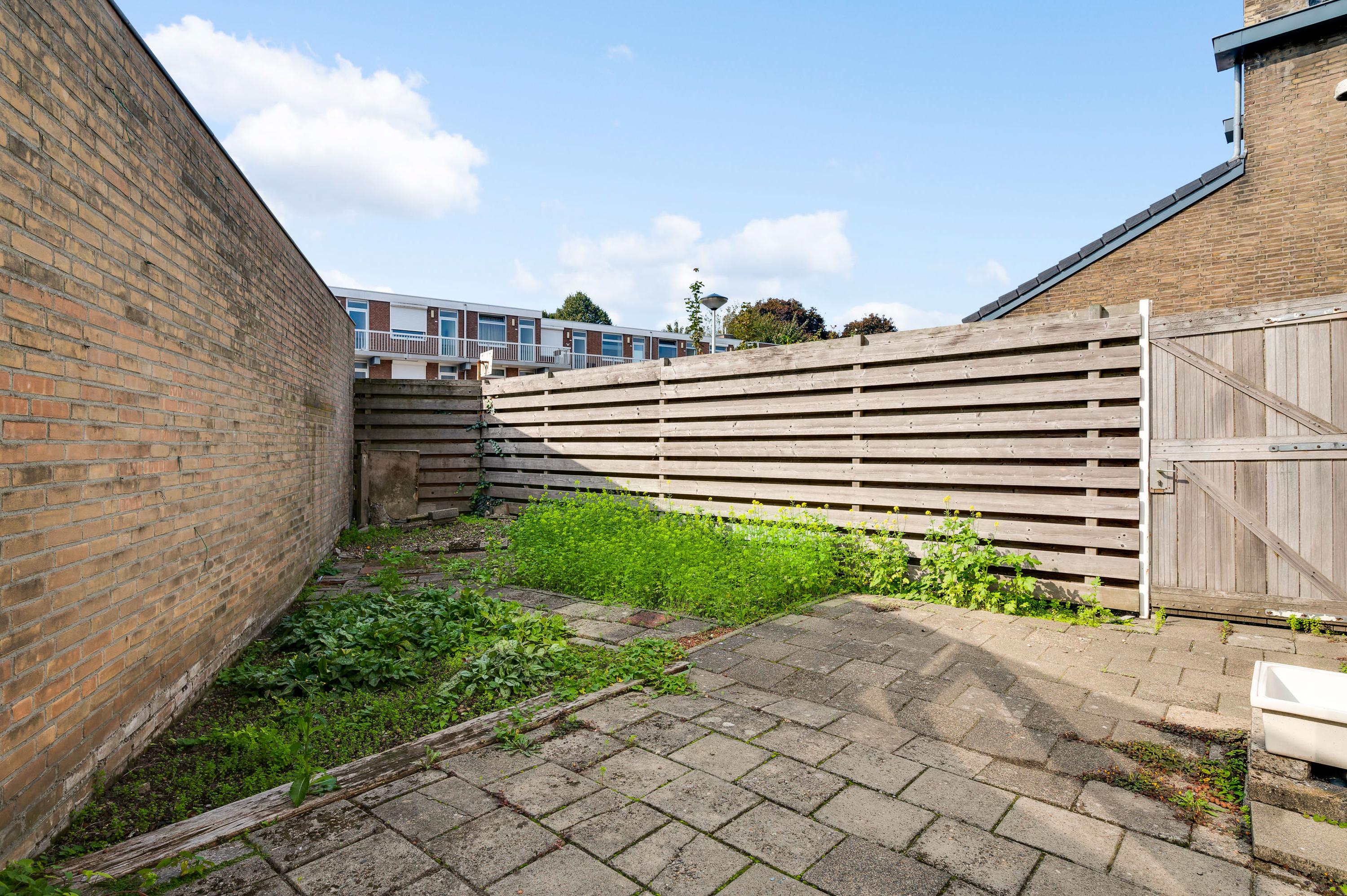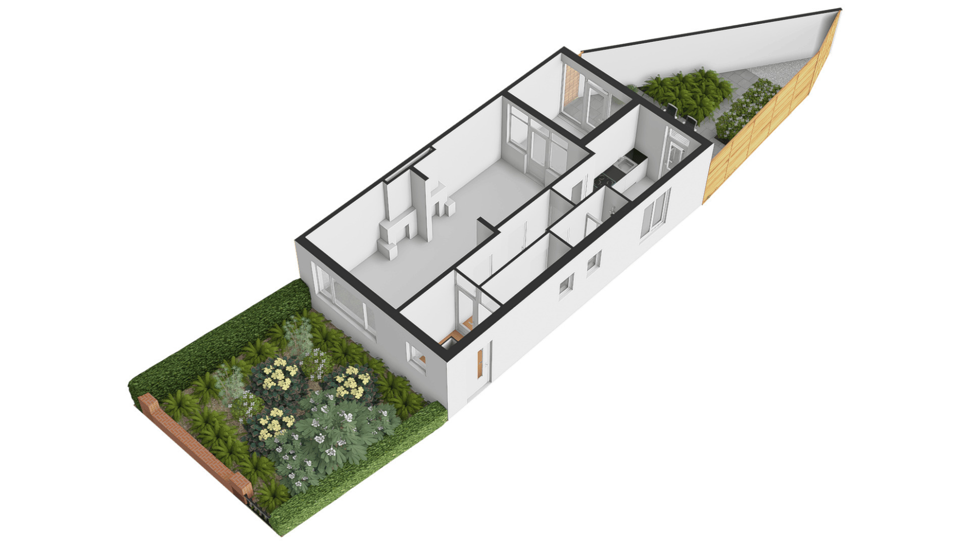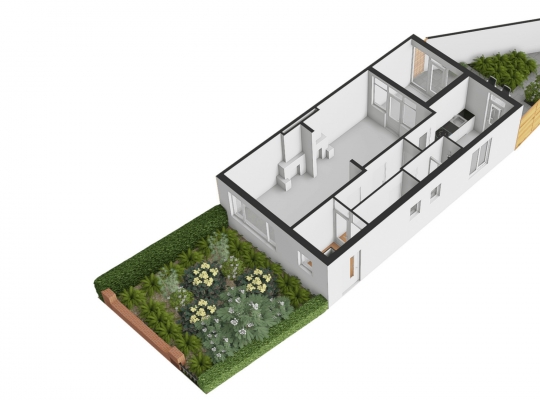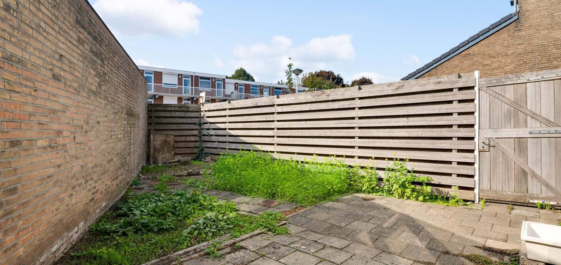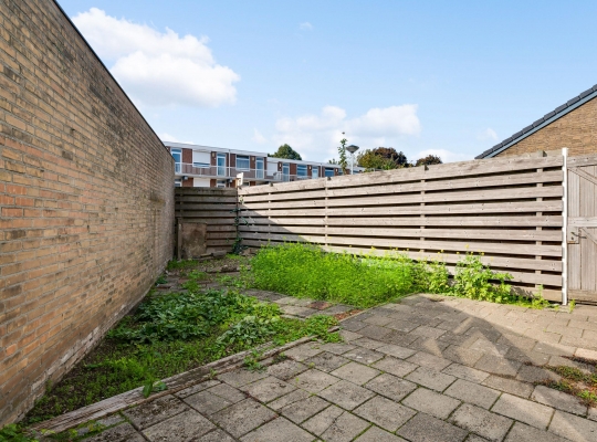 Vanuit de serre en keuken is de tuin op het zuidwesten te bereiken, die de vorm van een driehoek heeft. Er is een poort naar de openbare weg, er staat een houten schutting en er is genoeg plek om lekker buiten te zitten.
