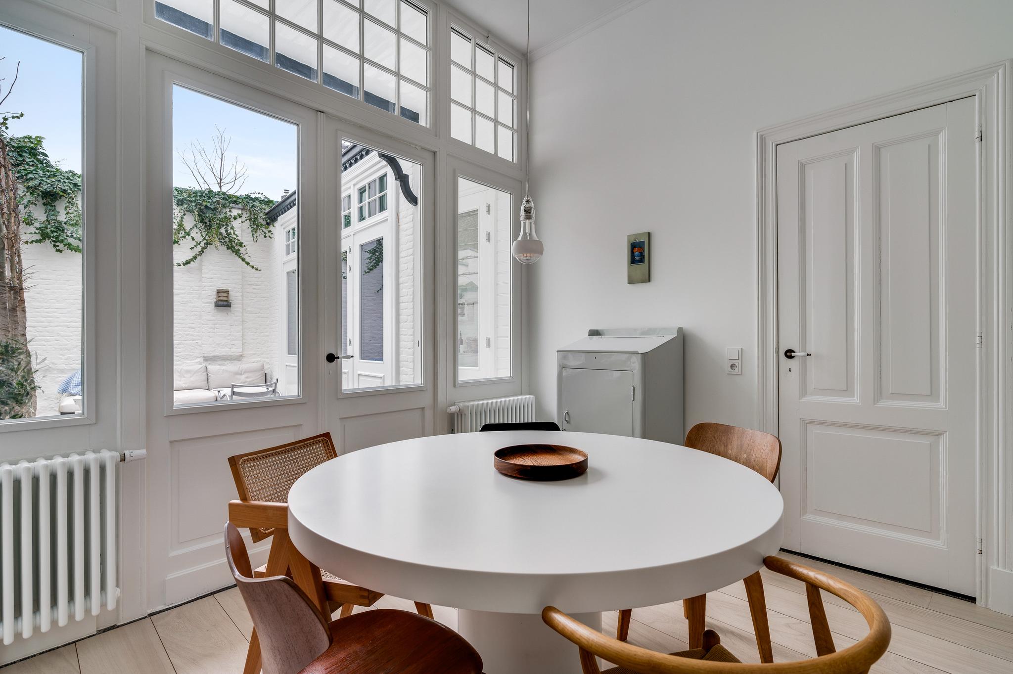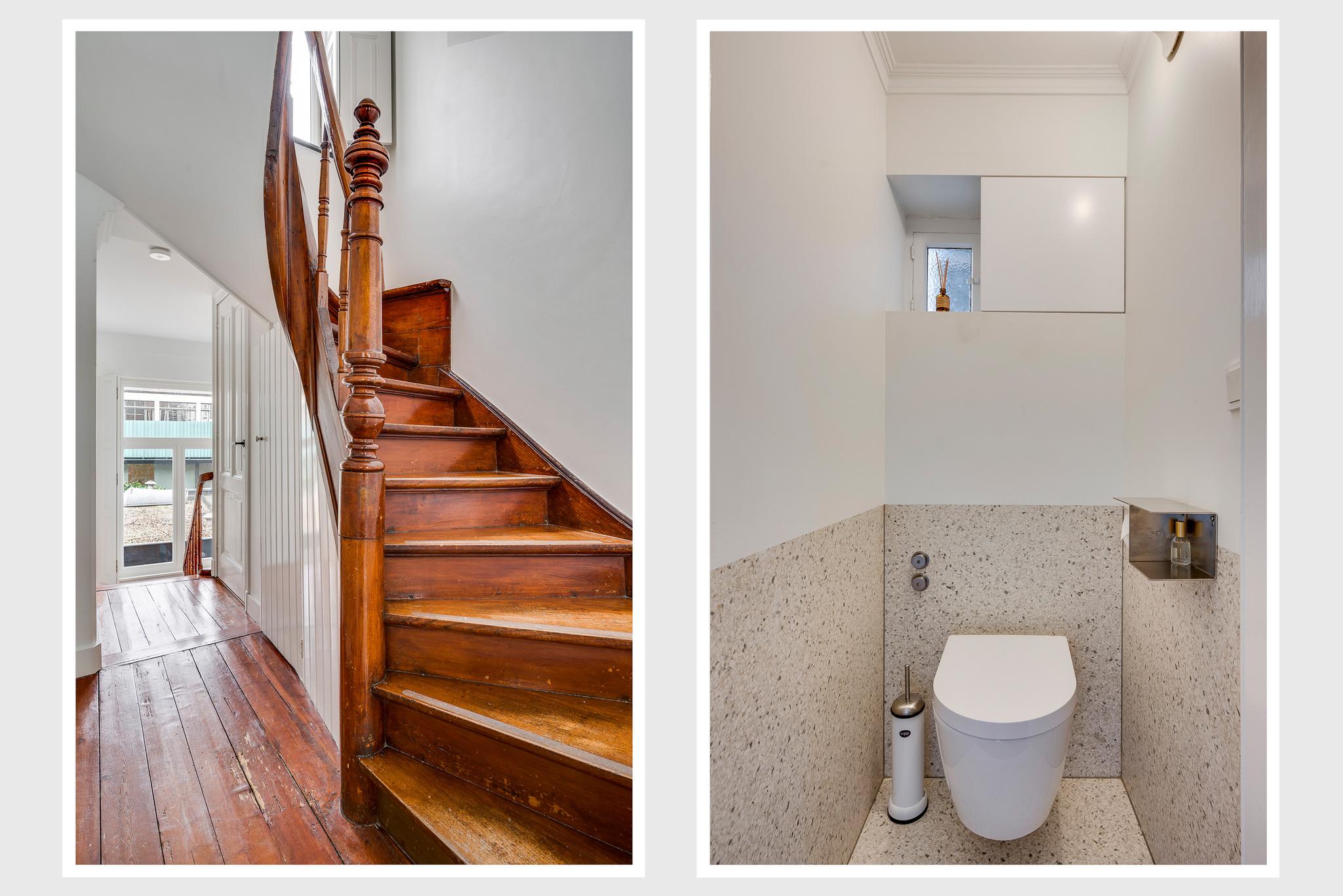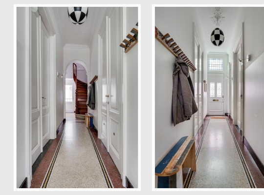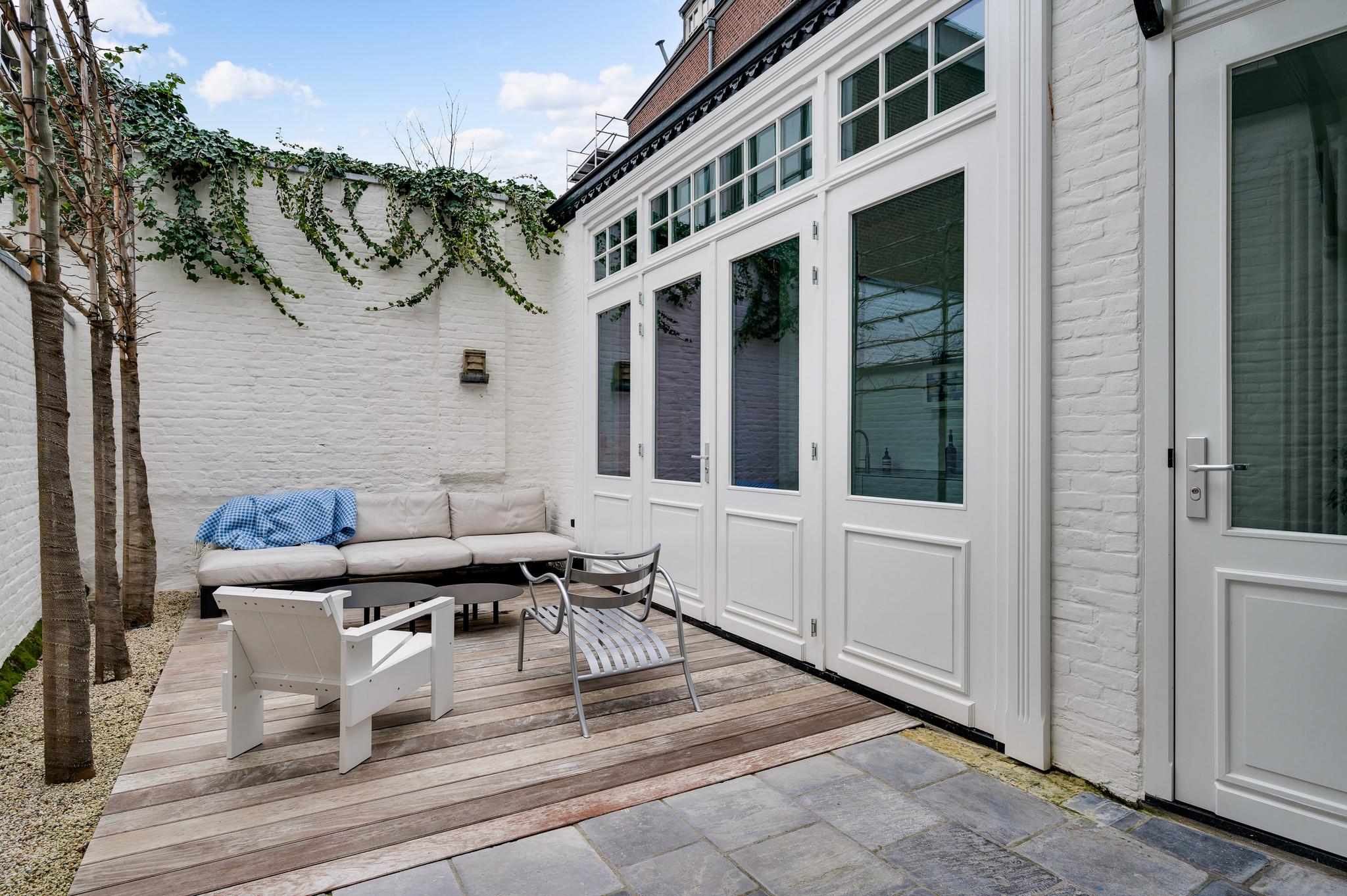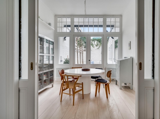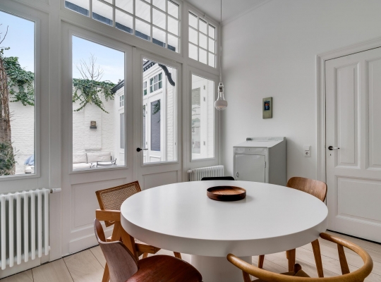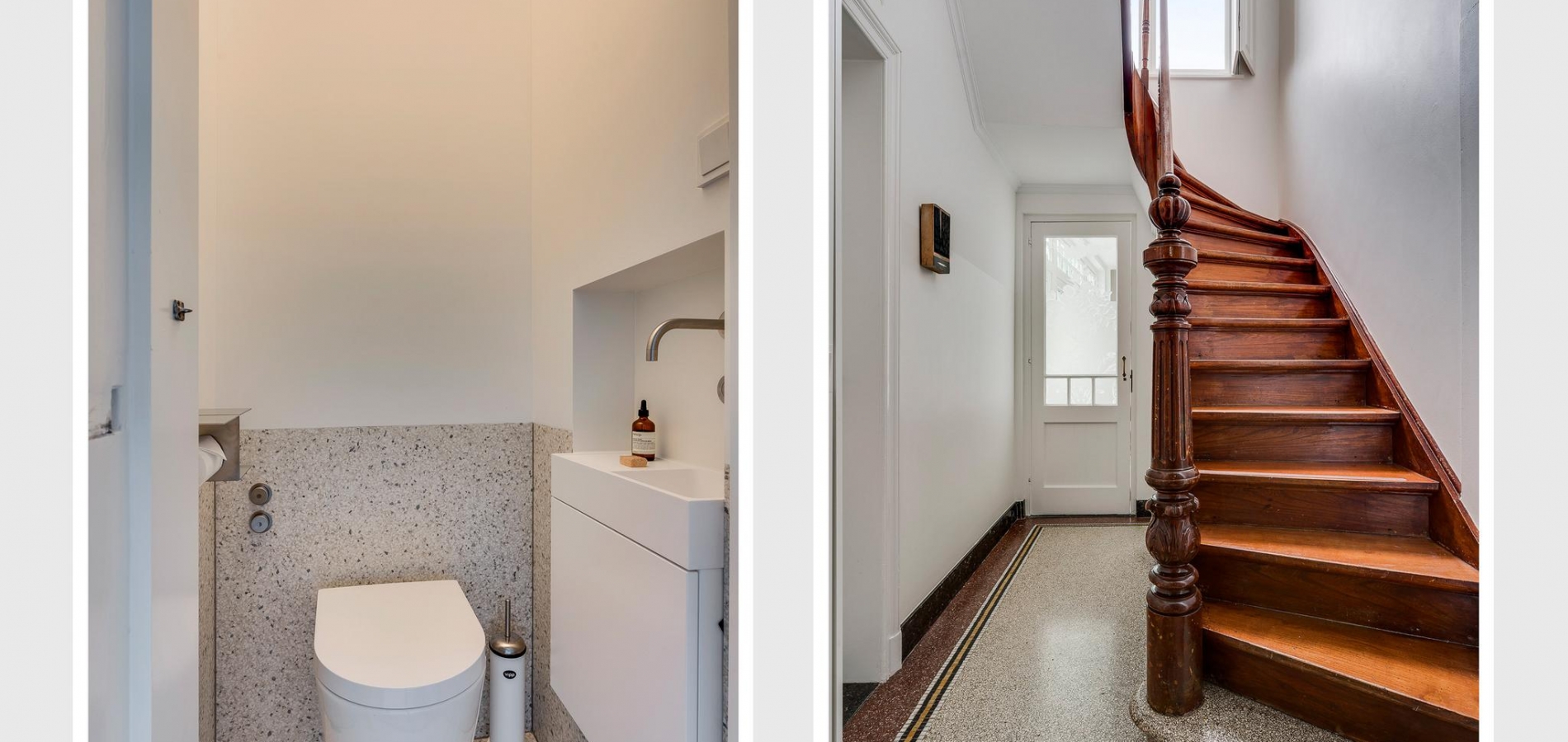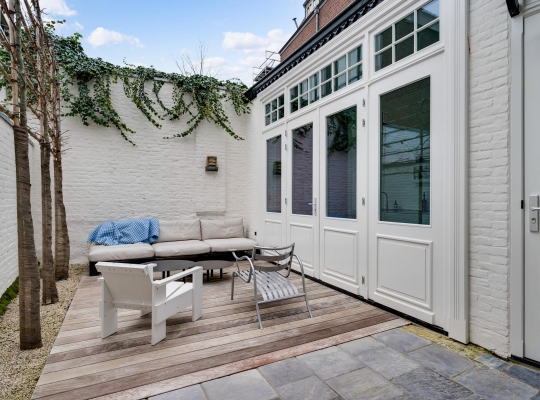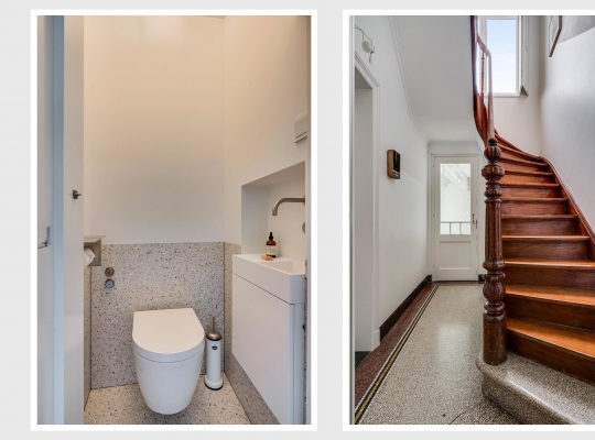 De prachtige entree is een fantastische start van uw bezoek aan dit stijlvolle herenhuis. In de hal ziet u een 3.80 meter hoog plafond, stucwerk, prachtige paneeldeuren en een granitovloer boordevol karakter. Aan het einde van de hal ziet u de houten trap naar de eerste verdieping. Hier bevindt zich de toiletruimte met design sanitair en stijlvol tegelwerk. Dubbele deuren verbinden de hal met de woonkamer (5,85 x 4,14) waar klassiek en modern zijn gecombineerd. Het hoge plafond met ornament en sierlijsten past goed bij de olmenhouten vloer, de natuurstenen schouw met haard, de klassieke raamluiken en de op maat gemaakte bank van corian en stof. Achter de schuifdeuren bevindt zich de eetkamer (3,64 x 3,03) met openslaande tuindeuren en genoeg ruimte voor een diner met vrienden en familie. Via de hal loopt u zo vanuit de eetkamer naar de keuken (5,59 x 2,08) in de aanbouw. Hier ziet u een exclusieve Bulthaup keuken met een 5-pits gaskookplaat, afzuigkap, Quooker (2023), Gaggenau combi-oven (2023), Miele vaatwasser en een Gaggenau koelvriescombinatie (2023). Vanuit de keuken en eetkamer heeft u toegang tot de stadstuin. Het houten terras is een fantastische plek om te loungen en borrelen. De hoge tuinmuur is wit geschilderd, waardoor de ruimte groot oogt. Verder ziet u leibomen, die voor extra schaduw zorgen in de zomer.