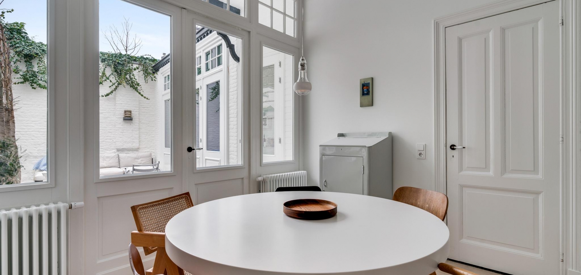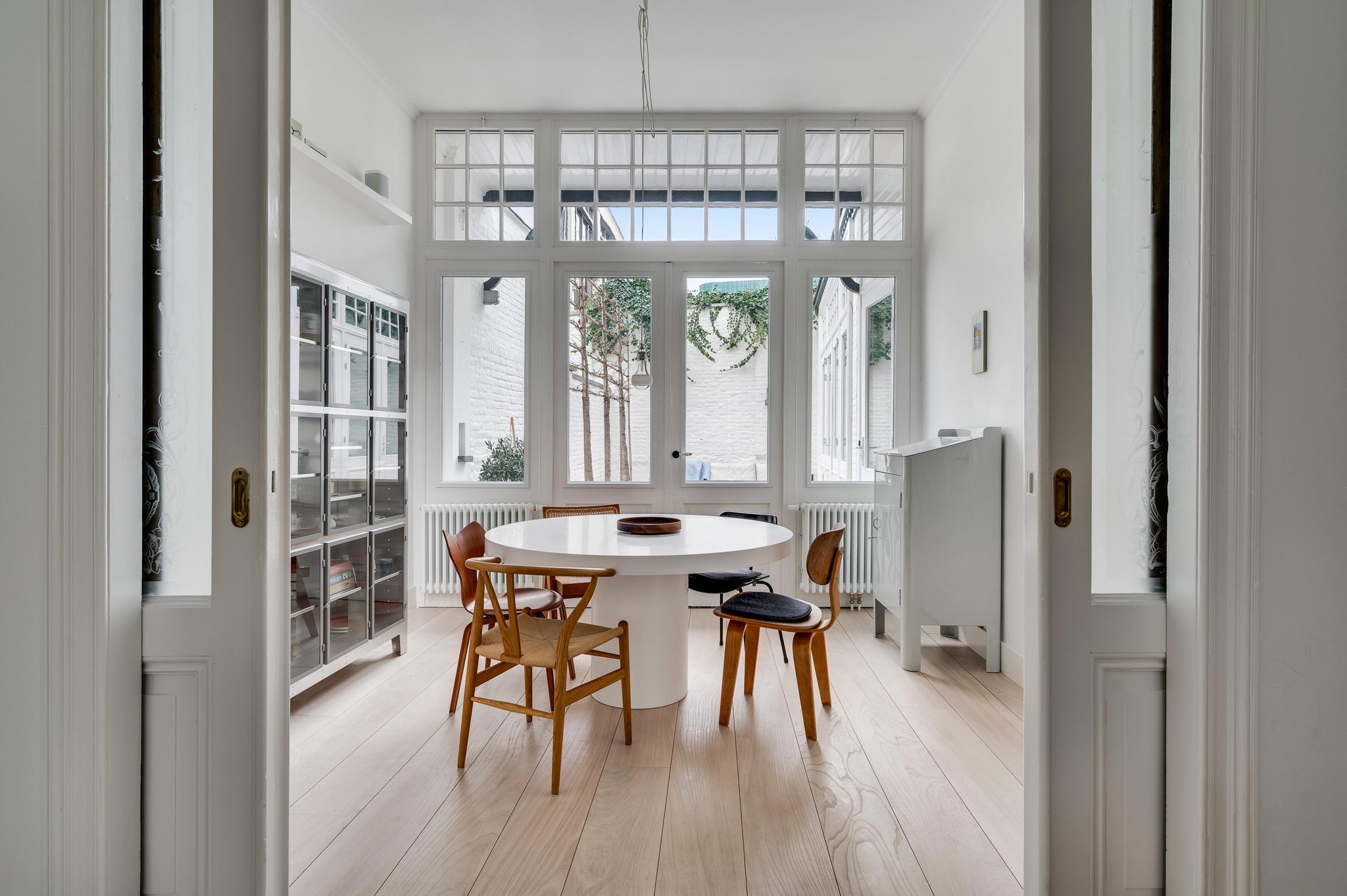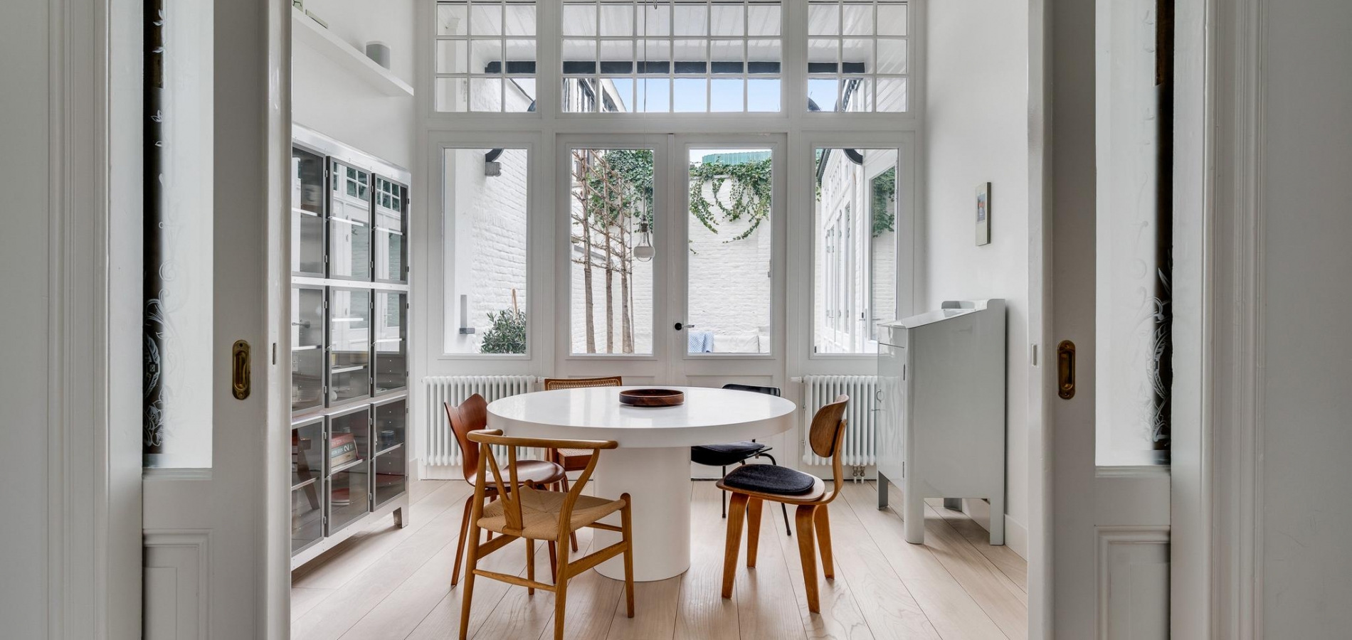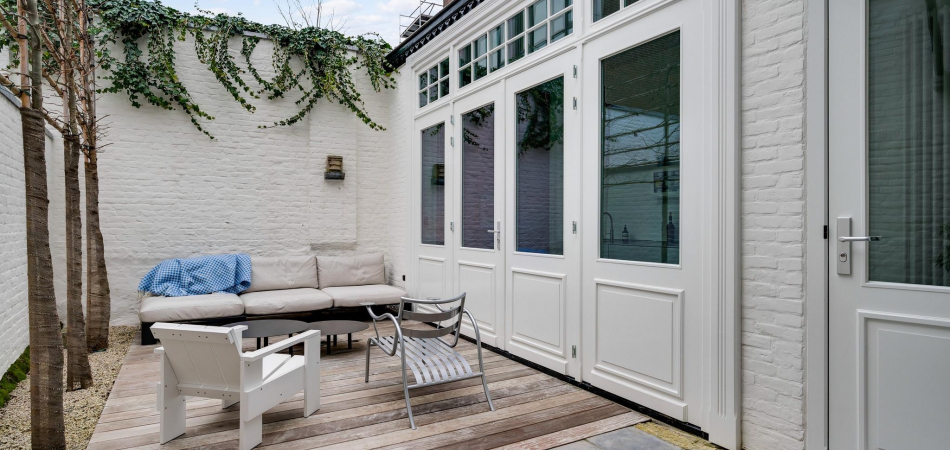 De prachtige entree is een fantastische start van uw bezoek aan dit stijlvolle herenhuis. In de hal ziet u een 3.80 meter hoog plafond, stucwerk, prachtige paneeldeuren en een granitovloer boordevol karakter. Aan het einde van de hal ziet u de houten trap naar de eerste verdieping. Hier bevindt zich de toiletruimte met design sanitair en stijlvol tegelwerk. Dubbele deuren verbinden de hal met de woonkamer (5,85 x 4,14) waar klassiek en modern zijn gecombineerd. Het hoge plafond met ornament en sierlijsten past goed bij de olmenhouten vloer, de natuurstenen schouw met haard, de klassieke raamluiken en de op maat gemaakte bank van corian en stof. Achter de schuifdeuren bevindt zich de eetkamer (3,64 x 3,03) met openslaande tuindeuren en genoeg ruimte voor een diner met vrienden en familie. Via de hal loopt u zo vanuit de eetkamer naar de keuken (5,59 x 2,08) in de aanbouw. Hier ziet u een exclusieve Bulthaup keuken met een 5-pits gaskookplaat, afzuigkap, Quooker (2023), Gaggenau combi-oven (2023), Miele vaatwasser en een Gaggenau koelvriescombinatie (2023). Vanuit de keuken en eetkamer heeft u toegang tot de stadstuin. Het houten terras is een fantastische plek om te loungen en borrelen. De hoge tuinmuur is wit geschilderd, waardoor de ruimte groot oogt. Verder ziet u leibomen, die voor extra schaduw zorgen in de zomer.
