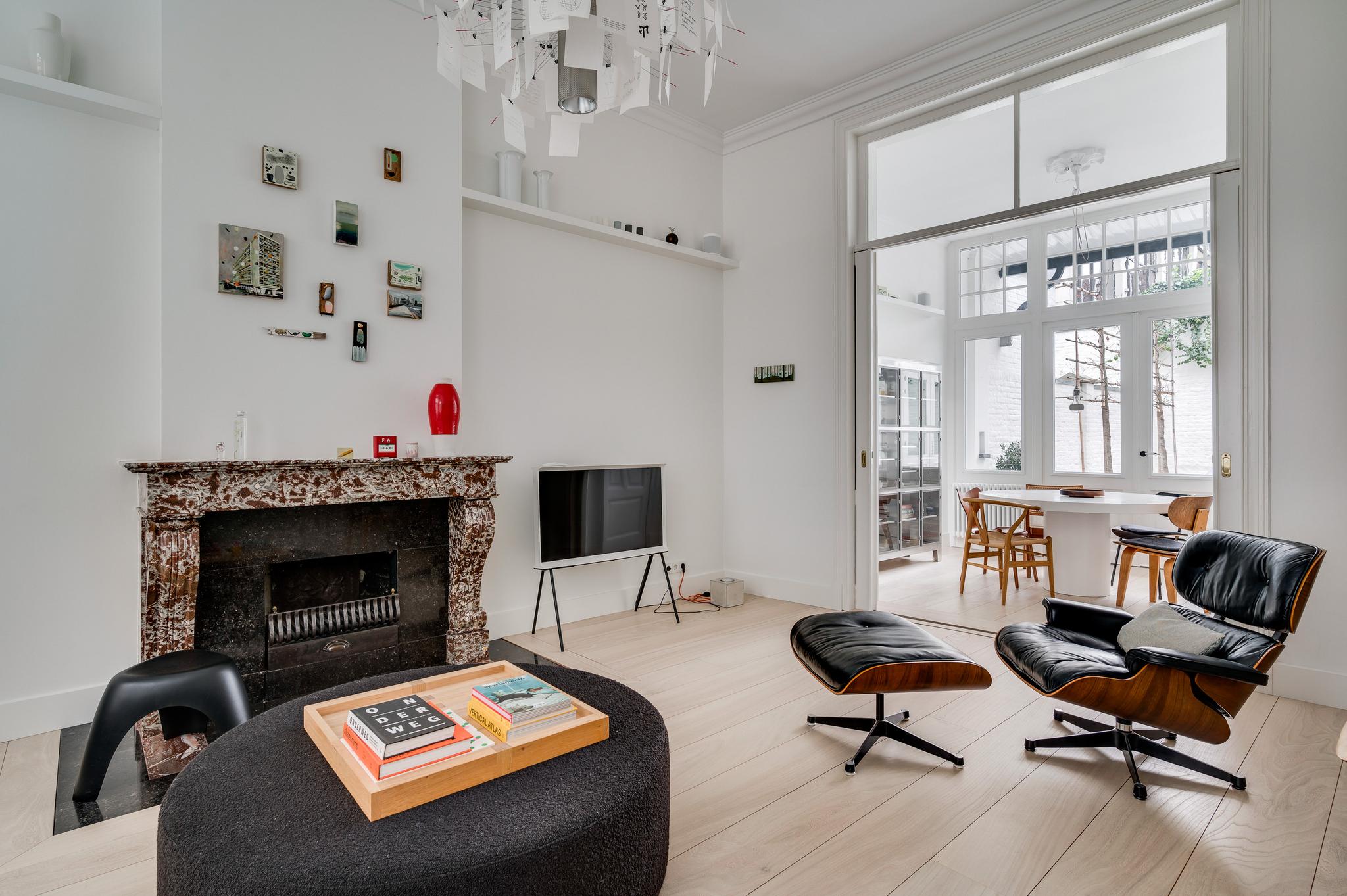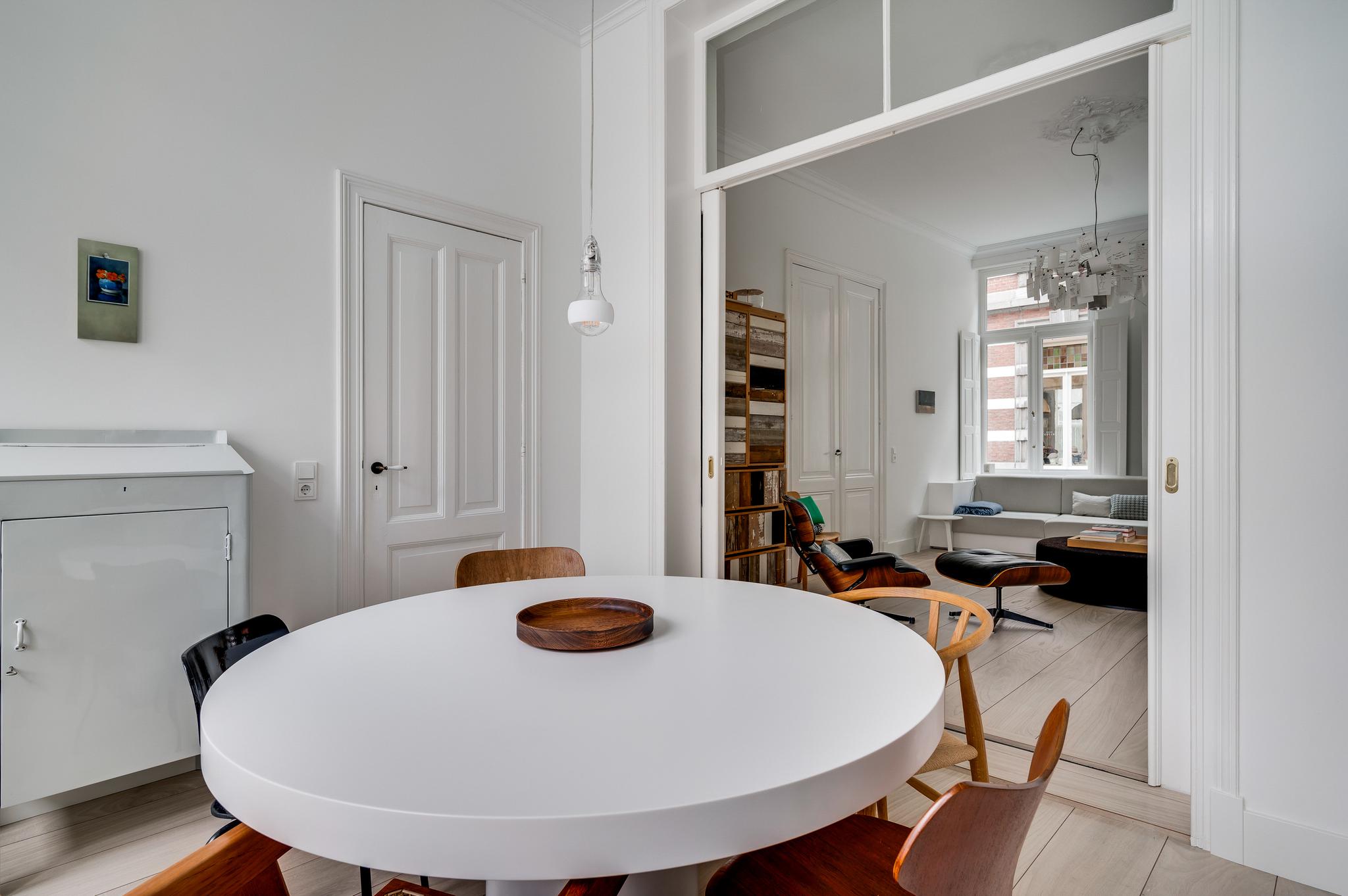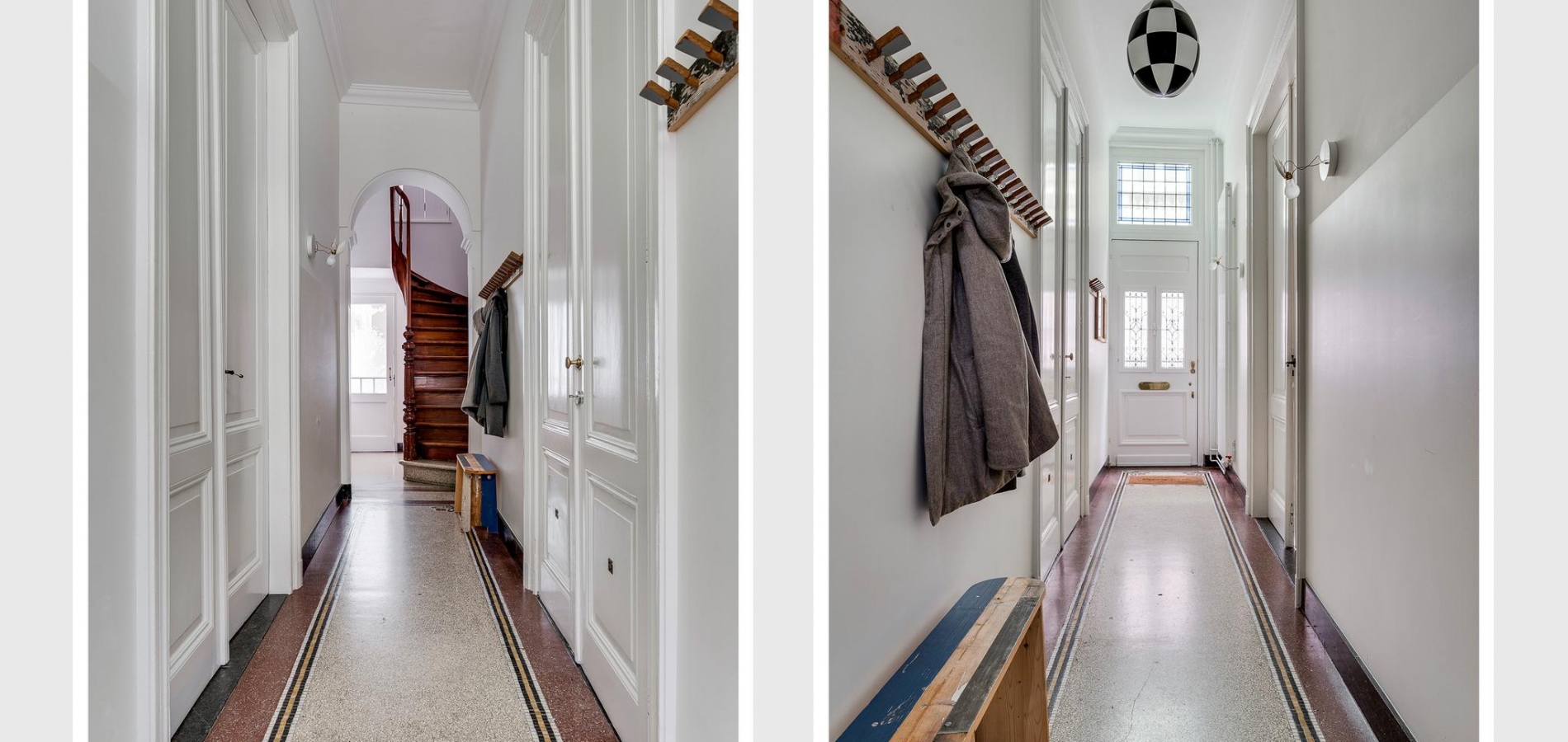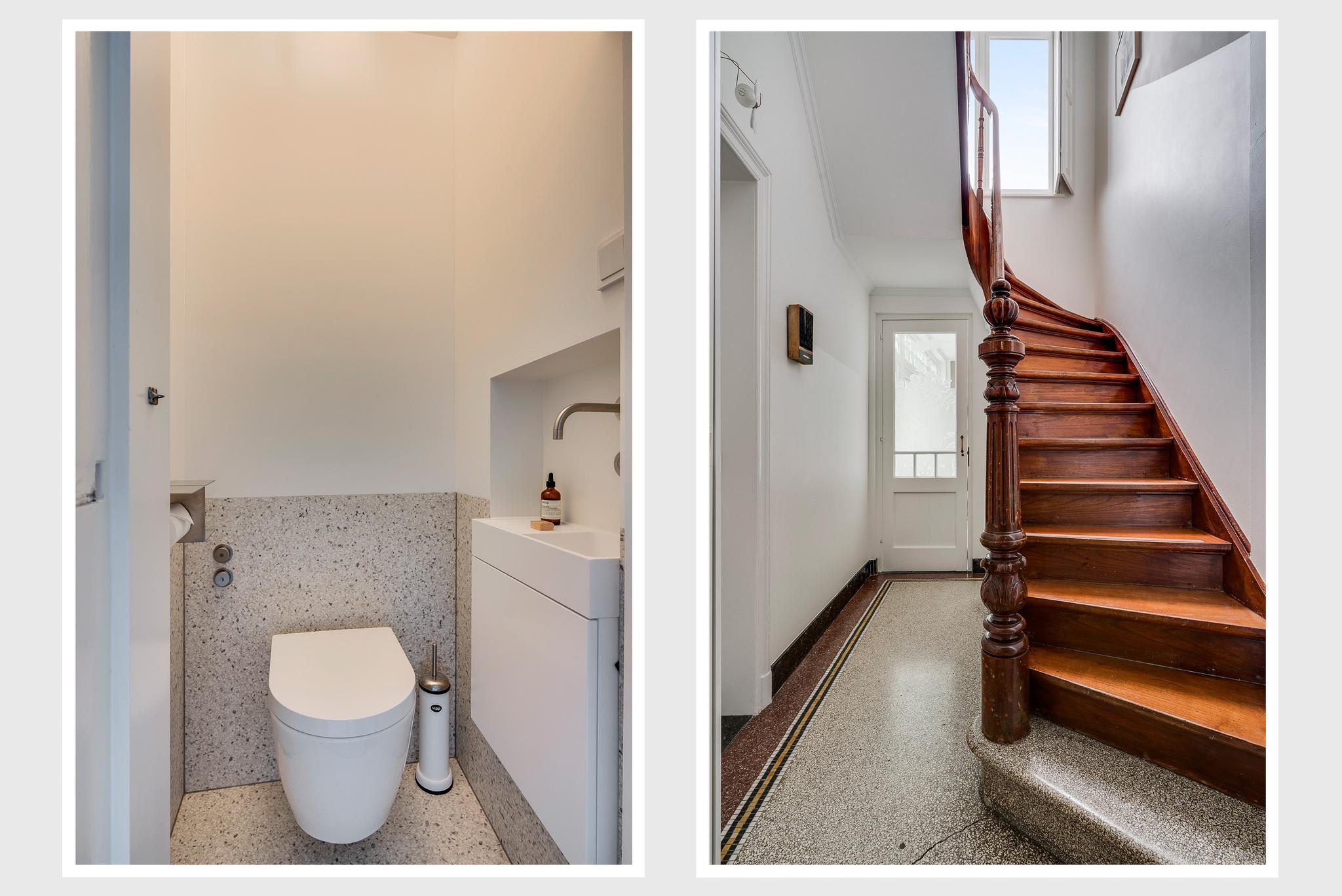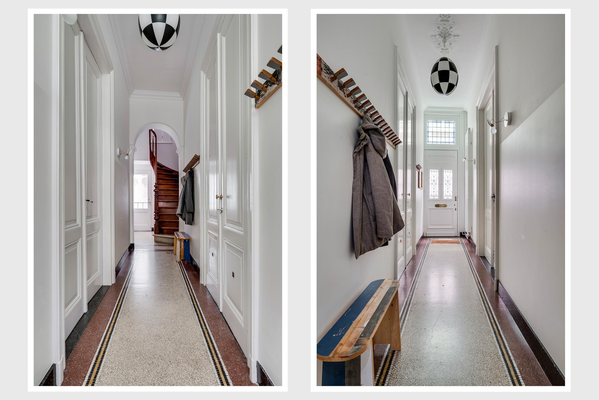 De prachtige entree is een fantastische start van uw bezoek aan dit stijlvolle herenhuis. In de hal ziet u een 3.80 meter hoog plafond, stucwerk, prachtige paneeldeuren en een granitovloer boordevol karakter. Aan het einde van de hal ziet u de houten trap naar de eerste verdieping. Hier bevindt zich de toiletruimte met design sanitair en stijlvol tegelwerk. Dubbele deuren verbinden de hal met de woonkamer (5,85 x 4,14) waar klassiek en modern zijn gecombineerd. Het hoge plafond met ornament en sierlijsten past goed bij de olmenhouten vloer, de natuurstenen schouw met haard, de klassieke raamluiken en de op maat gemaakte bank van corian en stof. Achter de schuifdeuren bevindt zich de eetkamer (3,64 x 3,03) met openslaande tuindeuren en genoeg ruimte voor een diner met vrienden en familie. Via de hal loopt u zo vanuit de eetkamer naar de keuken (5,59 x 2,08) in de aanbouw. Hier ziet u een exclusieve Bulthaup keuken met een 5-pits gaskookplaat, afzuigkap, Quooker (2023), Gaggenau combi-oven (2023), Miele vaatwasser en een Gaggenau koelvriescombinatie (2023). Vanuit de keuken en eetkamer heeft u toegang tot de stadstuin. Het houten terras is een fantastische plek om te loungen en borrelen. De hoge tuinmuur is wit geschilderd, waardoor de ruimte groot oogt. Verder ziet u leibomen, die voor extra schaduw zorgen in de zomer.