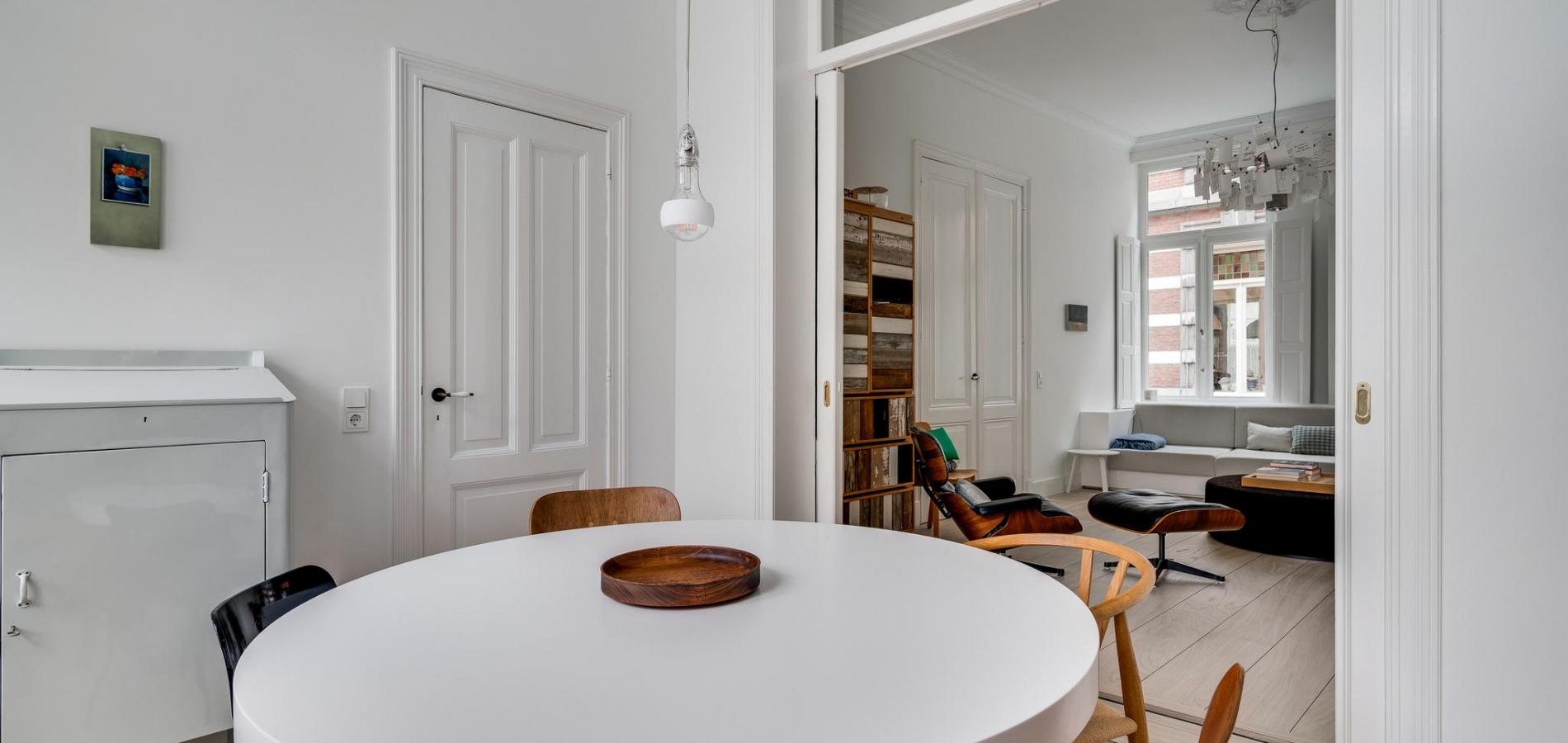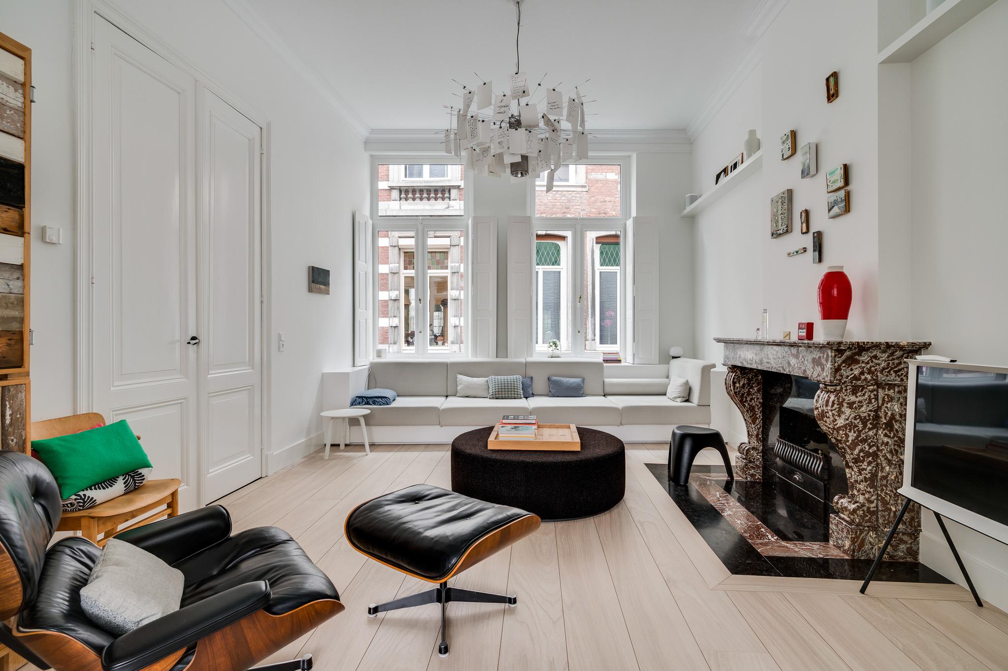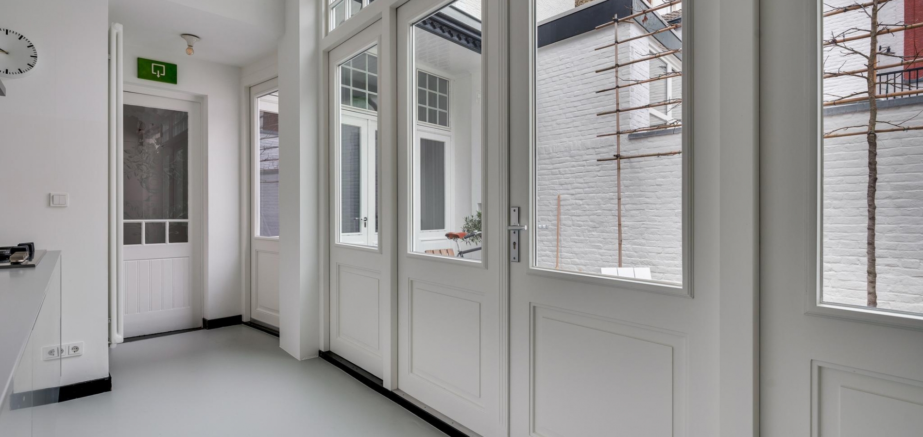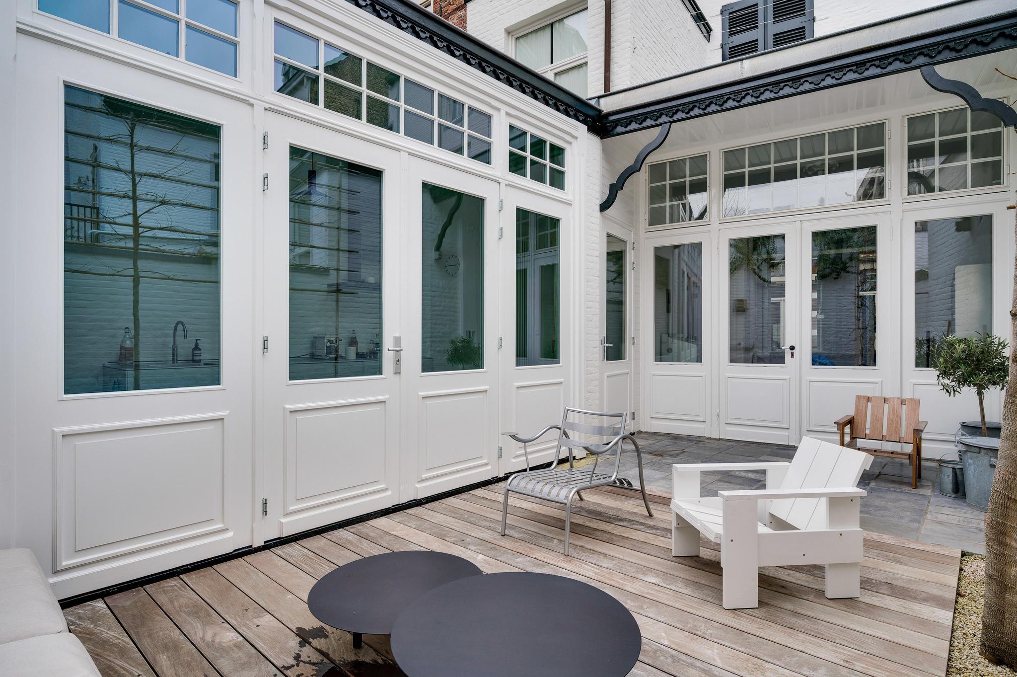 De prachtige entree is een fantastische start van uw bezoek aan dit stijlvolle herenhuis. In de hal ziet u een 3.80 meter hoog plafond, stucwerk, prachtige paneeldeuren en een granitovloer boordevol karakter. Aan het einde van de hal ziet u de houten trap naar de eerste verdieping. Hier bevindt zich de toiletruimte met design sanitair en stijlvol tegelwerk. Dubbele deuren verbinden de hal met de woonkamer (5,85 x 4,14) waar klassiek en modern zijn gecombineerd. Het hoge plafond met ornament en sierlijsten past goed bij de olmenhouten vloer, de natuurstenen schouw met haard, de klassieke raamluiken en de op maat gemaakte bank van corian en stof. Achter de schuifdeuren bevindt zich de eetkamer (3,64 x 3,03) met openslaande tuindeuren en genoeg ruimte voor een diner met vrienden en familie. Via de hal loopt u zo vanuit de eetkamer naar de keuken (5,59 x 2,08) in de aanbouw. Hier ziet u een exclusieve Bulthaup keuken met een 5-pits gaskookplaat, afzuigkap, Quooker (2023), Gaggenau combi-oven (2023), Miele vaatwasser en een Gaggenau koelvriescombinatie (2023). Vanuit de keuken en eetkamer heeft u toegang tot de stadstuin. Het houten terras is een fantastische plek om te loungen en borrelen. De hoge tuinmuur is wit geschilderd, waardoor de ruimte groot oogt. Verder ziet u leibomen, die voor extra schaduw zorgen in de zomer.
