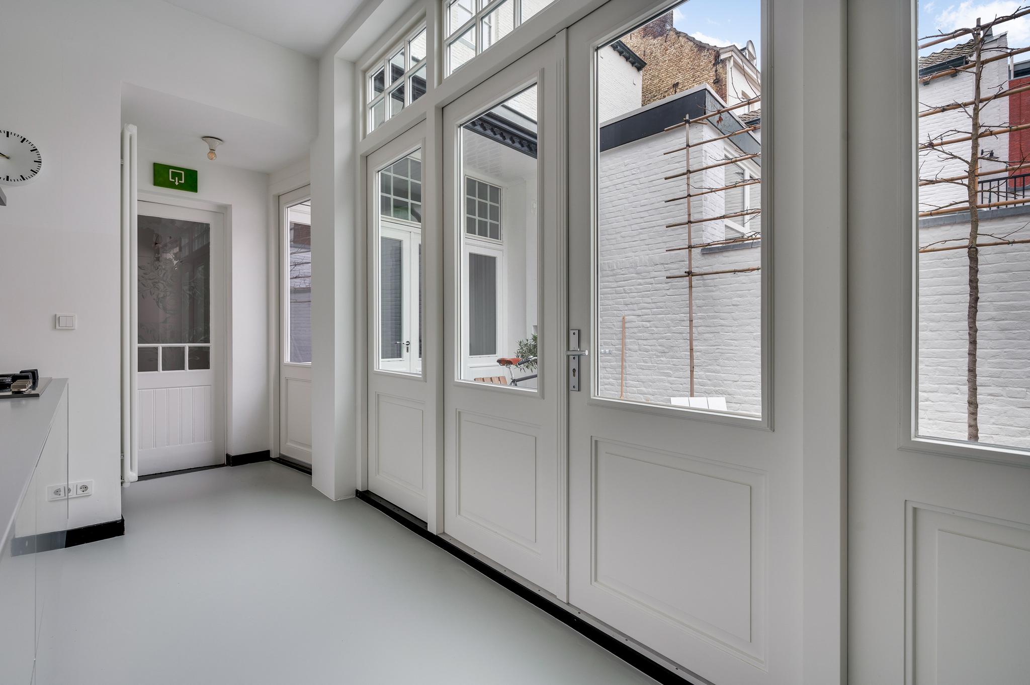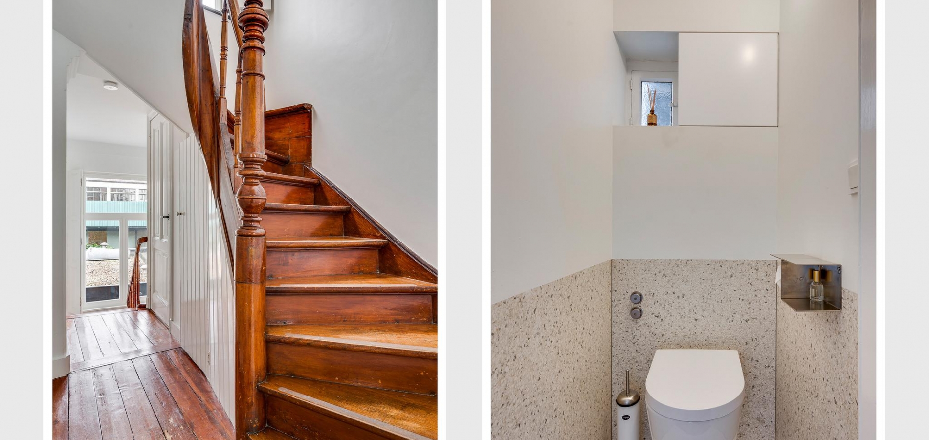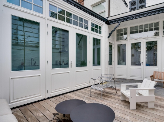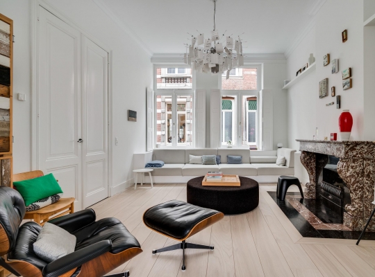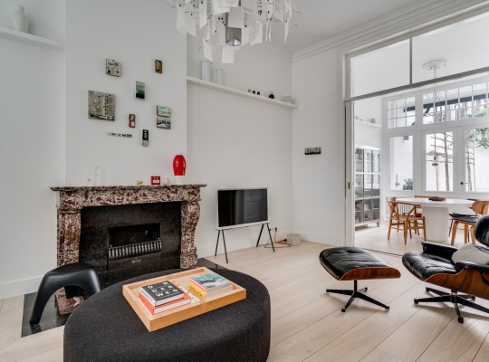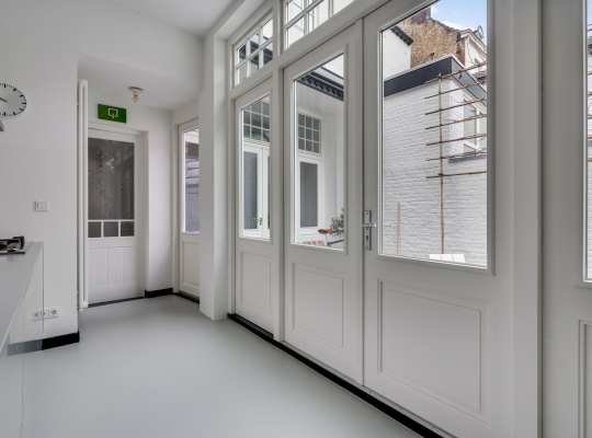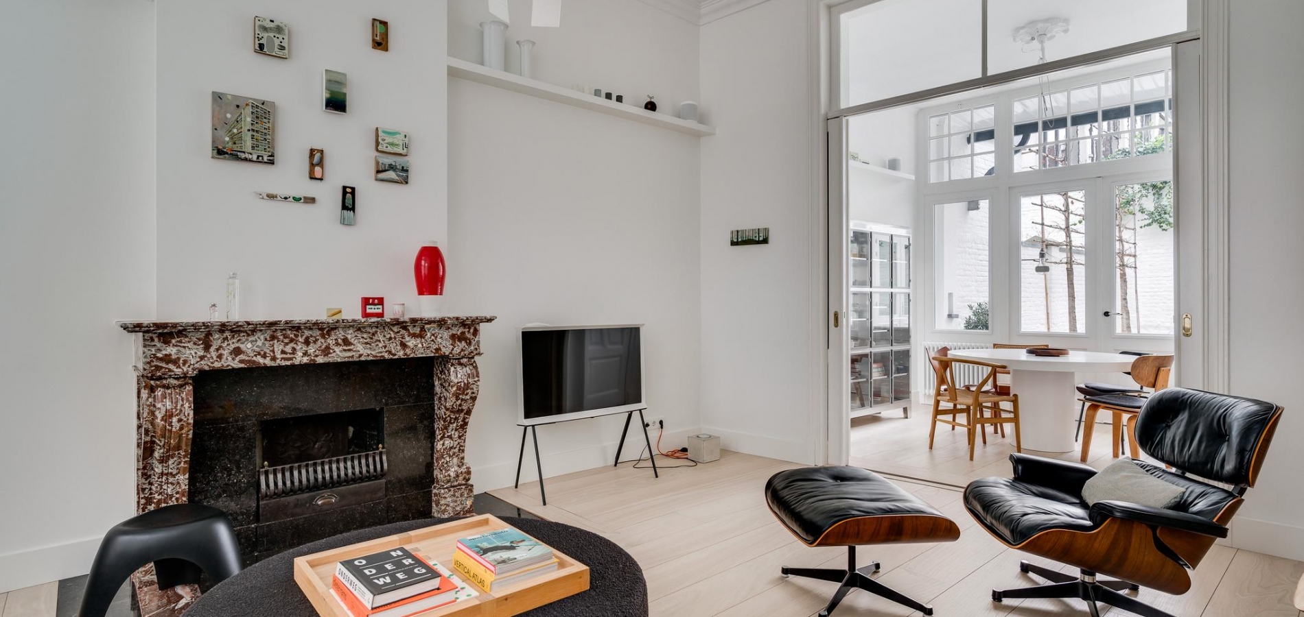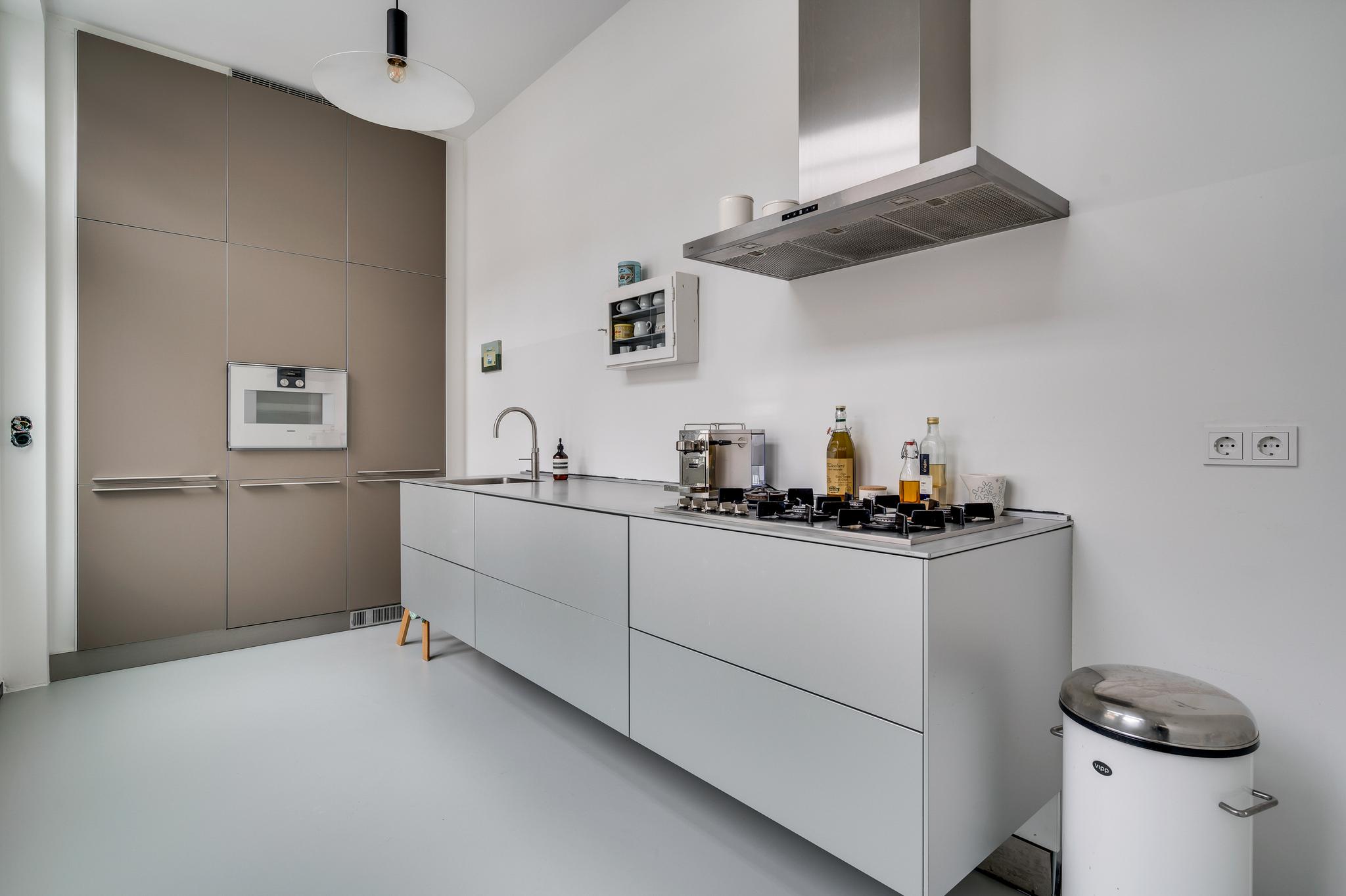 De prachtige entree is een fantastische start van uw bezoek aan dit stijlvolle herenhuis. In de hal ziet u een 3.80 meter hoog plafond, stucwerk, prachtige paneeldeuren en een granitovloer boordevol karakter. Aan het einde van de hal ziet u de houten trap naar de eerste verdieping. Hier bevindt zich de toiletruimte met design sanitair en stijlvol tegelwerk. Dubbele deuren verbinden de hal met de woonkamer (5,85 x 4,14) waar klassiek en modern zijn gecombineerd. Het hoge plafond met ornament en sierlijsten past goed bij de olmenhouten vloer, de natuurstenen schouw met haard, de klassieke raamluiken en de op maat gemaakte bank van corian en stof. Achter de schuifdeuren bevindt zich de eetkamer (3,64 x 3,03) met openslaande tuindeuren en genoeg ruimte voor een diner met vrienden en familie. Via de hal loopt u zo vanuit de eetkamer naar de keuken (5,59 x 2,08) in de aanbouw. Hier ziet u een exclusieve Bulthaup keuken met een 5-pits gaskookplaat, afzuigkap, Quooker (2023), Gaggenau combi-oven (2023), Miele vaatwasser en een Gaggenau koelvriescombinatie (2023). Vanuit de keuken en eetkamer heeft u toegang tot de stadstuin. Het houten terras is een fantastische plek om te loungen en borrelen. De hoge tuinmuur is wit geschilderd, waardoor de ruimte groot oogt. Verder ziet u leibomen, die voor extra schaduw zorgen in de zomer.