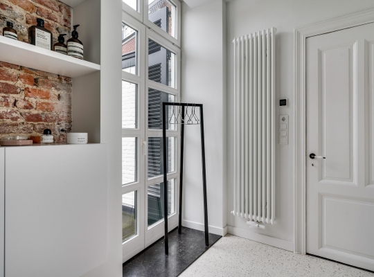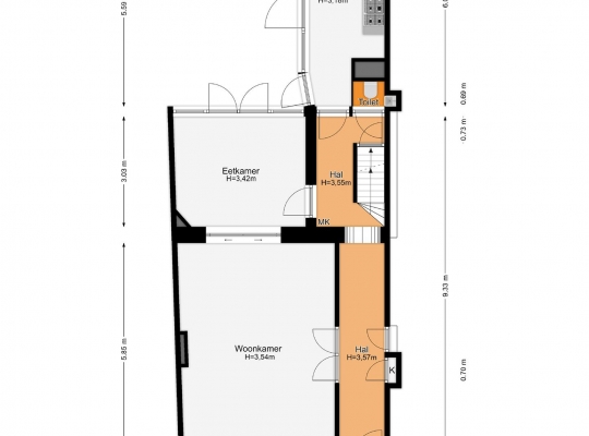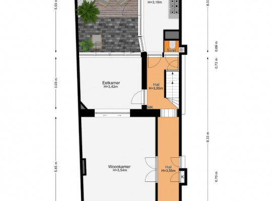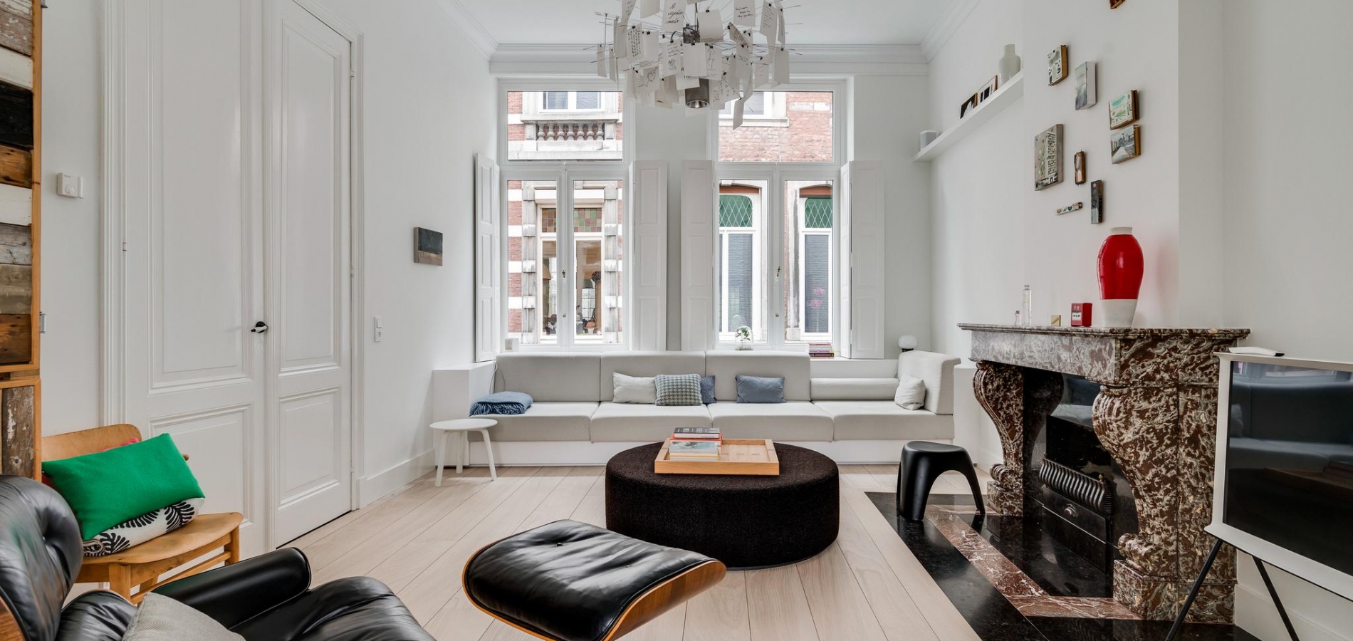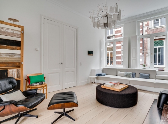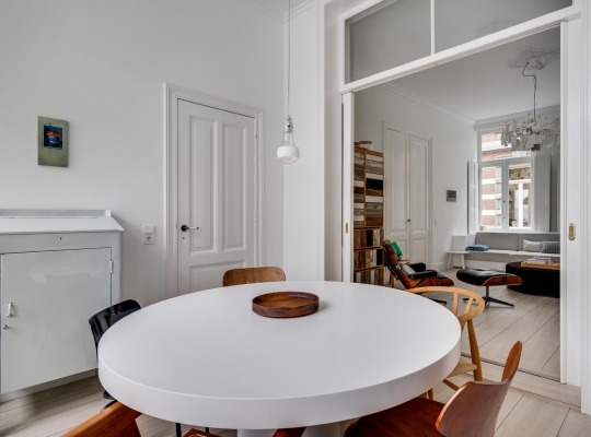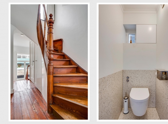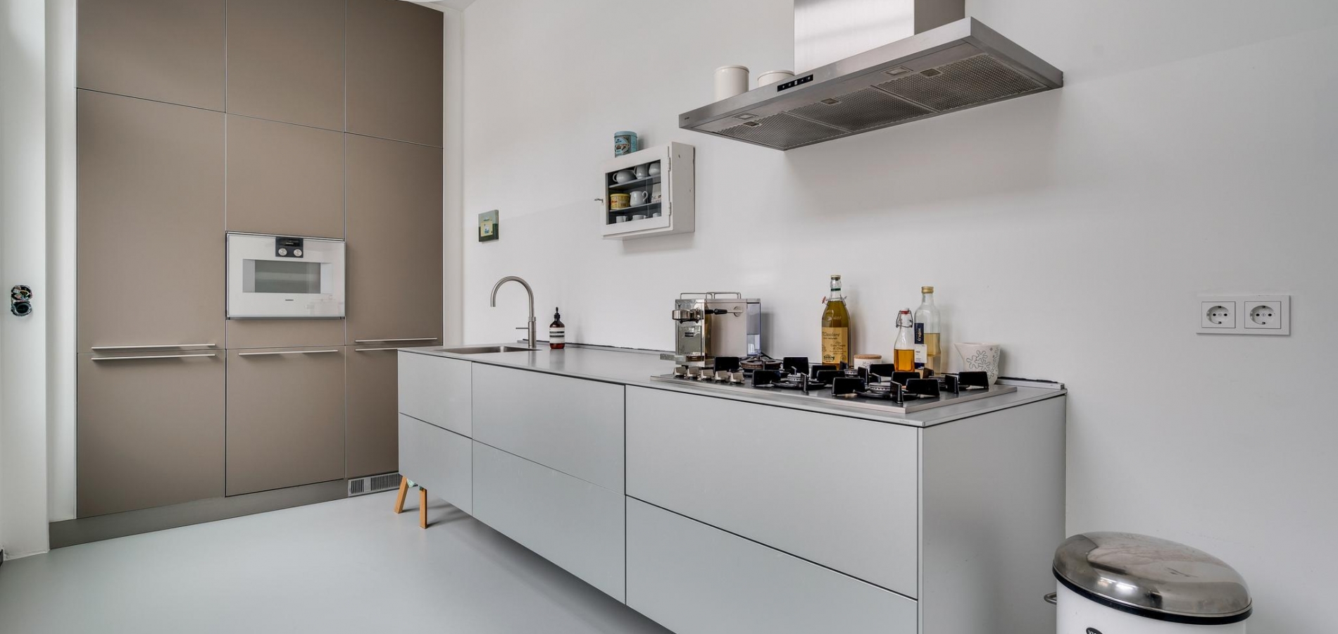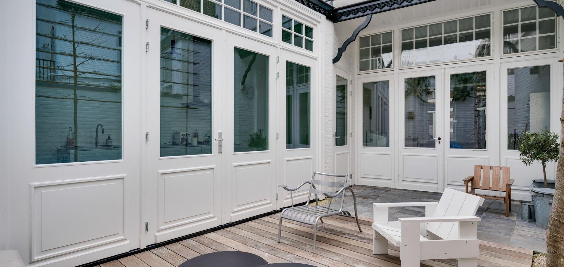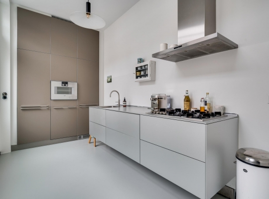 De prachtige entree is een fantastische start van uw bezoek aan dit stijlvolle herenhuis. In de hal ziet u een 3.80 meter hoog plafond, stucwerk, prachtige paneeldeuren en een granitovloer boordevol karakter. Aan het einde van de hal ziet u de houten trap naar de eerste verdieping. Hier bevindt zich de toiletruimte met design sanitair en stijlvol tegelwerk. Dubbele deuren verbinden de hal met de woonkamer (5,85 x 4,14) waar klassiek en modern zijn gecombineerd. Het hoge plafond met ornament en sierlijsten past goed bij de olmenhouten vloer, de natuurstenen schouw met haard, de klassieke raamluiken en de op maat gemaakte bank van corian en stof. Achter de schuifdeuren bevindt zich de eetkamer (3,64 x 3,03) met openslaande tuindeuren en genoeg ruimte voor een diner met vrienden en familie. Via de hal loopt u zo vanuit de eetkamer naar de keuken (5,59 x 2,08) in de aanbouw. Hier ziet u een exclusieve Bulthaup keuken met een 5-pits gaskookplaat, afzuigkap, Quooker (2023), Gaggenau combi-oven (2023), Miele vaatwasser en een Gaggenau koelvriescombinatie (2023). Vanuit de keuken en eetkamer heeft u toegang tot de stadstuin. Het houten terras is een fantastische plek om te loungen en borrelen. De hoge tuinmuur is wit geschilderd, waardoor de ruimte groot oogt. Verder ziet u leibomen, die voor extra schaduw zorgen in de zomer.