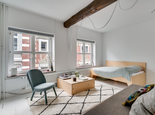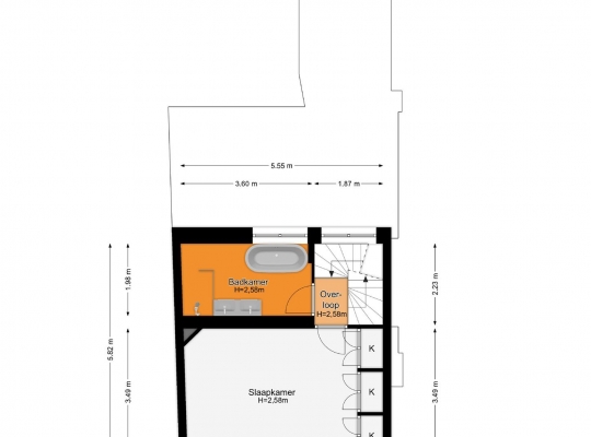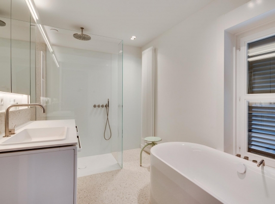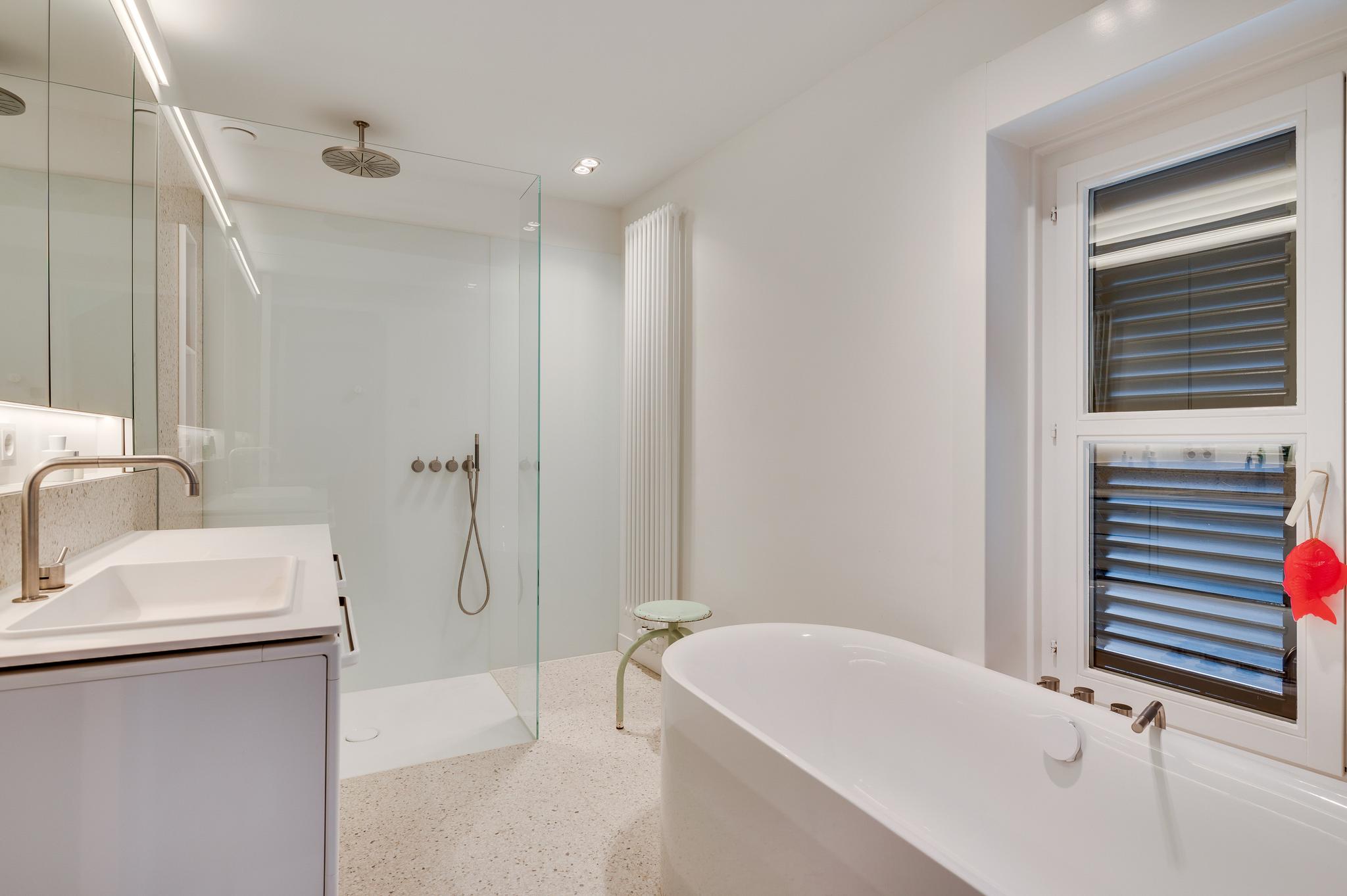 Een verdieping hoger ziet u een soortgelijke indeling met slaapkamer II (5,47 x 3,49) en badkamer II (3,60 x 1,98). De slaapkamer met lichte vloer, eikenhouten balk en op maat gemaakte kastenwand is een sfeervolle kamer waar de witte schouw een decoratieve functie heeft. De badkamer op deze etage is ingedeeld met een prachtig bad, grote inloopdouche en een wastafelmeubel. Qua materiaalkeuze en kleur is deze badkamer vergelijkbaar met badkamer I, zonder concessies te doen ten aanzien van kwaliteit en afwerking.
