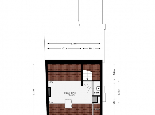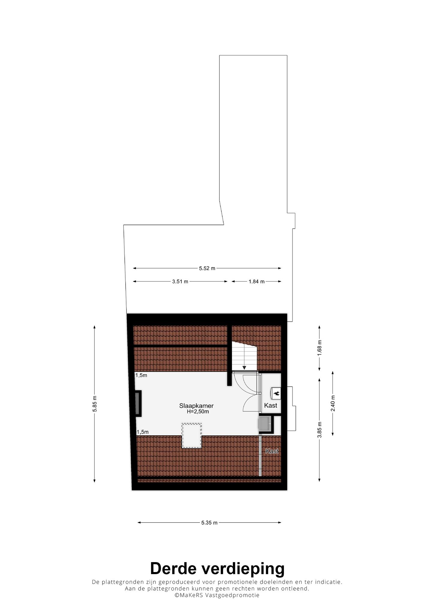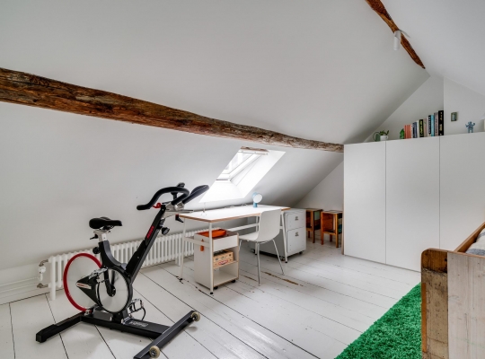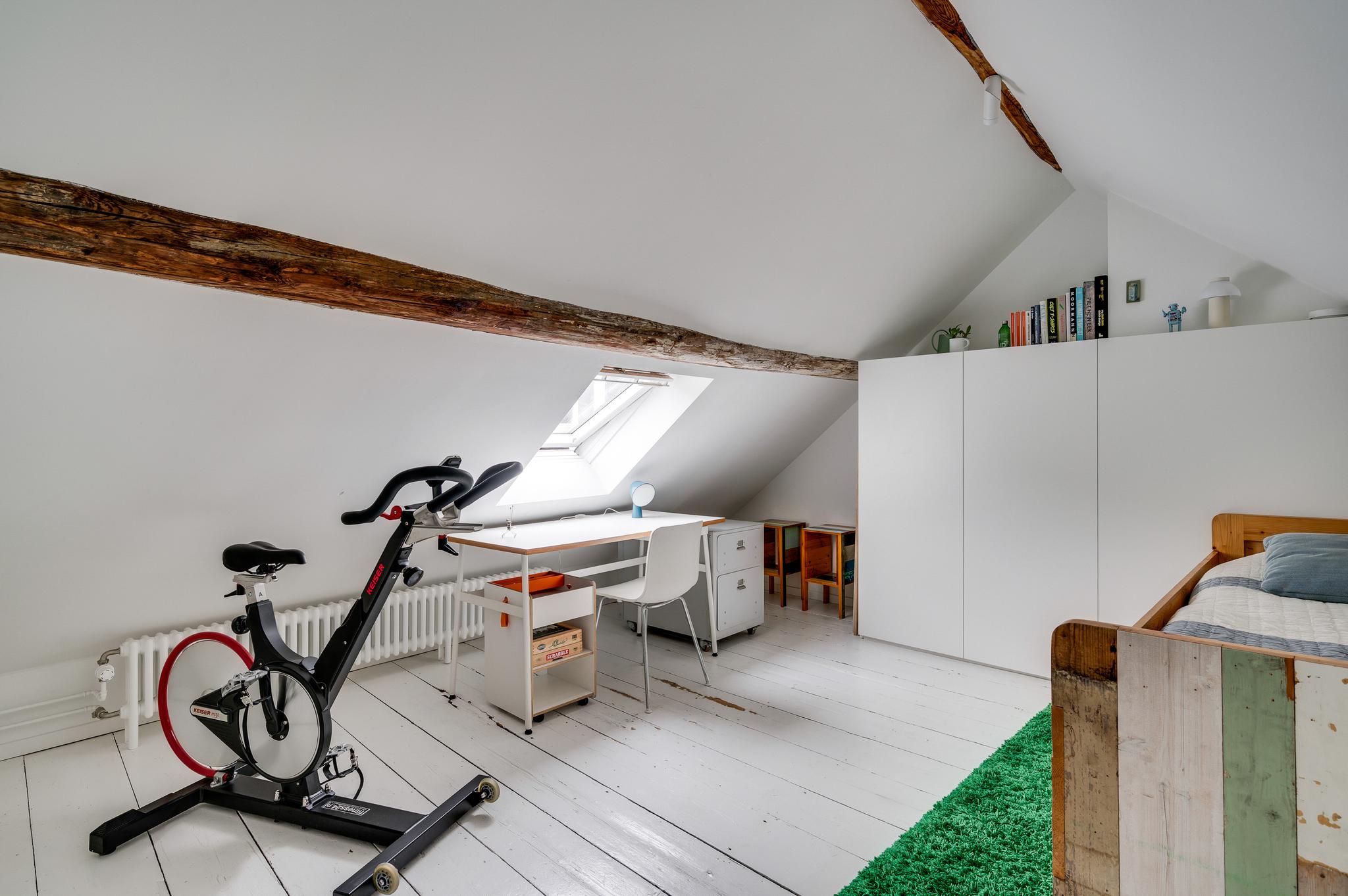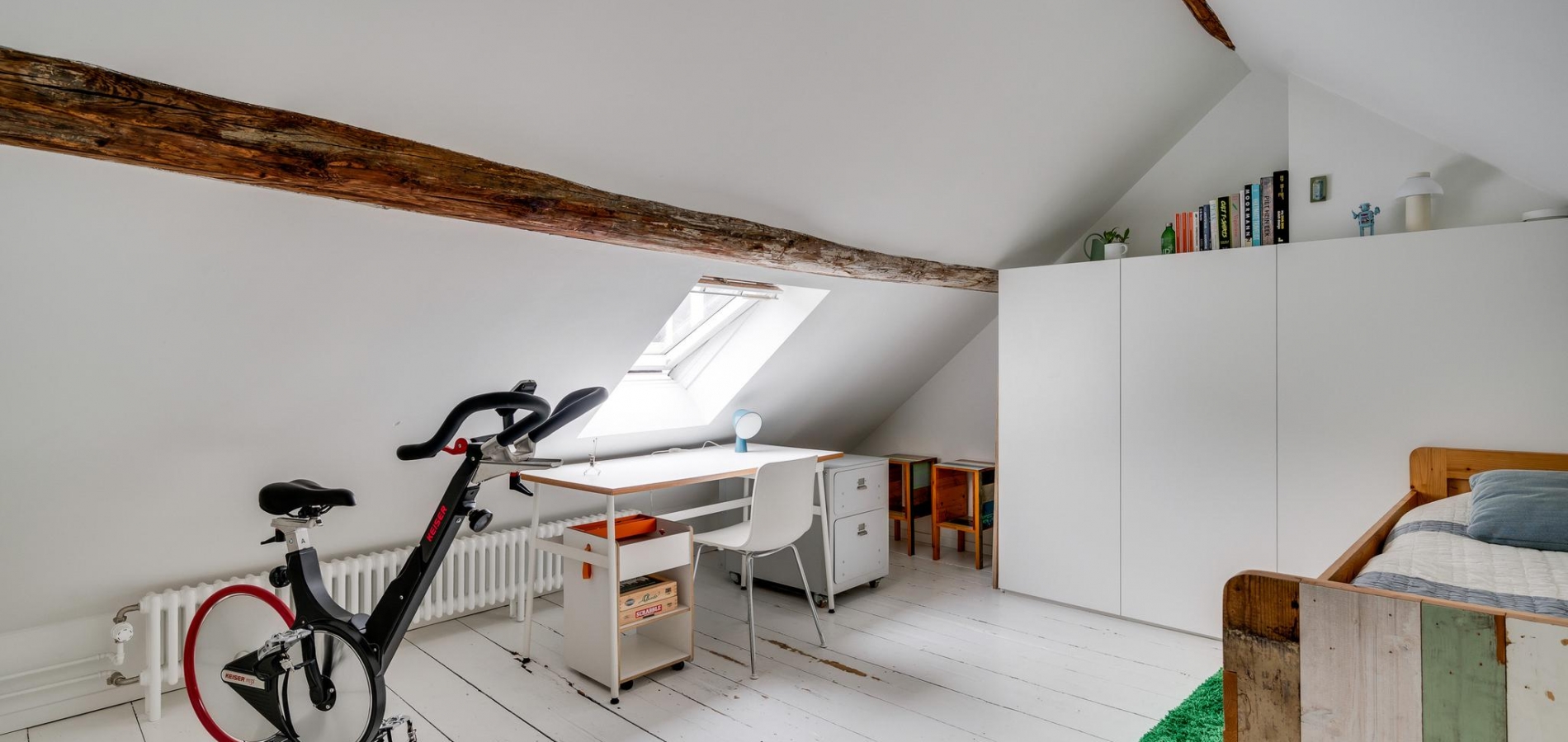 Op de bovenste verdieping is slaapkamer III (5,35 x 2,40) (niet meegerekend in de woonoppervlakte) met een hoge nok, dakraam en een op maat gemaakte kastenwanden met wastafel. In een van deze kasten bevindt zich de HR-ketel (Remeha, 2020, eigendom).