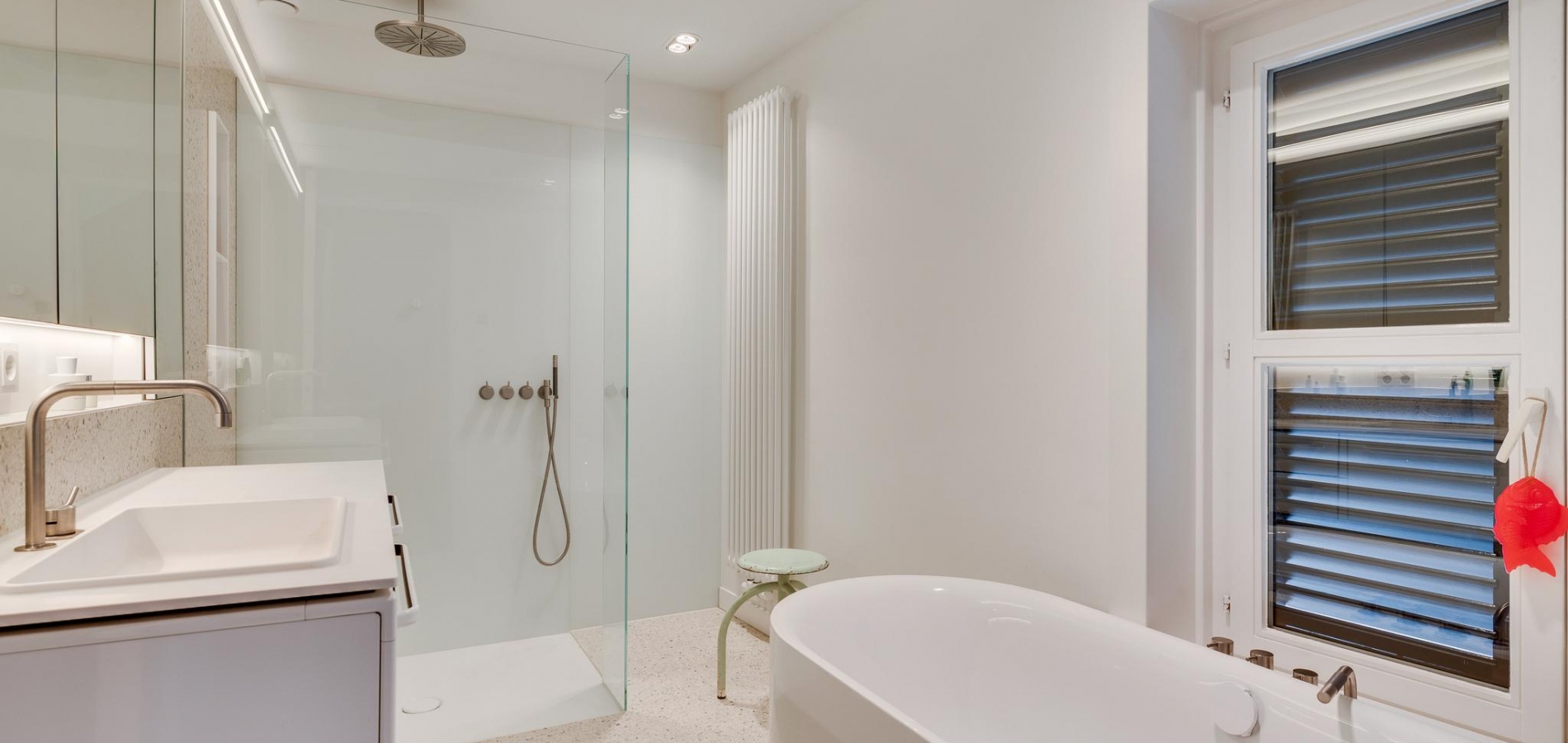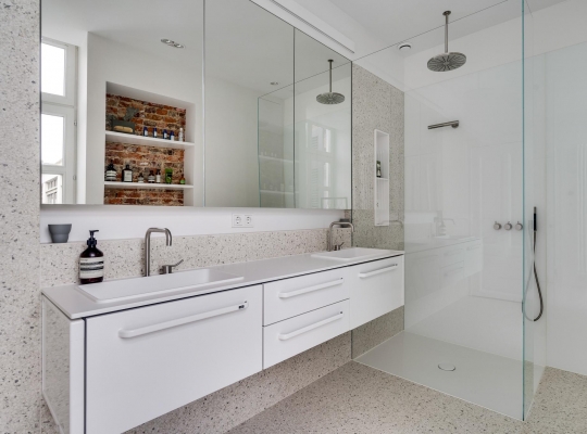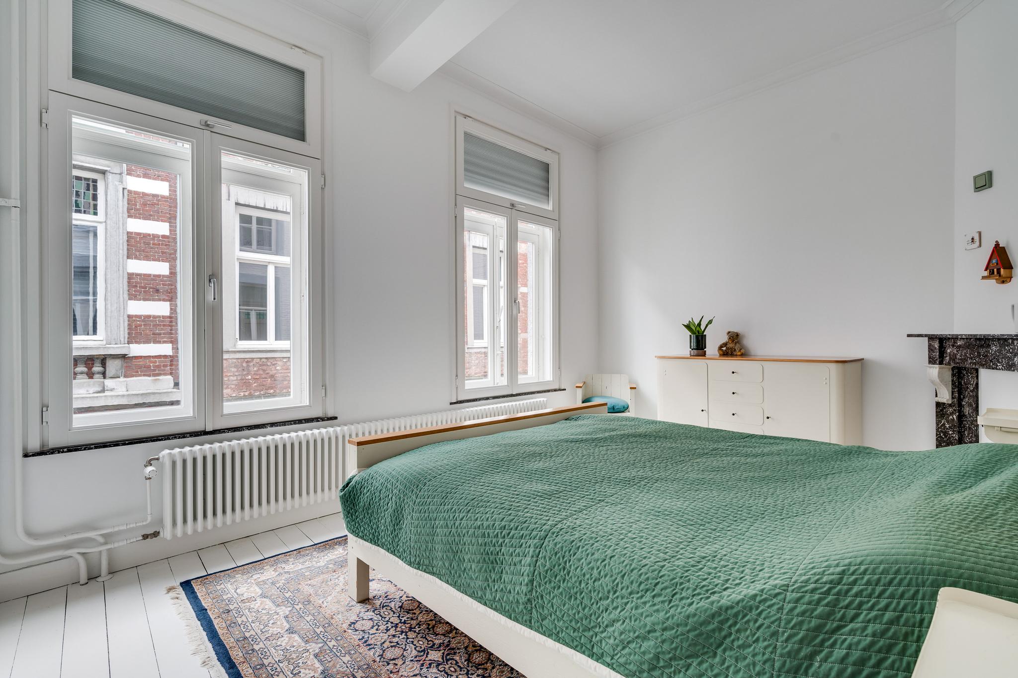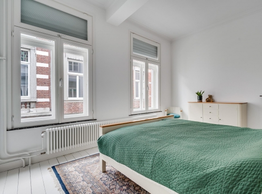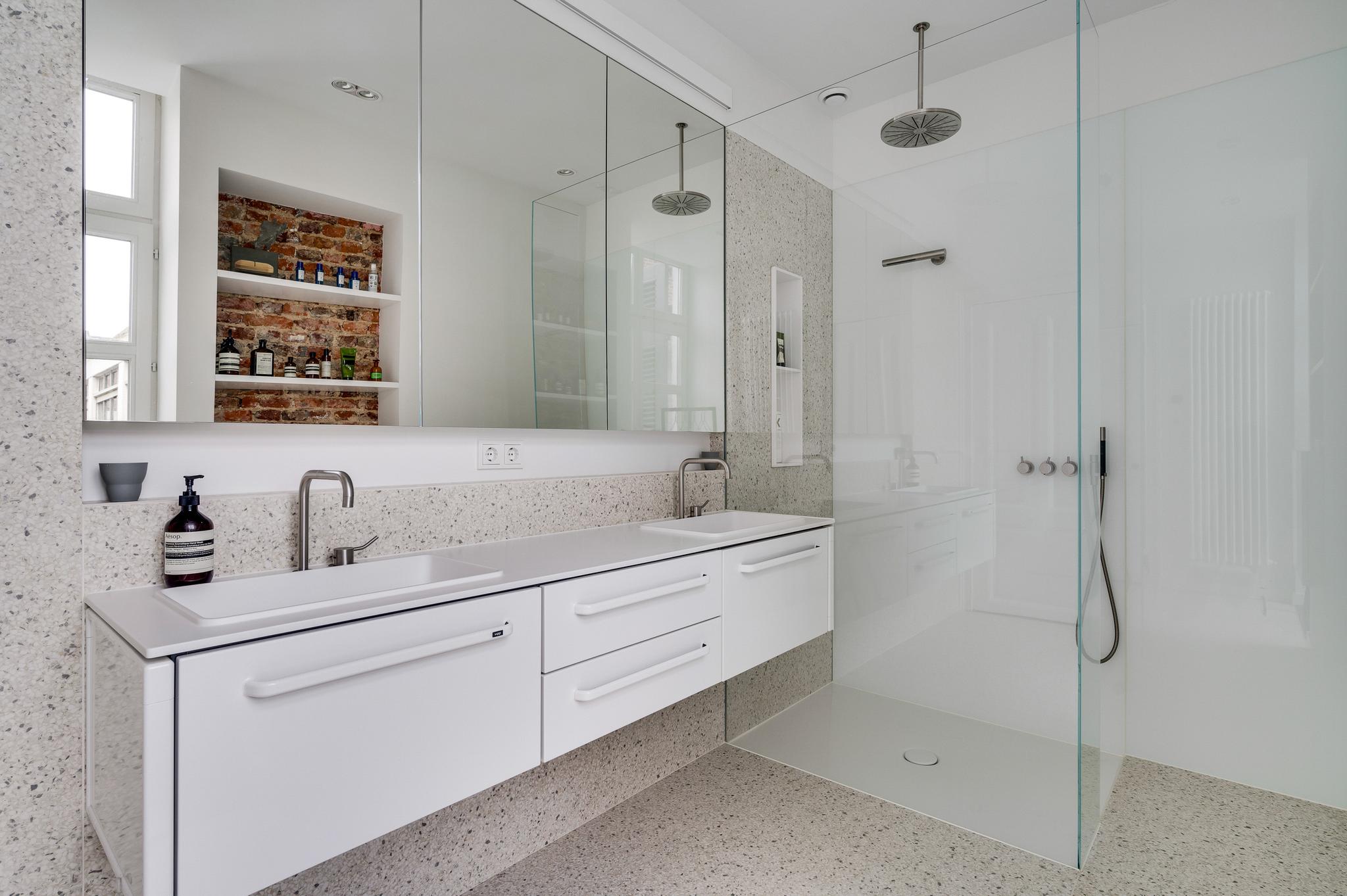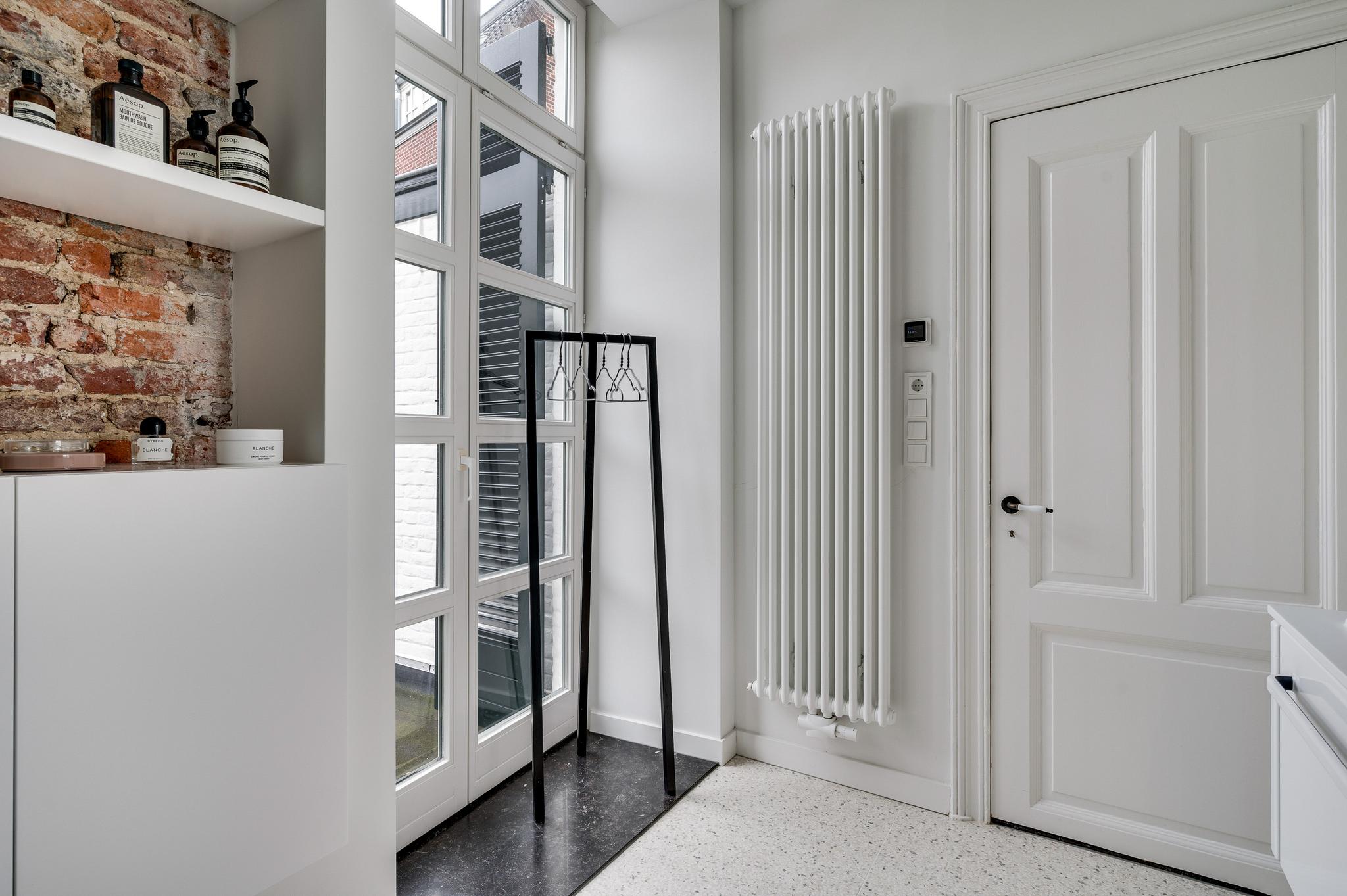 Volg de bordestrap naar de eerste verdieping, waar de slaapkamer I en een badkamer I zijn. Slaapkamer I (5,44 x 3,51) met op maat gemaakte kastenwand en natuurstenen schouw bevindt zich aan de voorzijde van het herenhuis. Het plafond heeft een hoogte van ruim 3.40 meter. In de badkamer (3,62 x 1,79) ziet u sanitair van o.a. Vipp en Vola kranen. U heeft de beschikking over een grote inloopdouche (regendouche en watervaldouche) en een dubbel wastafelmeubel met spiegelkast. Naast de openslaande deuren naar het balkon ziet u een nis met planken en een achterwand van ruw metselwerk, perfect passend in het geheel. Ook is er op deze etage een aparte toiletruimte, uitgevoerd in dezelfde stijl. Onder de trap naar de tweede verdieping is een kast met de wasmachineaansluiting.