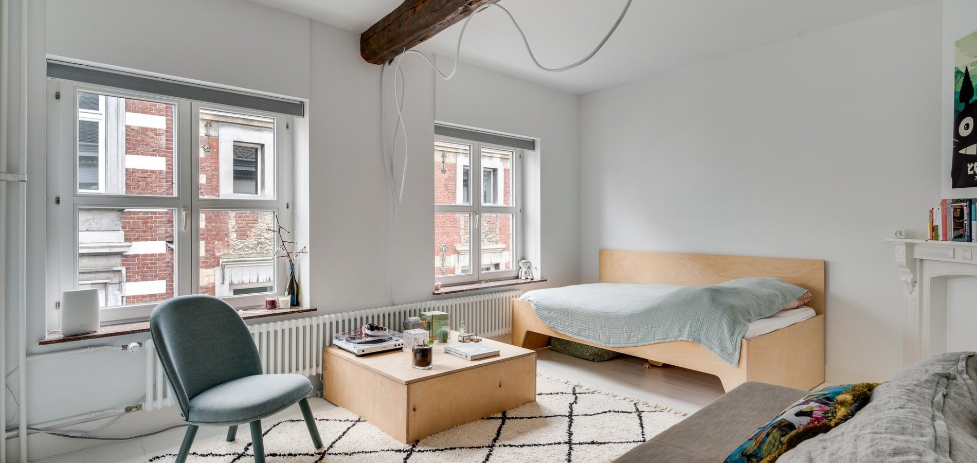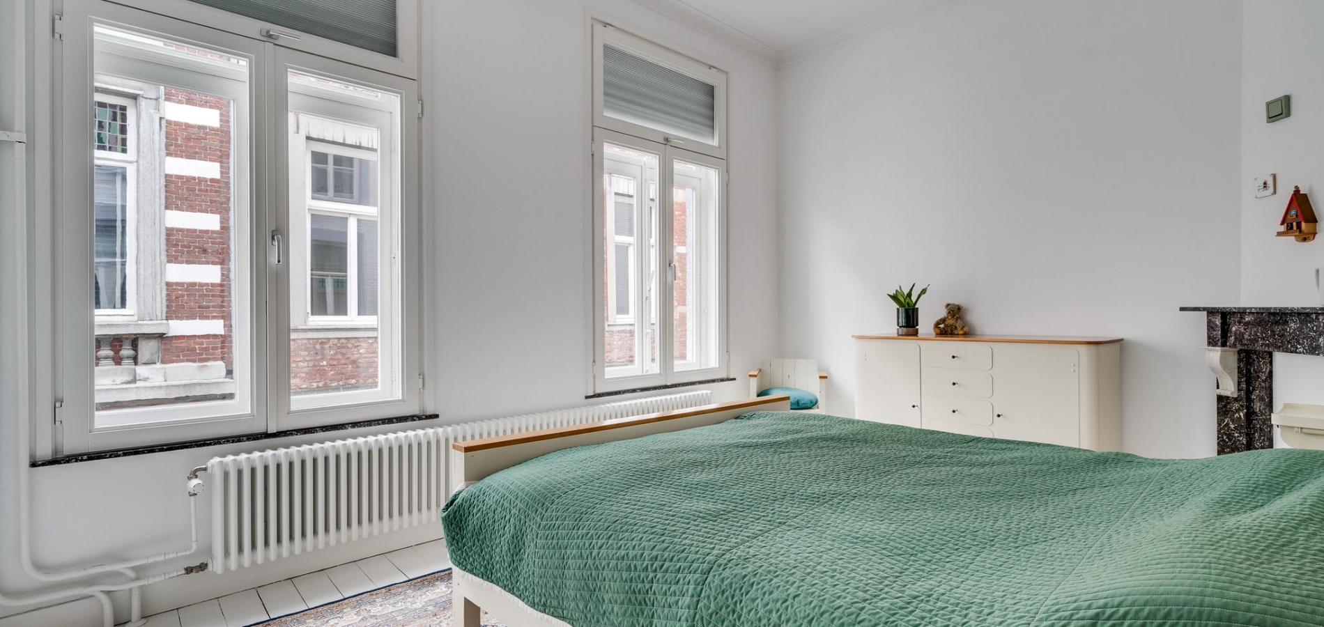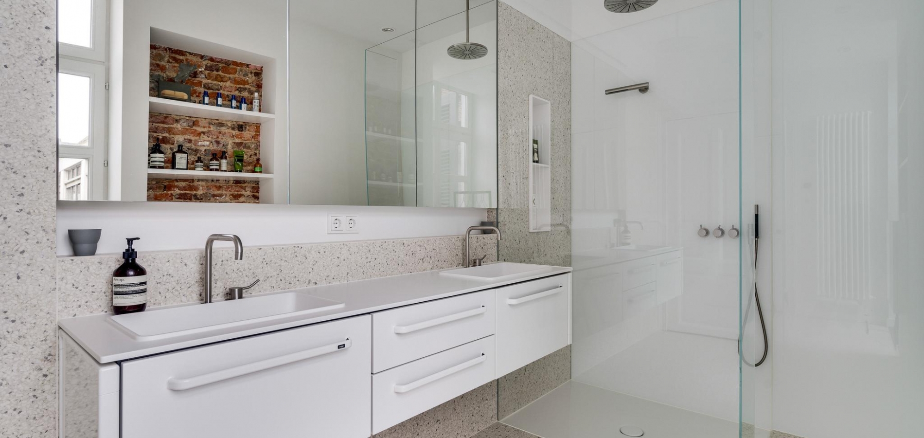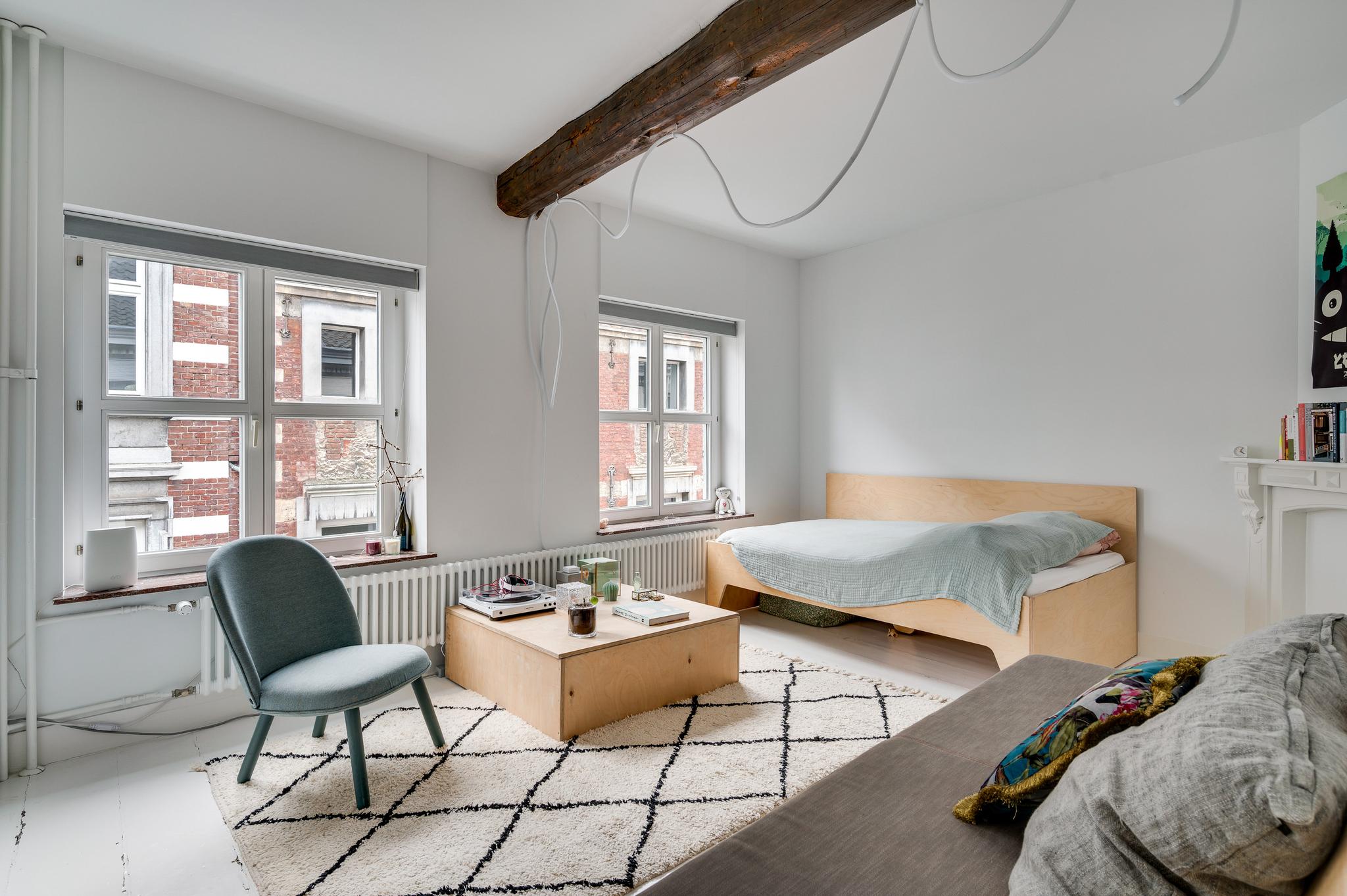 Volg de bordestrap naar de eerste verdieping, waar de slaapkamer I en een badkamer I zijn. Slaapkamer I (5,44 x 3,51) met op maat gemaakte kastenwand en natuurstenen schouw bevindt zich aan de voorzijde van het herenhuis. Het plafond heeft een hoogte van ruim 3.40 meter. In de badkamer (3,62 x 1,79) ziet u sanitair van o.a. Vipp en Vola kranen. U heeft de beschikking over een grote inloopdouche (regendouche en watervaldouche) en een dubbel wastafelmeubel met spiegelkast. Naast de openslaande deuren naar het balkon ziet u een nis met planken en een achterwand van ruw metselwerk, perfect passend in het geheel. Ook is er op deze etage een aparte toiletruimte, uitgevoerd in dezelfde stijl. Onder de trap naar de tweede verdieping is een kast met de wasmachineaansluiting.