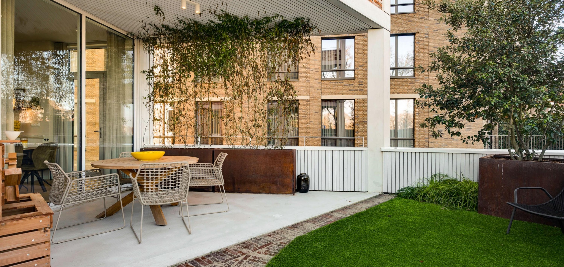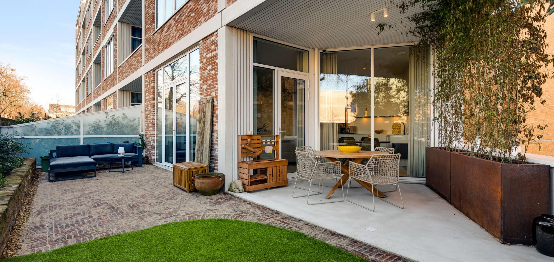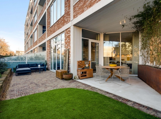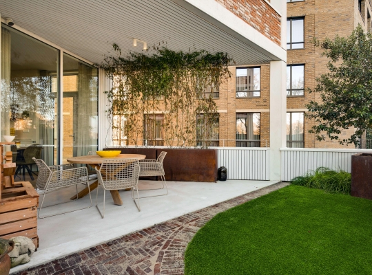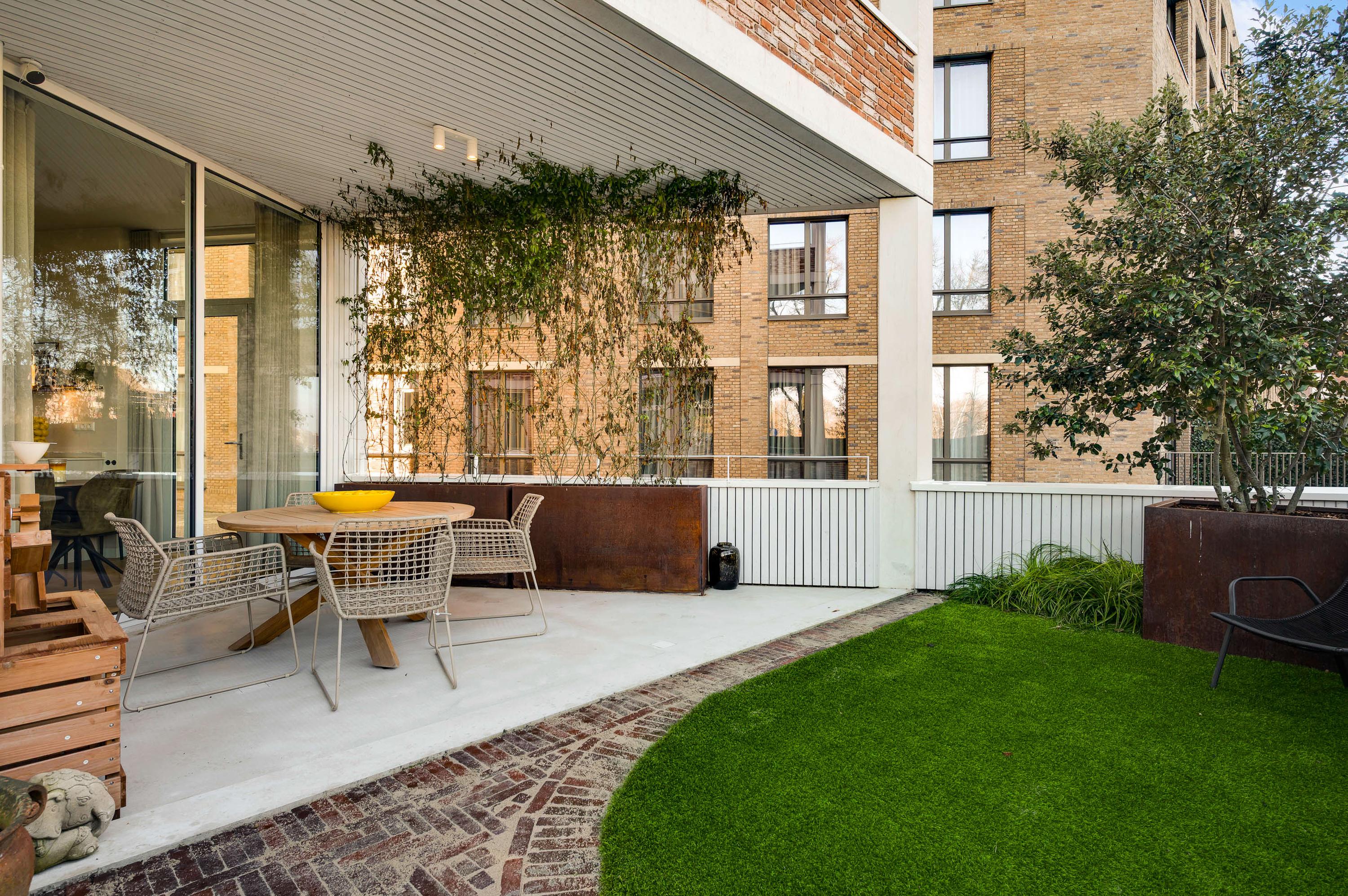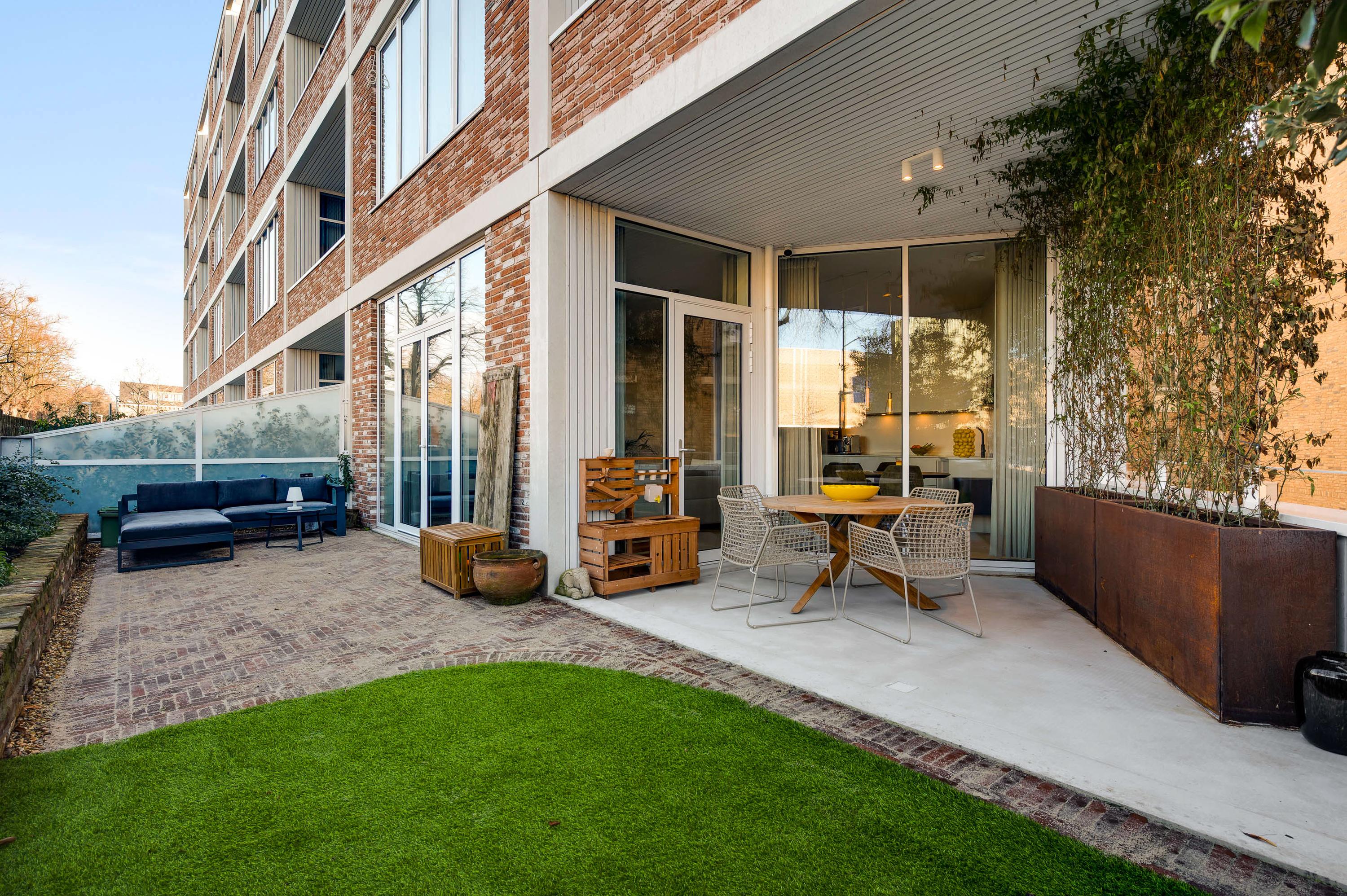 Dit gelijkvloerse, luxe appartement heeft een ruime tuin met een zonneterras en een overdekt terras. De oude fabrieksmuur is behouden en verder ziet u sierbestrating, kunstgras en onderhoudsvriendelijke beplanting. Als het straks mooi weer is, vormen de klimplanten bij het overdekte terras een groene wand, waardoor u veel privacy heeft.