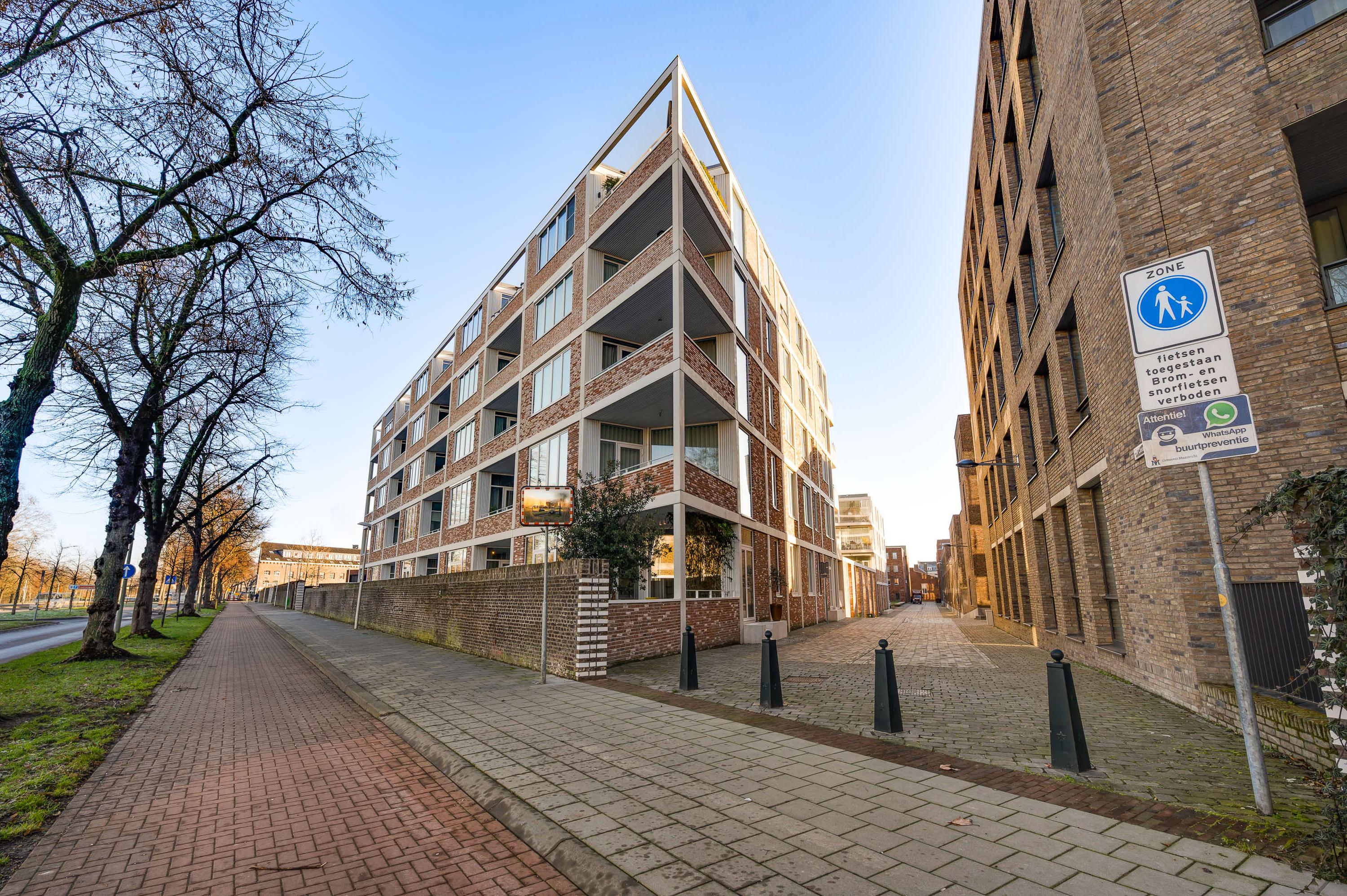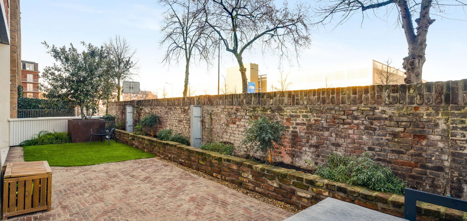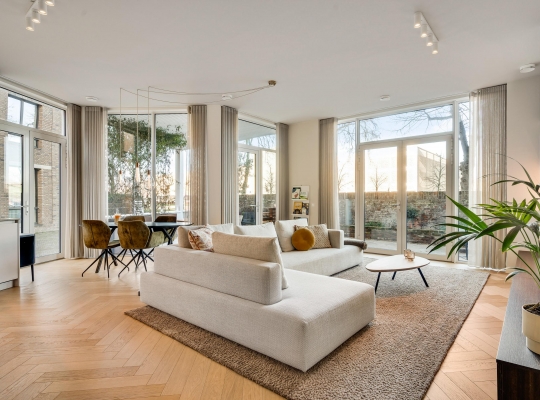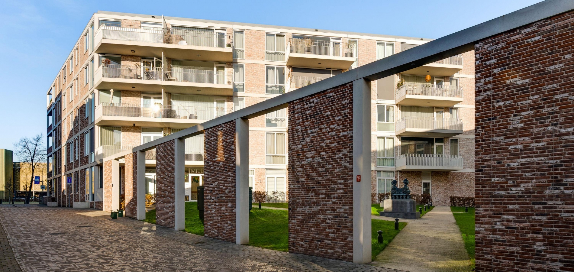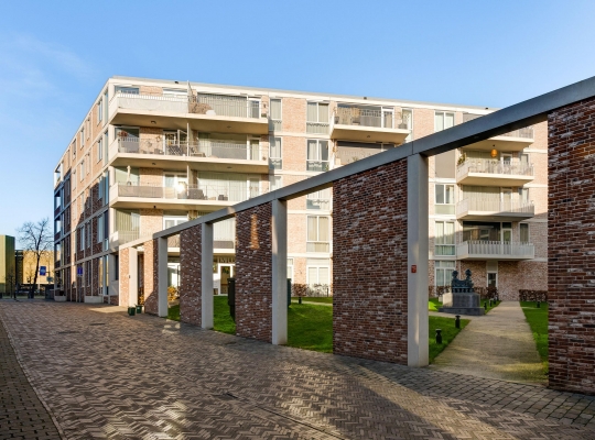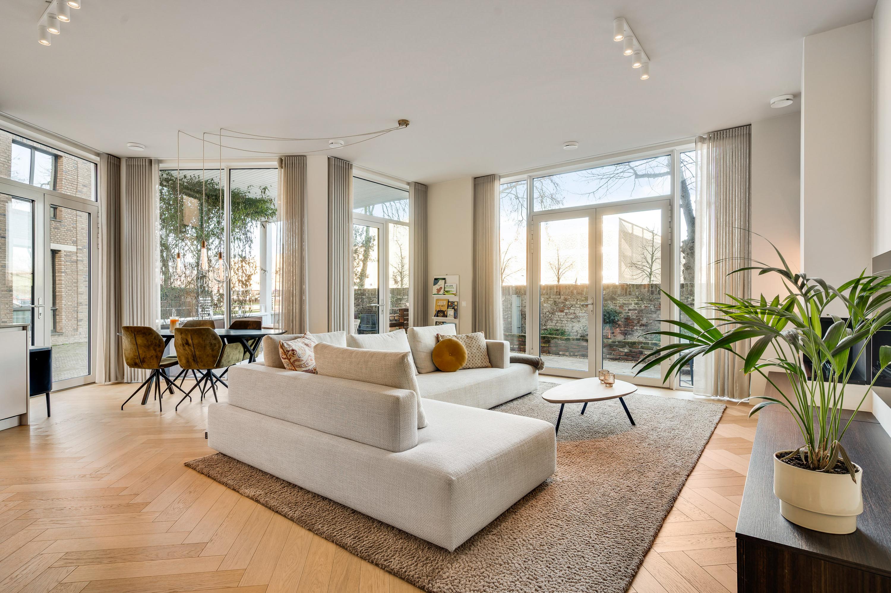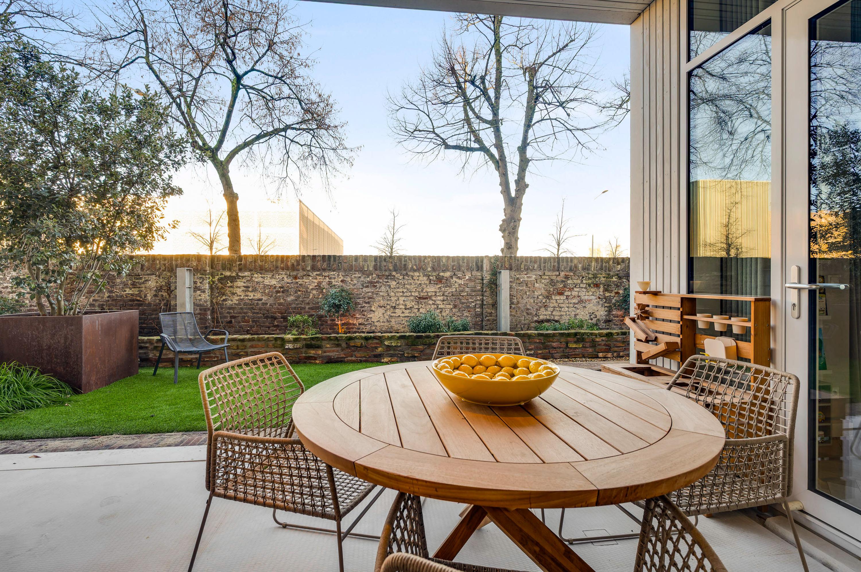 Dit gelijkvloerse, luxe appartement heeft een ruime tuin met een zonneterras en een overdekt terras. De oude fabrieksmuur is behouden en verder ziet u sierbestrating, kunstgras en onderhoudsvriendelijke beplanting. Als het straks mooi weer is, vormen de klimplanten bij het overdekte terras een groene wand, waardoor u veel privacy heeft.