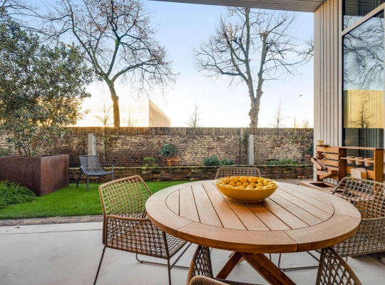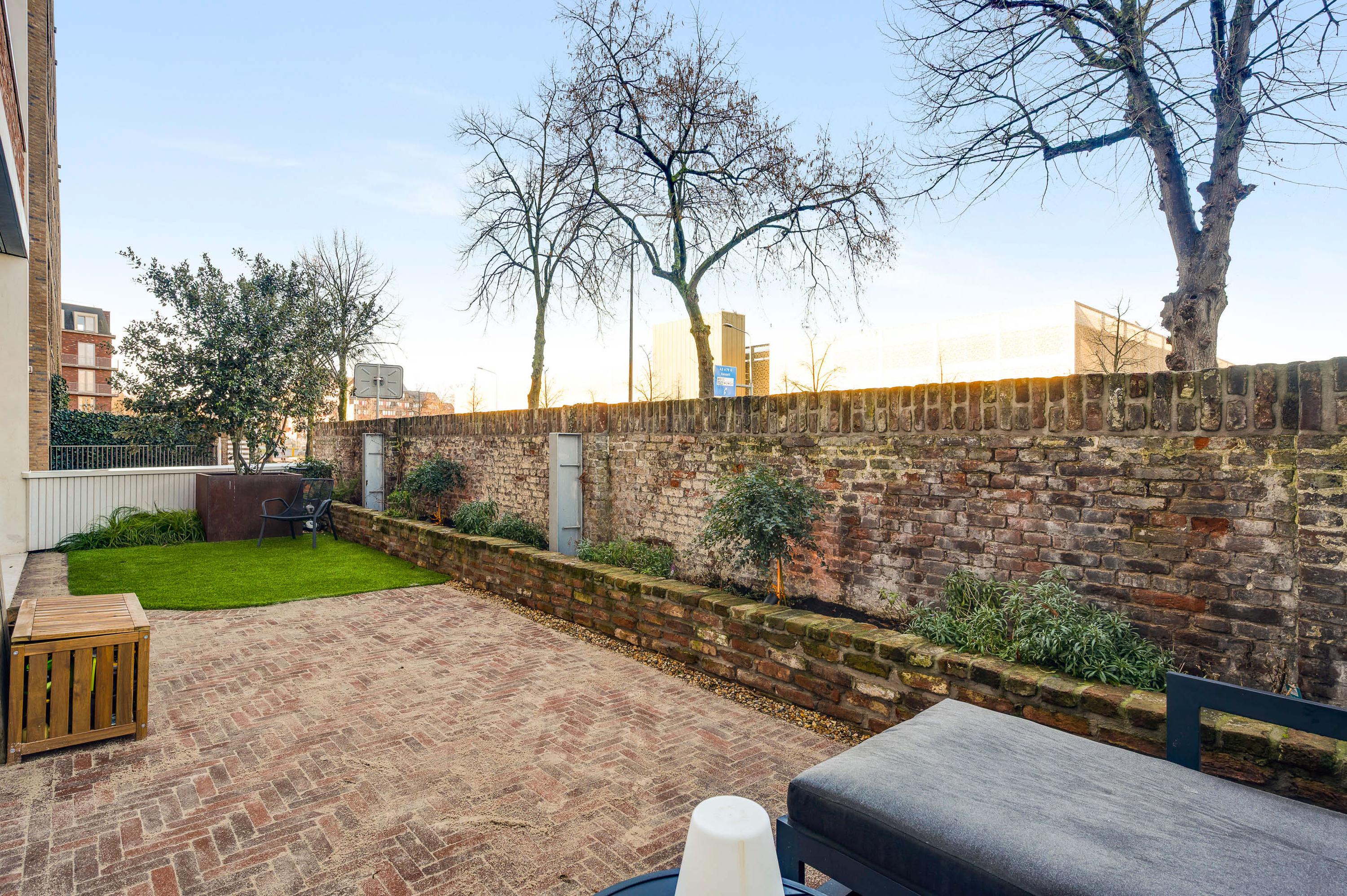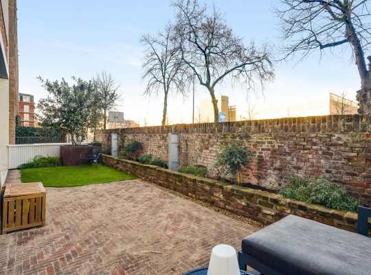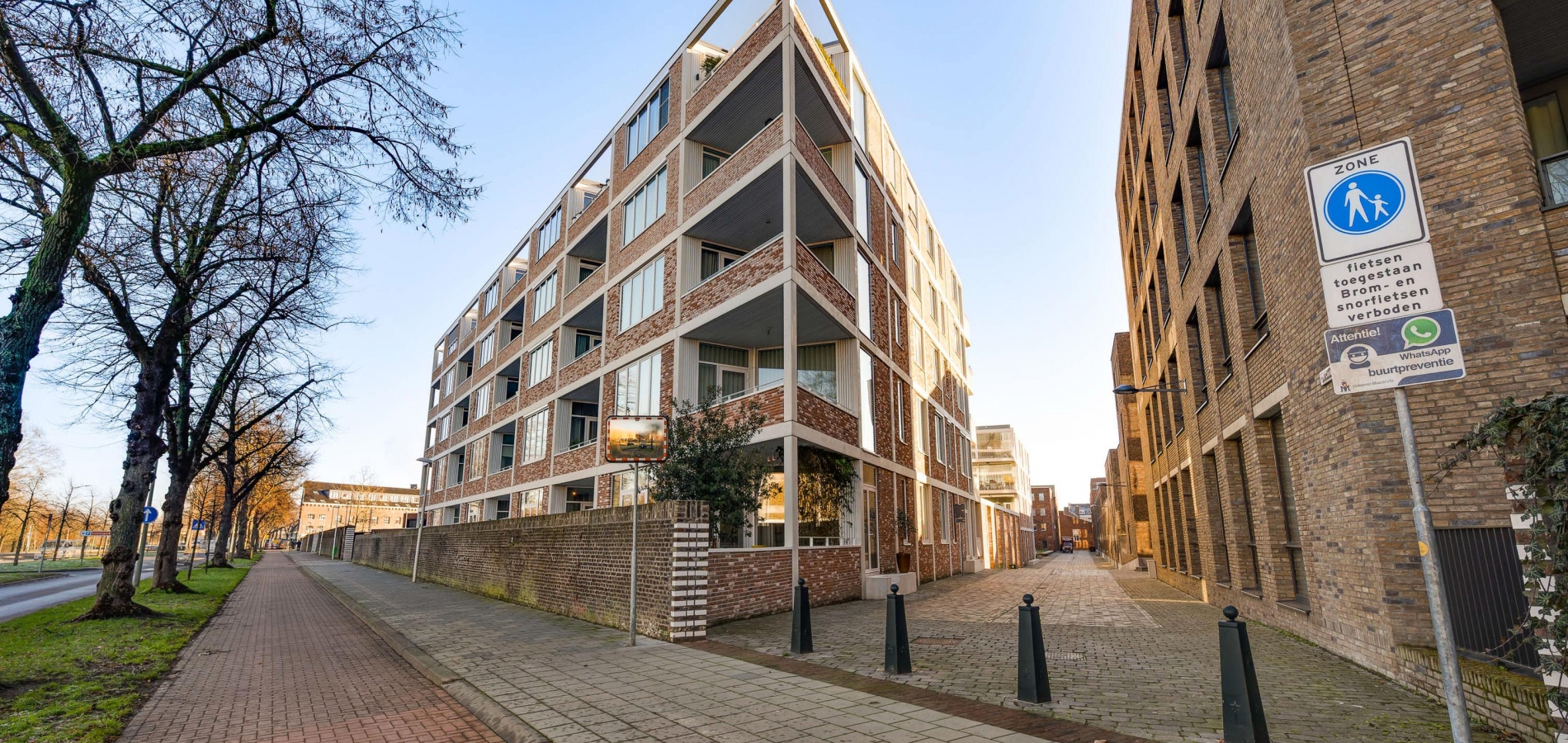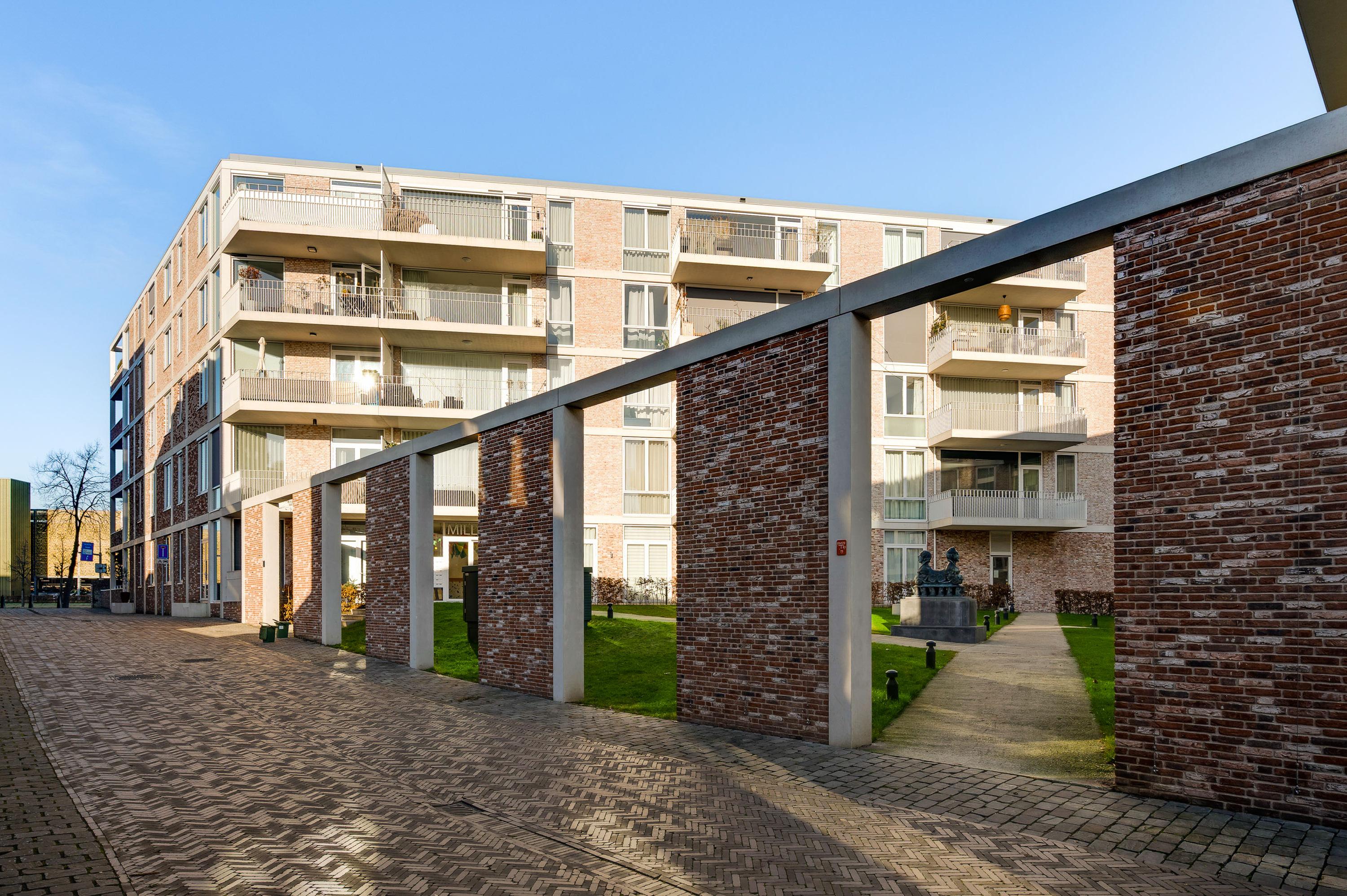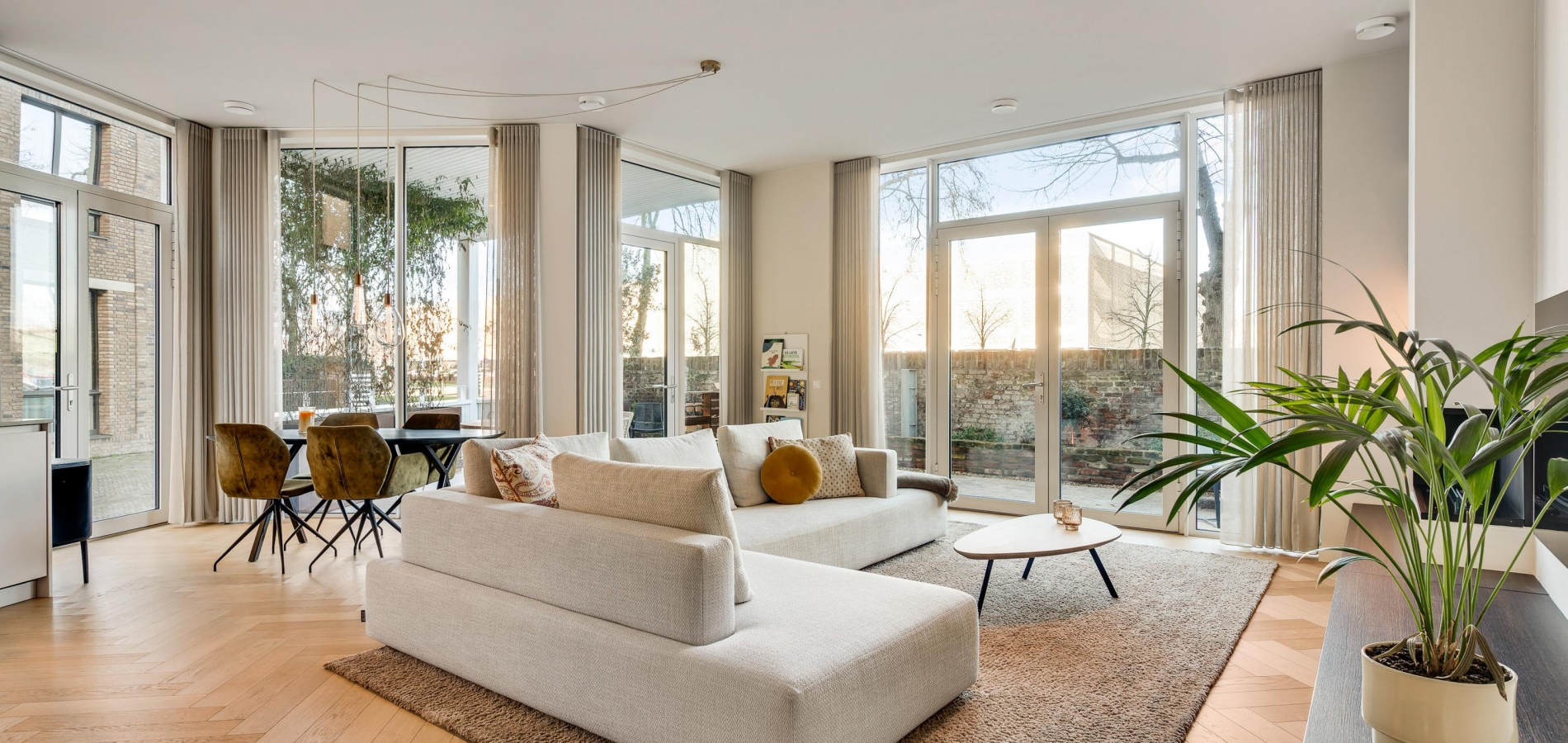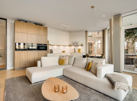 Dit gelijkvloerse, luxe appartement heeft een ruime tuin met een zonneterras en een overdekt terras. De oude fabrieksmuur is behouden en verder ziet u sierbestrating, kunstgras en onderhoudsvriendelijke beplanting. Als het straks mooi weer is, vormen de klimplanten bij het overdekte terras een groene wand, waardoor u veel privacy heeft.