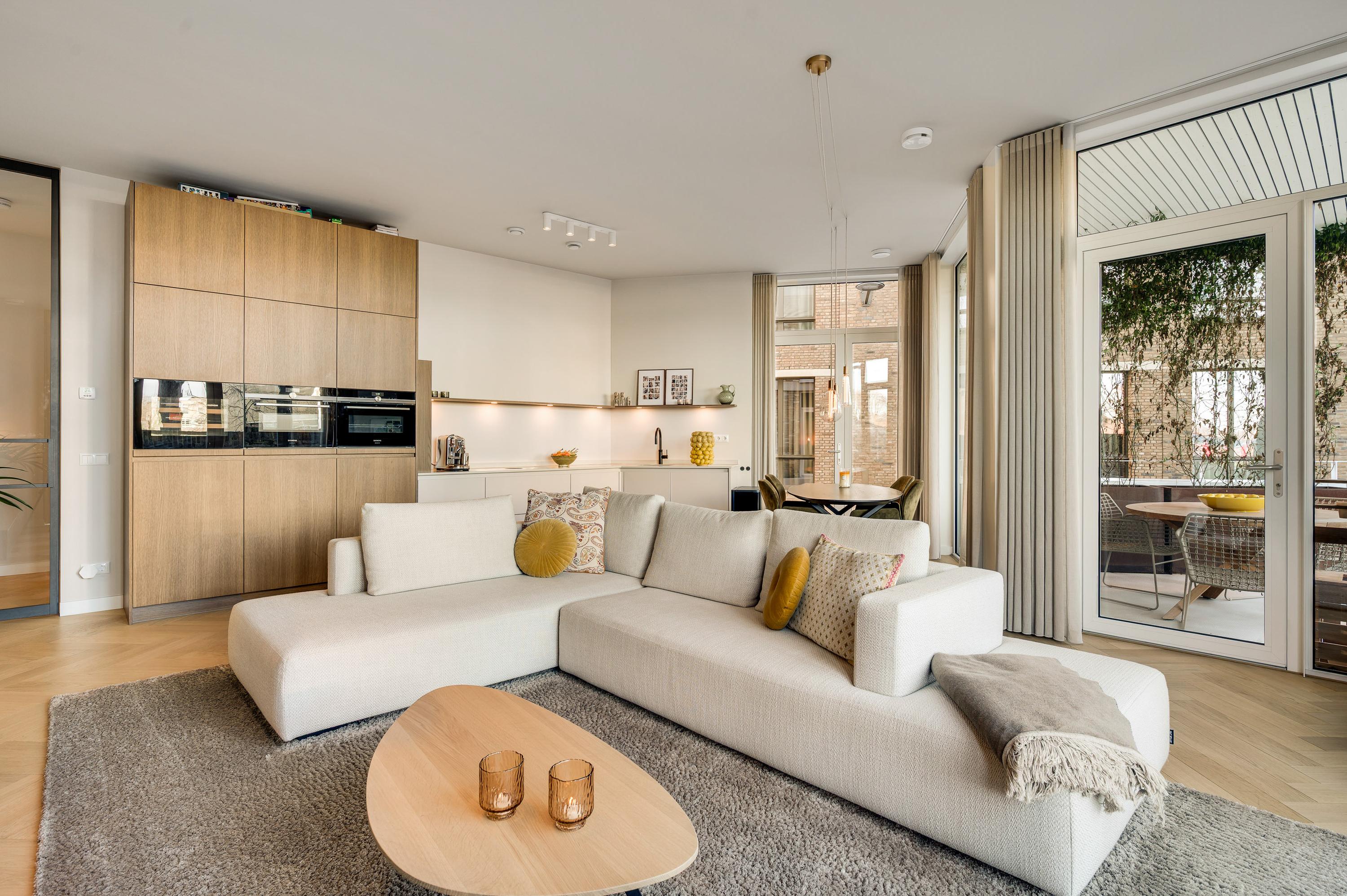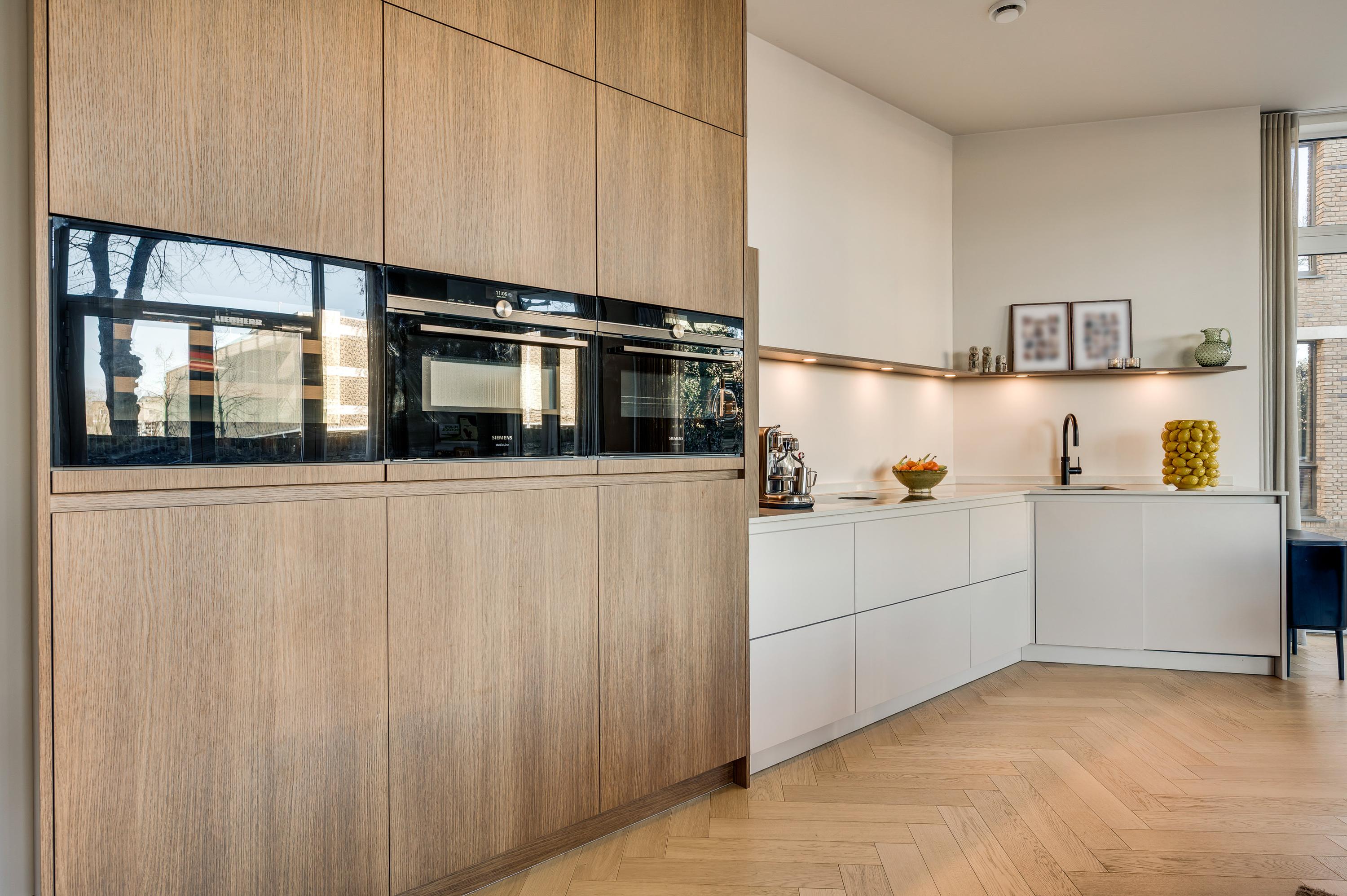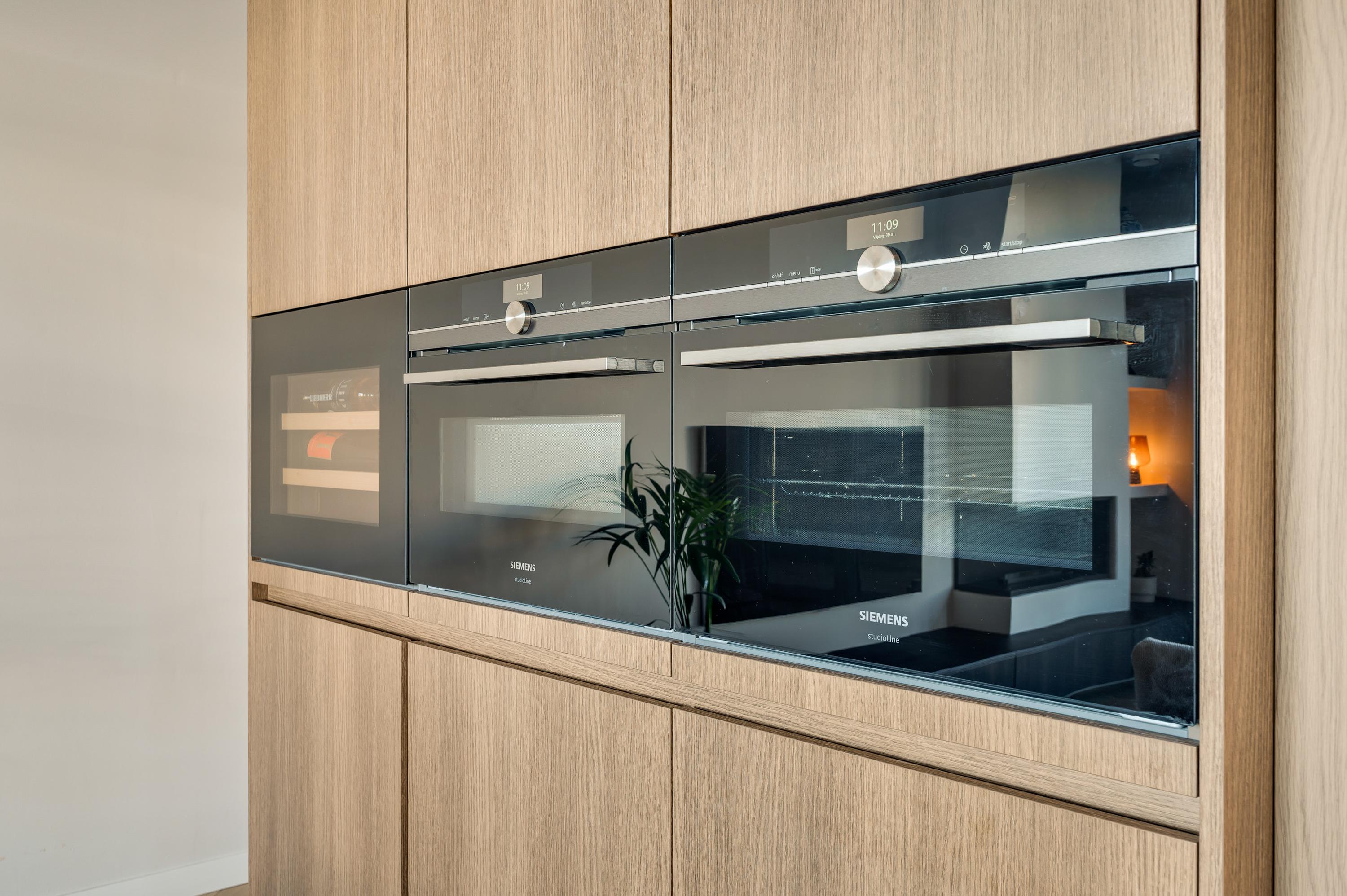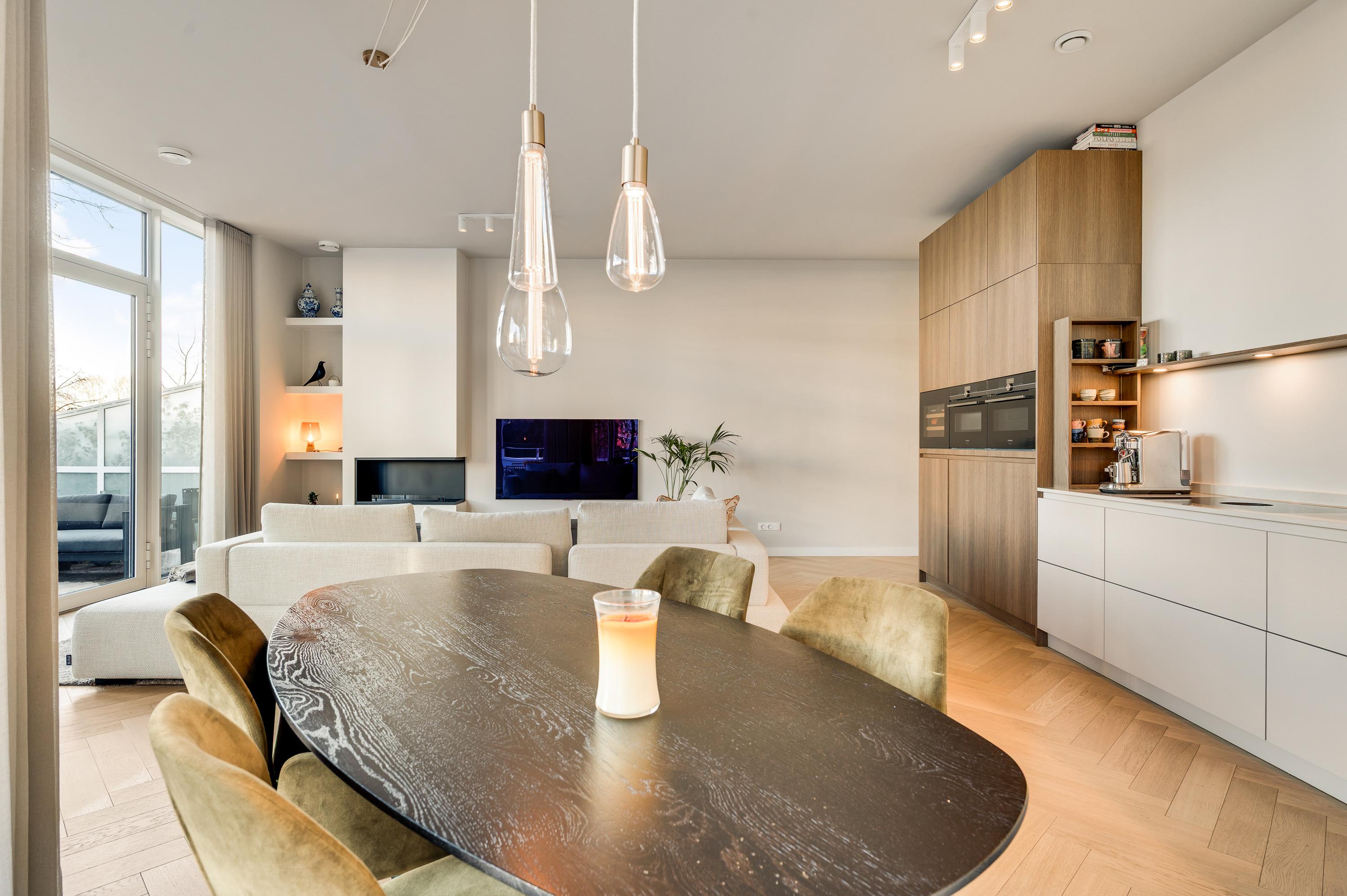 Aan het einde van de hal is de woonkamer met open keuken, met een circa 3 meter hoog plafond en prachtig uitzicht op de privétuin. Er zijn dubbele deuren bij het zit- en het eetgedeelte, plus openslaande deuren naar het overdekte terras. Het wandmeubel met bio-ethanolhaard is maatwerk, net als de keuken in een fraaie kleurstelling. Alle benodigde apparatuur is ingebouwd: een inductie kookplaat met afzuiging, een koelkast, vriezer, Quooker, combi-oven, stoomoven en een wijnkoelkast. De apparatuur is van gerenommeerde merken als Bora, Siemens Studioline, AEG en Liebherr.