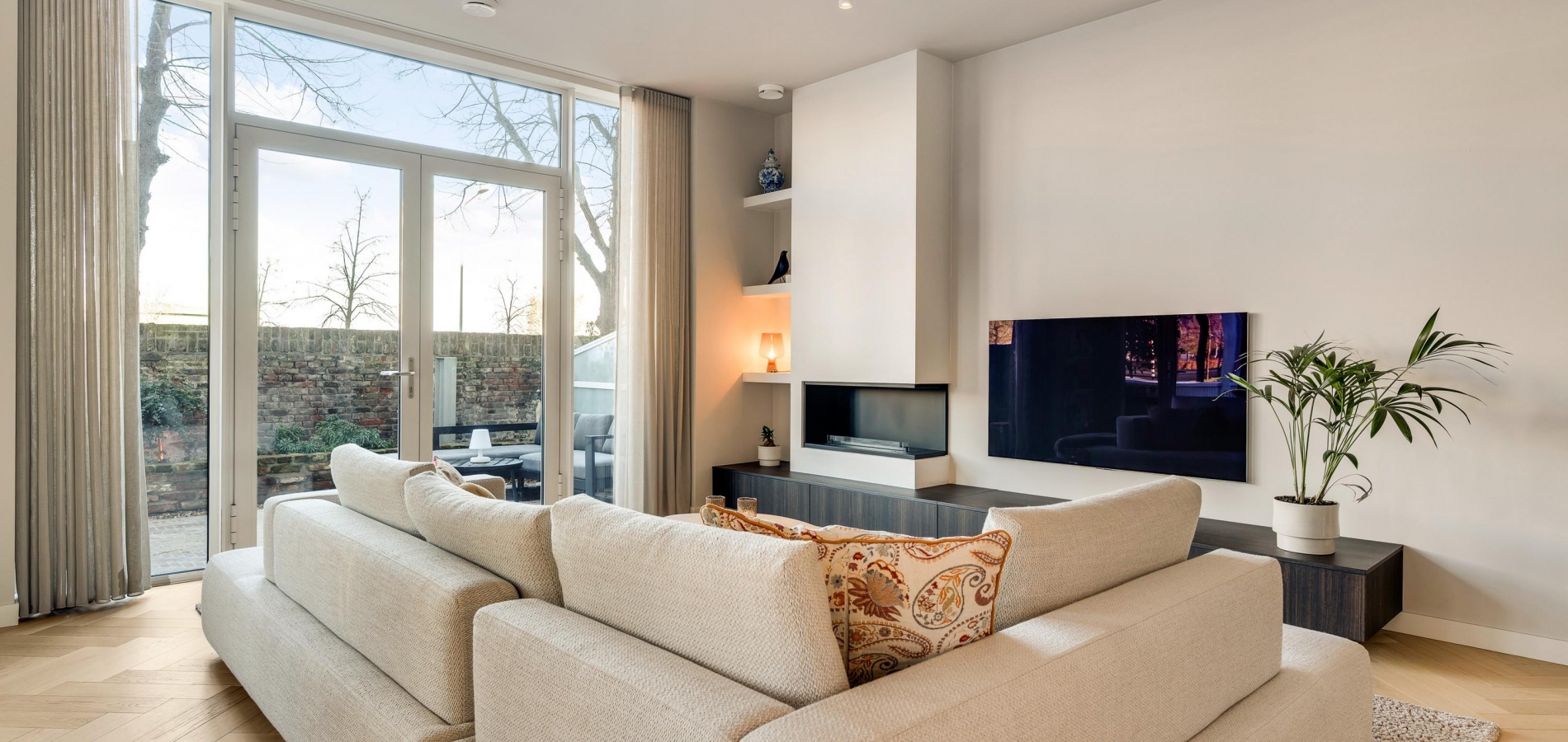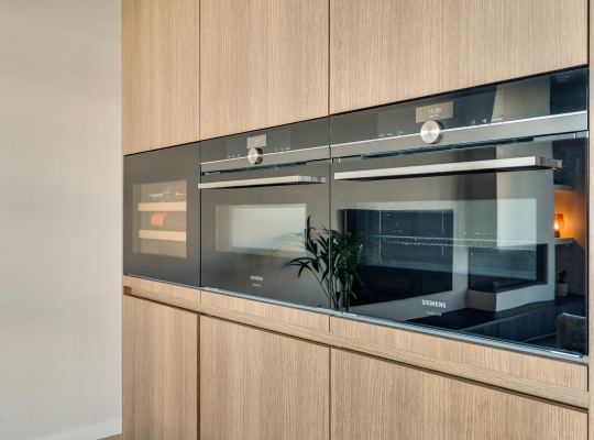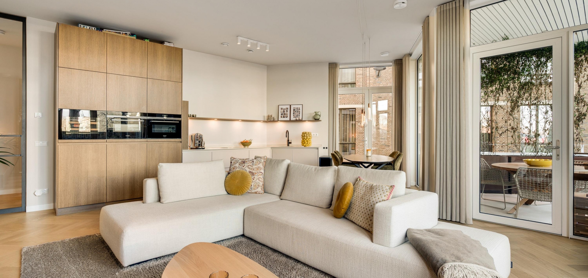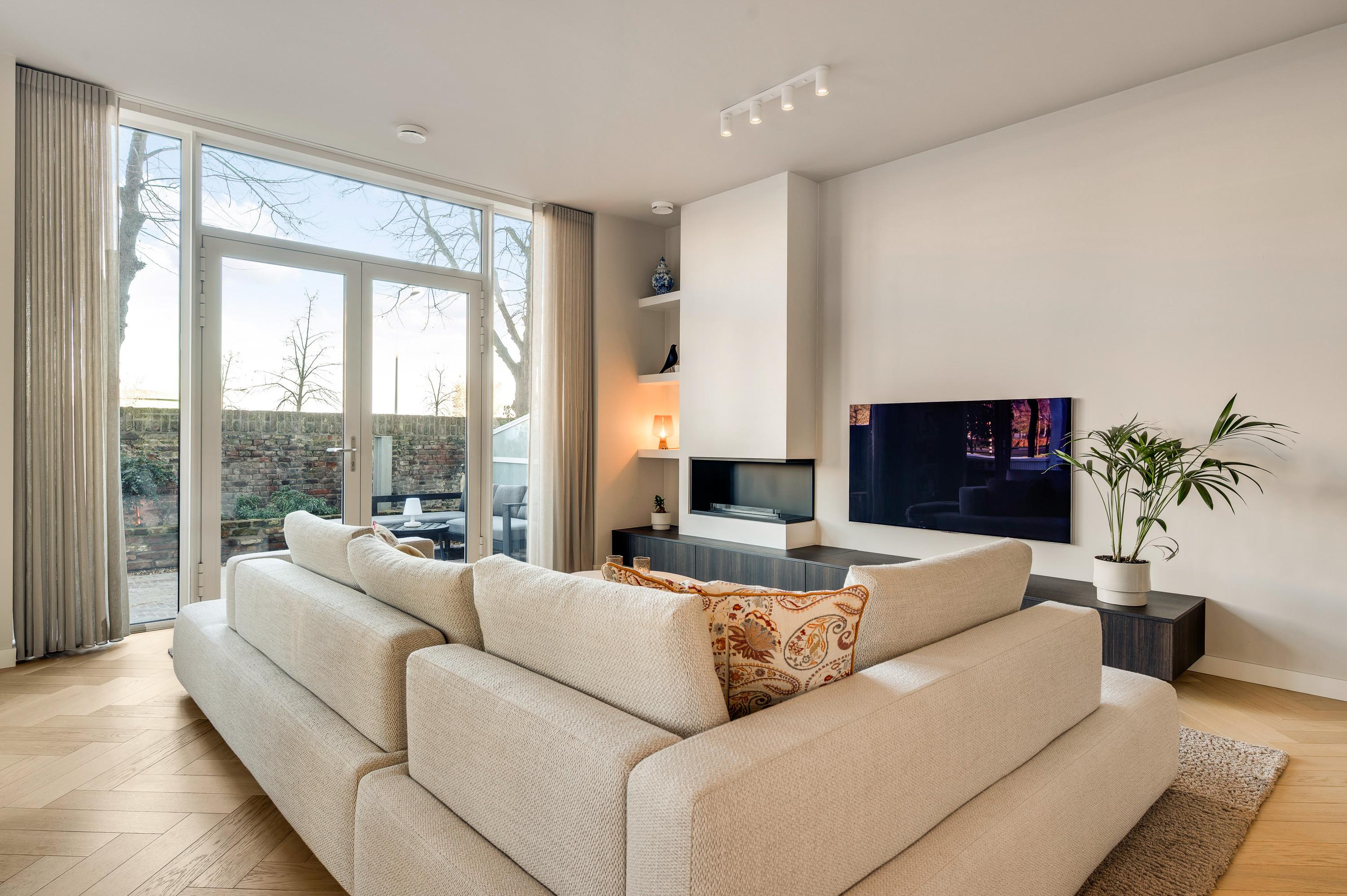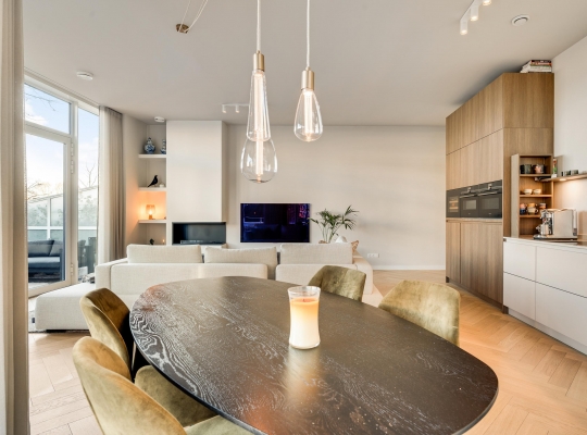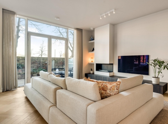 Aan het einde van de hal is de woonkamer met open keuken, met een circa 3 meter hoog plafond en prachtig uitzicht op de privétuin. Er zijn dubbele deuren bij het zit- en het eetgedeelte, plus openslaande deuren naar het overdekte terras. Het wandmeubel met bio-ethanolhaard is maatwerk, net als de keuken in een fraaie kleurstelling. Alle benodigde apparatuur is ingebouwd: een inductie kookplaat met afzuiging, een koelkast, vriezer, Quooker, combi-oven, stoomoven en een wijnkoelkast. De apparatuur is van gerenommeerde merken als Bora, Siemens Studioline, AEG en Liebherr.