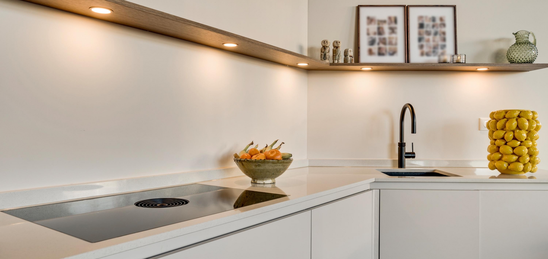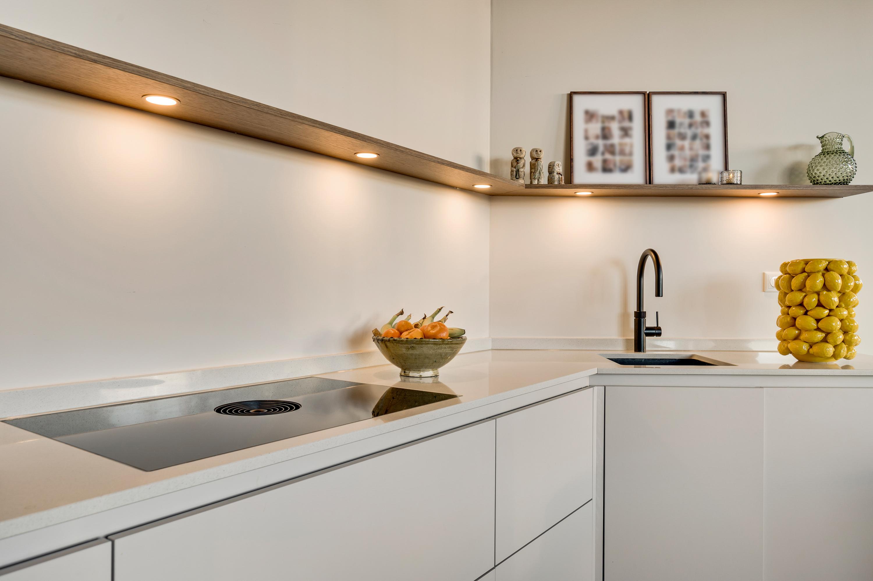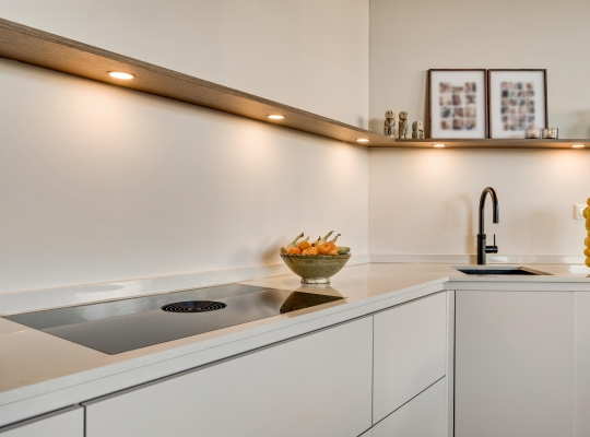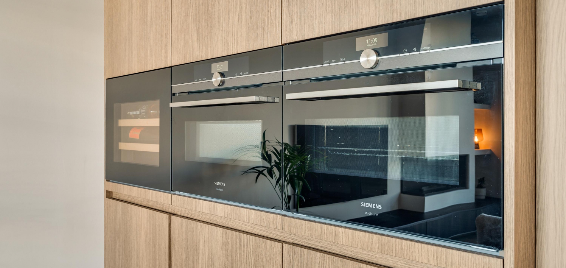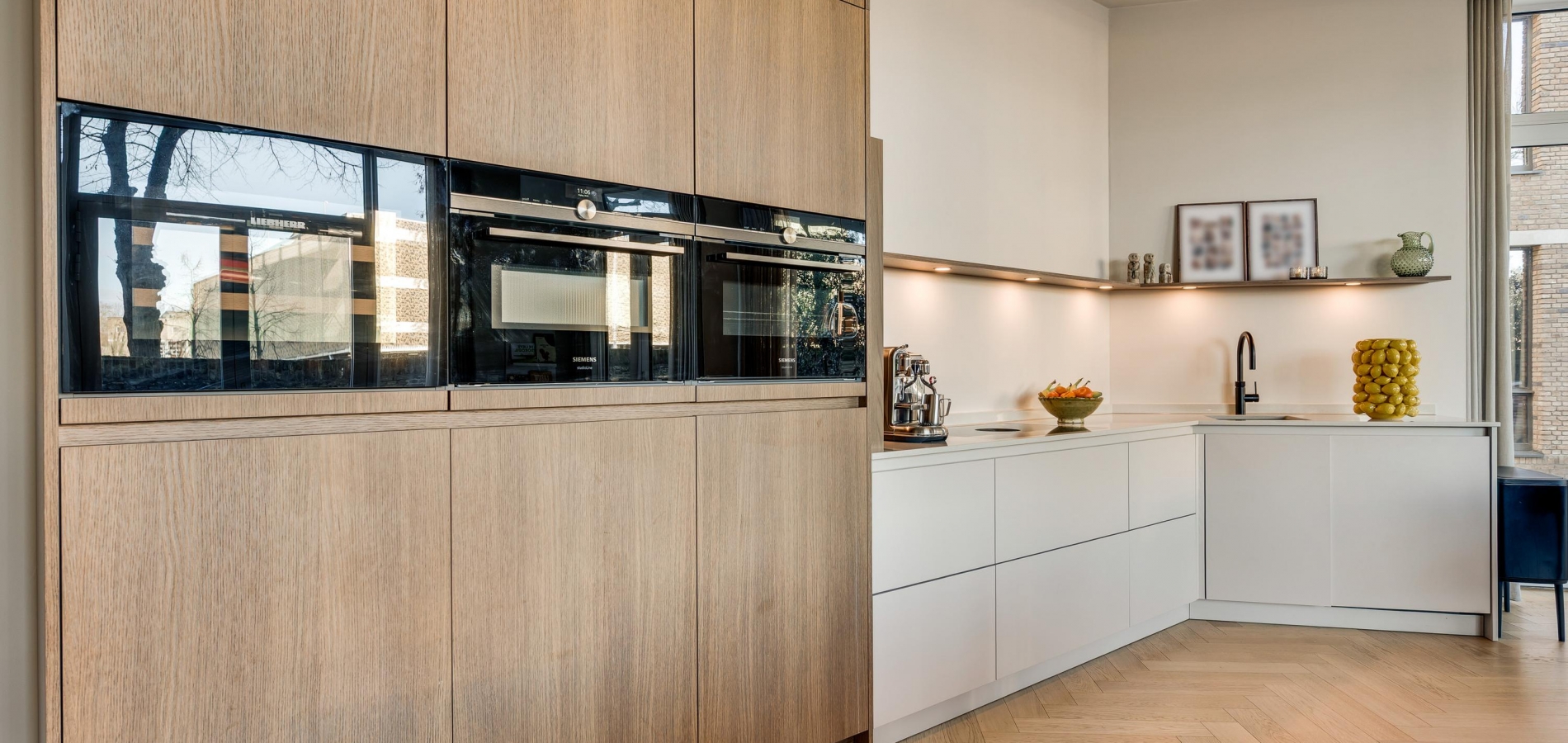 Aan het einde van de hal is de woonkamer met open keuken, met een circa 3 meter hoog plafond en prachtig uitzicht op de privétuin. Er zijn dubbele deuren bij het zit- en het eetgedeelte, plus openslaande deuren naar het overdekte terras. Het wandmeubel met bio-ethanolhaard is maatwerk, net als de keuken in een fraaie kleurstelling. Alle benodigde apparatuur is ingebouwd: een inductie kookplaat met afzuiging, een koelkast, vriezer, Quooker, combi-oven, stoomoven en een wijnkoelkast. De apparatuur is van gerenommeerde merken als Bora, Siemens Studioline, AEG en Liebherr.