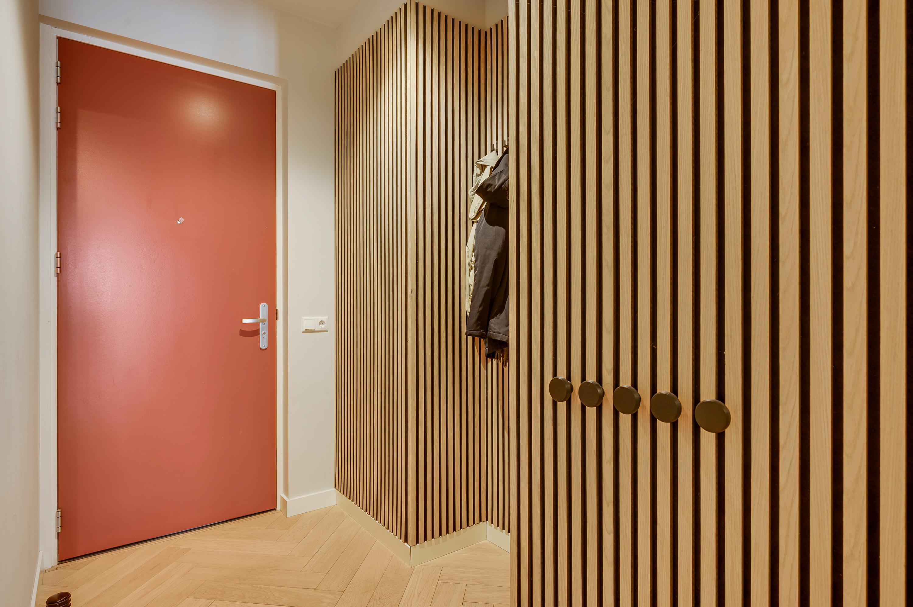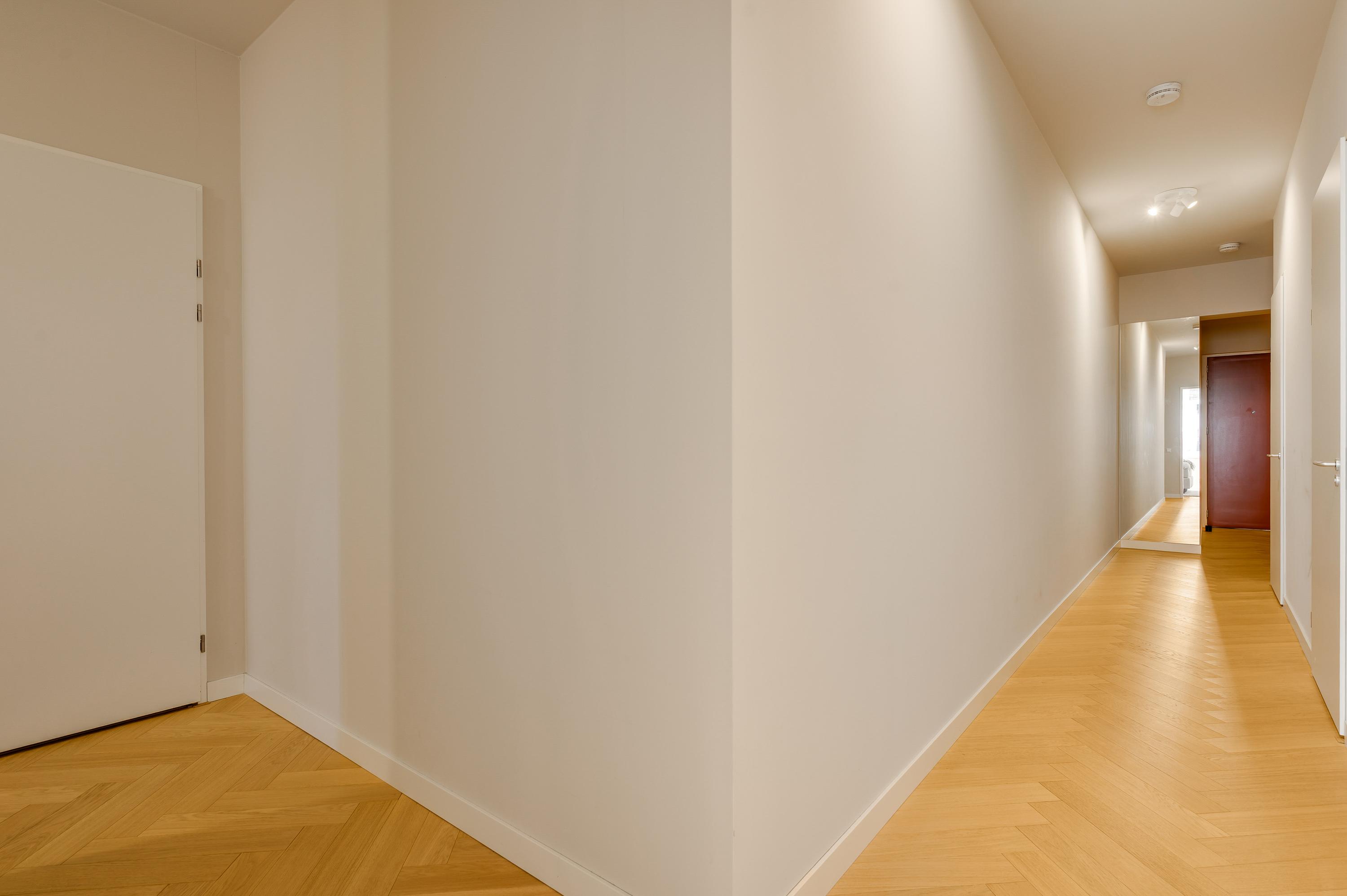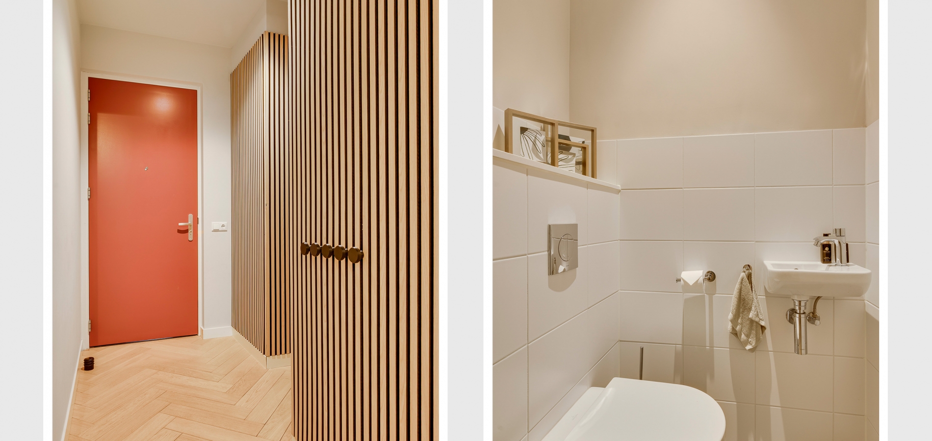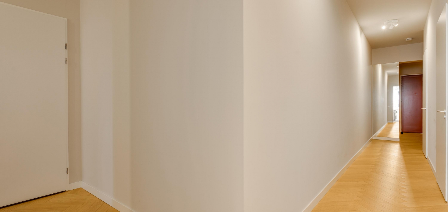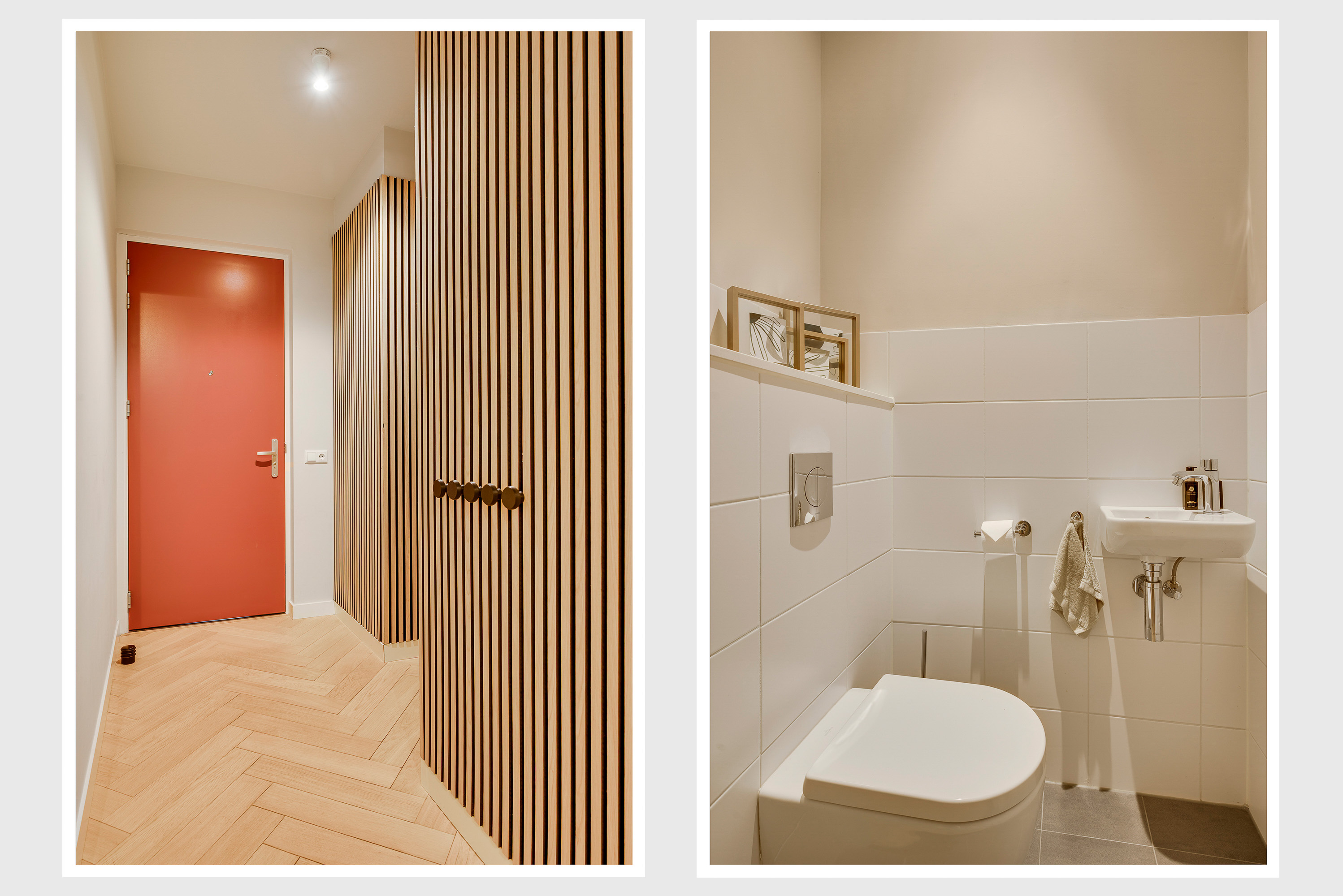 De ontvangsthal is, net als de rest van het appartement, het toonbeeld van sfeer en stijl. Uw oog valt op de visgraat parketvloer en de houten wandafwerking, bij de garderobe en de meterkast. Dankzij het gebruik van neutrale, lichte kleuren en een grote spiegel oogt de hal heel ruimtelijk.