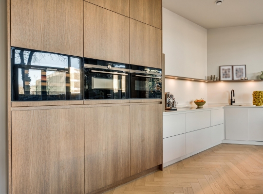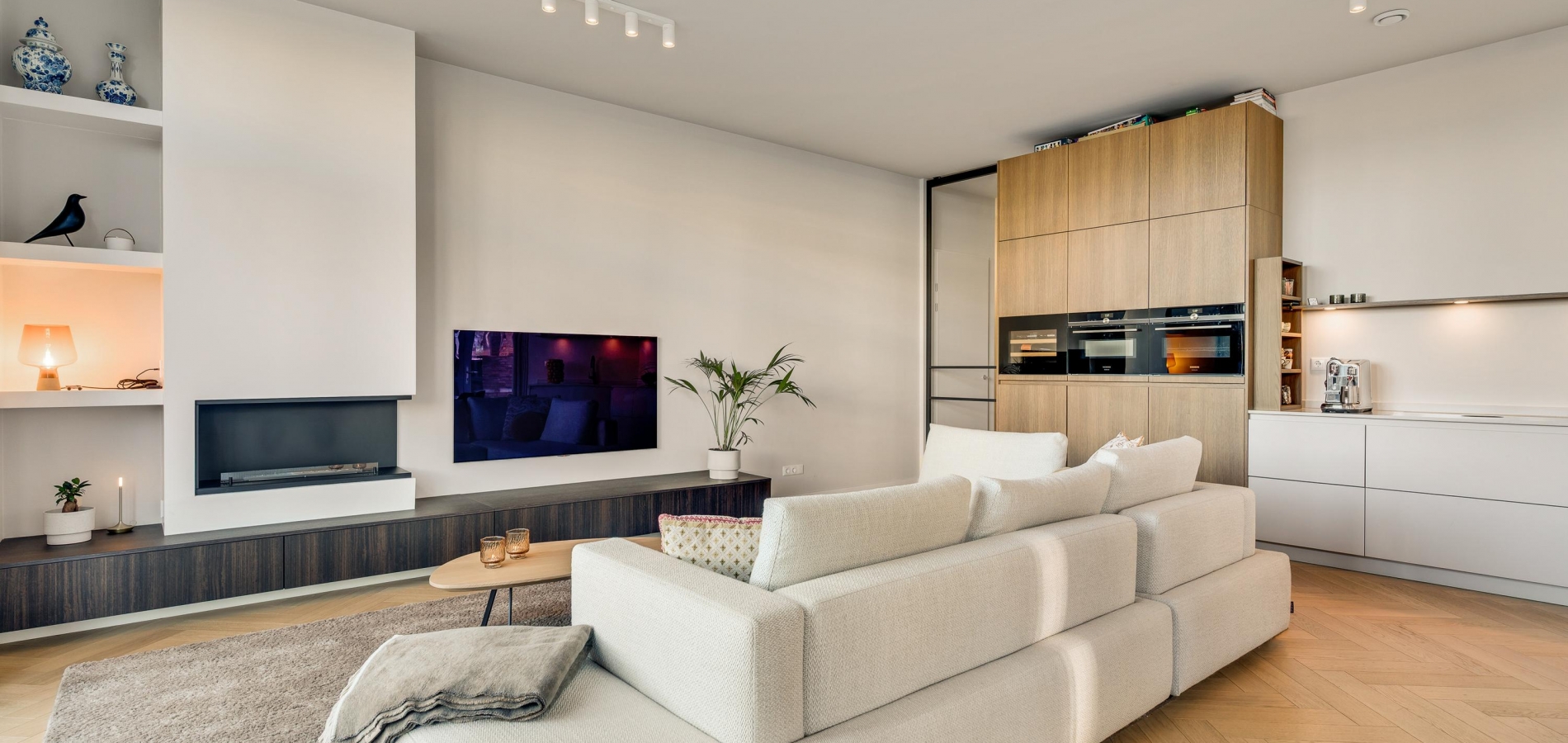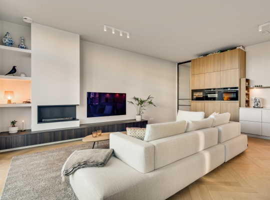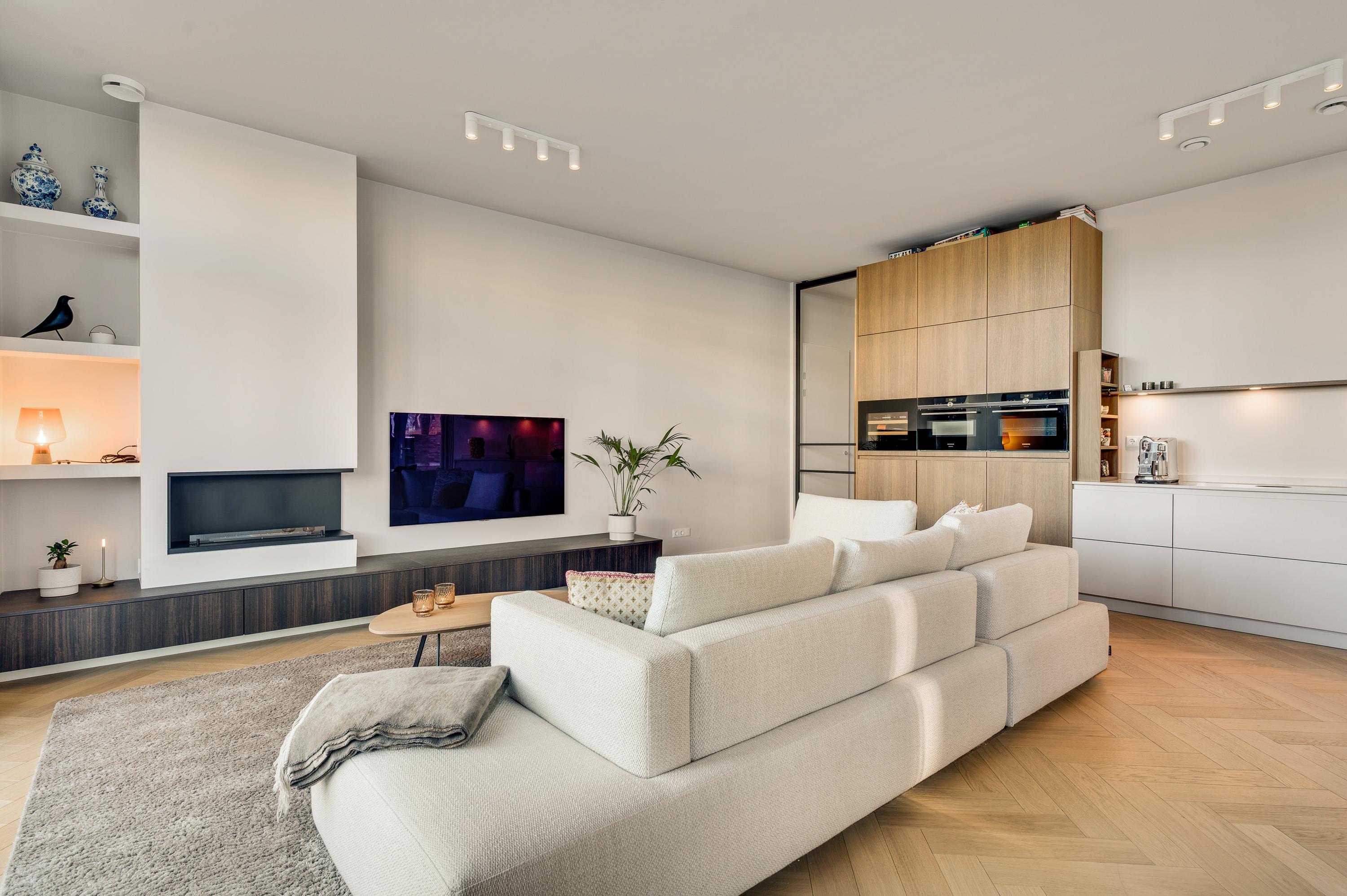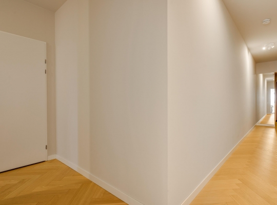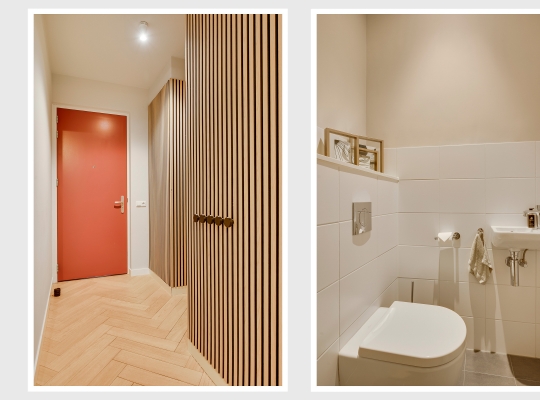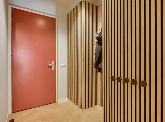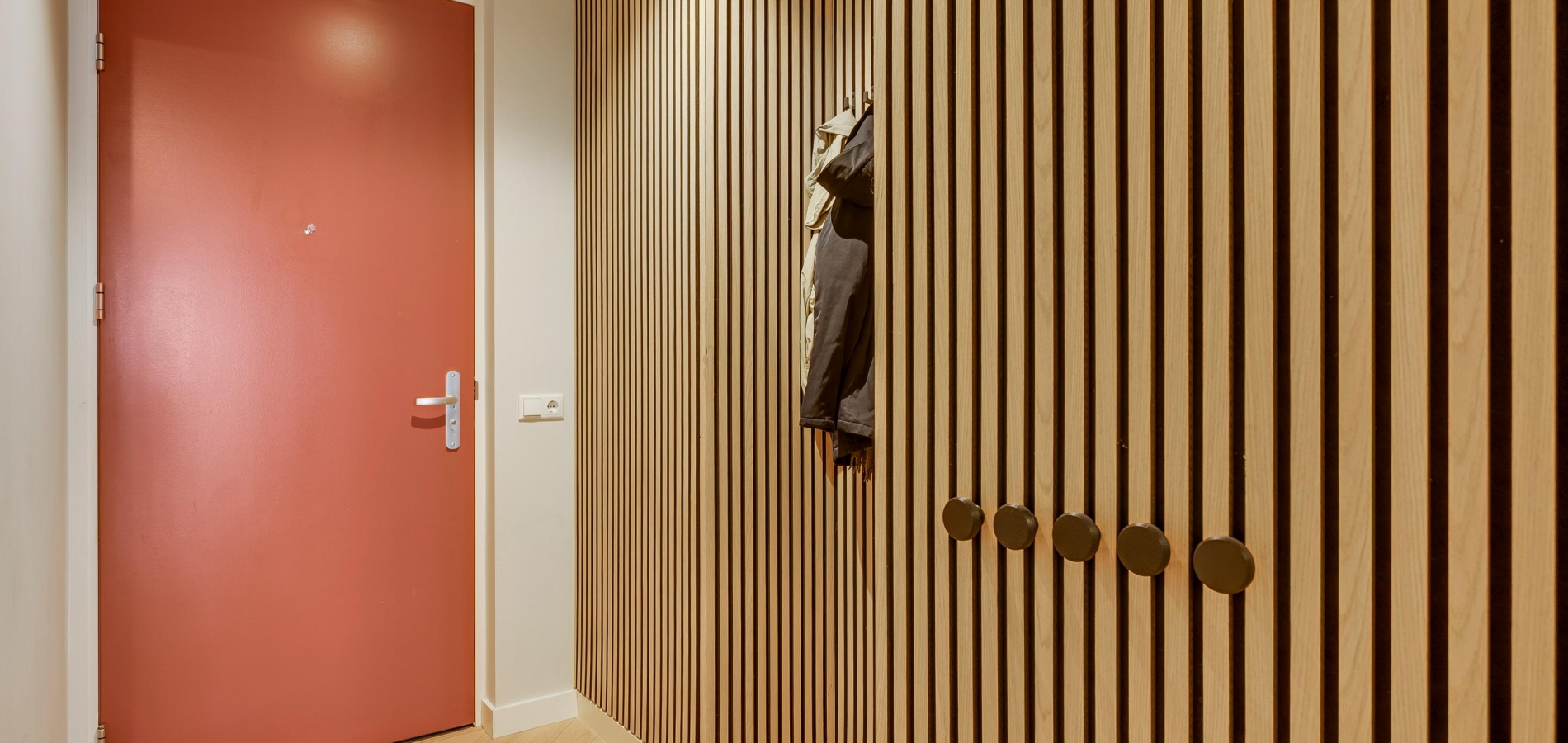 De ontvangsthal is, net als de rest van het appartement, het toonbeeld van sfeer en stijl. Uw oog valt op de visgraat parketvloer en de houten wandafwerking, bij de garderobe en de meterkast. Dankzij het gebruik van neutrale, lichte kleuren en een grote spiegel oogt de hal heel ruimtelijk.