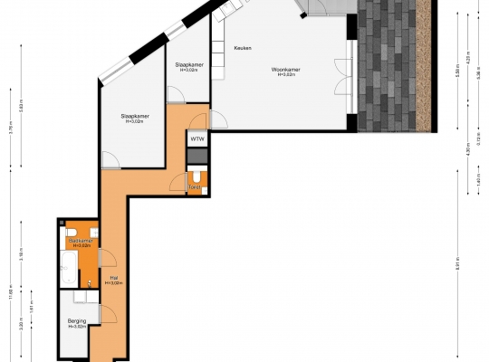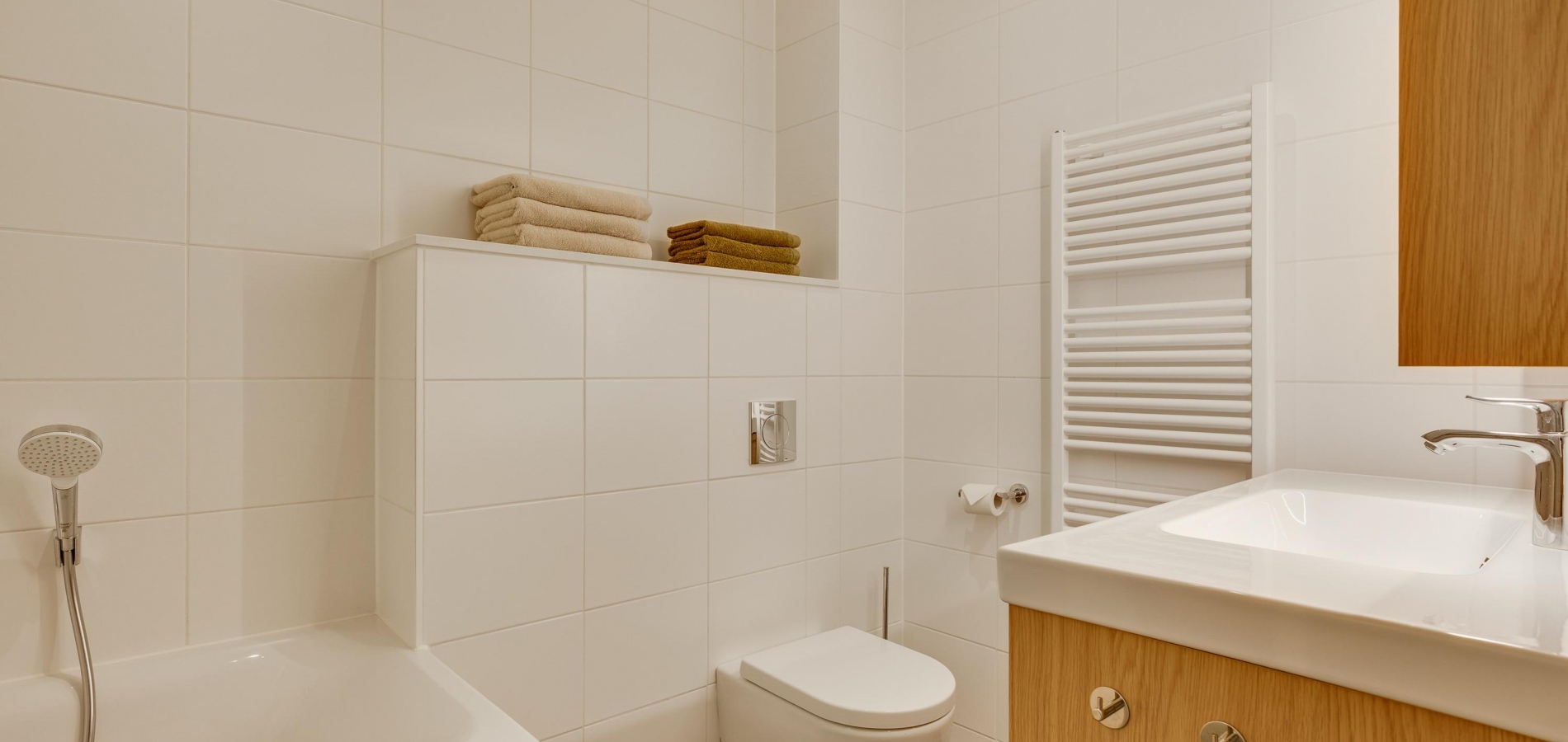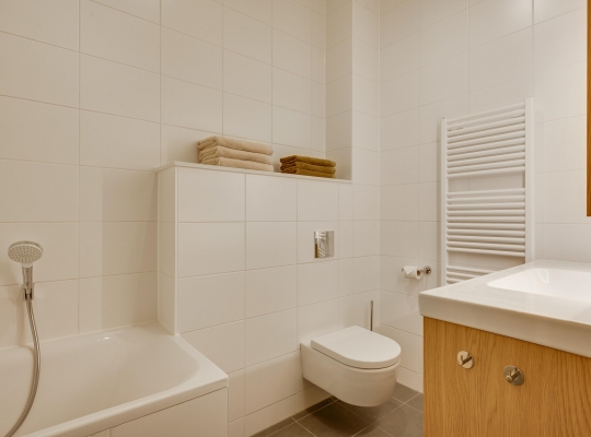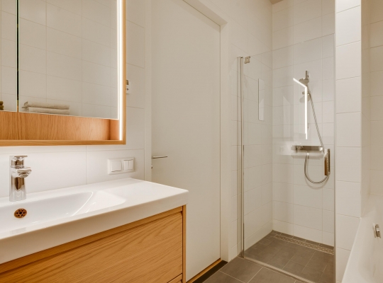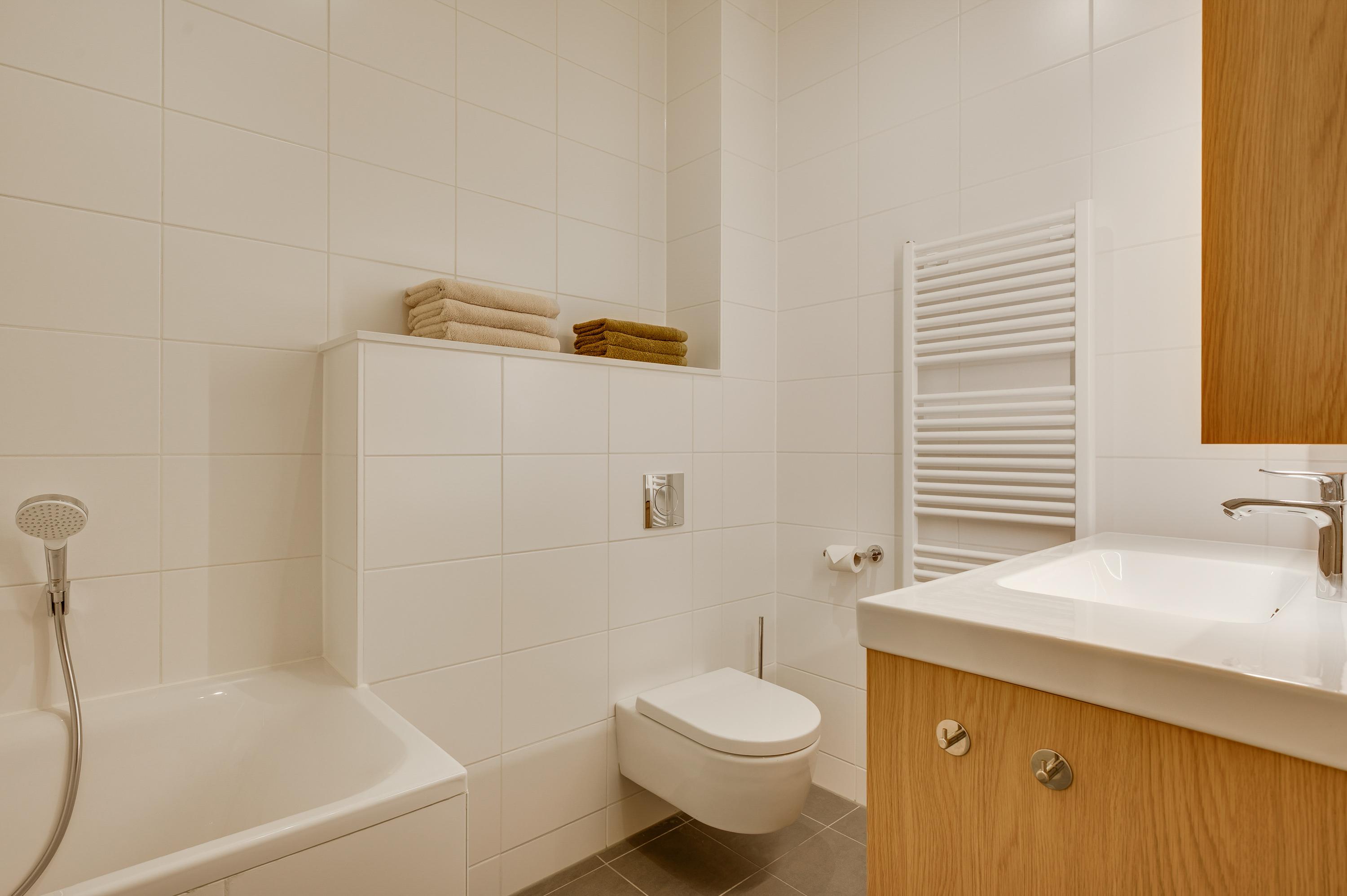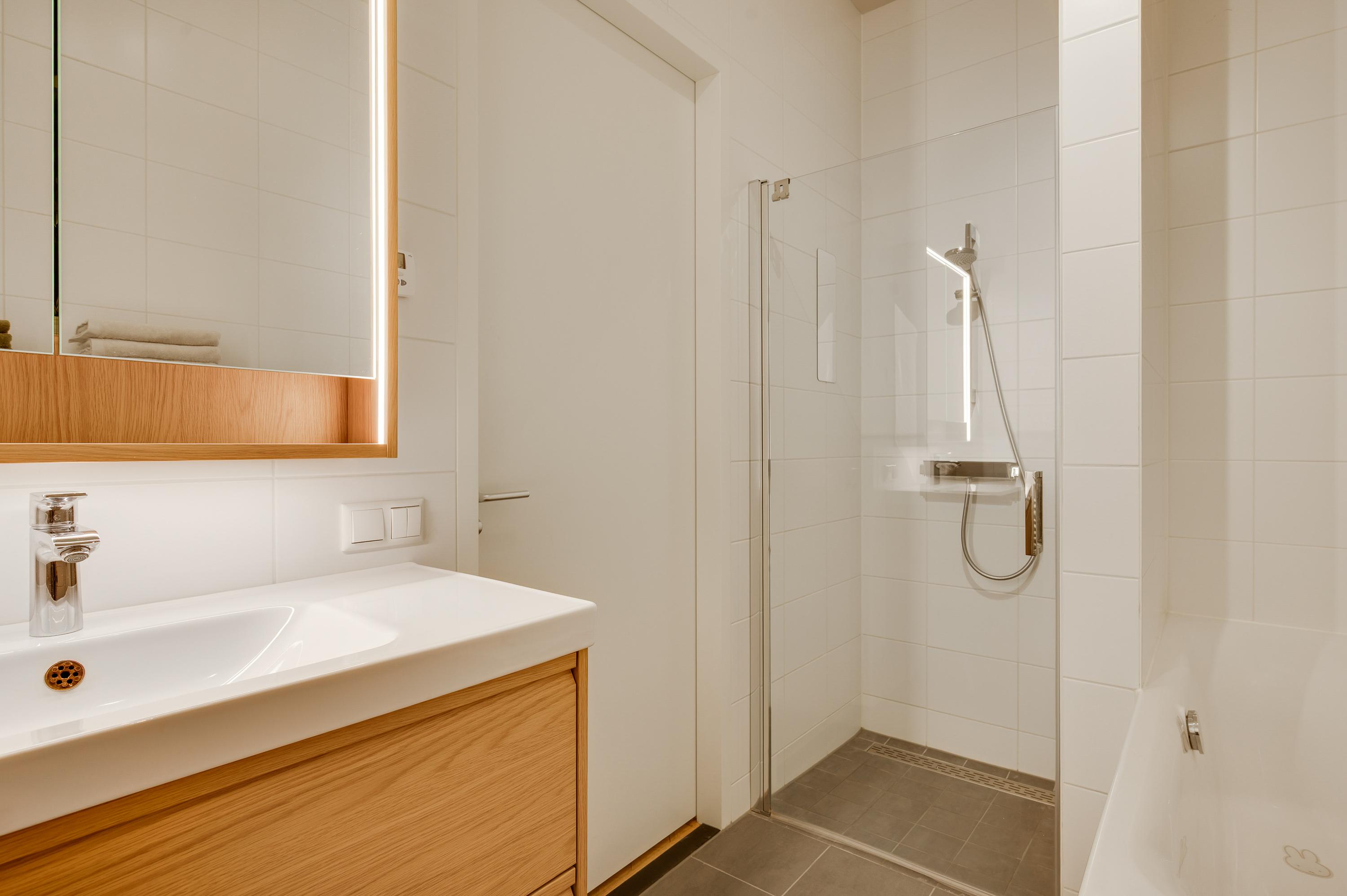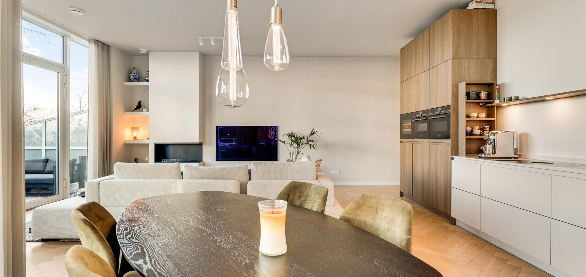 De ontvangsthal is, net als de rest van het appartement, het toonbeeld van sfeer en stijl. Uw oog valt op de visgraat parketvloer en de houten wandafwerking, bij de garderobe en de meterkast. Dankzij het gebruik van neutrale, lichte kleuren en een grote spiegel oogt de hal heel ruimtelijk.