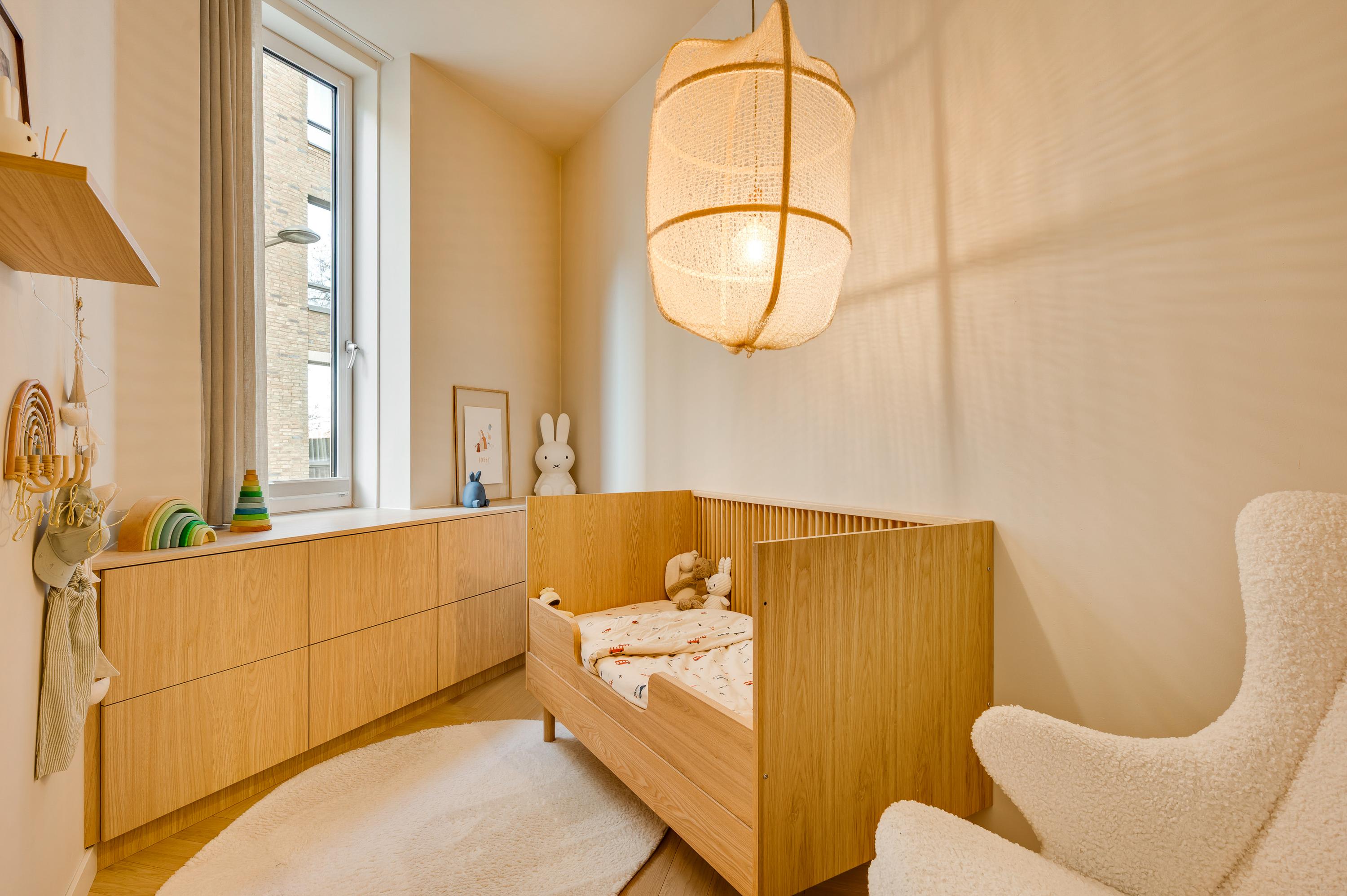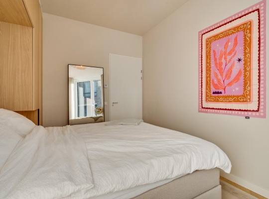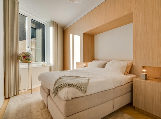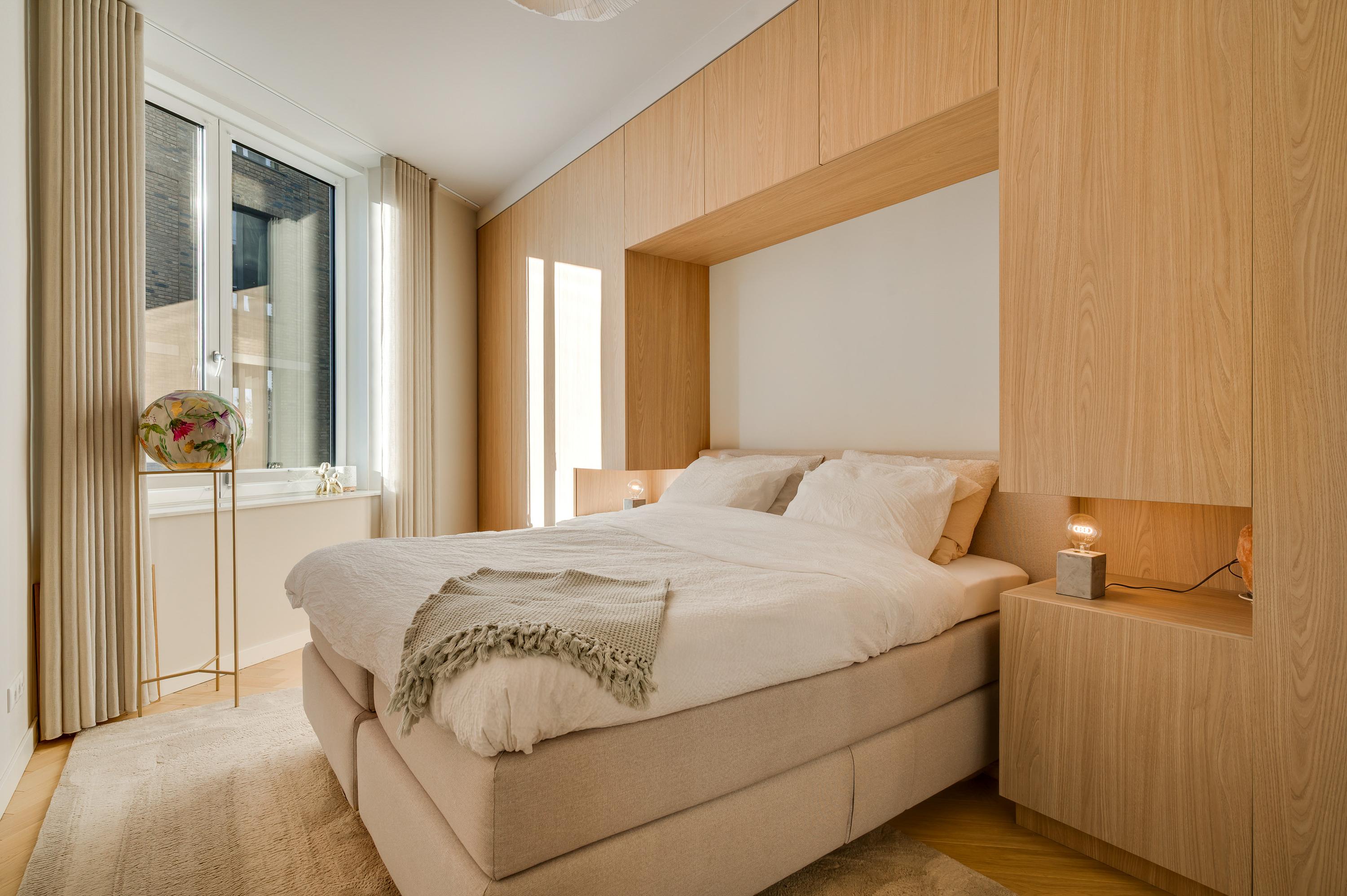 Dit luxe appartement heeft twee slaapkamers, beiden met veel lichtinval en een hoog plafond. Slaapkamer I is ingericht als master bedroom en slaapkamer II als kinderkamer. In de master bedroom is de ruimte, dankzij de maatwerk kastenwand rondom het bed, optimaal benut. Ook in de kinderkamer ziet u maatwerk kasten, onder het raam.