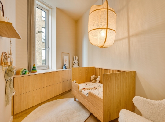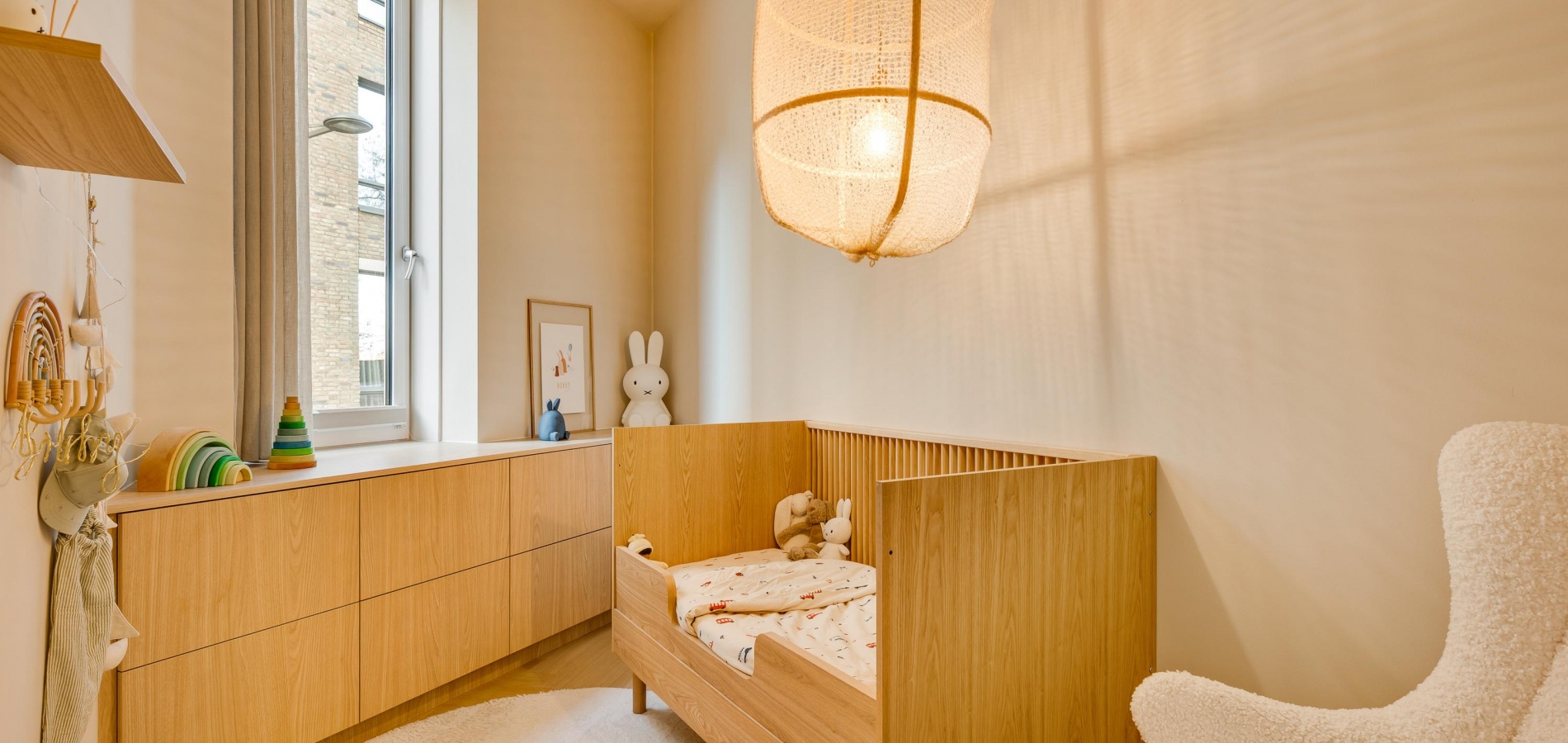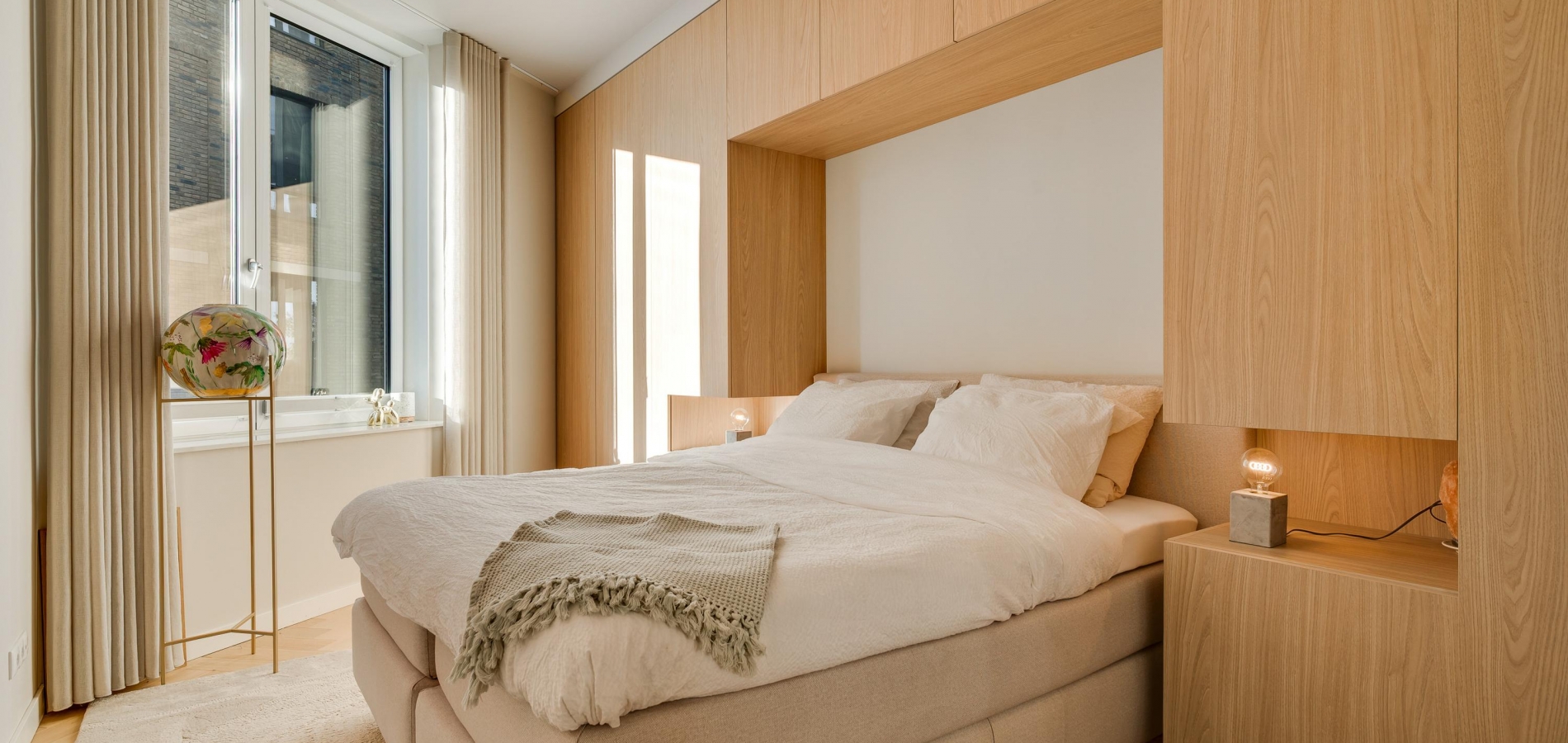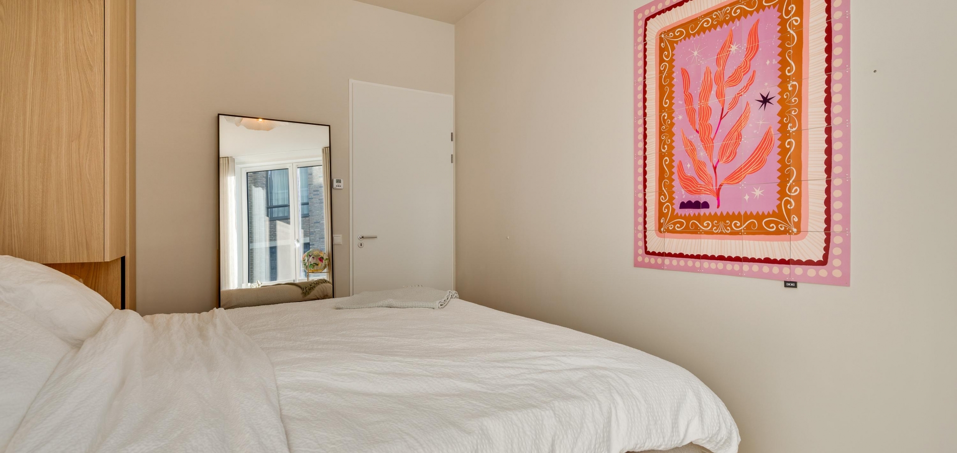 Dit luxe appartement heeft twee slaapkamers, beiden met veel lichtinval en een hoog plafond. Slaapkamer I is ingericht als master bedroom en slaapkamer II als kinderkamer. In de master bedroom is de ruimte, dankzij de maatwerk kastenwand rondom het bed, optimaal benut. Ook in de kinderkamer ziet u maatwerk kasten, onder het raam.