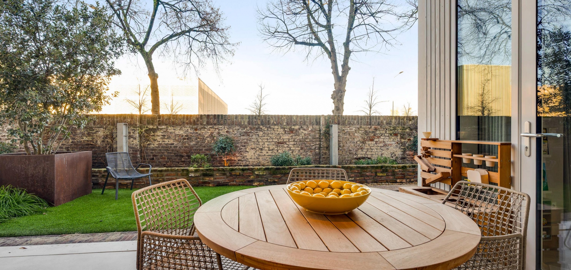 Fraaie stadstuin met een zonneterras en een overdekt terras