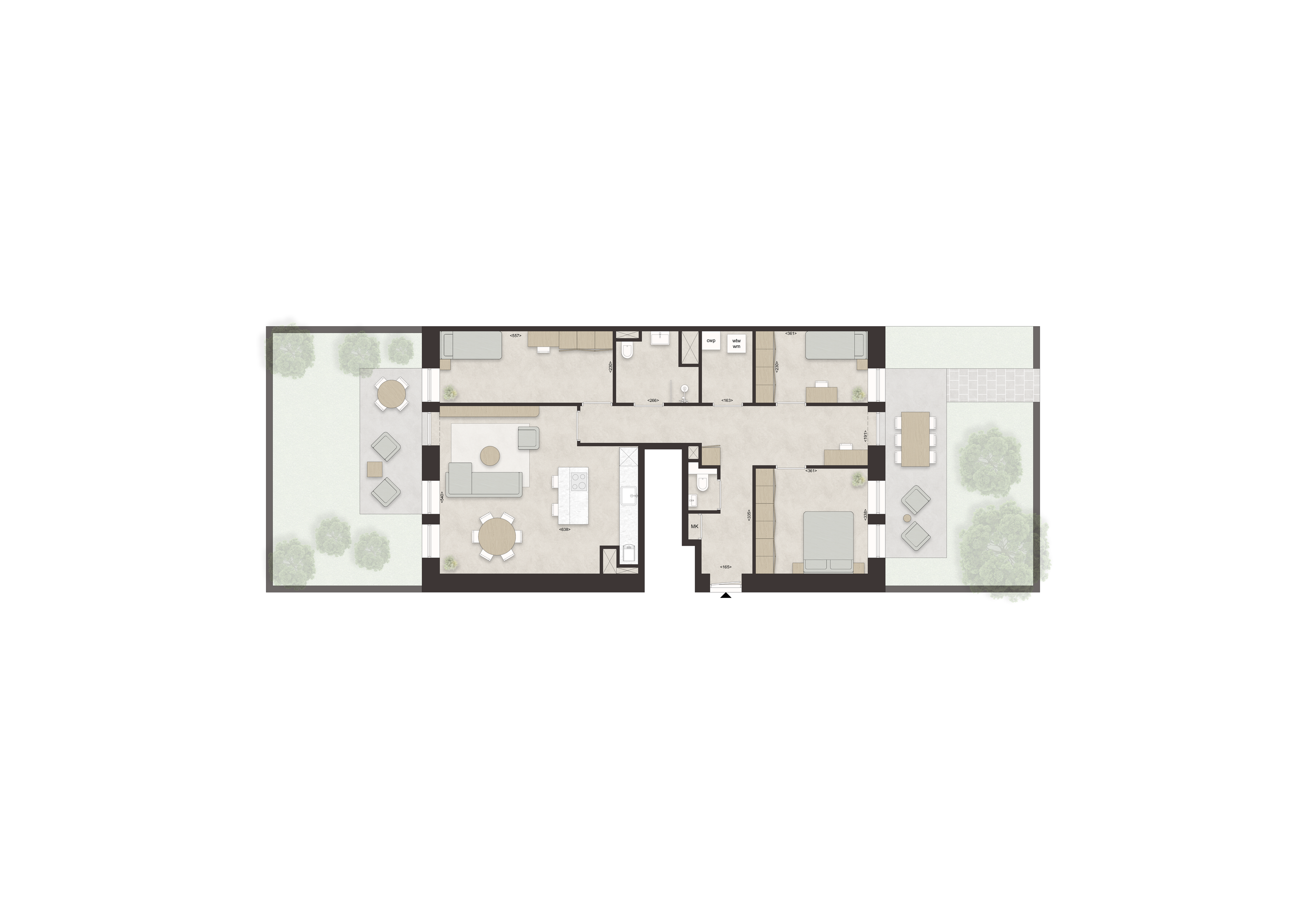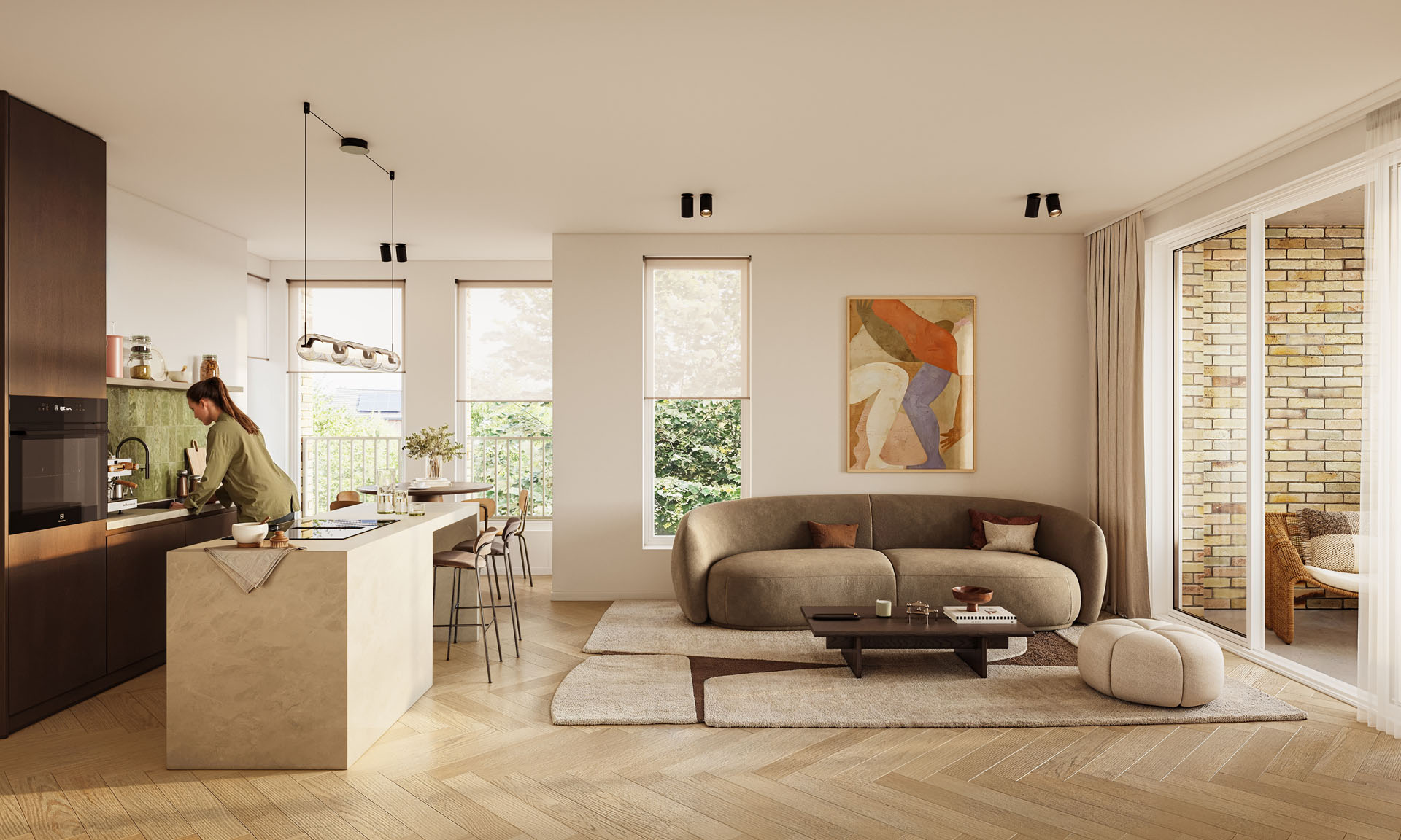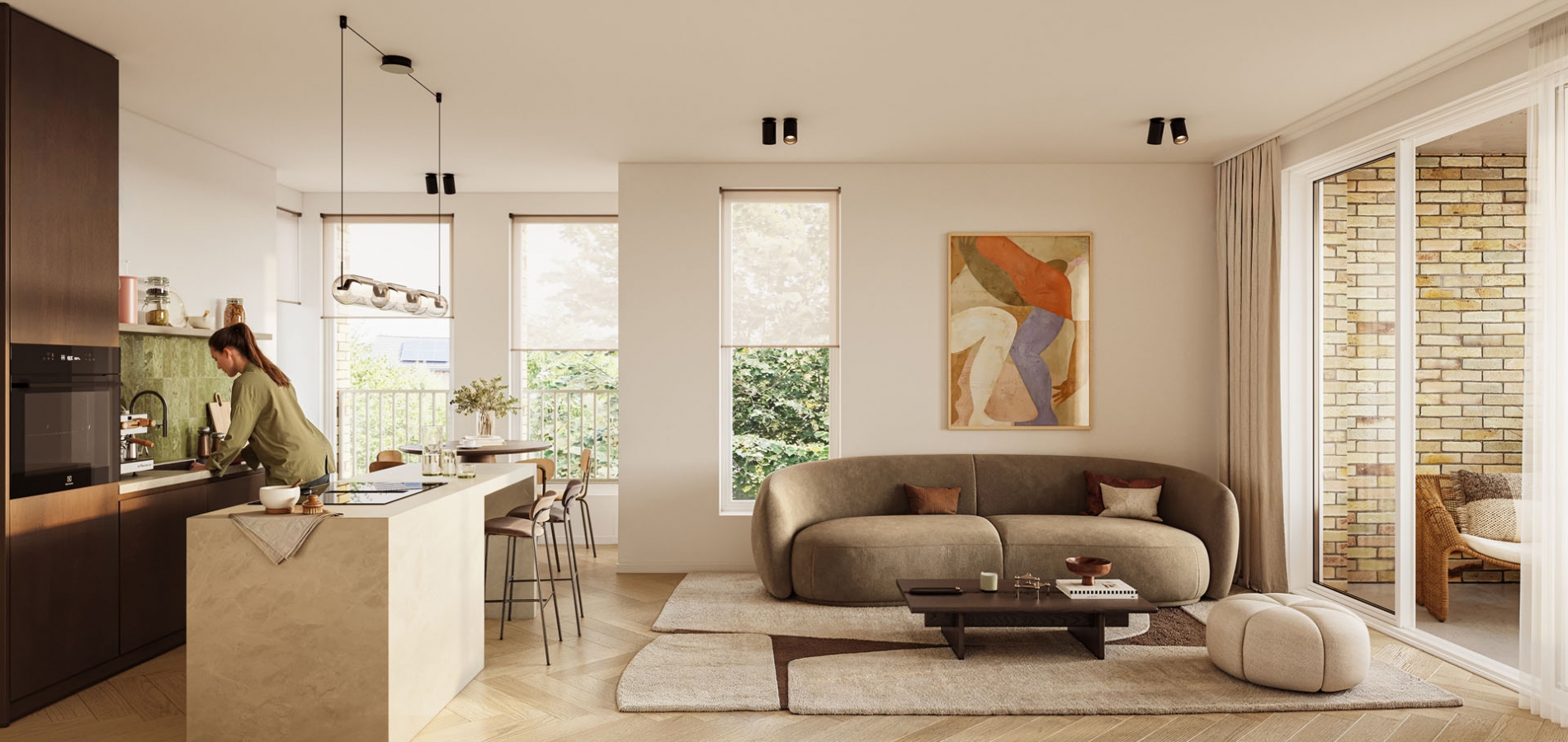 COUR is ontworpen met duurzaamheid en toekomstbestendigheid als uitgangspunt. De woningen zijn energiezuinig en kierdicht, waardoor warmte binnen blijft en het energieverbruik laag is. Dankzij de levensloopbestendige indeling kun je er wonen in elke fase van je leven: als jong stel, met een kind, of op latere leeftijd. De groene binnentuin speelt een dubbele rol: regenwater wordt er opgevangen en de vele bomen zorgen voor natuurlijke verkoeling en schaduw, zowel binnen de tuin als rondom het project. De groene omgeving die bijdraagt aan biodiversiteit én woonkwaliteit. COUR combineert modern woongenot met verantwoordelijkheid voor morgen.
