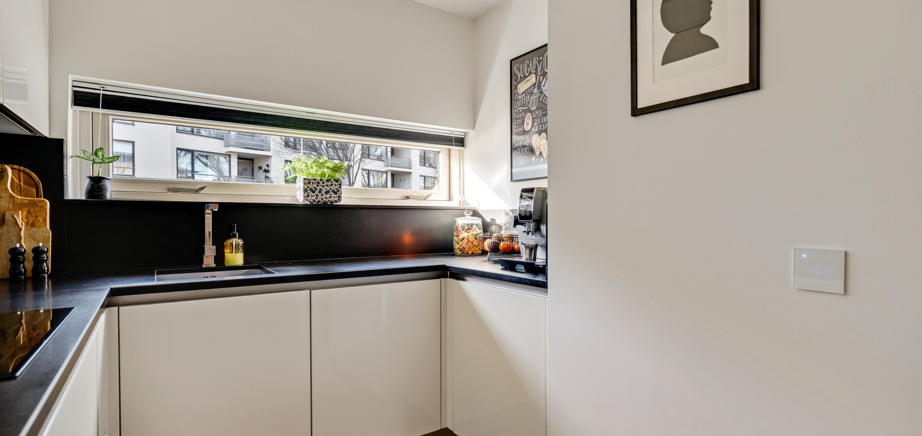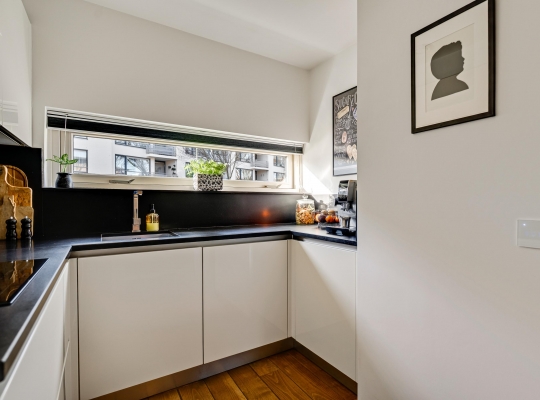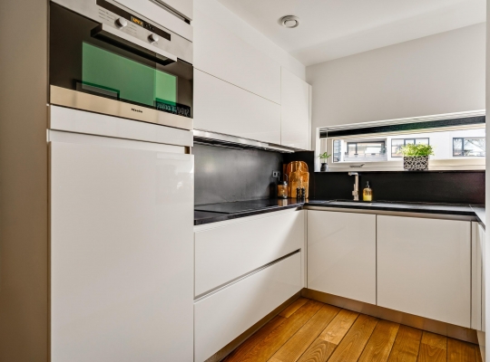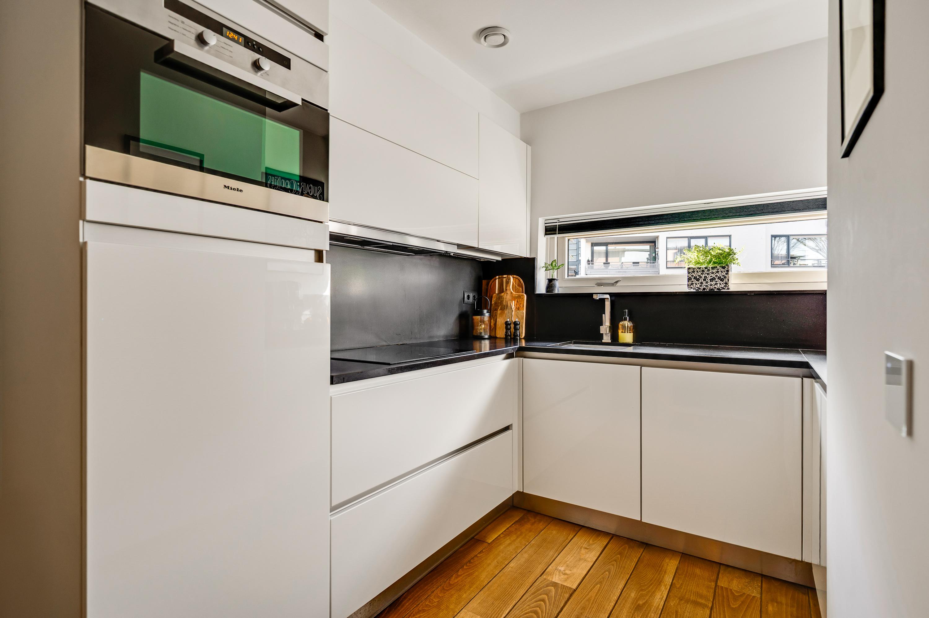 Het eetgedeelte grenst aan de keuken (circa 2,15 x 2,43), waar een lichte U-opstelling staat. Het aanrechtblad en de achterwand zijn uitgevoerd in stijlvol zwart composietsteen en allen benodigde apparatuur van AEG, Miele en Bosch is ingebouwd: een inductie kookplaat, afzuigkap combi-oven en een koelkast.