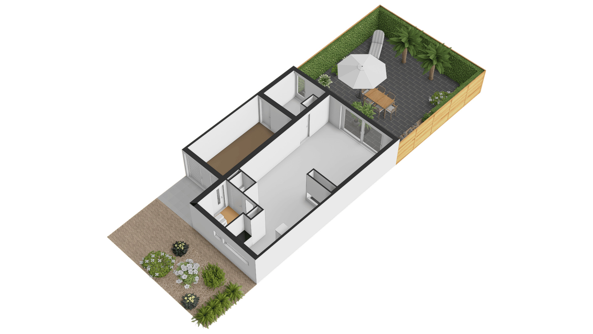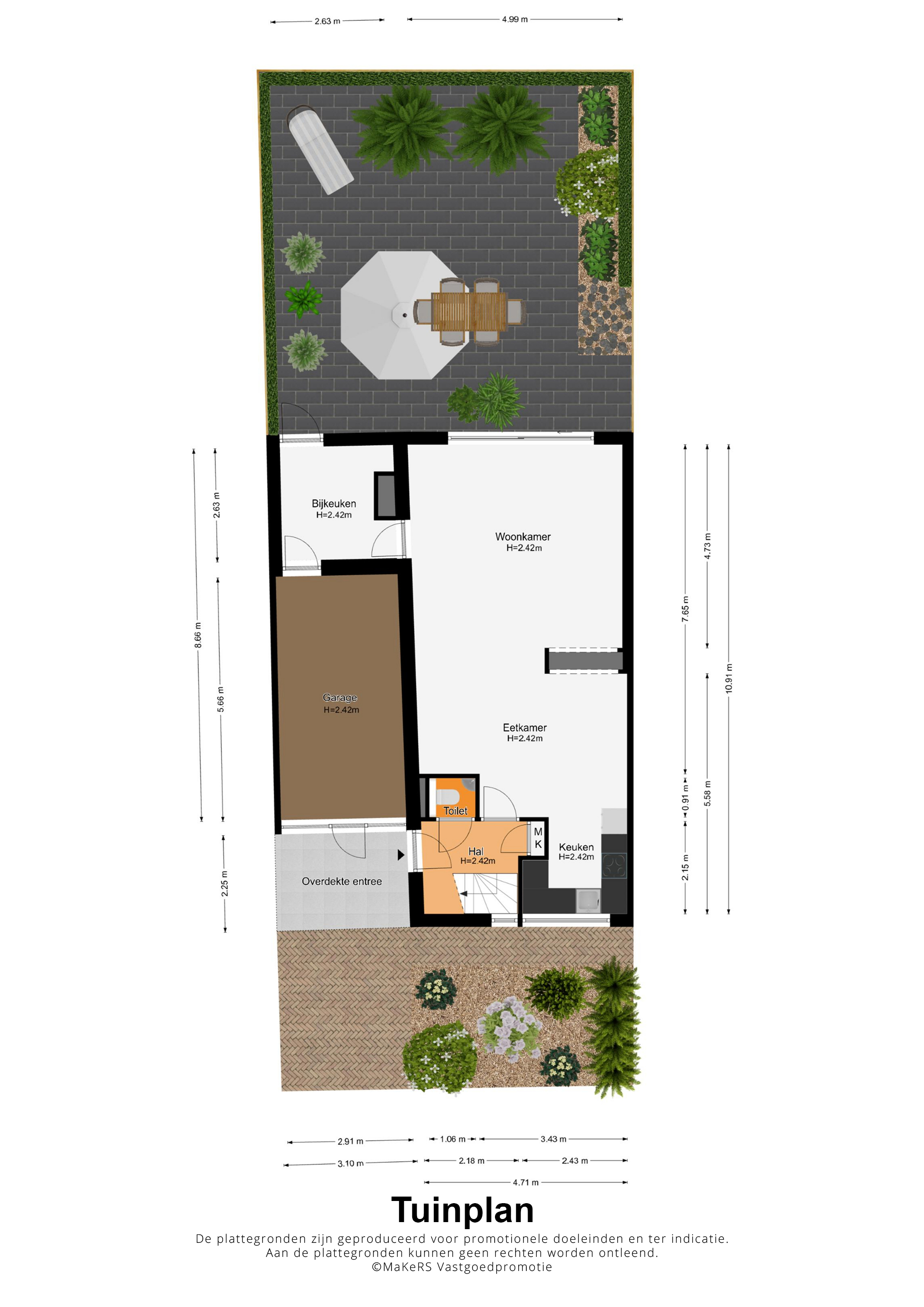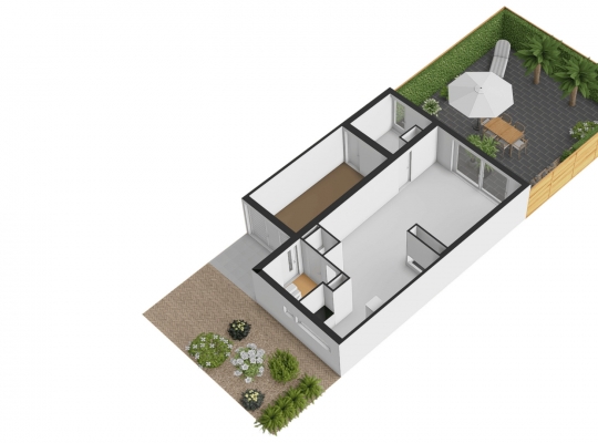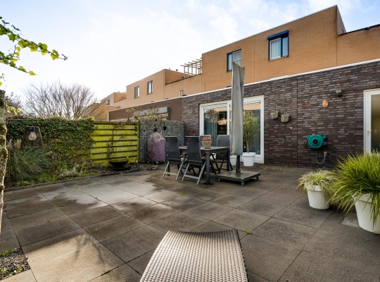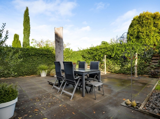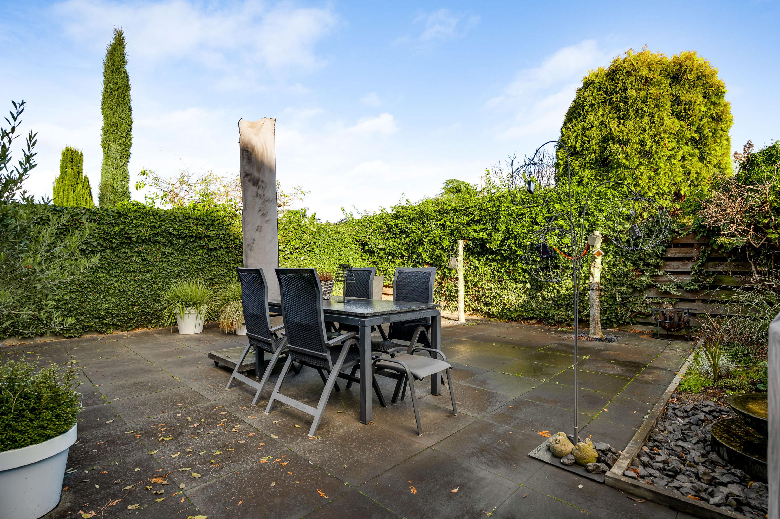 De royale, goed onderhouden achtertuin is gesitueerd op het oosten. Grote tegels maken de tuin optisch groter en een groot deel van de erfafscheiding is begroeid. De tuin is volledig betegeld met hardsteen (basalt). Ook voor de voortuin heeft u geen groene vingers nodig, zo hoeft er bijvoorbeeld geen grasmaaier in de verhuiswagen te staan.