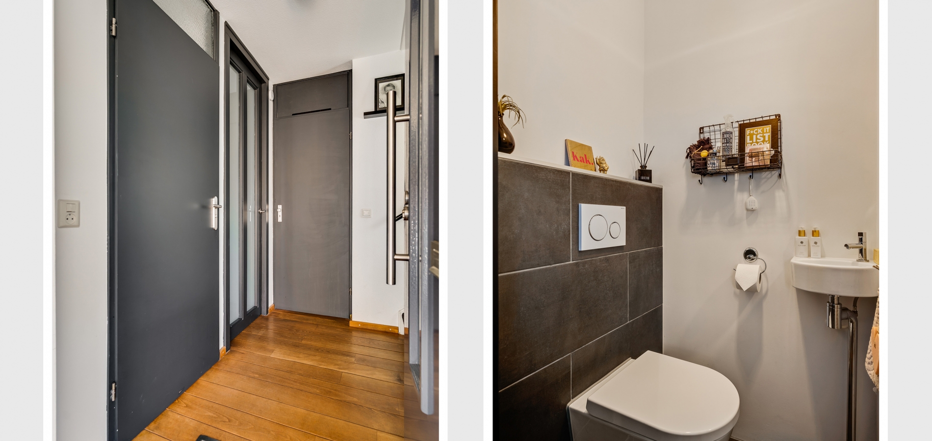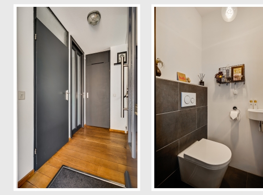 Parkeren op eigen terrein, dat is een goed begin. Bij de oprit is de overdekte entree, met toegang tot de hal (circa 2,15 x 2,18). Hier zijn de meterkast, trapopgang en de fraaie toiletruimte (in 2024 vernieuwd). Onder de trap is ruimte voor een garderobe en de houten vloer ligt op bijna de hele begane grond.