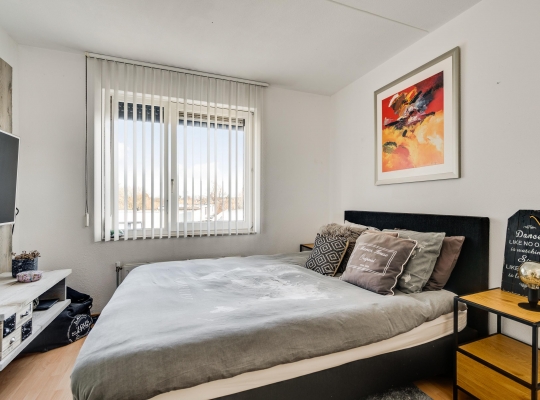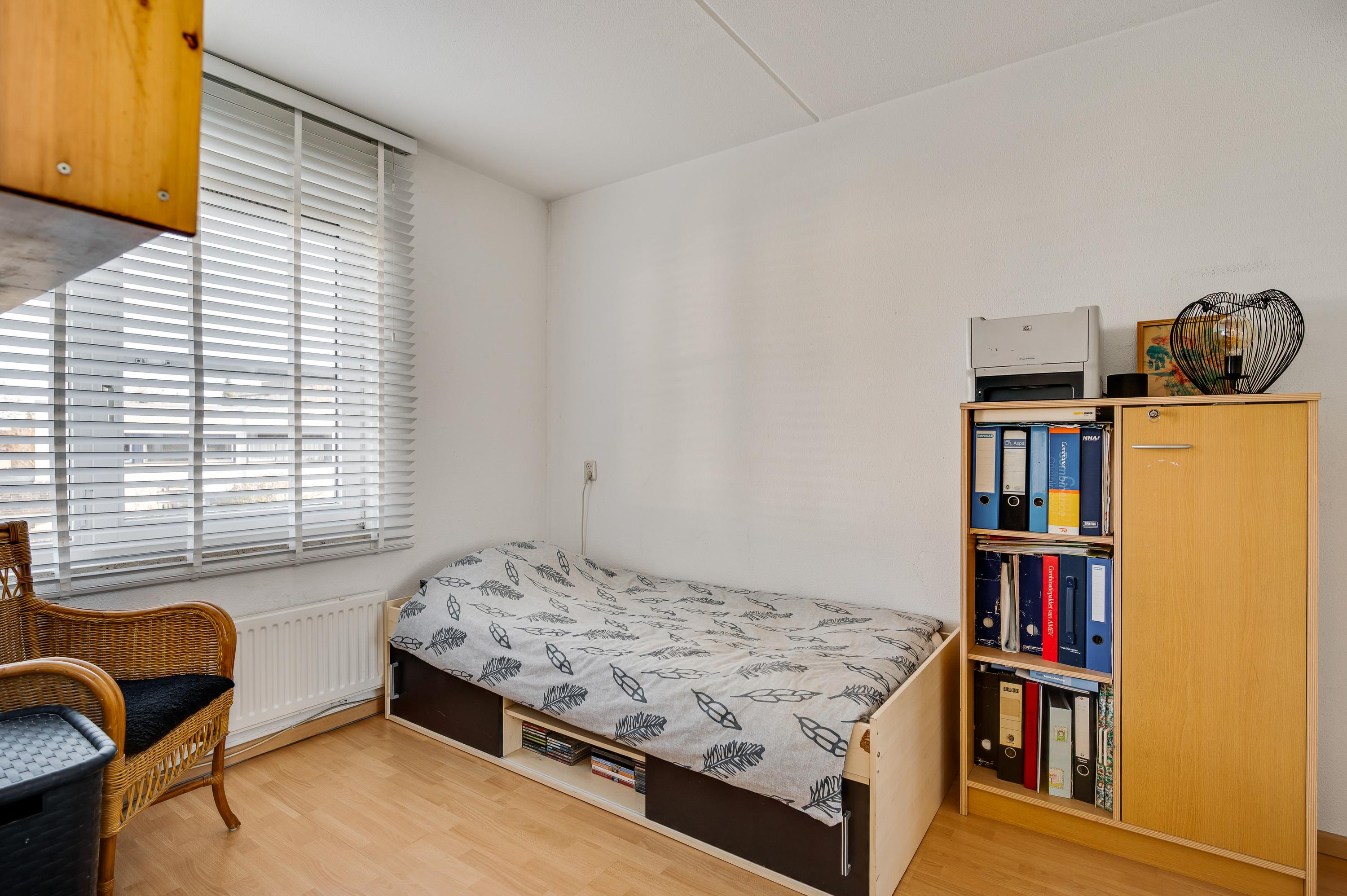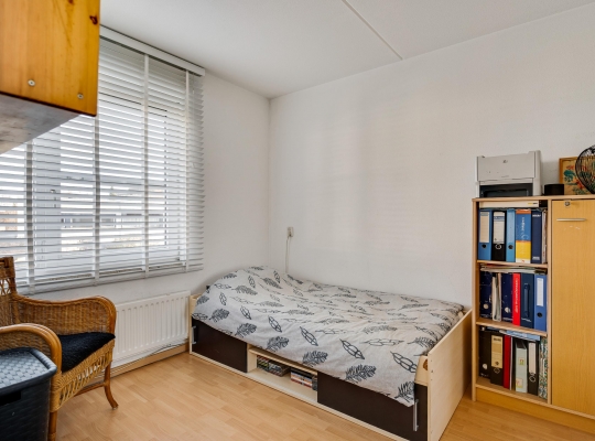 Vanaf de overloop is er onder andere toegang tot slaapkamer III (circa 3,86 x 3,04/2,47). Deze kamer heeft lichtinval aan twee zijden en er ligt, net als op de overloop, laminaat op de vloer. Op deze verdieping is ook een berging (circa 1,86 x 1,74) met de opstelling van de HR-ketel (Intergas, 2023, huur). Ook de wasmachine, droger, strijkplank en wasmanden kunnen hier staan.