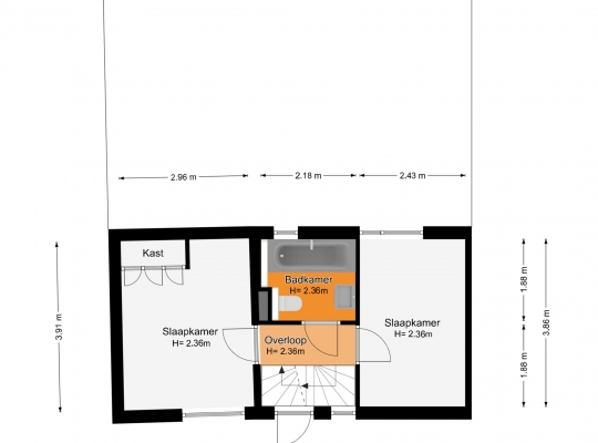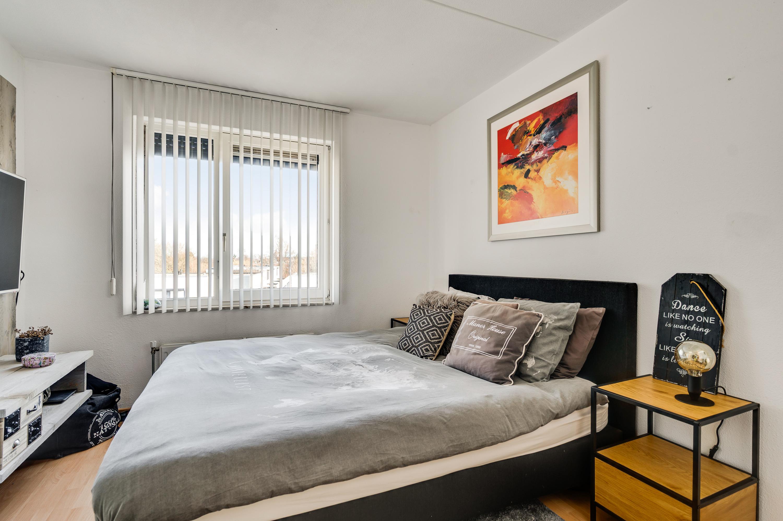 Slaapkamer I (circa 3,91 x 2,96) is de master bedroom, met een airco (geplaatst in 2025). Aan de andere zijde van de overloop is slaapkamer II (circa 3,86 x 2,43). De moderne, fraaie badkamer is ingedeeld met een ligbad en een regendouche, een toilet en een wastafelmeubel (vernieuwd in april 2025).