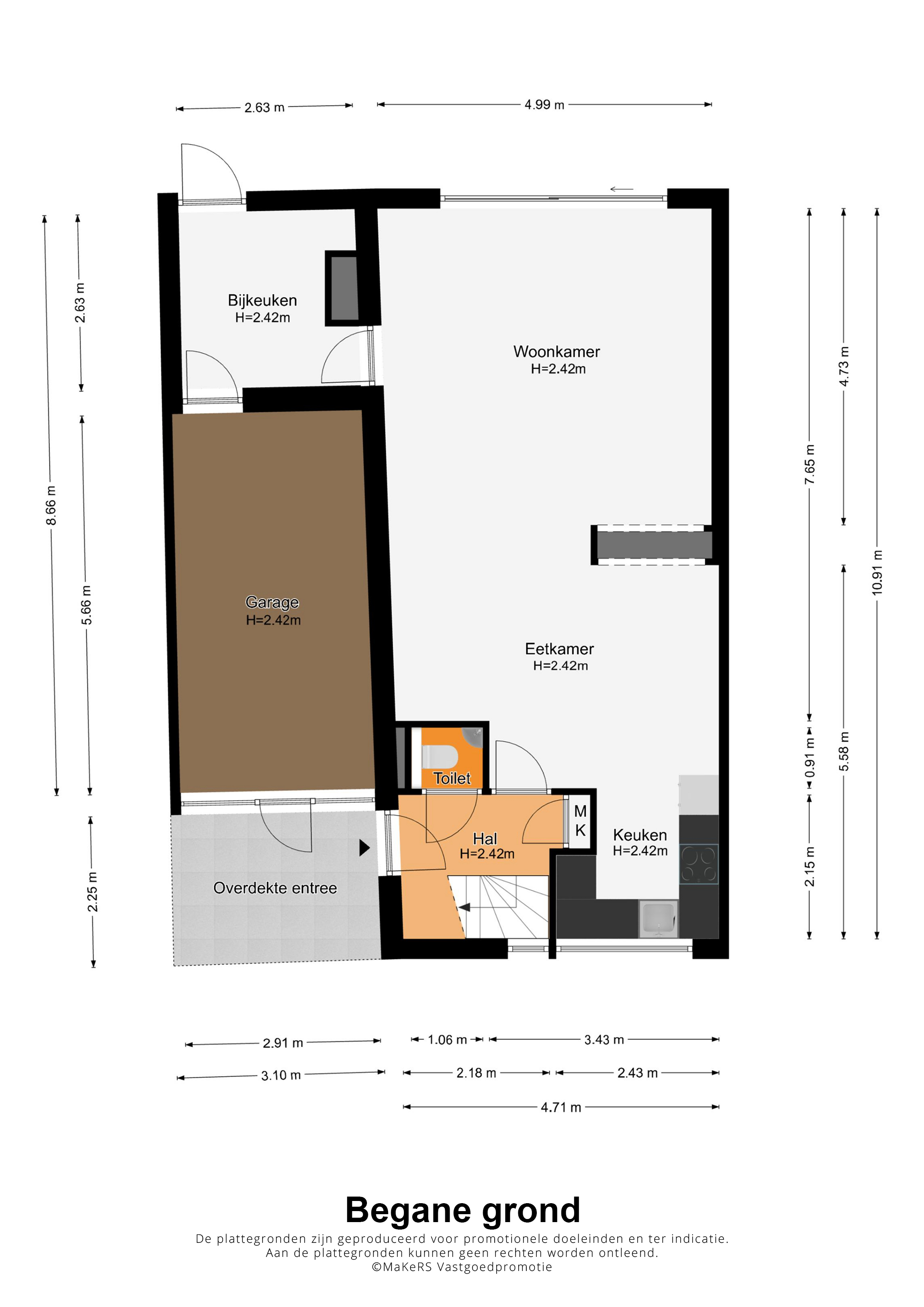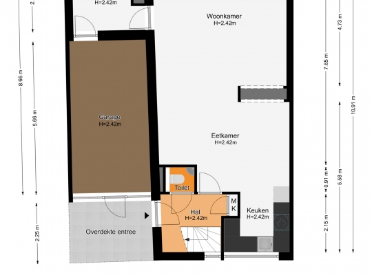Vanuit de woonkamer is er toegang tot een multifunctionele ruimte (circa 2,63 x 2,63), die thans in gebruik is als berging. Een invulling als thuiswerkplek of speelplek van de kinderen is mogelijk. Aansluitend is de inpandig te bereiken garage (circa 5,66 x 2,91/2,63) voor de (bak)fiets, scooter en andere spullen.