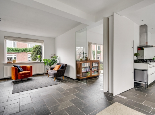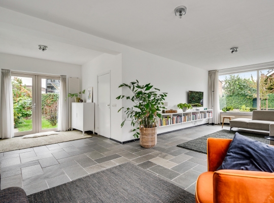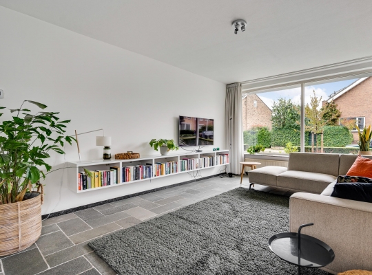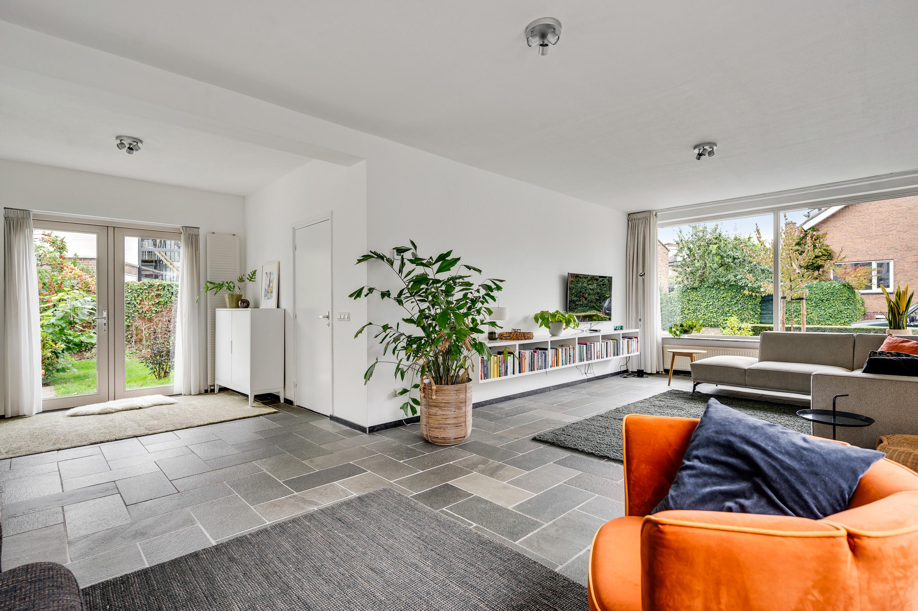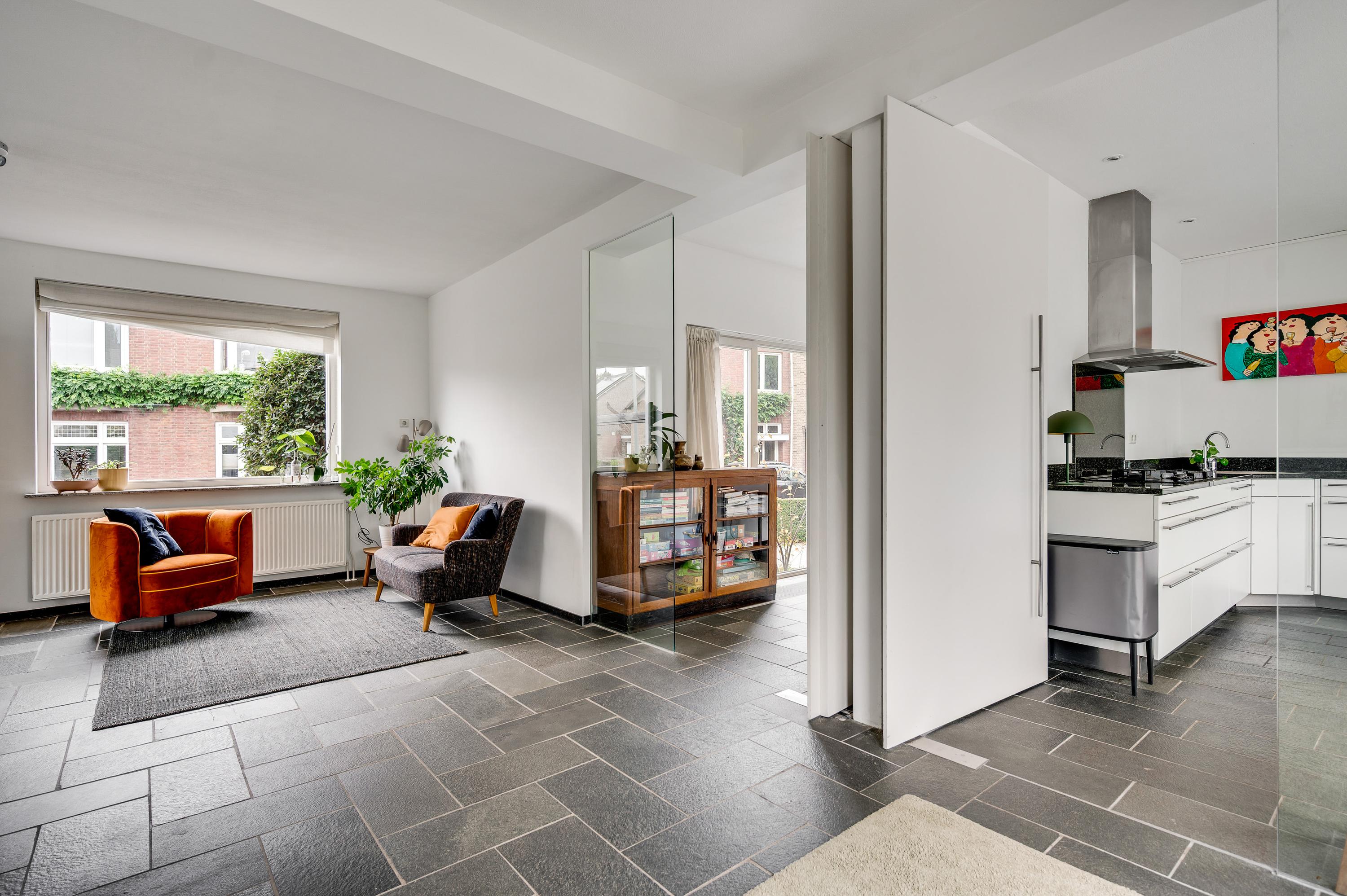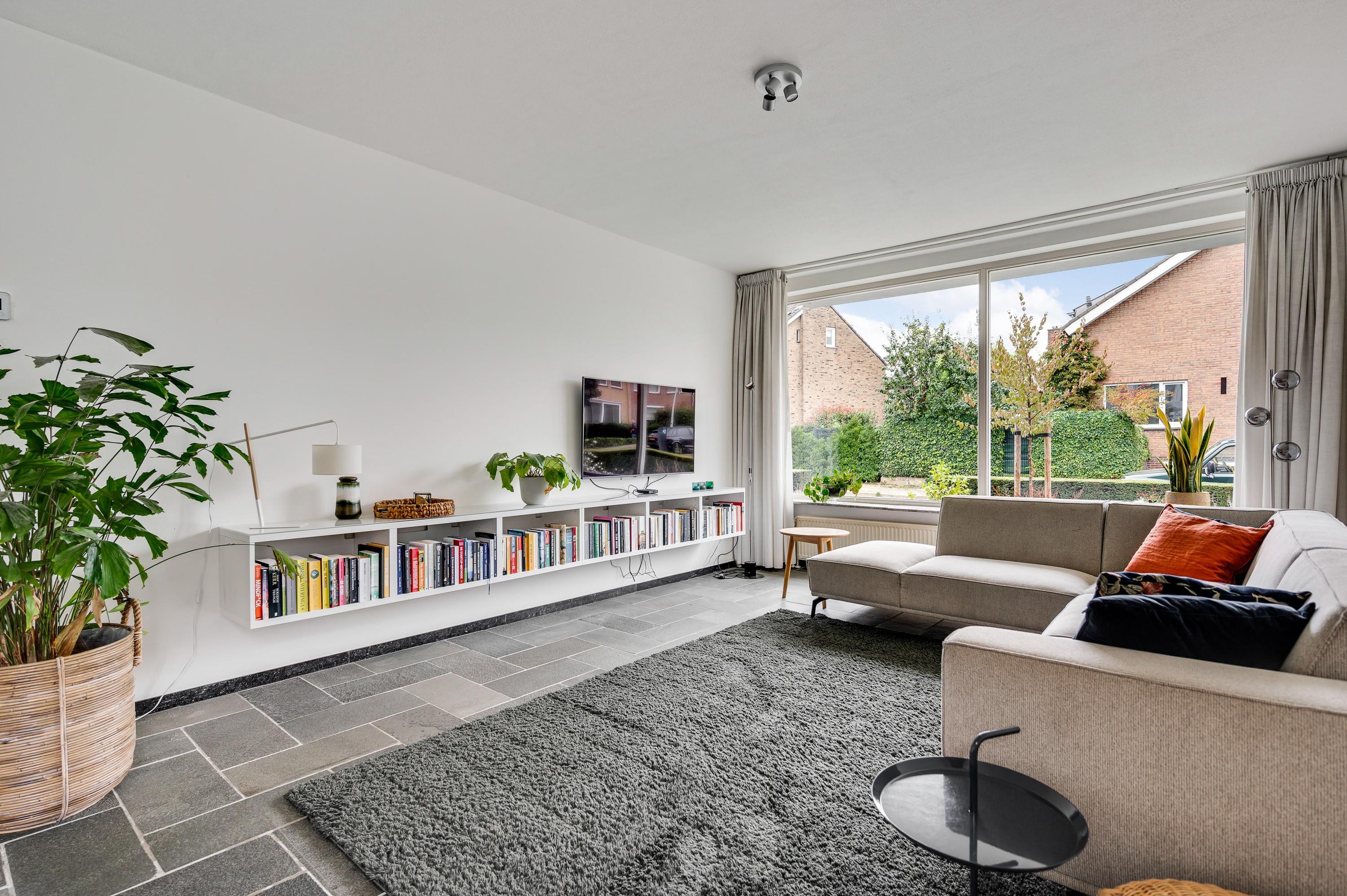 Vanuit de hal loopt u L-vormige woonkamer (circa 41,5 m2) in, die geheel als zitkamer is ingedeeld. Er is veel lichtinval aan drie zijden en het uitzicht naar het vele groen in de tuin is fraai. Muren en plafonds zijn gestuct en de donkere leisteen vloer geeft de woonkamer een chique uitstraling.