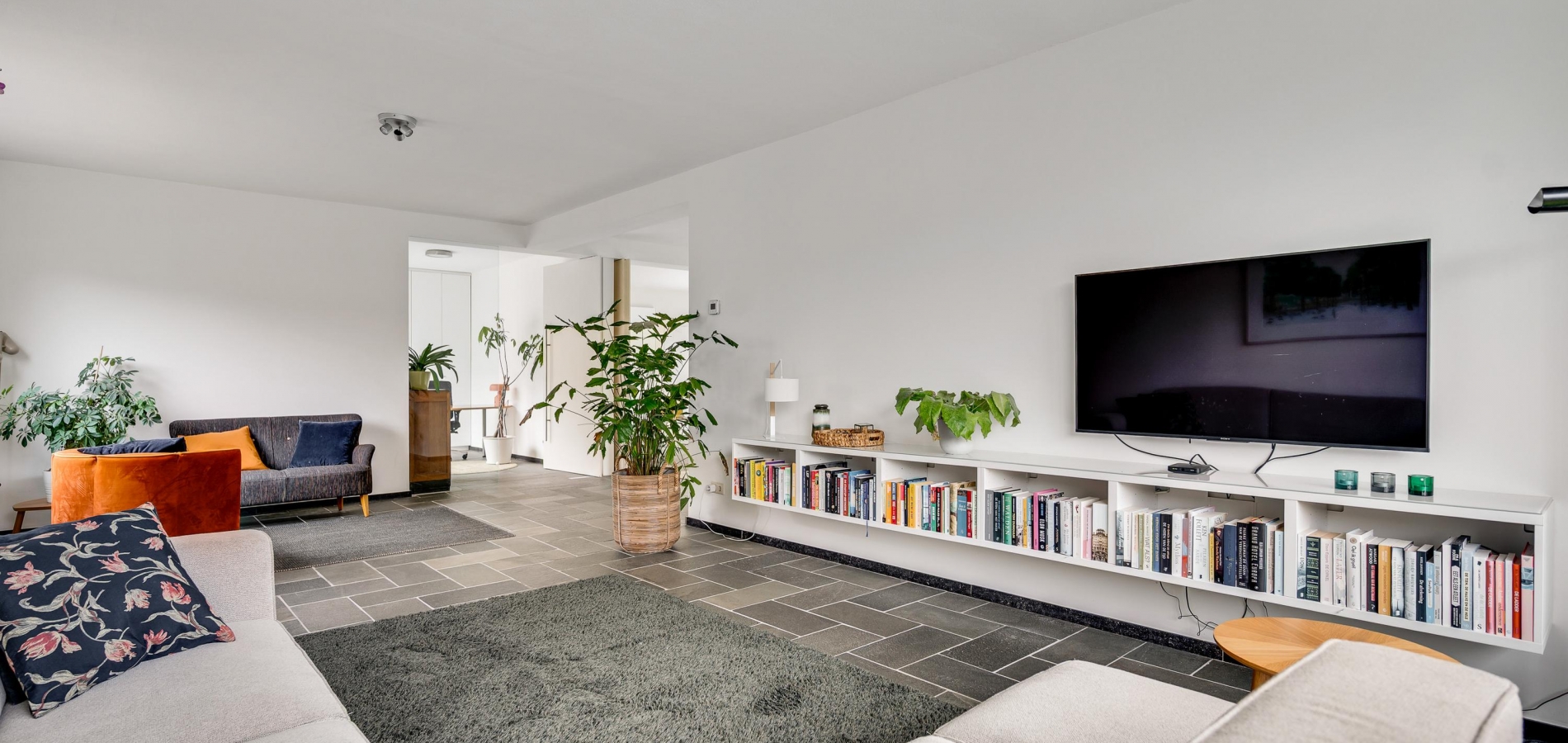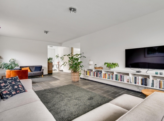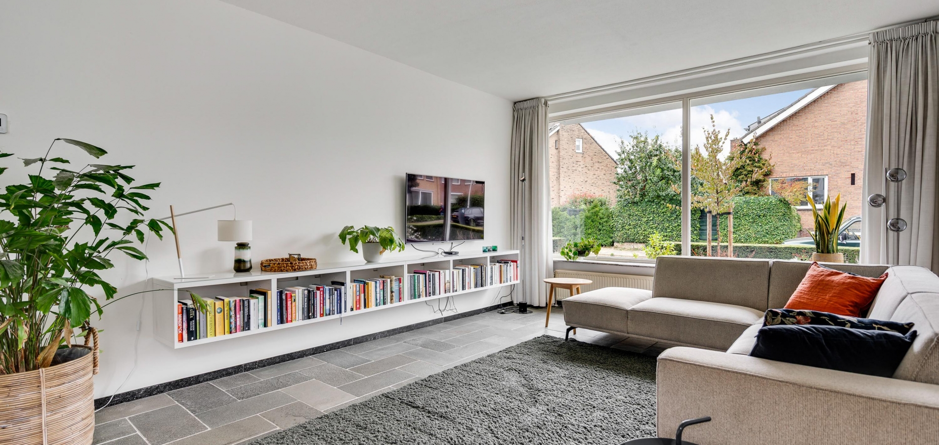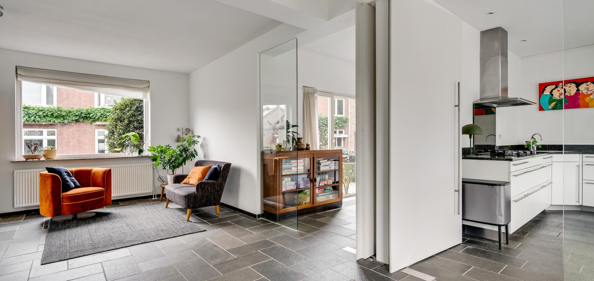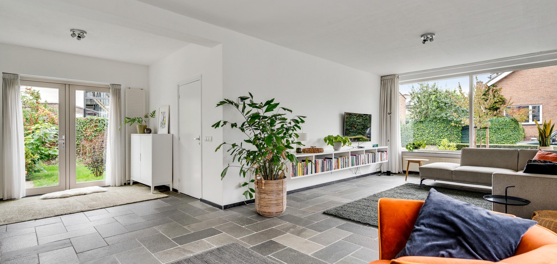Vanuit de hal loopt u L-vormige woonkamer (circa 41,5 m2) in, die geheel als zitkamer is ingedeeld. Er is veel lichtinval aan drie zijden en het uitzicht naar het vele groen in de tuin is fraai. Muren en plafonds zijn gestuct en de donkere leisteen vloer geeft de woonkamer een chique uitstraling.